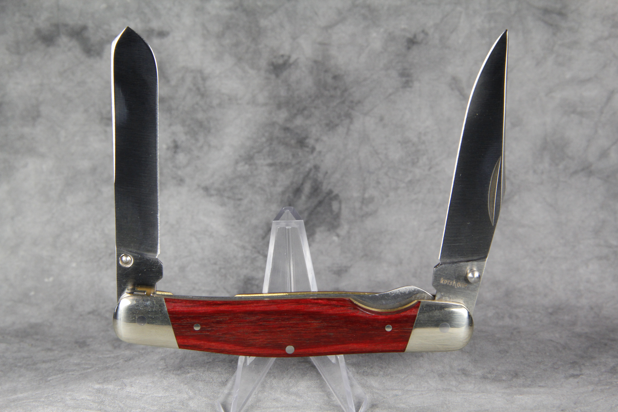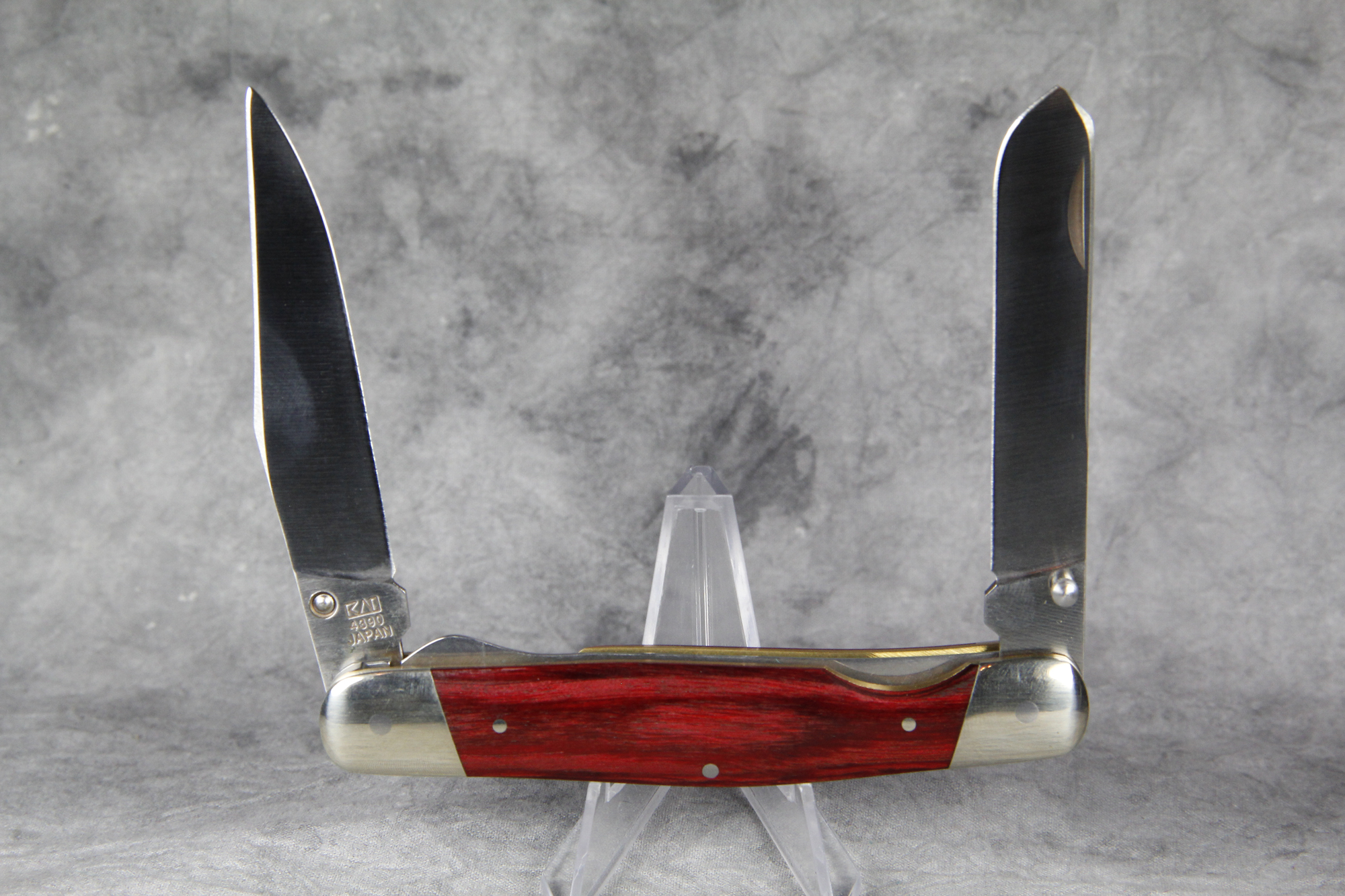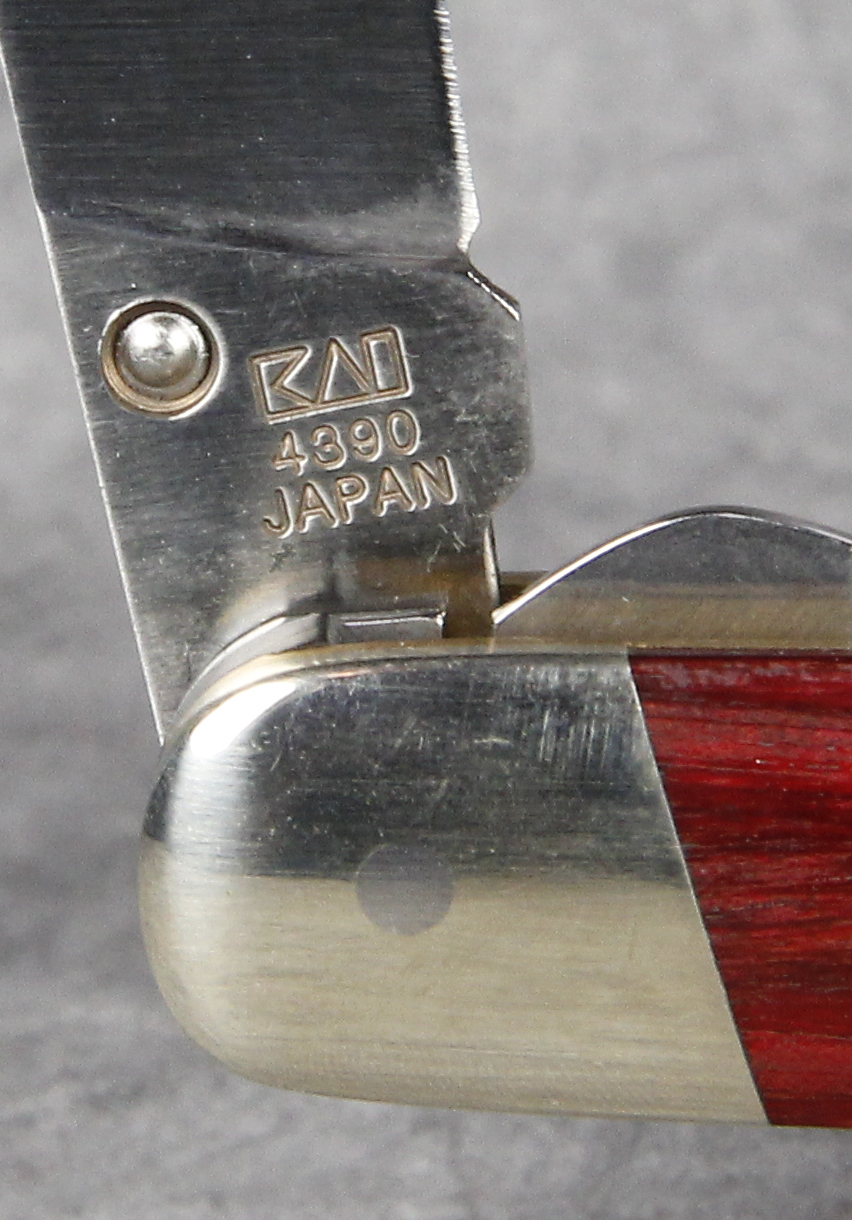 March 09, 2026 - 4-1/8 inches closed. 7 inches open. Made in Japan. "kershaw" and "KAI 4390 JAPAN" tang stamps. AUS-6A stainless steel blades, liner locks and thumb studs on both blades, clip and spay. Red staminawood handles. Nickel silver bolsters. Brass liners.
