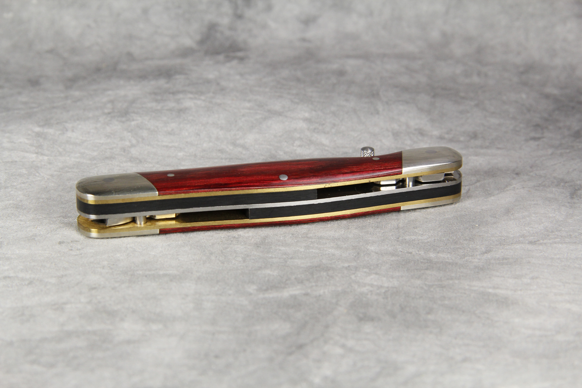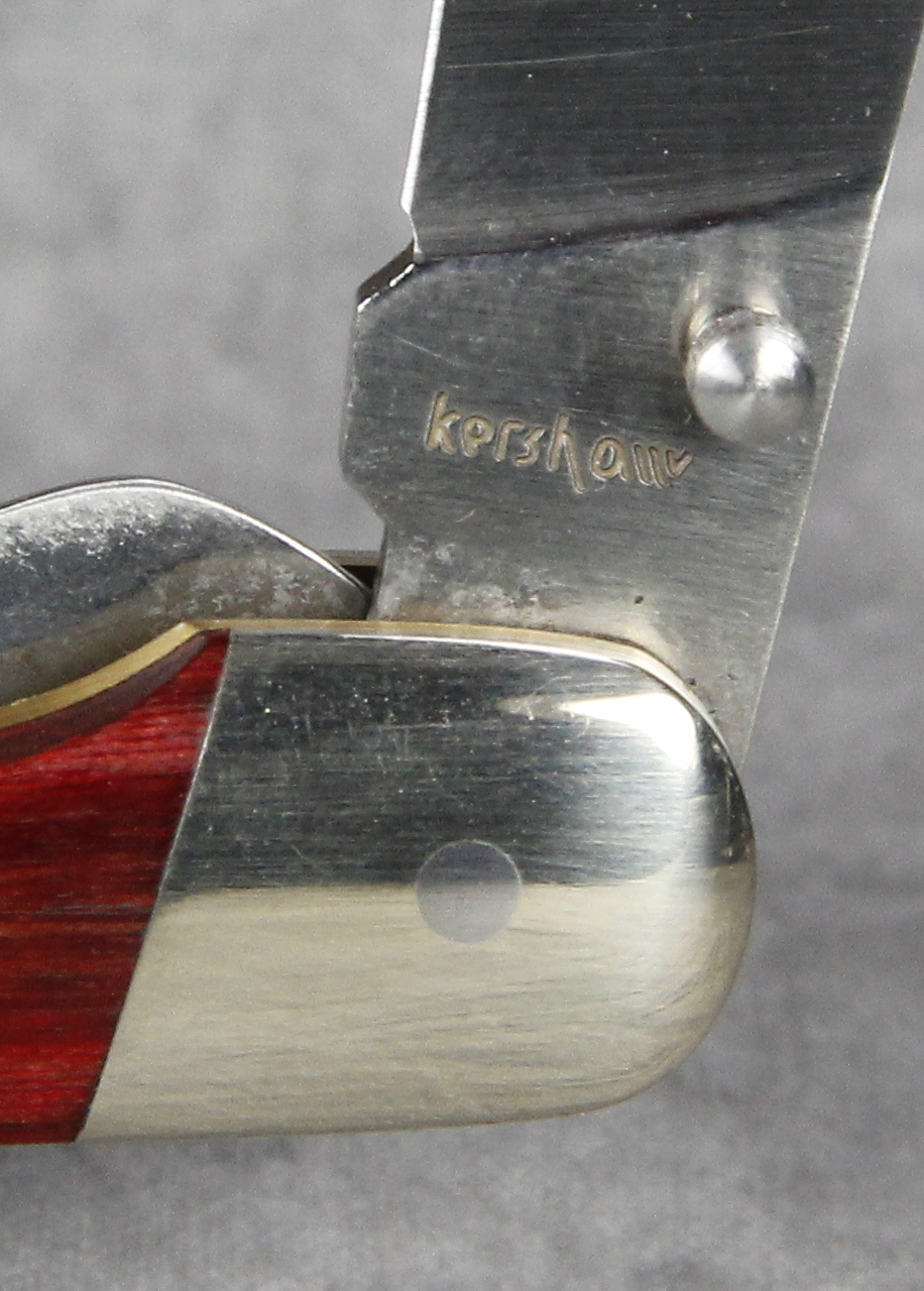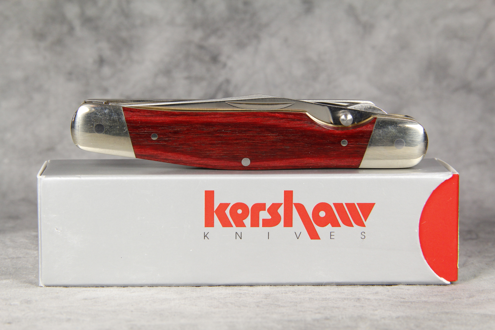March 09, 2026 - 4-1/8 inches closed. 7 inches open. Made in Japan. "kershaw" and "KAI 4390 JAPAN" tang stamps. AUS-6A stainless steel blades, liner locks and thumb studs on both blades, clip and spay. Red staminawood handles. Nickel silver bolsters. Brass liners.
