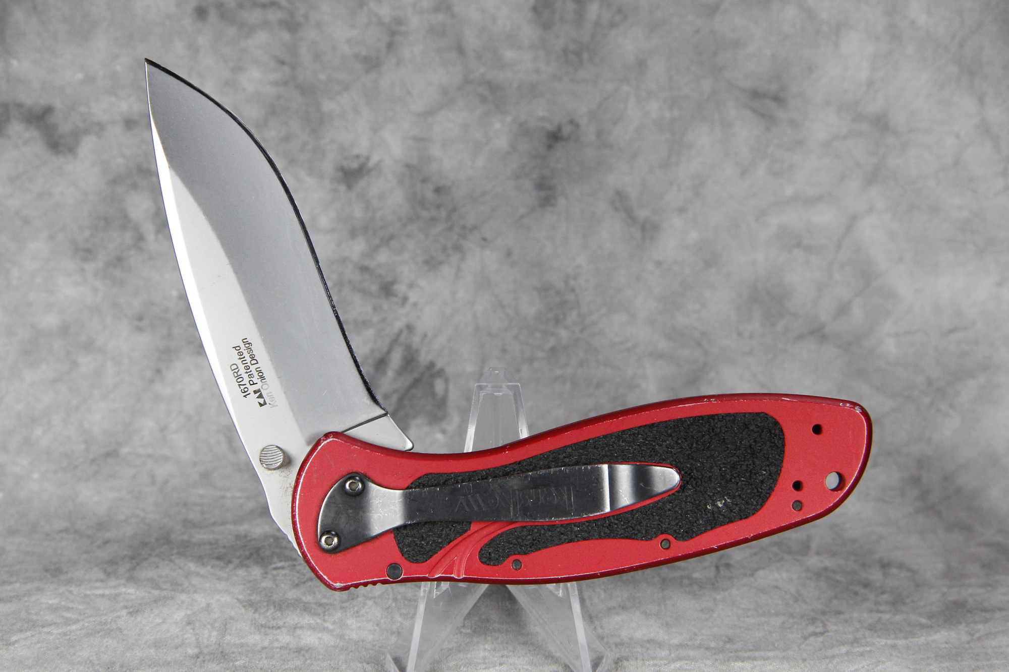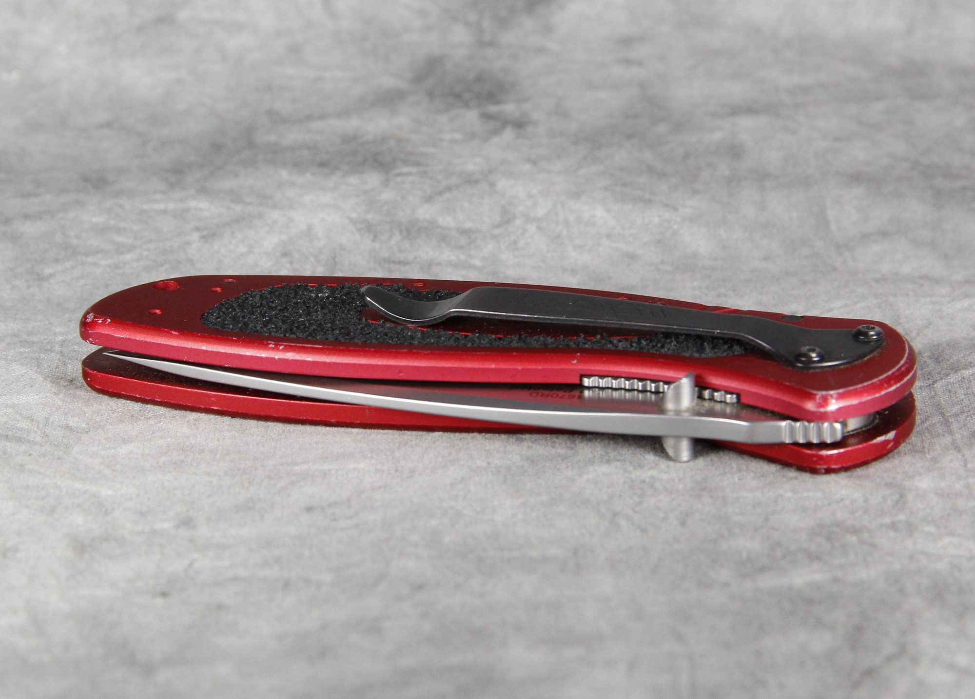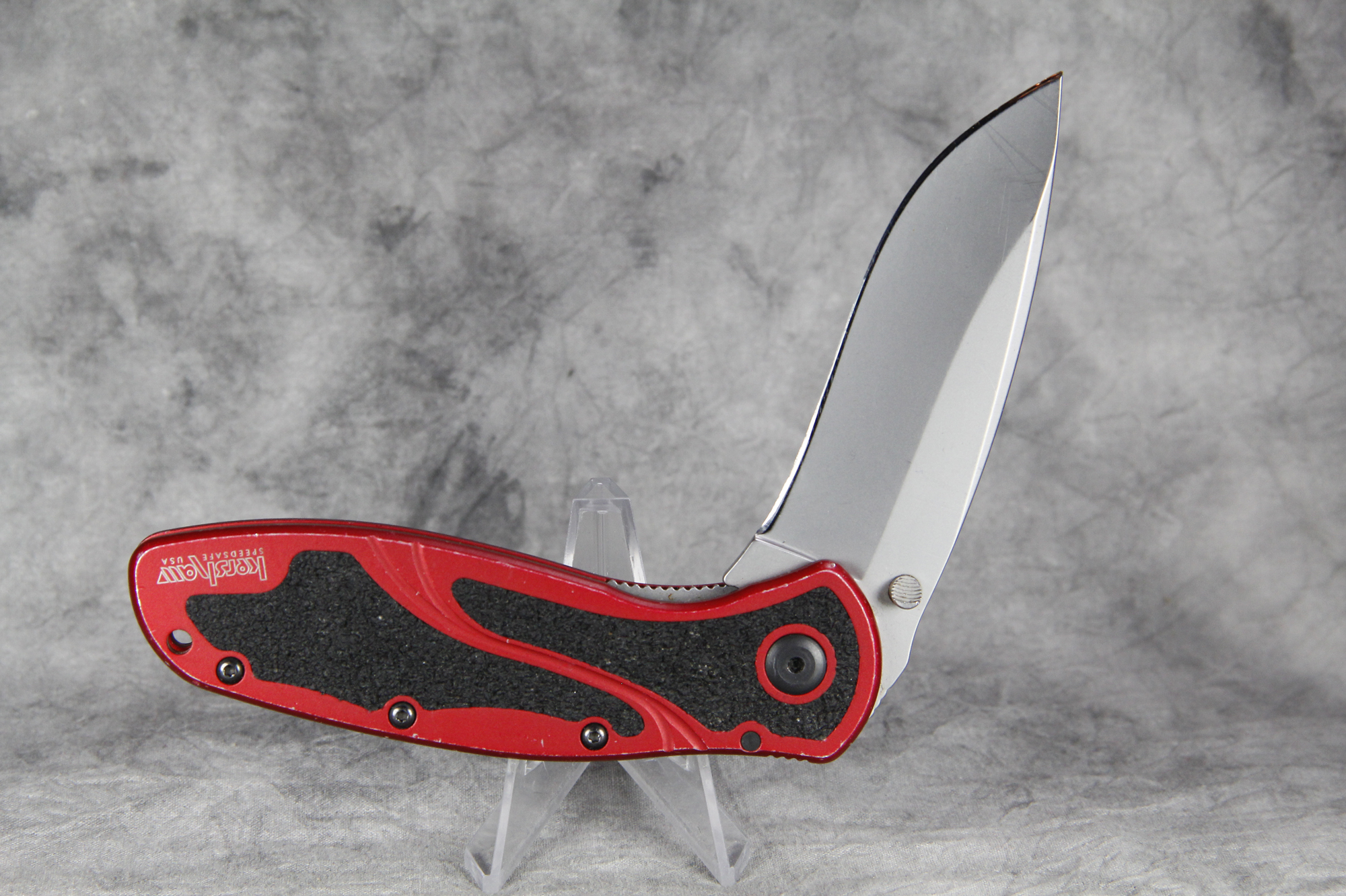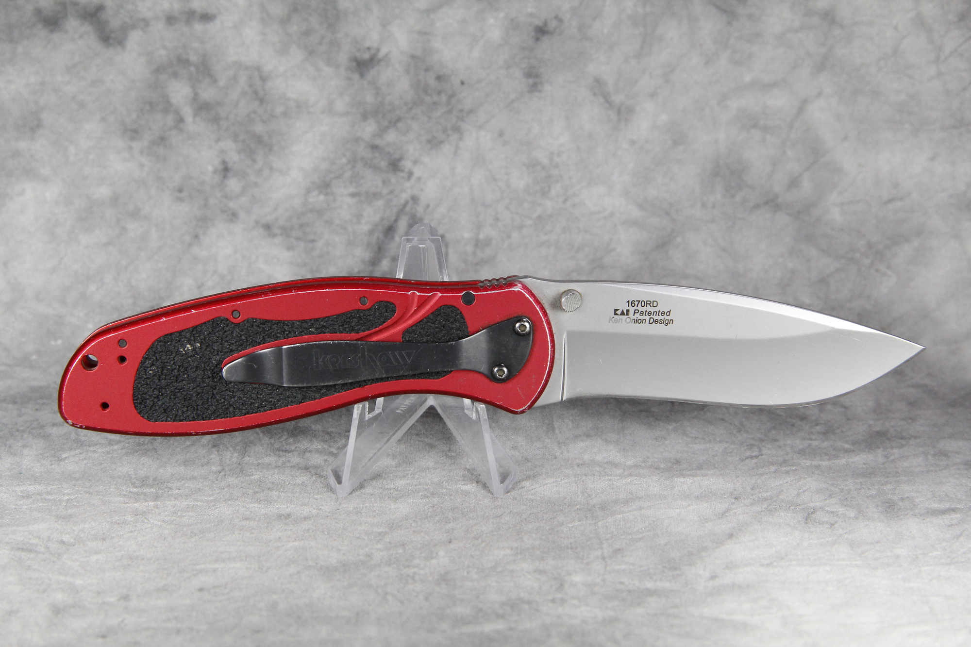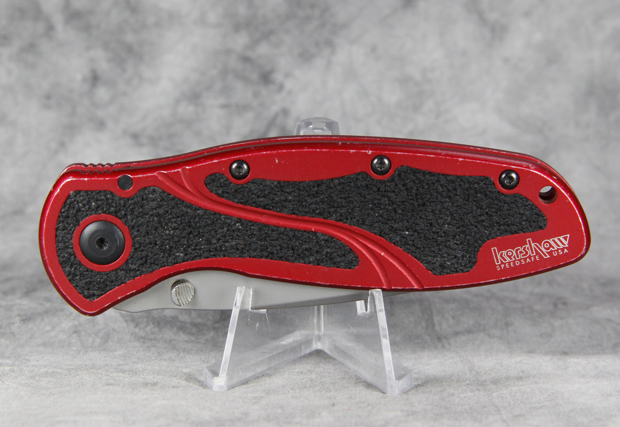 April 24, 2026 - Designed by Ken Onion. 4-1/2 inches closed. 7-3/4 inches open. Blade etched "1670RD KAI Patented Ken Onion Design". Handle etched "kershaw SPEEDSAFE USA". Pocket clip deep etched "kershaw". Equipped with a big, slightly recurved blade thats ideal for multitasking. Blade shape offers both excellent slicing and piercing capabilities and the high-performance Sandvik 14C28N stainless blade steel offers corrosion resistance and hardness. DLC (Diamond-Like Carbon) coated blade for extra corrosion resistance and enhanced looks. Red handles with Trac-Tec grip-tape handle inserts for an extremely solid grip. Handle itself is durable 6061-T6 anodized aluminum, sometimes described as aircraft aluminum. For easy one-handed opening, the Blur is equipped with SpeedSafe assisted opening. A short push on the thumbstud overcomes the resistance built into the torsion bar in the SpeedSafe mechanism. The SpeedSafe takes over and the blade moves out of the handle quickly and easily. One-handed opening is easy with SpeedSafe. Pocket clip is reversible for your choice of tip-up or tip-down carry. Also has a pre-drilled lanyard hole.