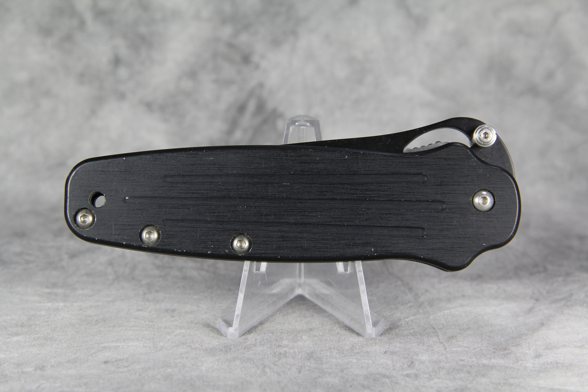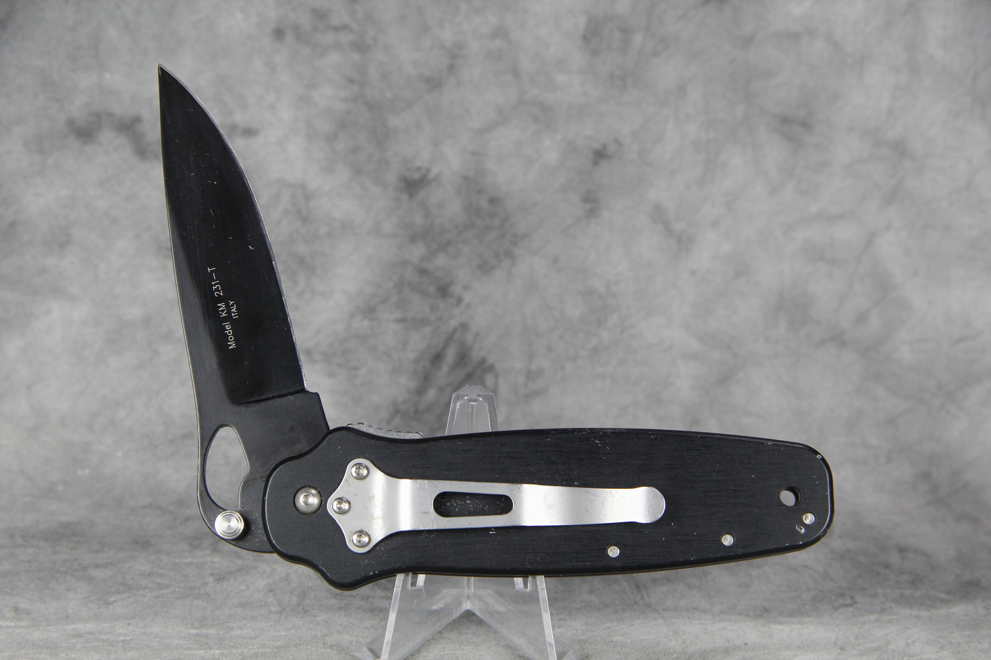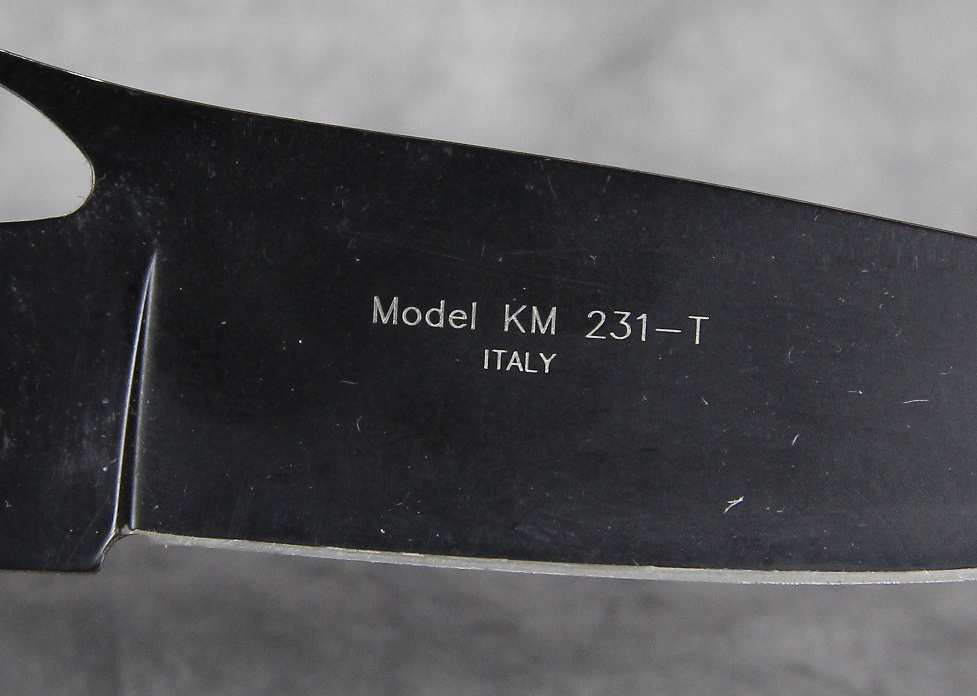 December 22, 2025 - 5-1/8 inches closed. 8-1/8 inches open. Blade etched "KA-BAR/Maserin" and "Model KM 231-T  ITALY". Ambidextrous thumb knob for single-handed opening. Aluminum handle with belt clip and lanyard hole.