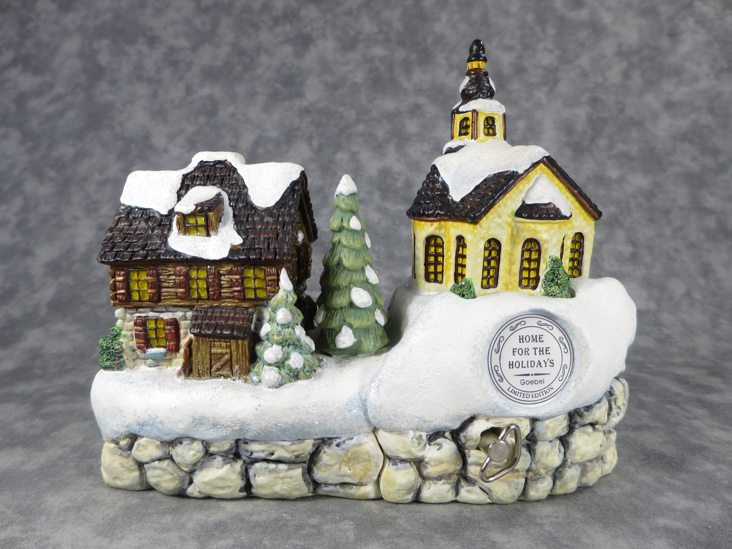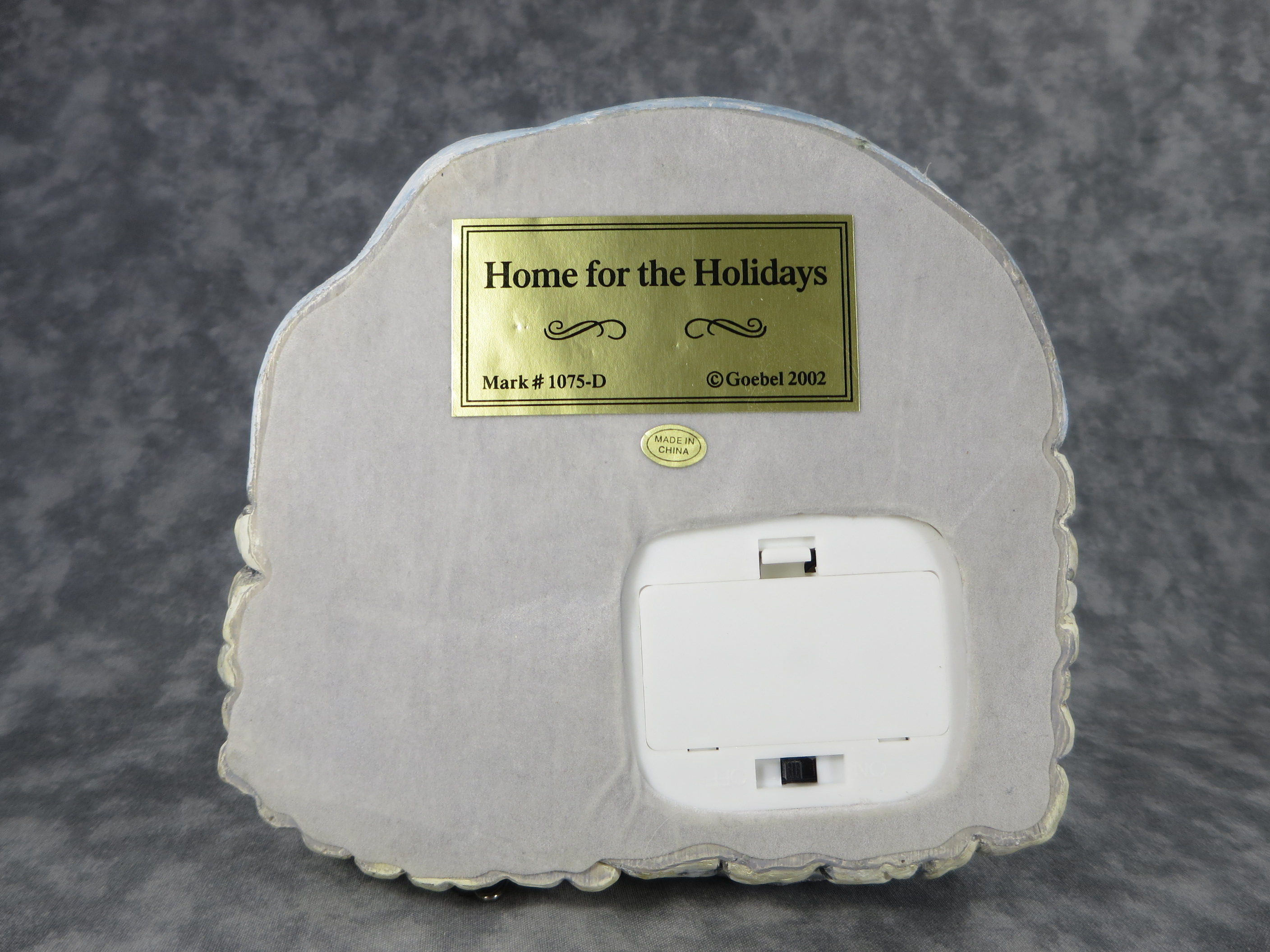 January 18, 2026 - 6-1/2" by 6-1/4" by 5-1/2". Nameplate attached to bottom of base reads 'HOME FOR THE HOLIDAYS/Mark #1075-D/(c) Goebel 2002'. Use as base for Hummel figurine 2047 WINTER SLEIGH RIDE.