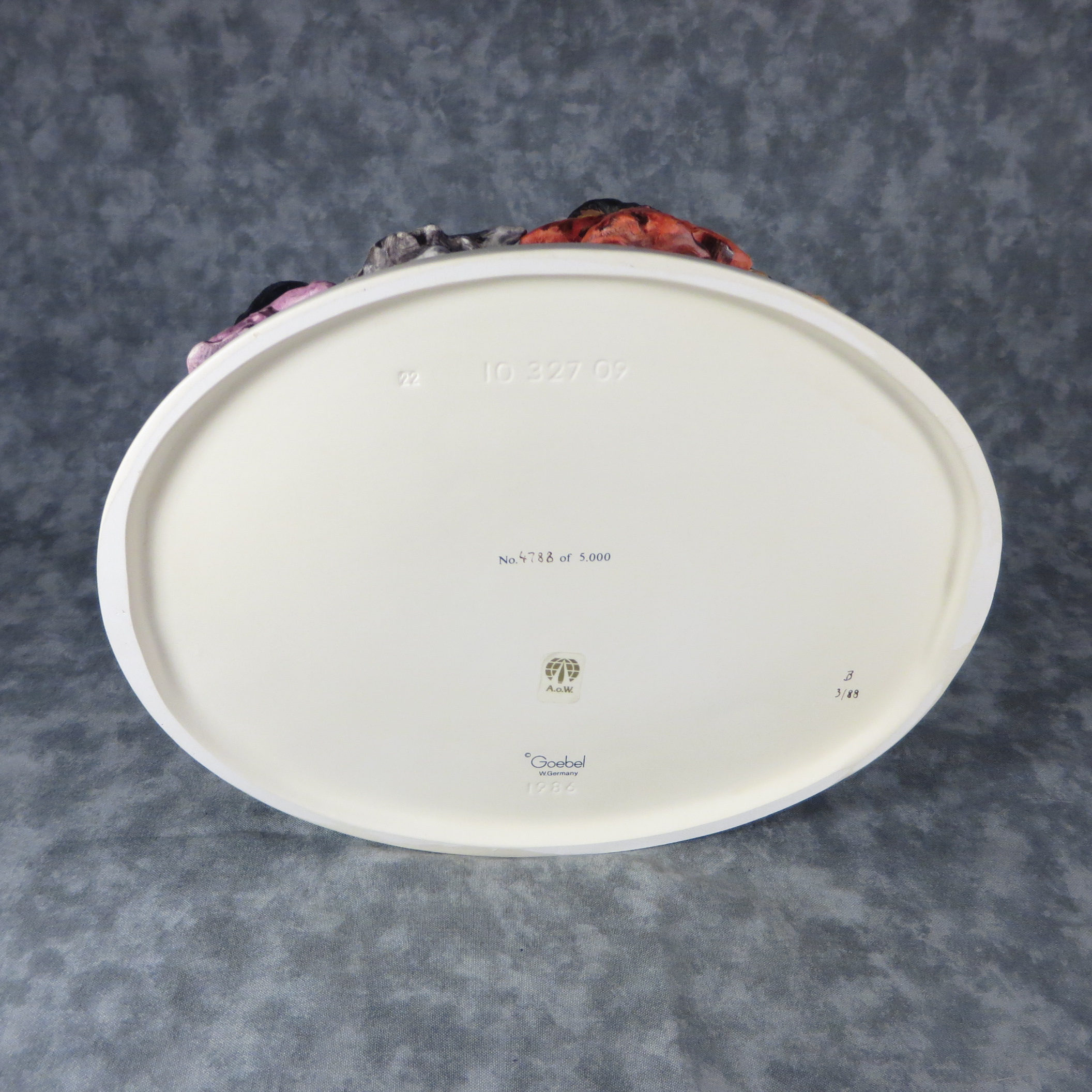 January 18, 2026 - 3-1/2 inches tall, 9-1/4 inches wide, 7-1/2 inches deep. Base is incised 10 328 09 and 1986. Goebel TMK 6 trademark imprinted in blue on bottom of base. Painter hand-initialed and dated in black ink on bottom of base. Limited edition xxxx of 5.000 also on bottom.