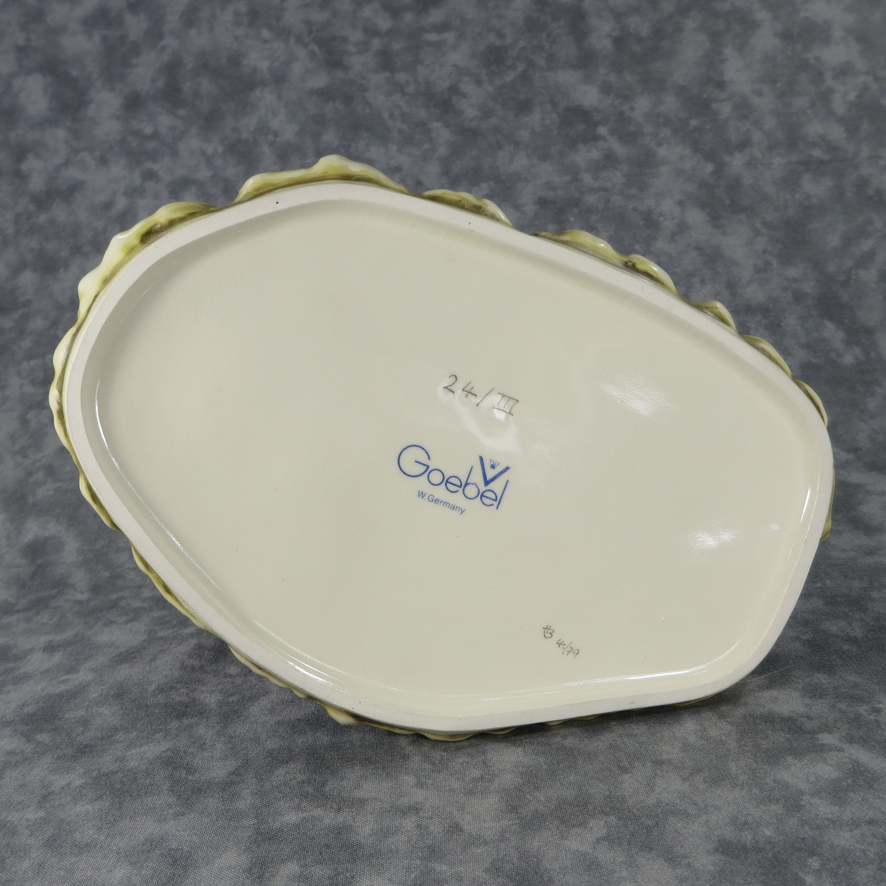 March 13, 2026 - 5-3/4 inches tall by 8 inches wide at base. Base is incised 24/III. Goebel TMK 5 trademark imprinted in blue on bottom of base. Painter hand-initialed and dated in black ink.
