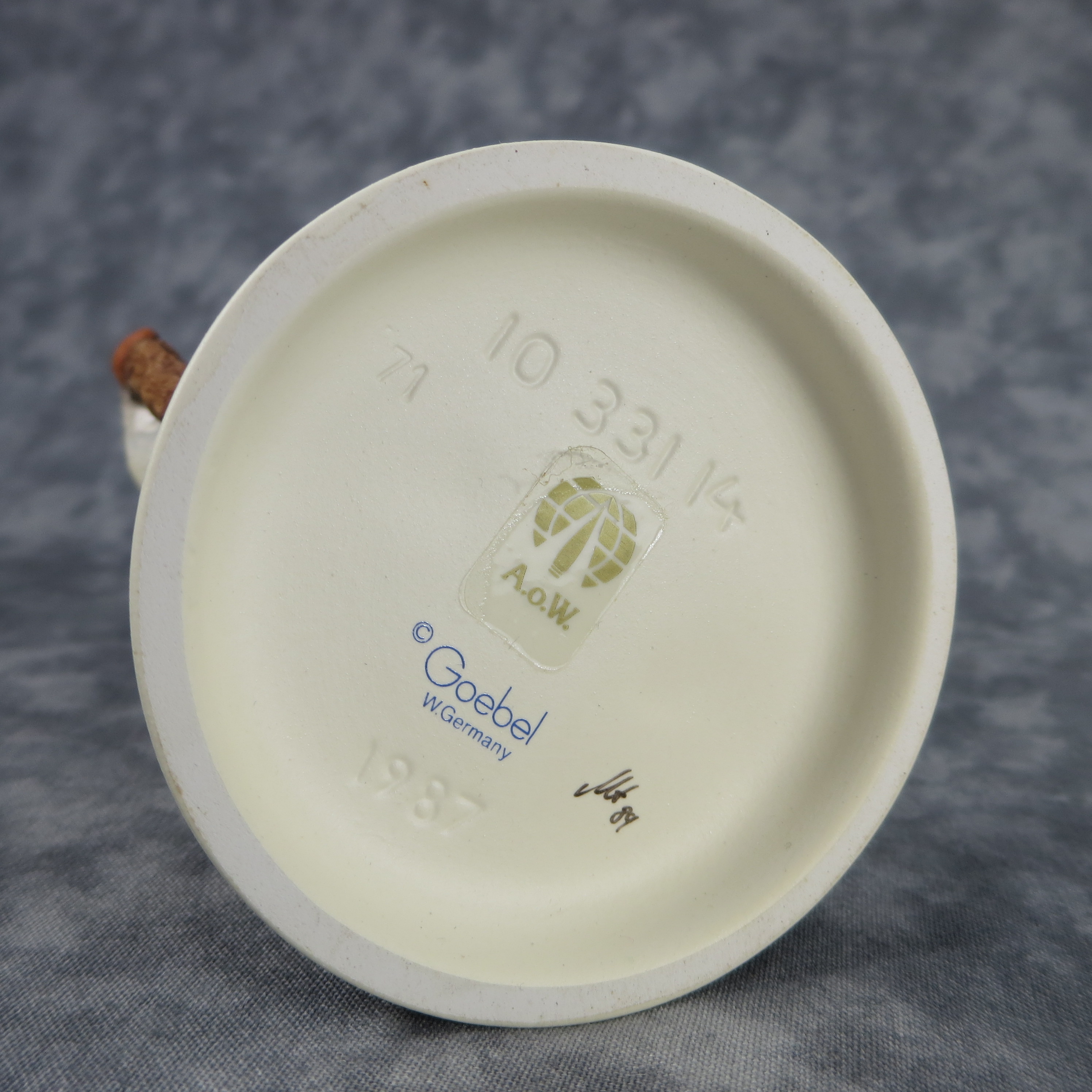 January 18, 2026 - 5-1/4 inches tall. Base incised 10 331 14 and 1987. Goebel TMK 6 trademark imprinted in blue on base. Painter hand-initialed and dated in black ink on base.