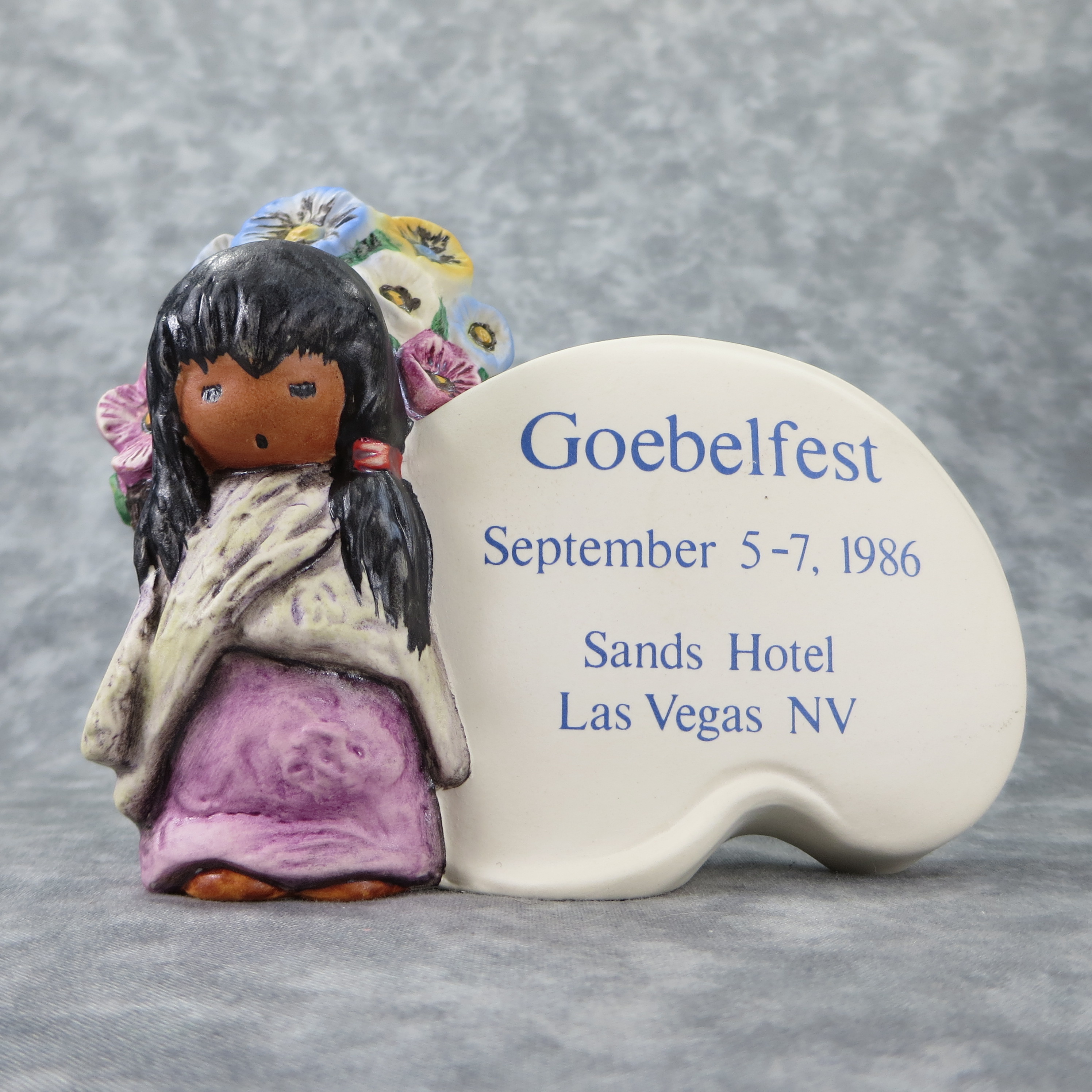 January 16, 2026 - 4-1/4 inches tall. Base incised 59 025 and 1983. Goebel TMK 6 trademark imprinted in blue on bottom. Painter hand-initialed, signed and dated in black ink on bottom. Front reads: Goebelfest / September 5-7, 1986 / Sands Hotel / Las Vegas NV