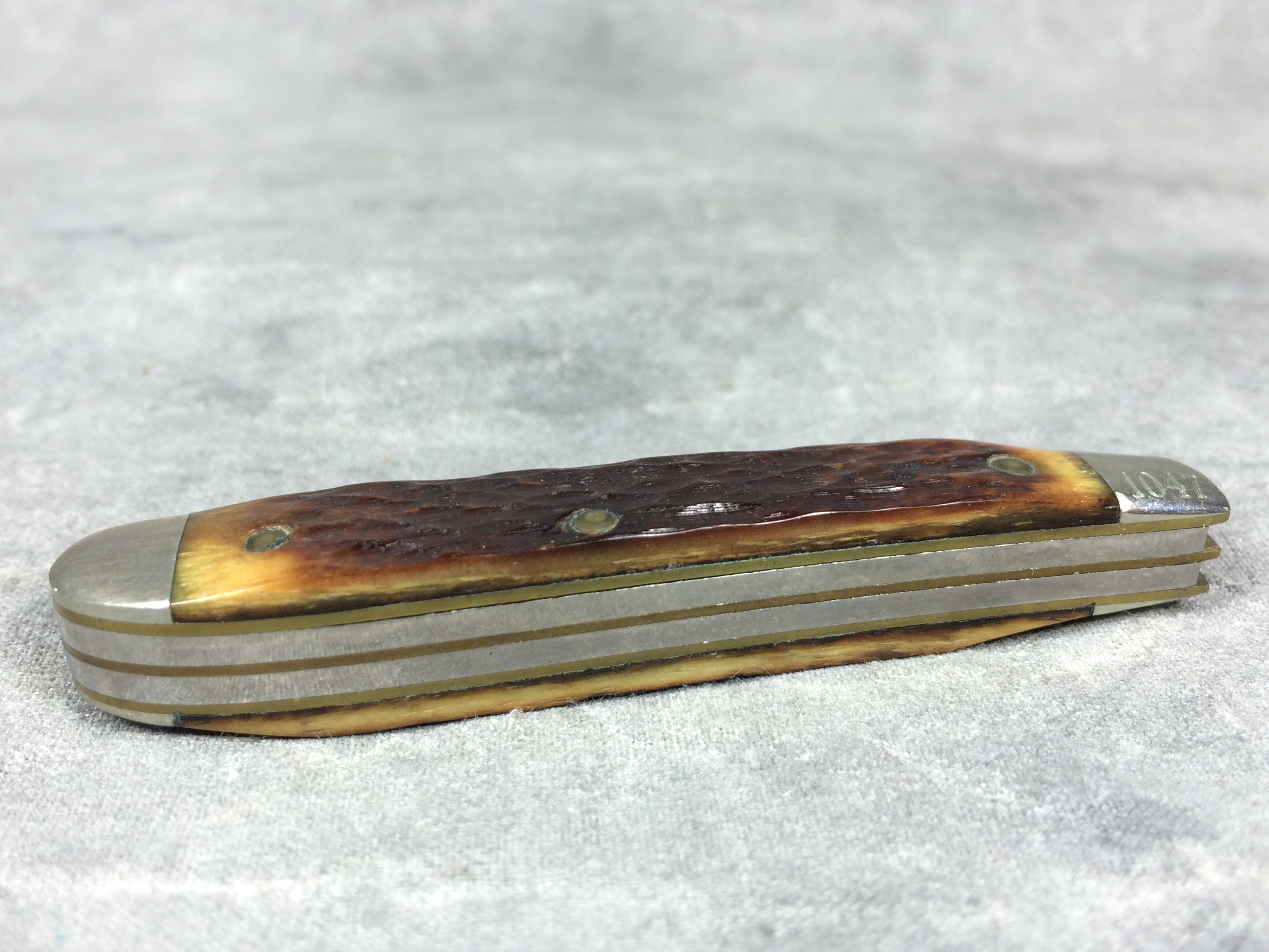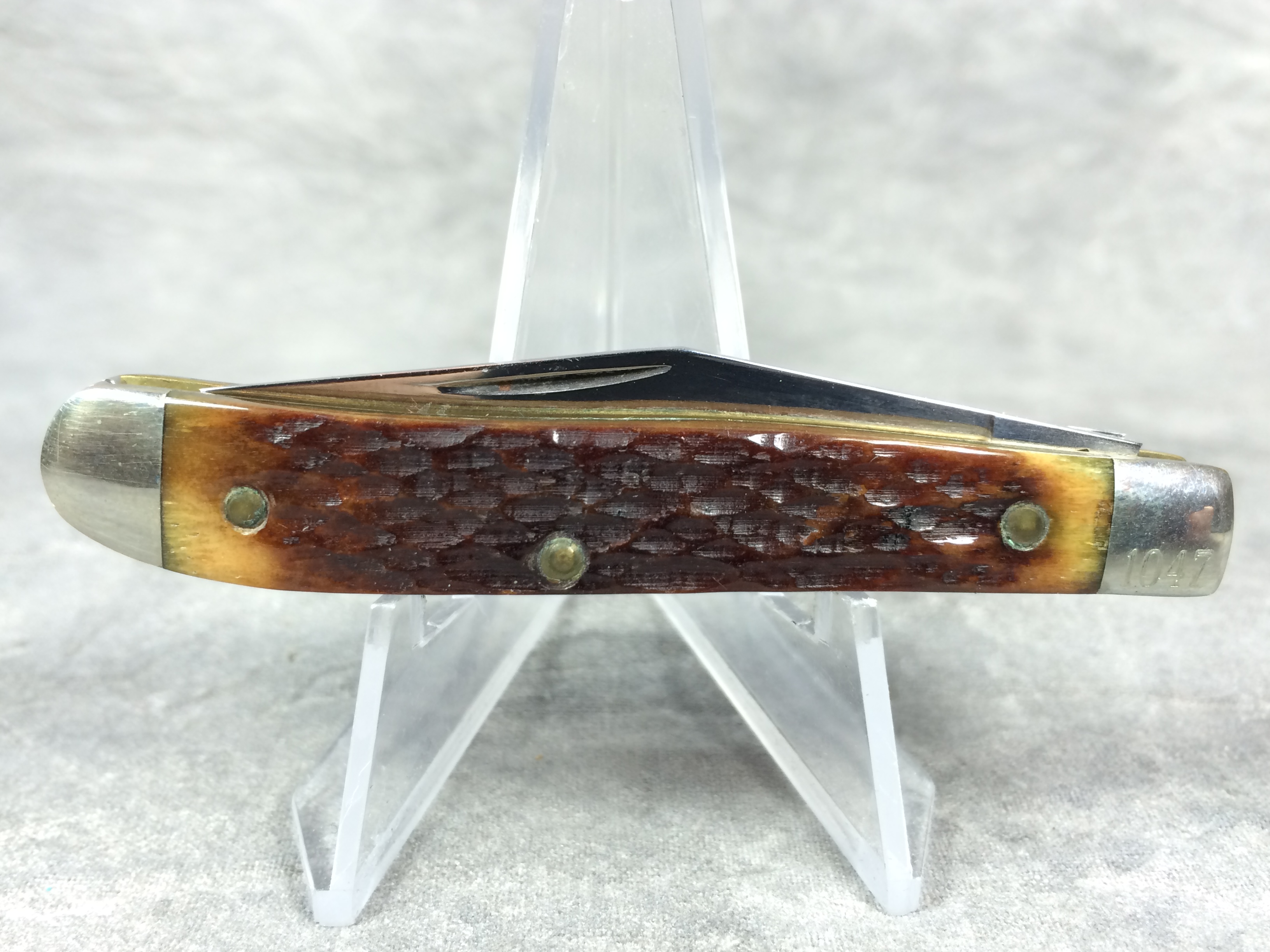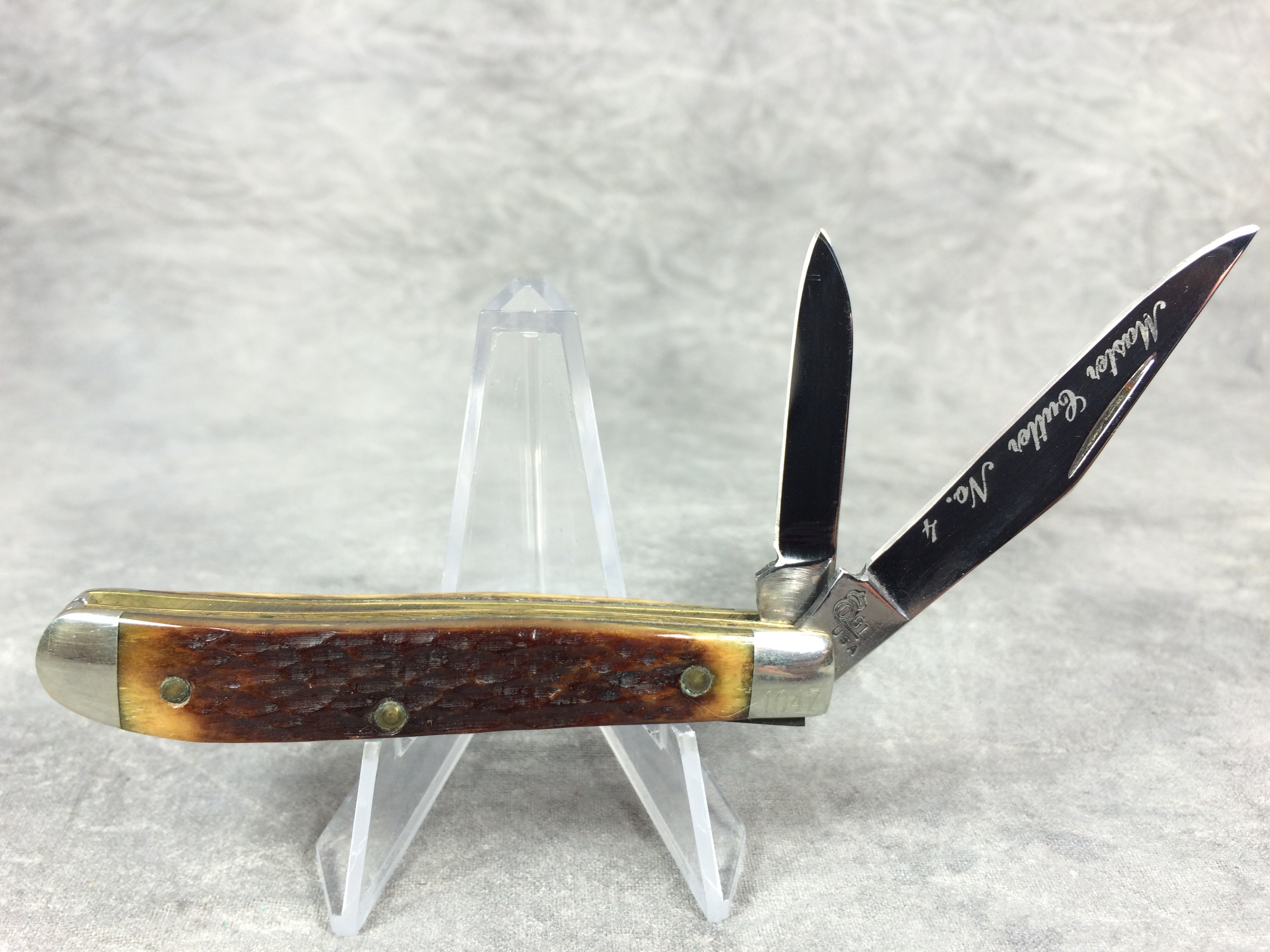 January 08, 2026 - 2-Blade Jack Knife. 2-3/4 inches closed. 5 inches open. Queen logo with "81 USA" tang stamp. Master blade etched "Master Cutler #4". Jigged Bone handle. Nickel Silver bolsters. Front right bolster etched with serial #1047. Brass liner.