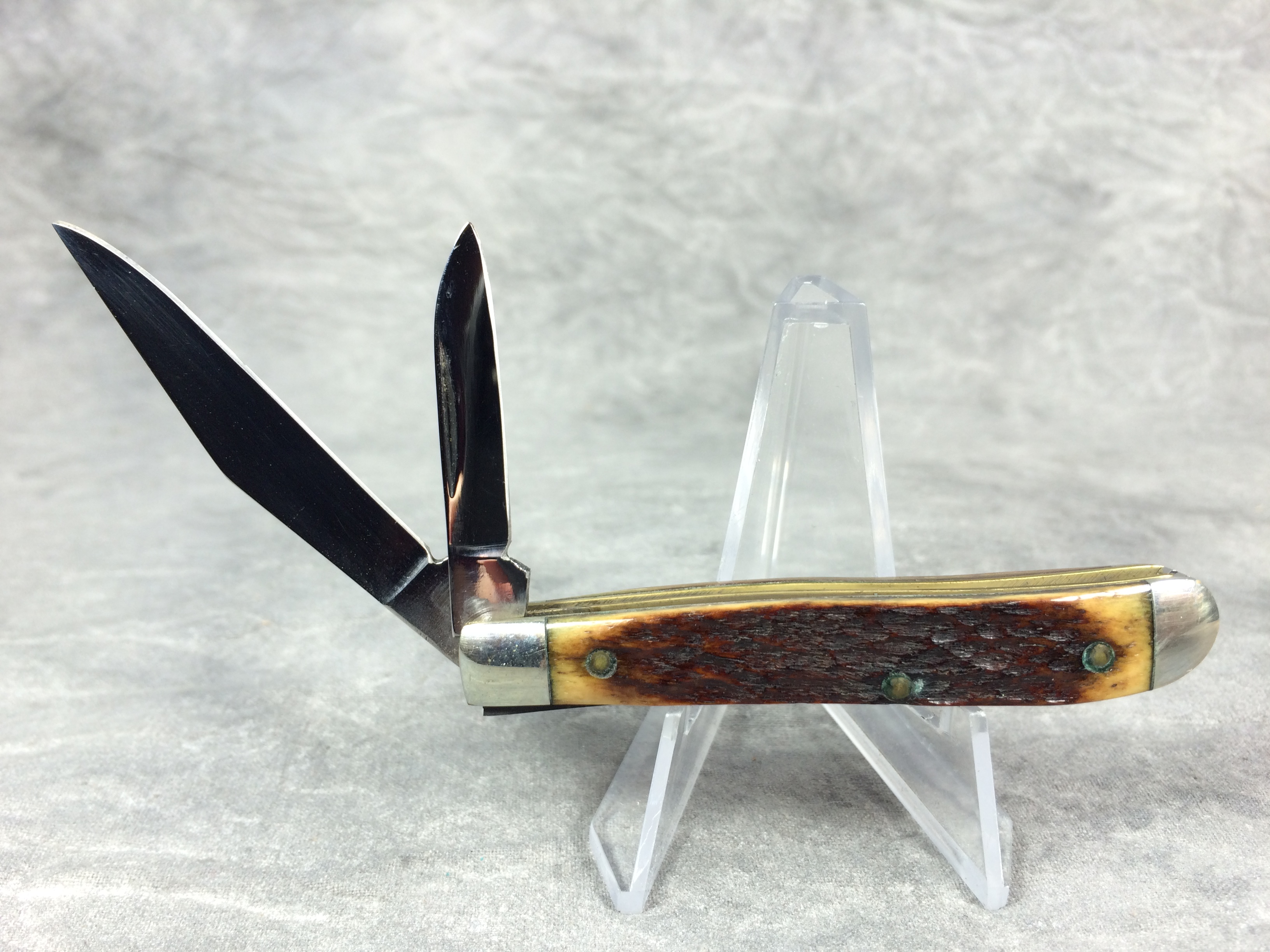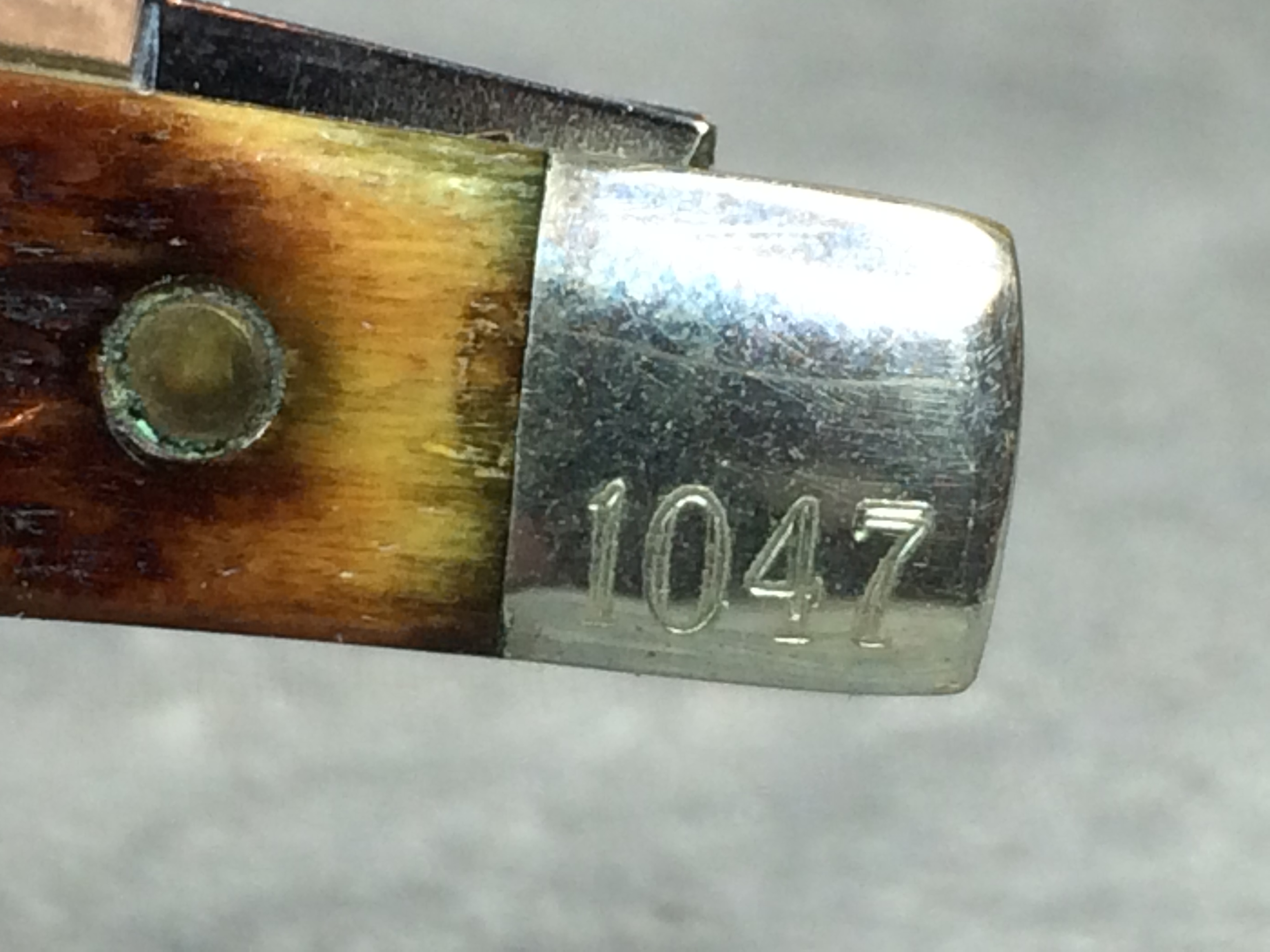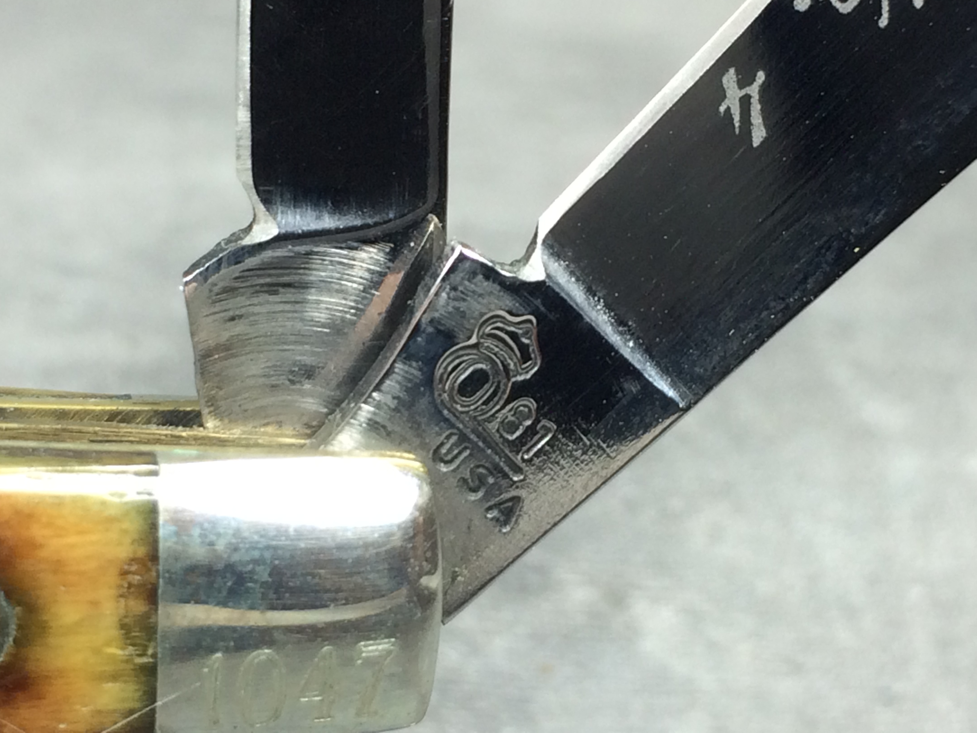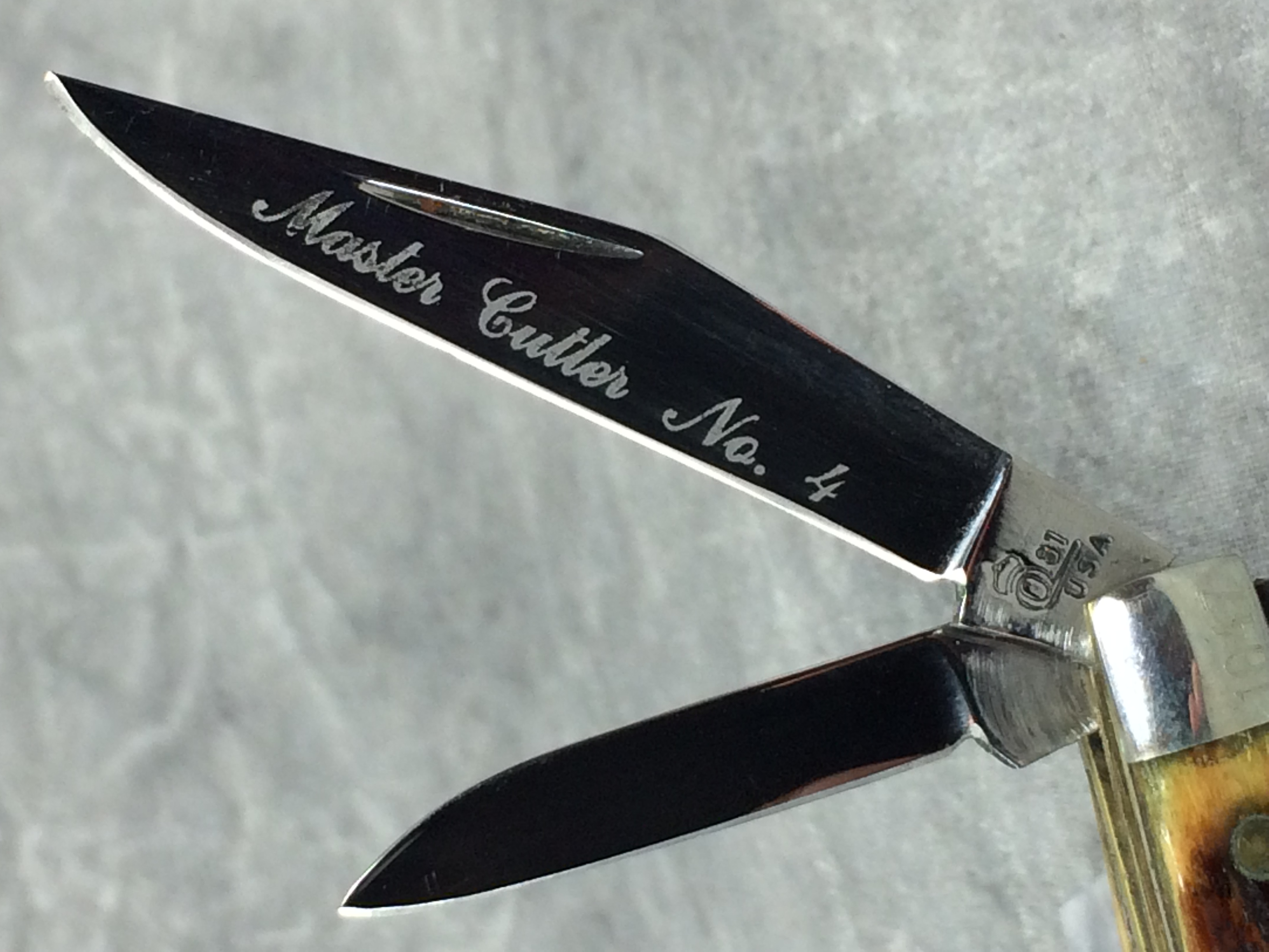 January 08, 2026 - 2-Blade Jack Knife. 2-3/4 inches closed. 5 inches open. Queen logo with "81 USA" tang stamp. Master blade etched "Master Cutler #4". Jigged Bone handle. Nickel Silver bolsters. Front right bolster etched with serial #1047. Brass liner.