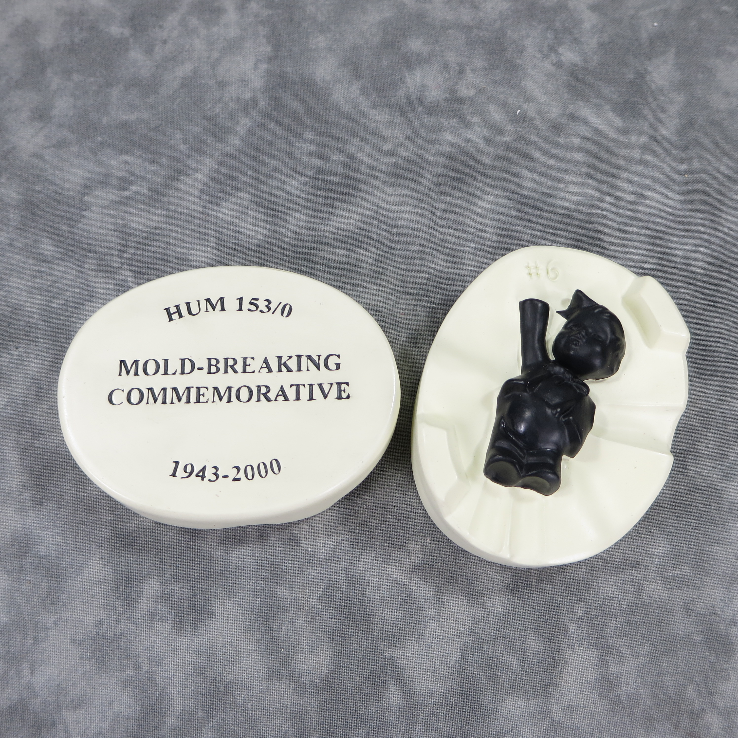 January 18, 2026 - 3-1/4 inches wide, 1-1/2 inches tall, 2-1/2 inches deep. Top incised HUM 153/0 / MOLD-BREAKING COMMEMORATIVE / 1943-2000. Underside is incised '(c) Goebel'. Bottom piece is incised '#6' beside the boy figure.