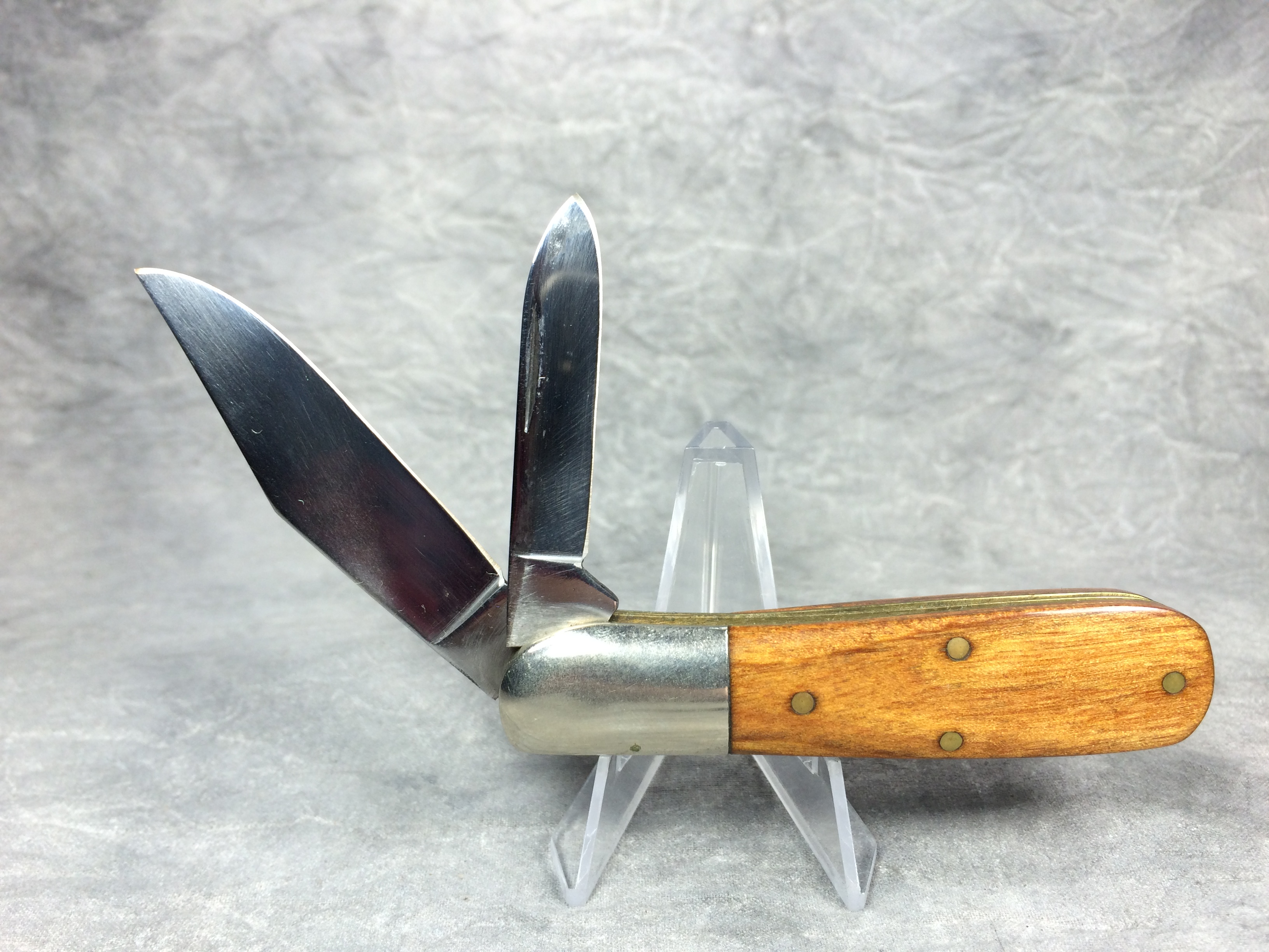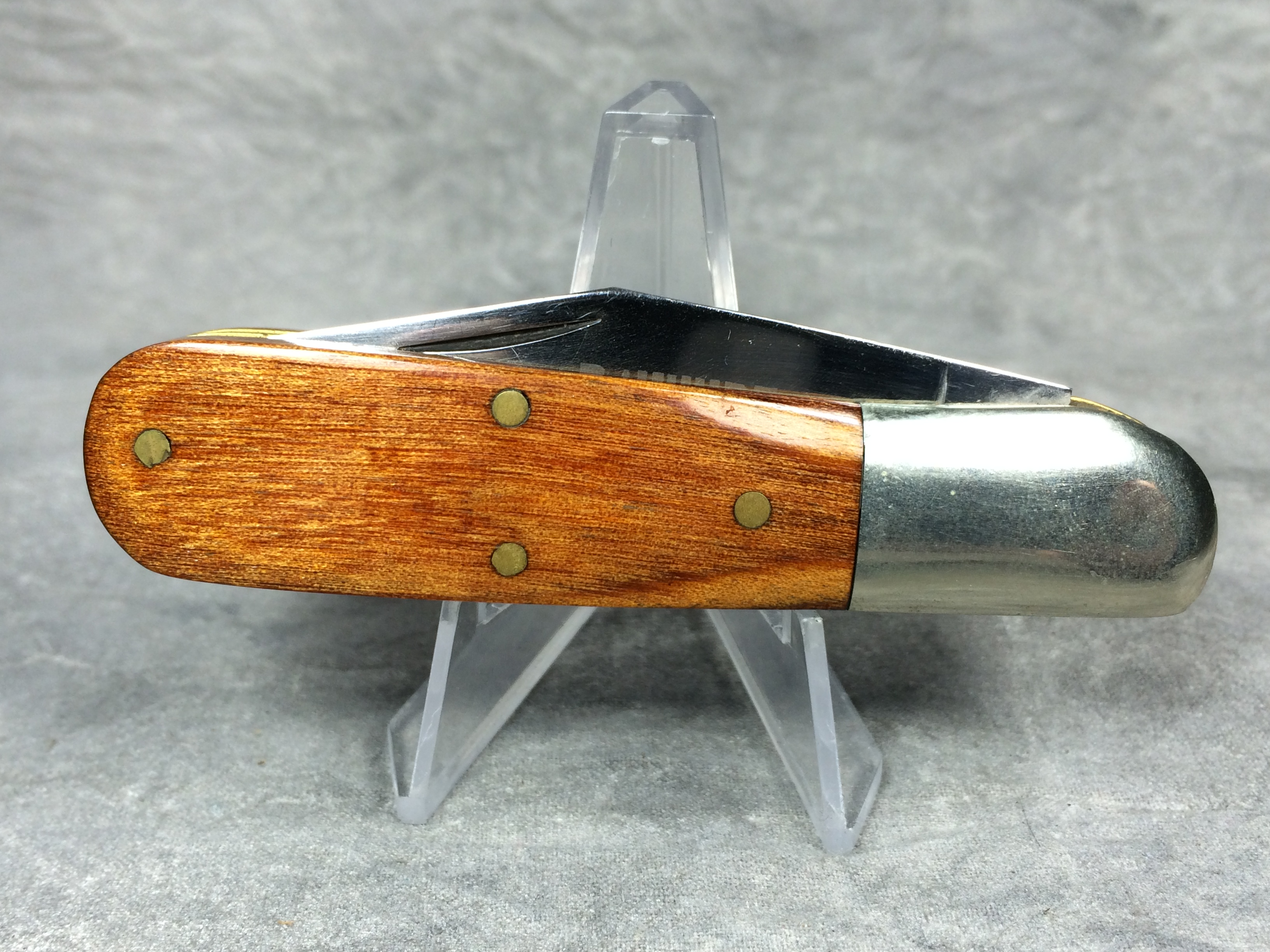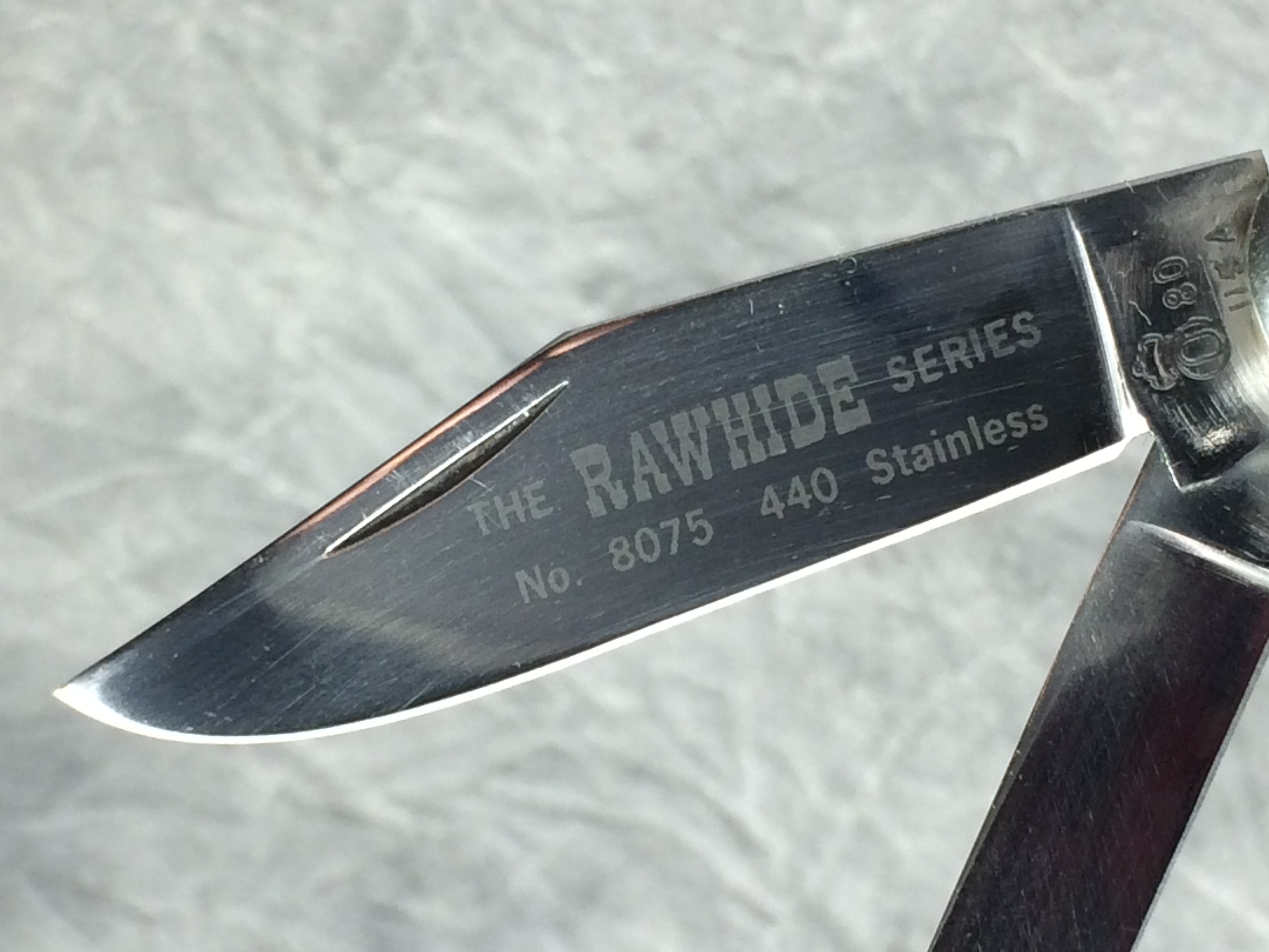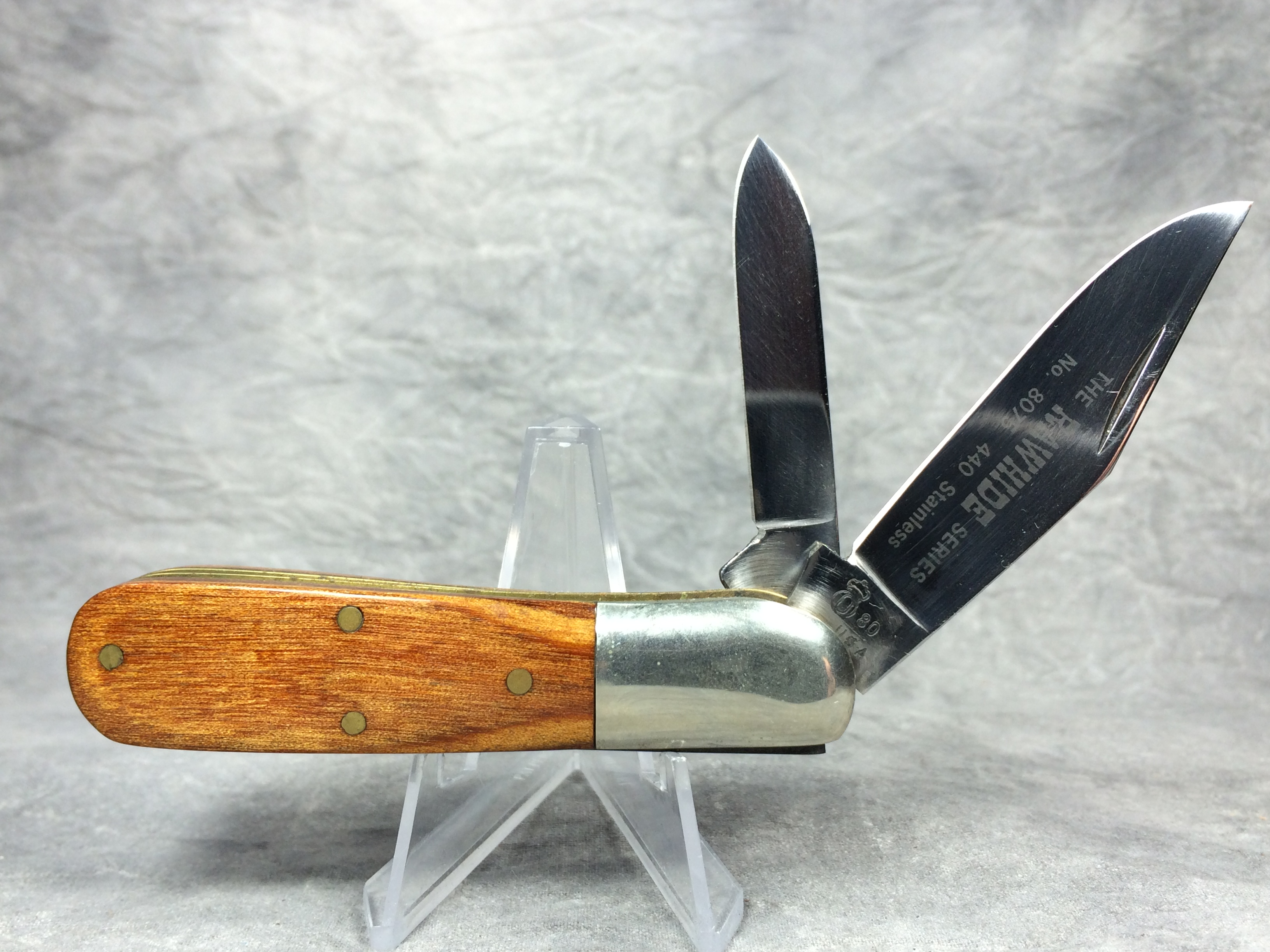 November 06, 2025 - 2-Blade Barlow Jack Knife. Made in USA by Queen Cutlery. 3-3/8 inches closed. 5-7/8 inches open. Queen logo with "80" over "USA" tang stamp. Master blade etched "THE RAWHIDE SERIES No. 8075 440 Stainless". Wood handle. Nickel Silver bolsters. Brass liner.
