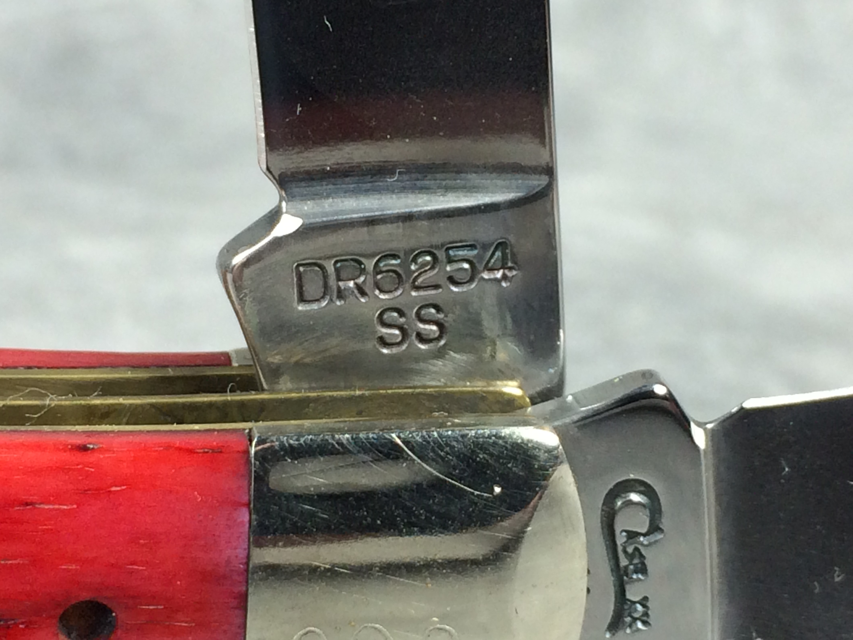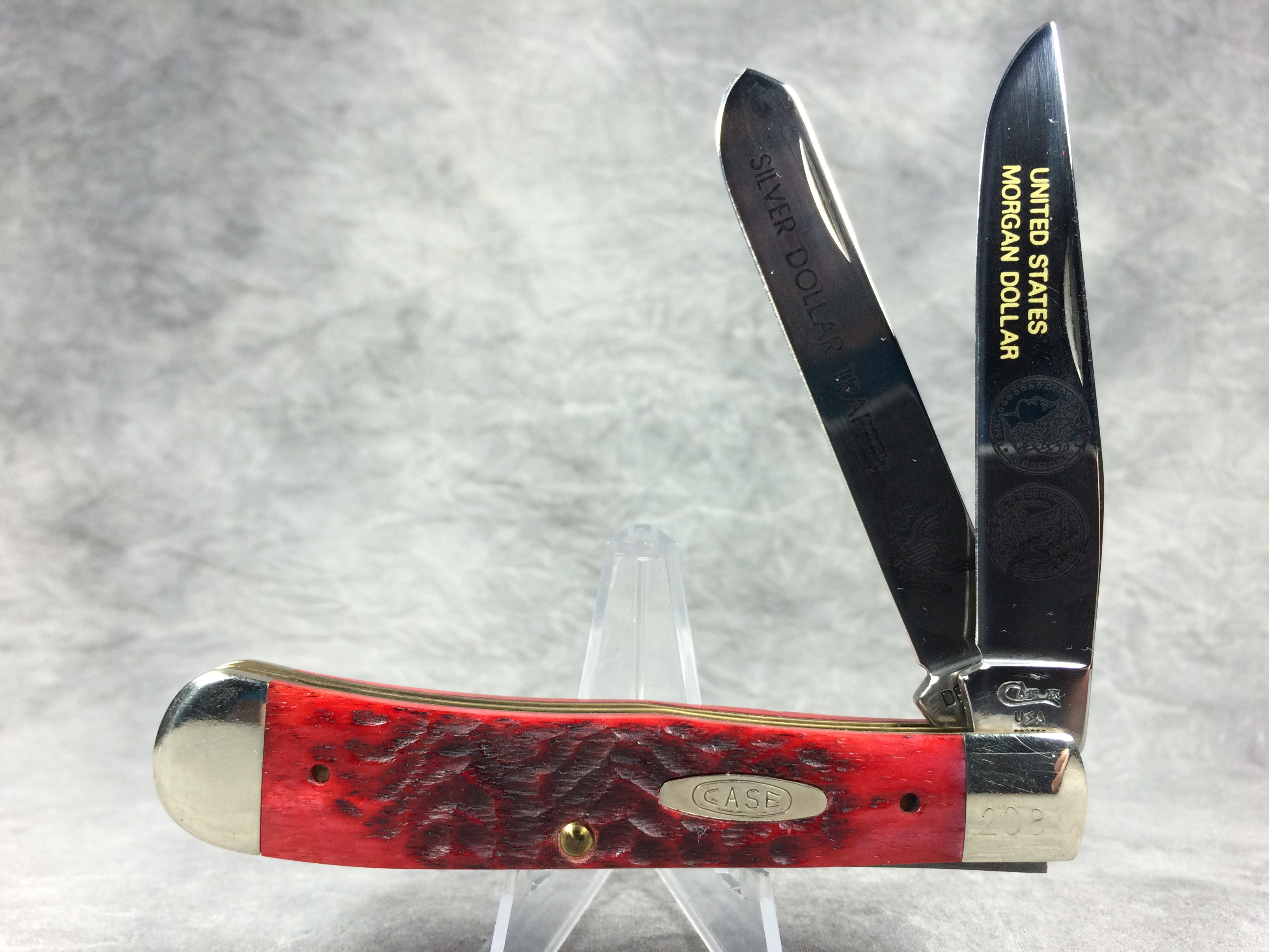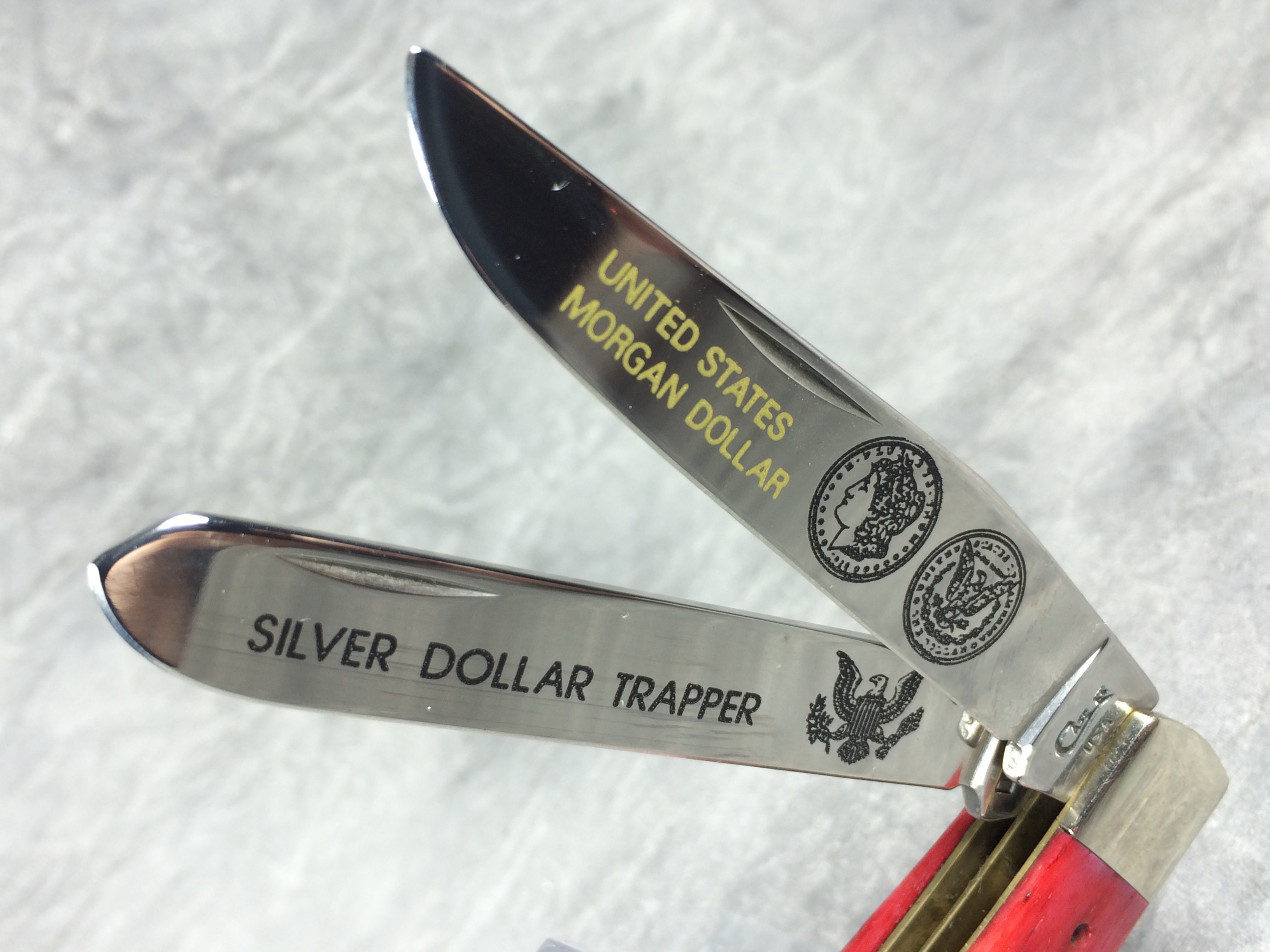 November 06, 2025 - 4-1/8 inches closed. 7-3/8 inches open. Made in USA. "CASE XX USA ****** " (6 dot with lightning bolt S) and "DR6254 SS" tang stamps. Double Oval 'Open C' CASE shield. Stainless Steel blades etched "Silver Dollar Trapper" with eagle image and "United States Morgan Dollar" with image of both sides of coin. Jigged red bone handle. Nickel Silver bolsters. Front right bolster etched with serial. Brass liner.