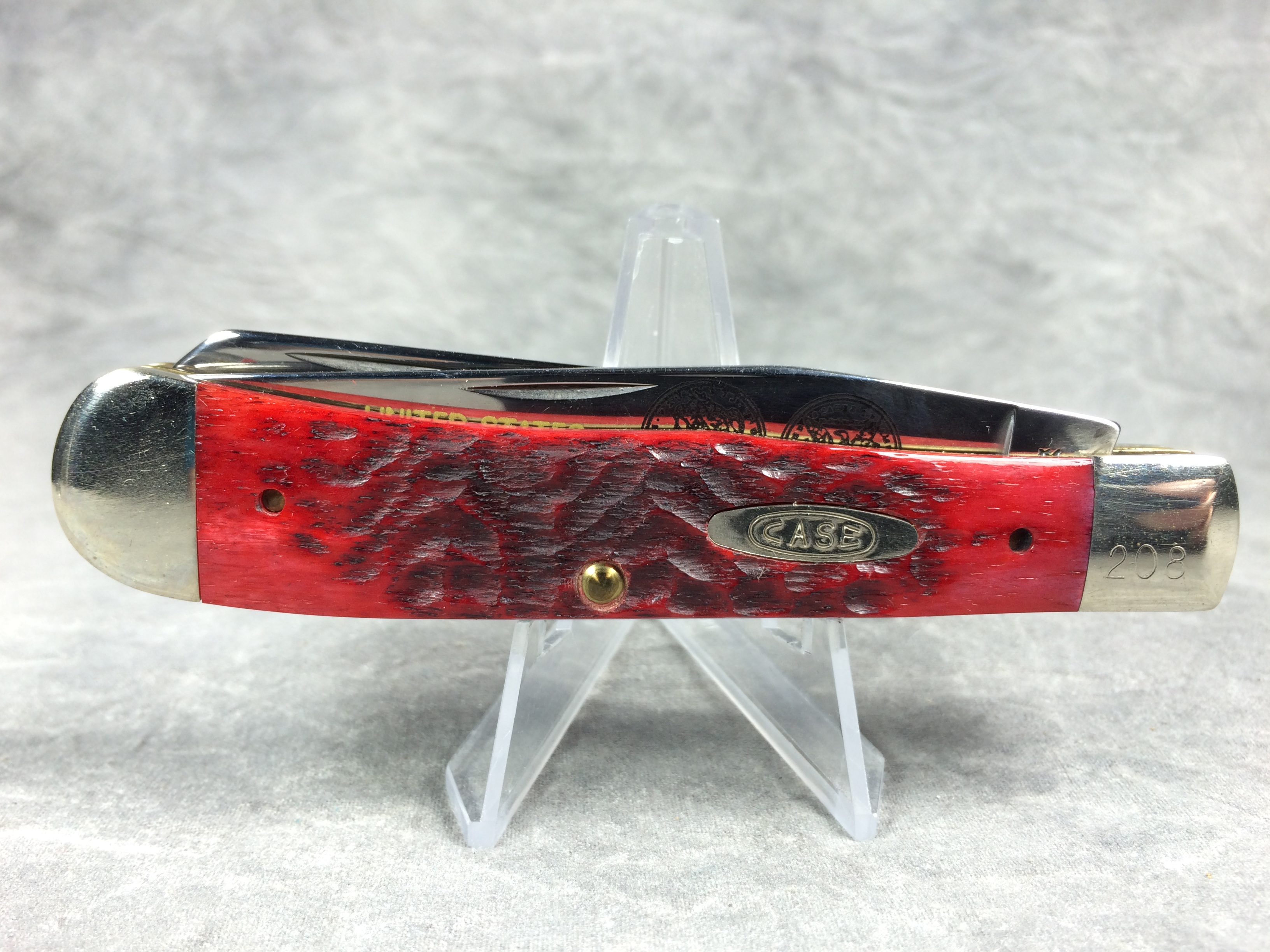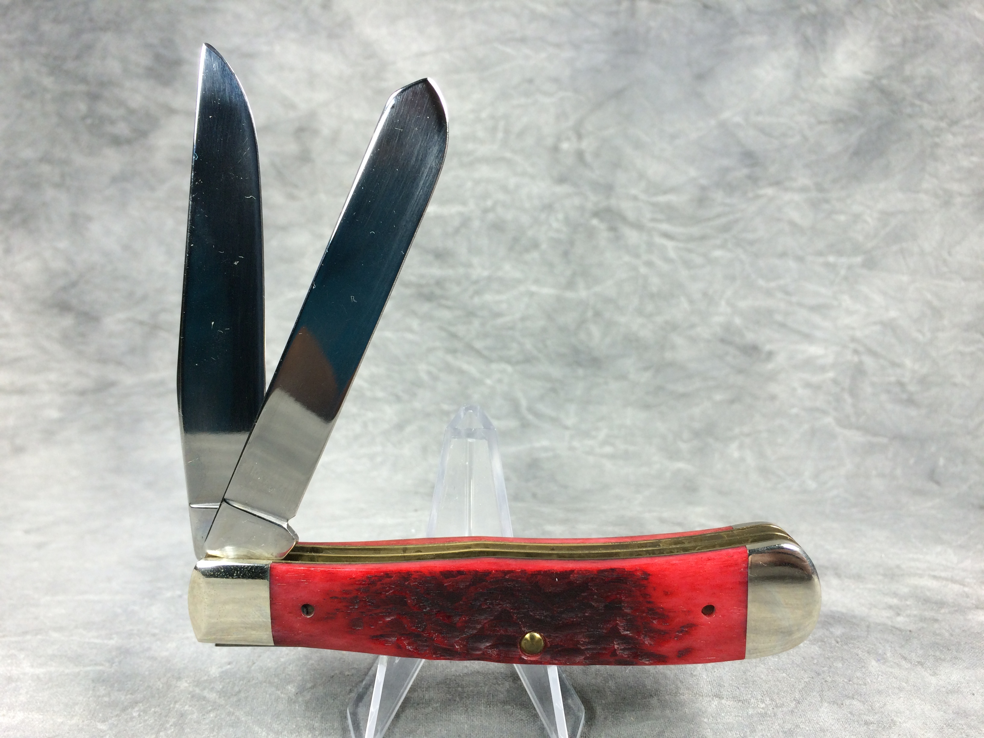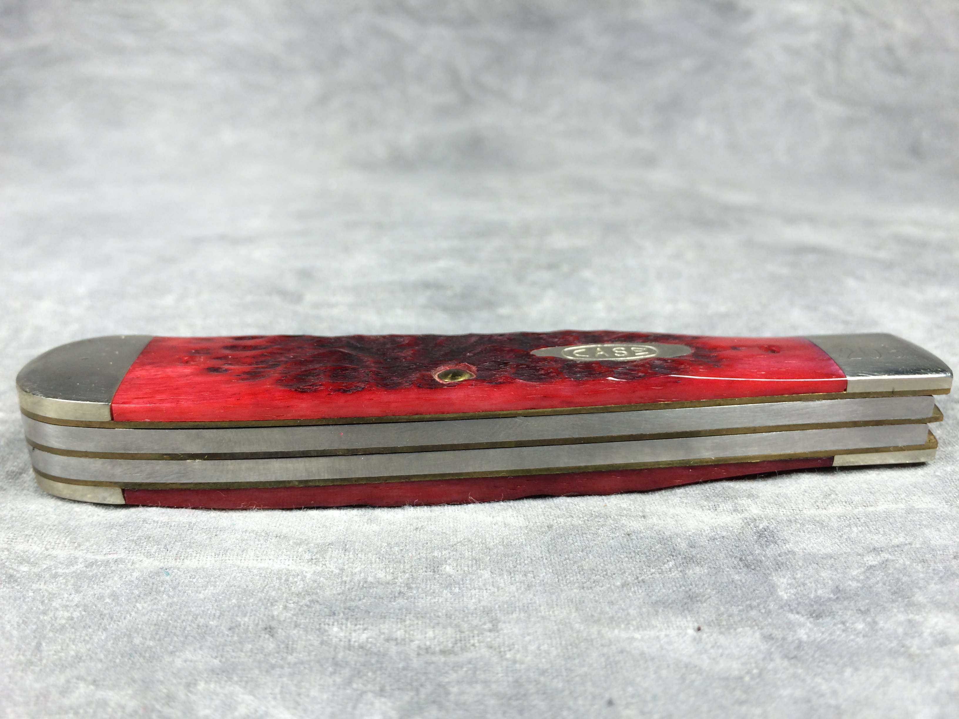 November 06, 2025 - 4-1/8 inches closed. 7-3/8 inches open. Made in USA. "CASE XX USA ****** " (6 dot with lightning bolt S) and "DR6254 SS" tang stamps. Double Oval 'Open C' CASE shield. Stainless Steel blades etched "Silver Dollar Trapper" with eagle image and "United States Morgan Dollar" with image of both sides of coin. Jigged red bone handle. Nickel Silver bolsters. Front right bolster etched with serial. Brass liner.