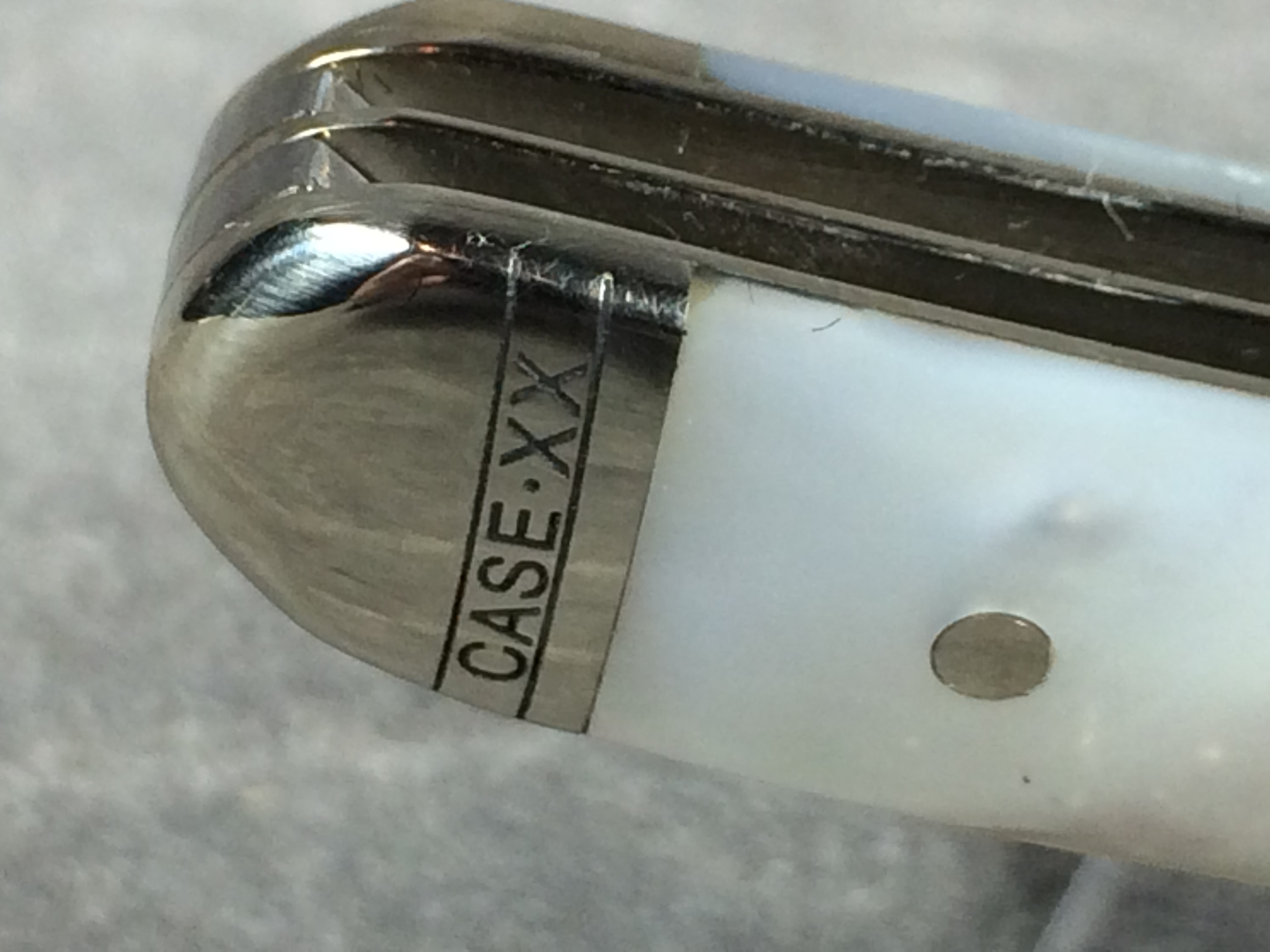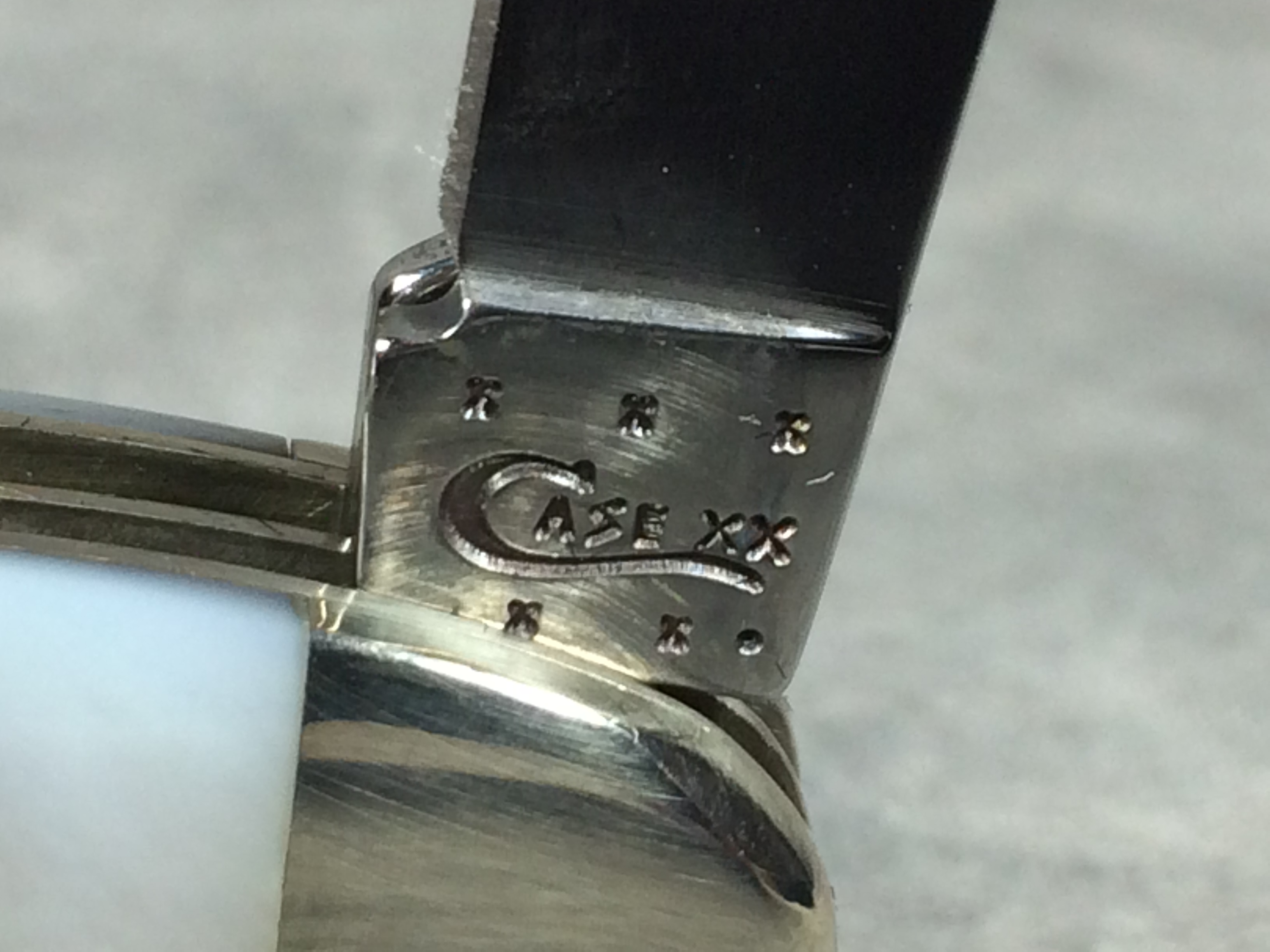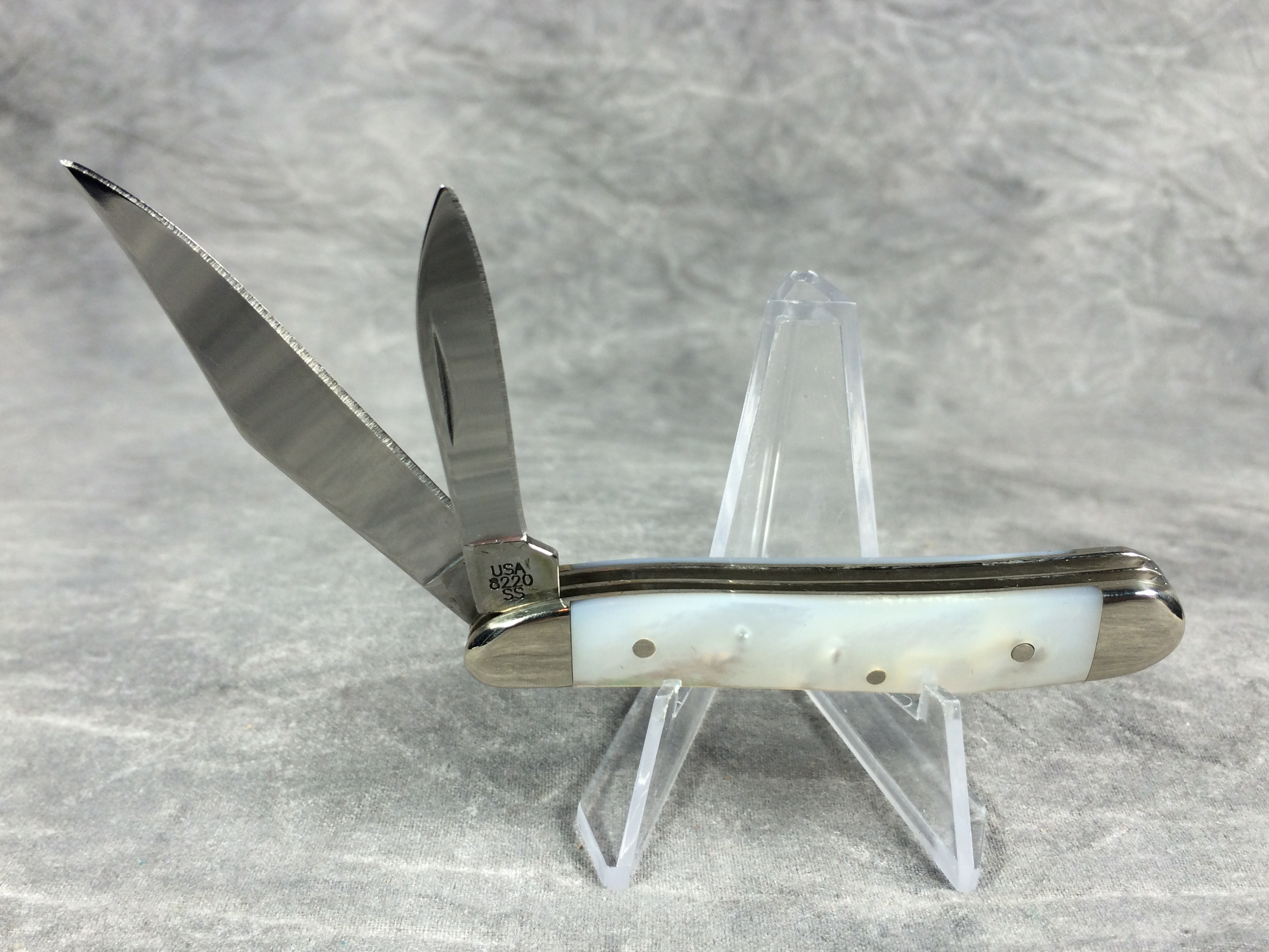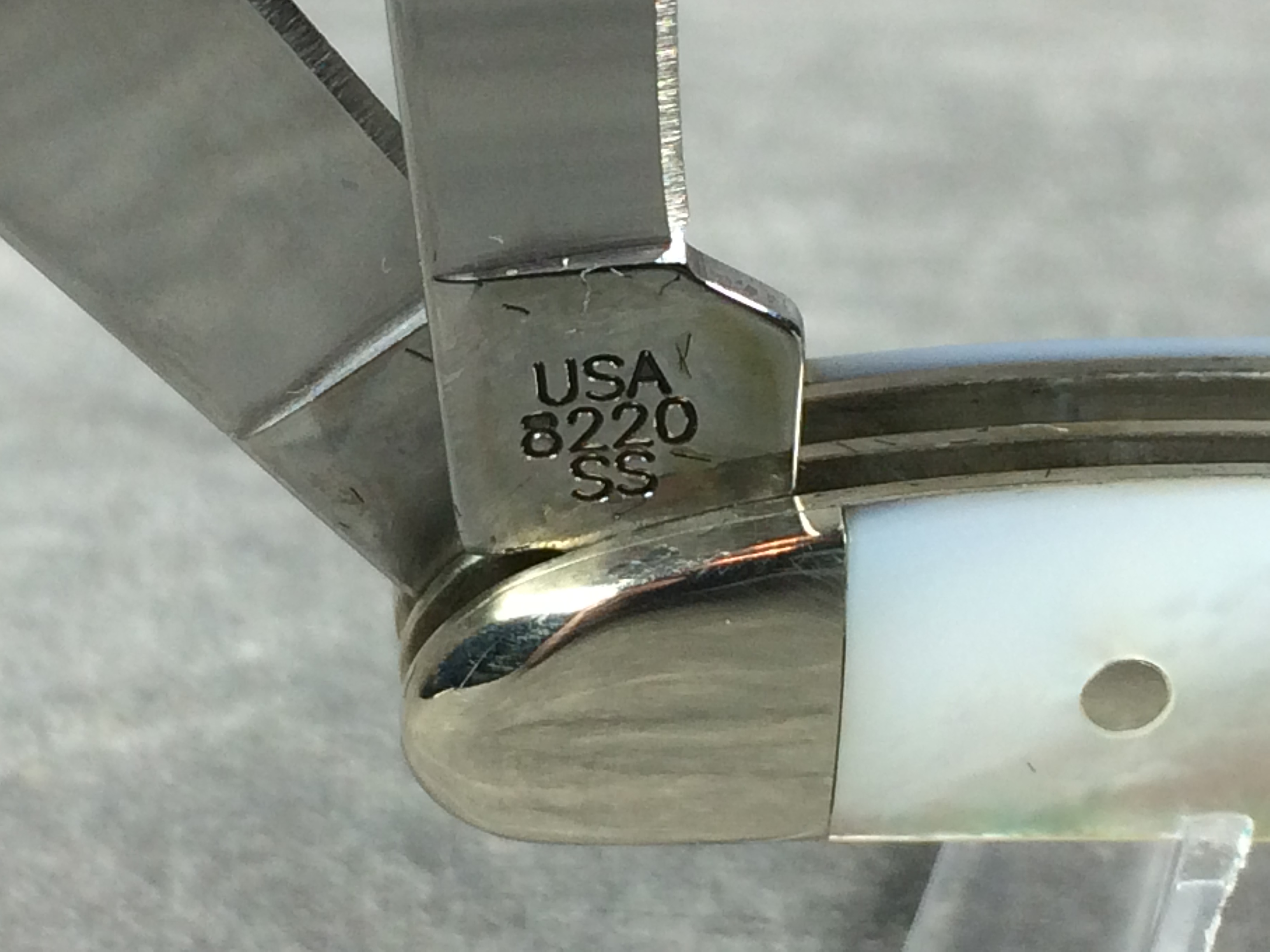 December 22, 2025 - 2-3/4 inches closed. 4-7/8 inches open. Made in USA. "  x x x  Case XX   x x*  " (with lightning bolt S) and "USA 8220 SS" tang stamps. Stainless Steel blades. Mother of Pearl handle. Nickel Silver bolsters and liner. Left front bolster etched "CASE XX".