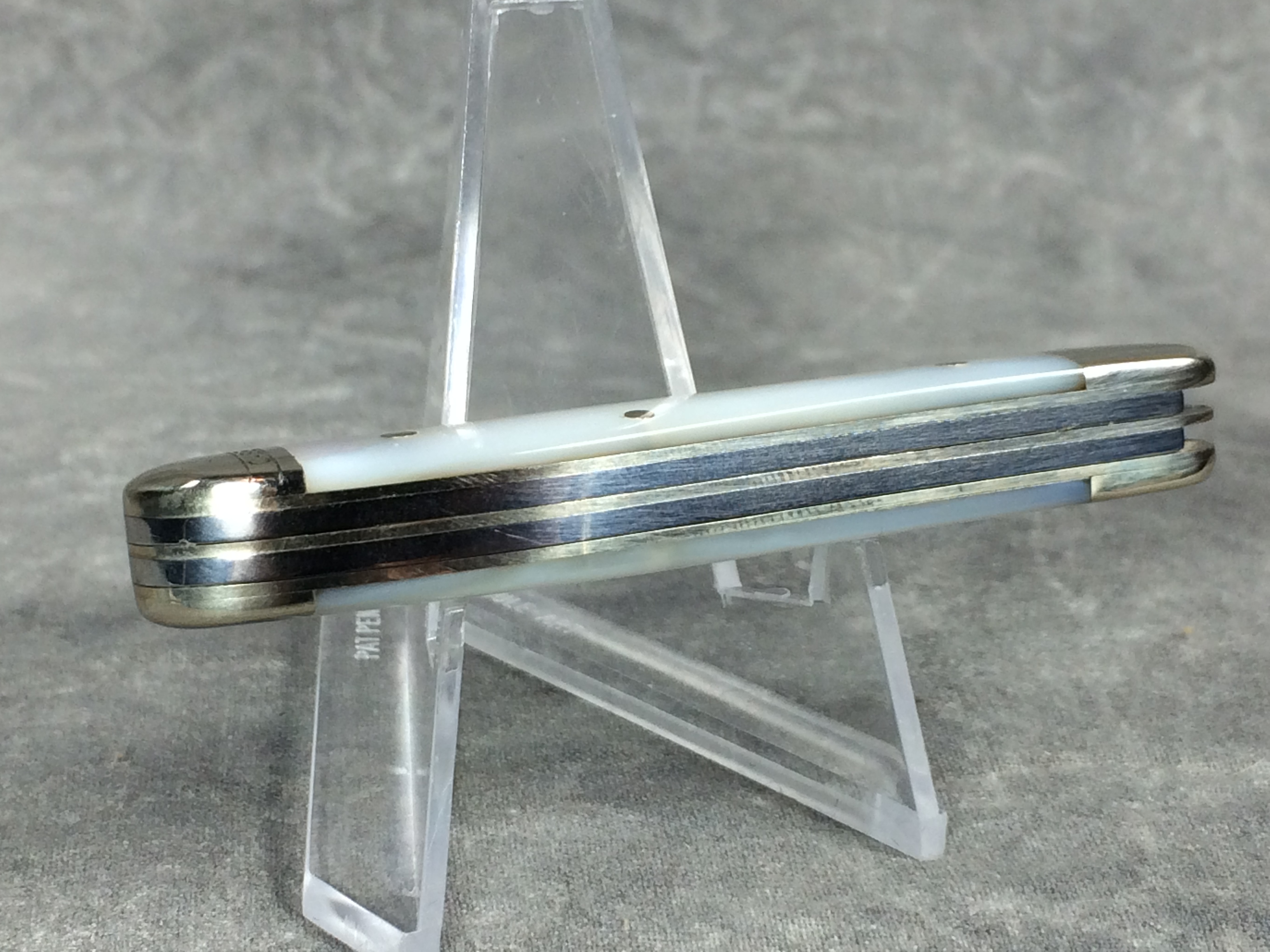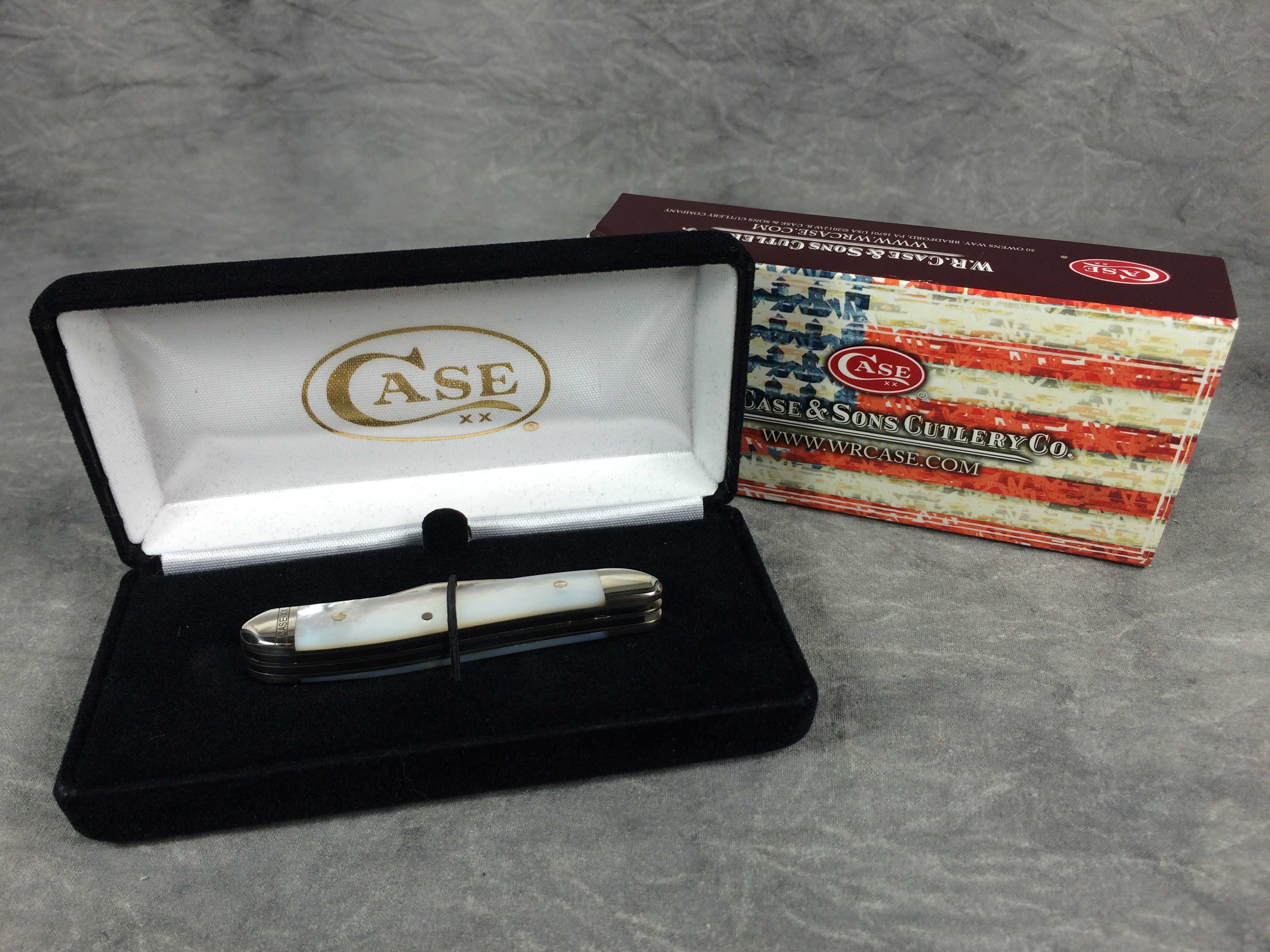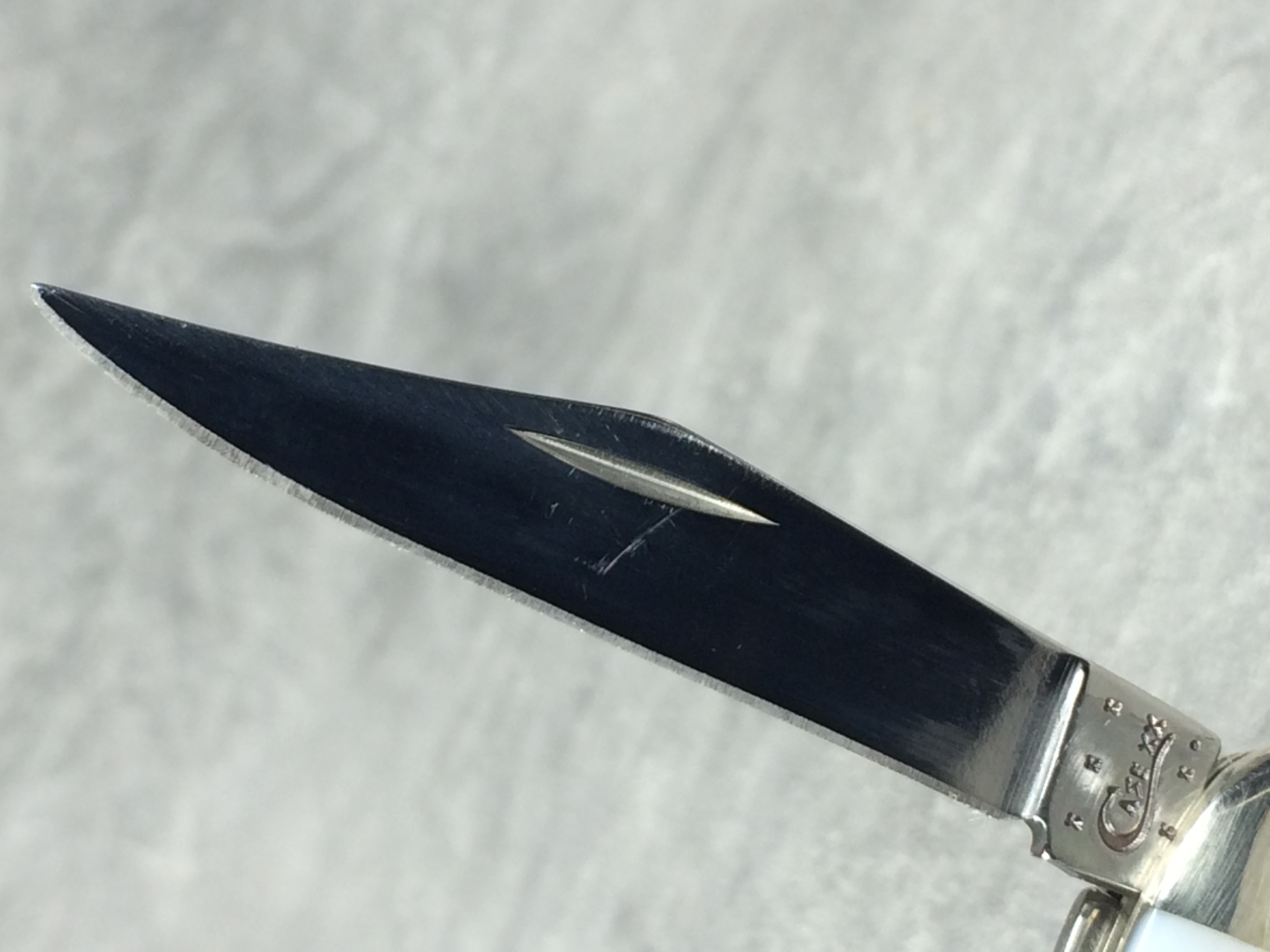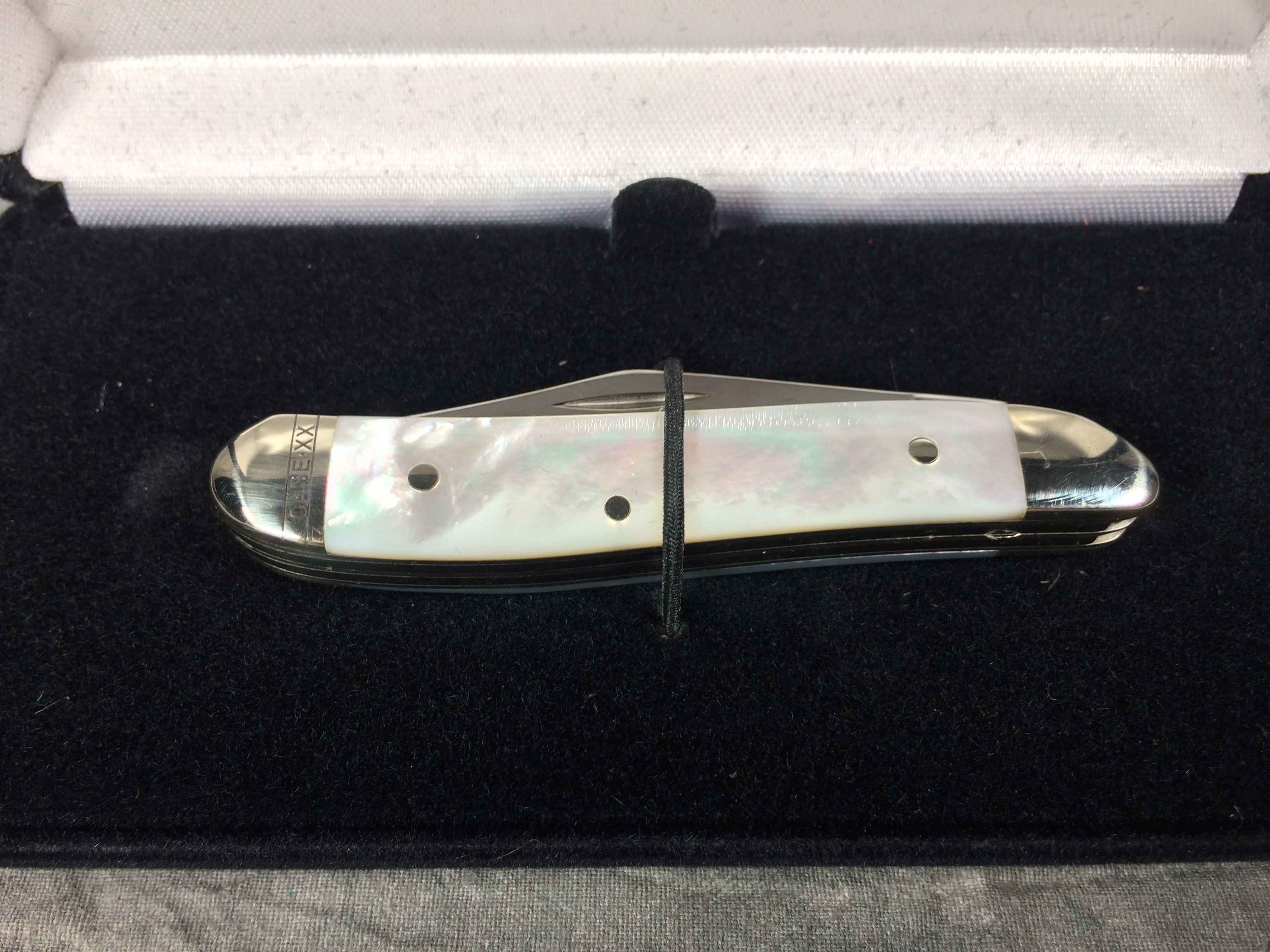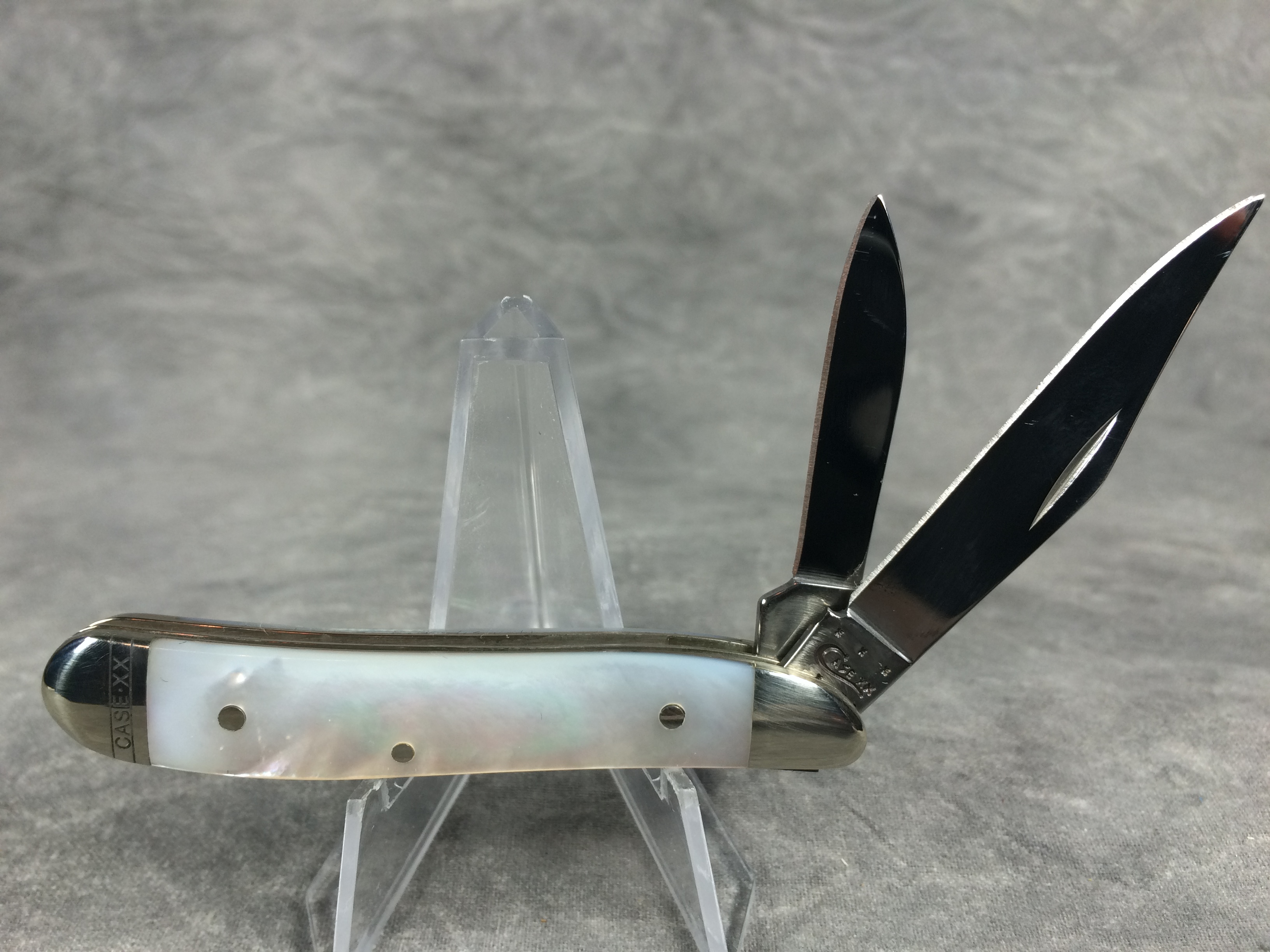 December 22, 2025 - 2-3/4 inches closed. 4-7/8 inches open. Made in USA. "  x x x  Case XX   x x*  " (with lightning bolt S) and "USA 8220 SS" tang stamps. Stainless Steel blades. Mother of Pearl handle. Nickel Silver bolsters and liner. Left front bolster etched "CASE XX".