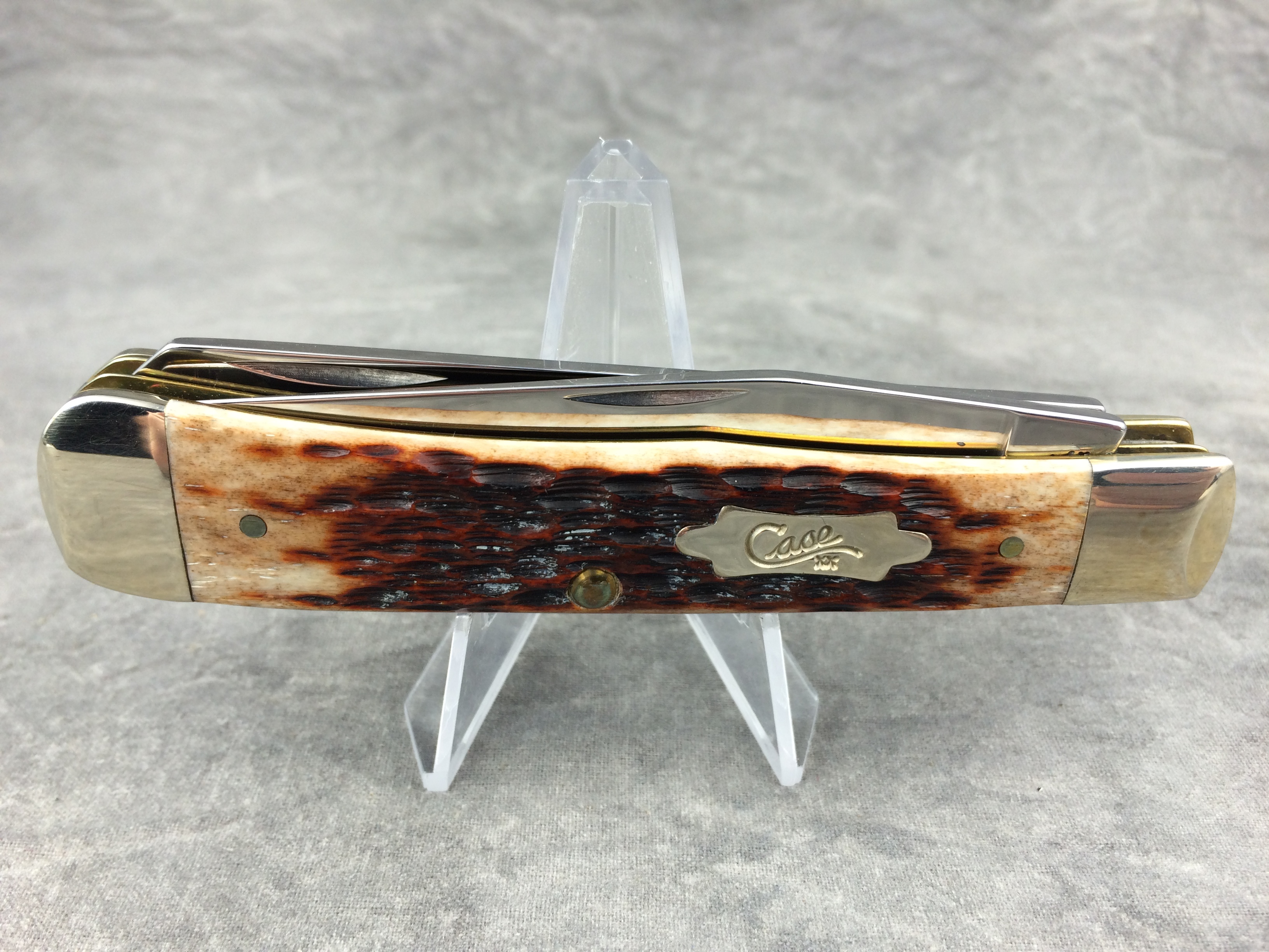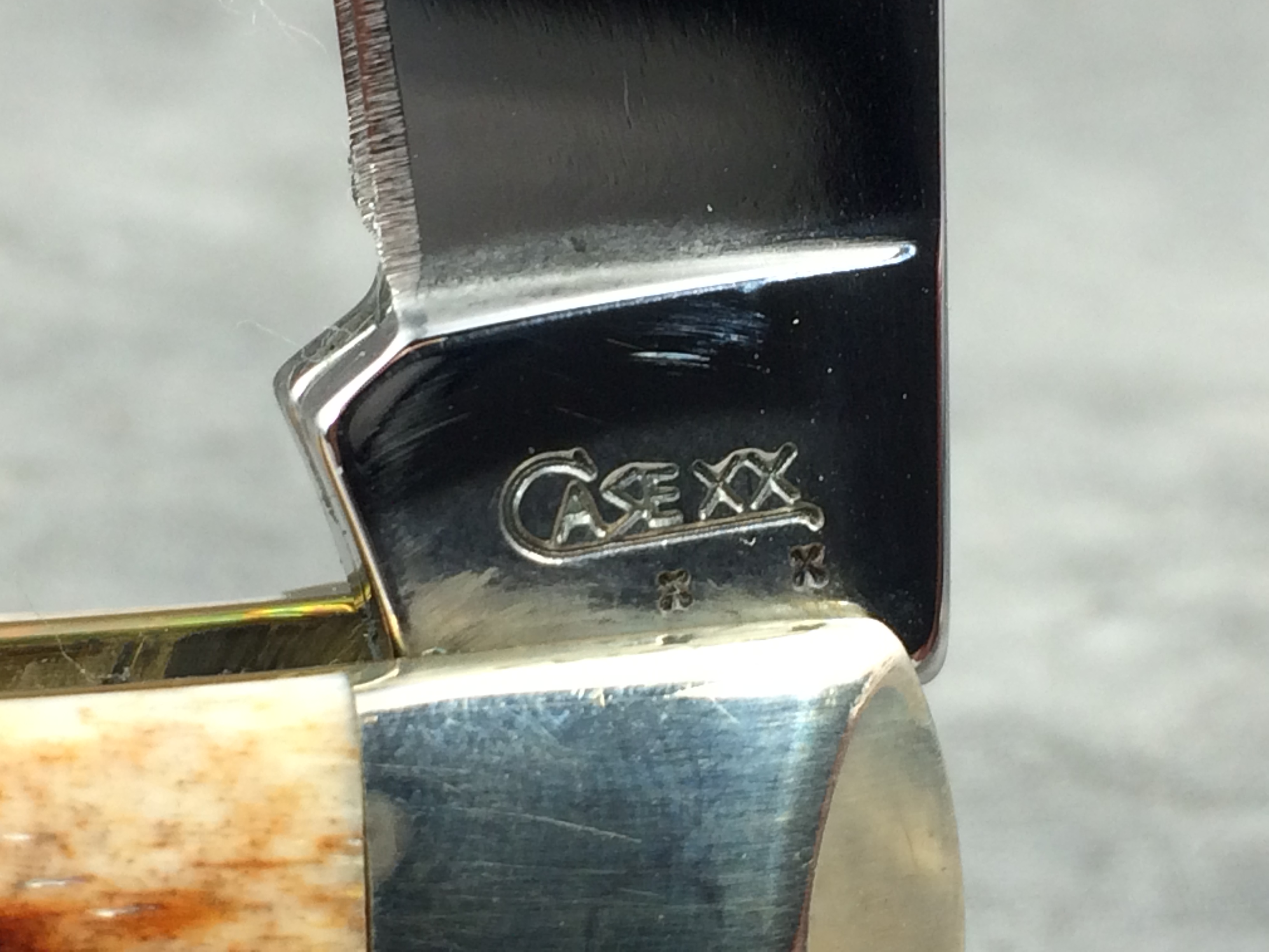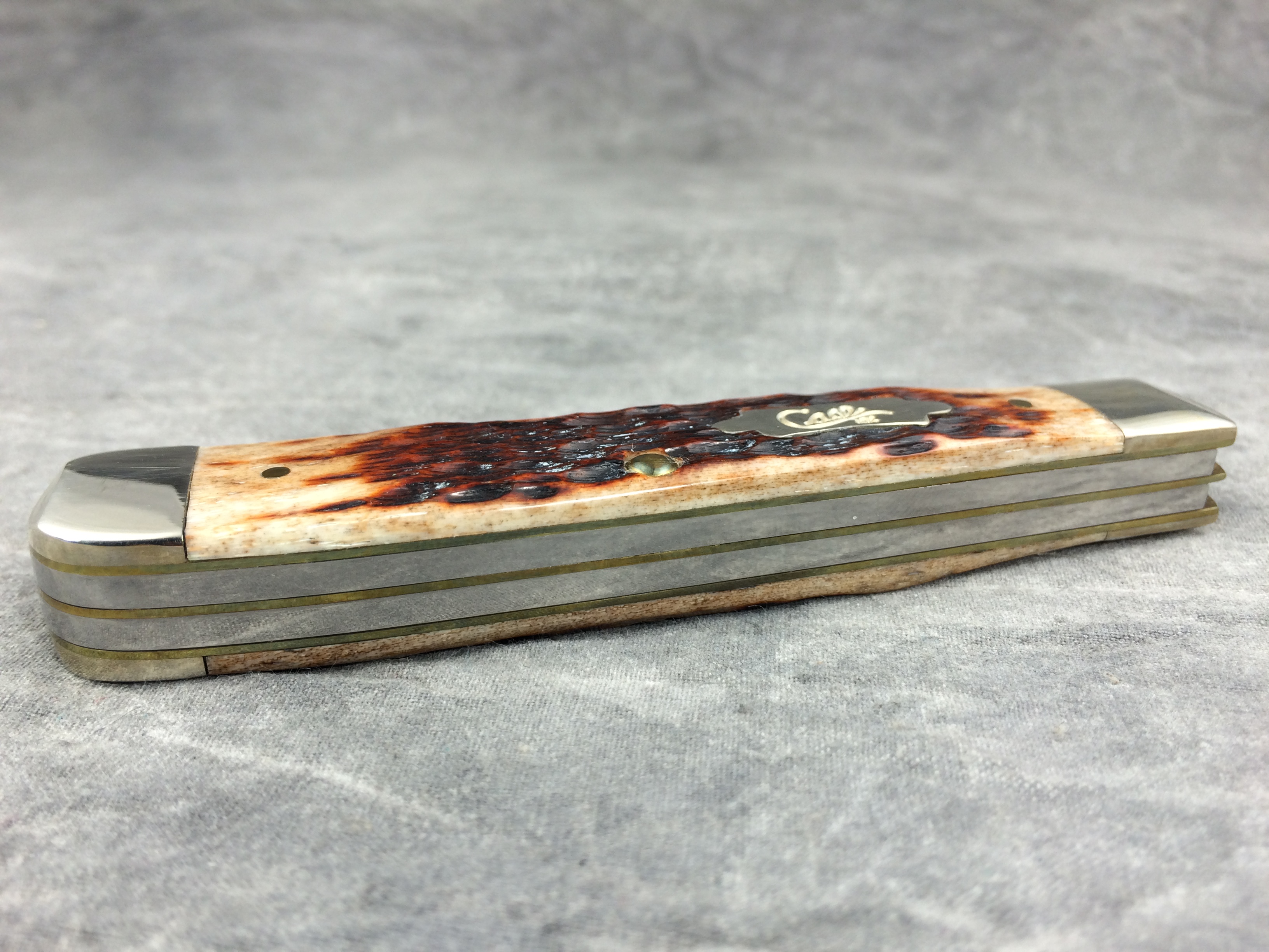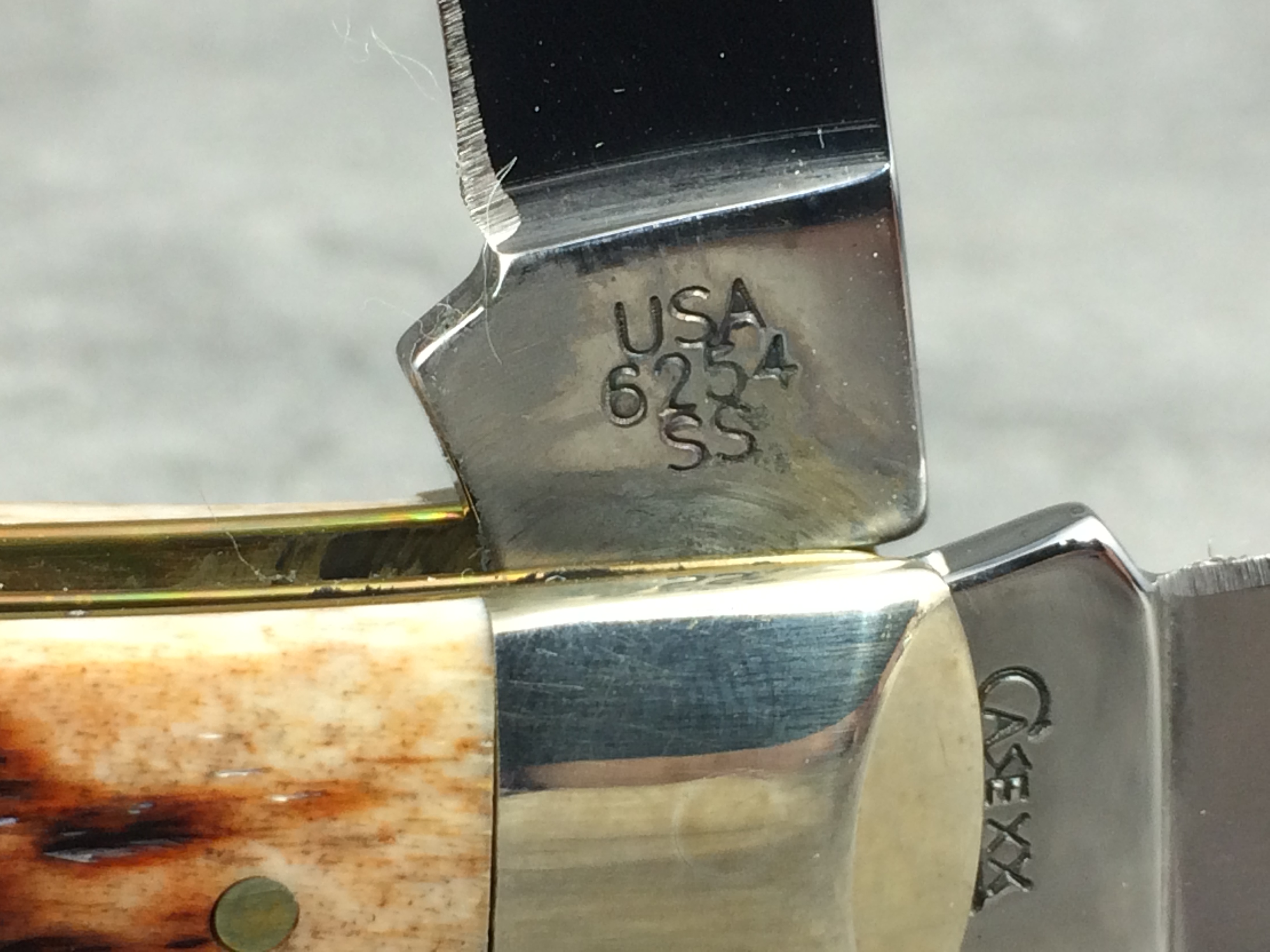 November 06, 2025 - 4-1/8 inches closed. 7-3/8 inches open. Made in USA. "     Case XX     x x  " (with lightning bolt S) and "USA 6254 SS" tang stamps. "Case XX" gimp shield. Stainless Steel blades. Caramel-colored peach seed jigged bone handle. Nickel Silver bolsters. Brass liner. With original box and paperwork.