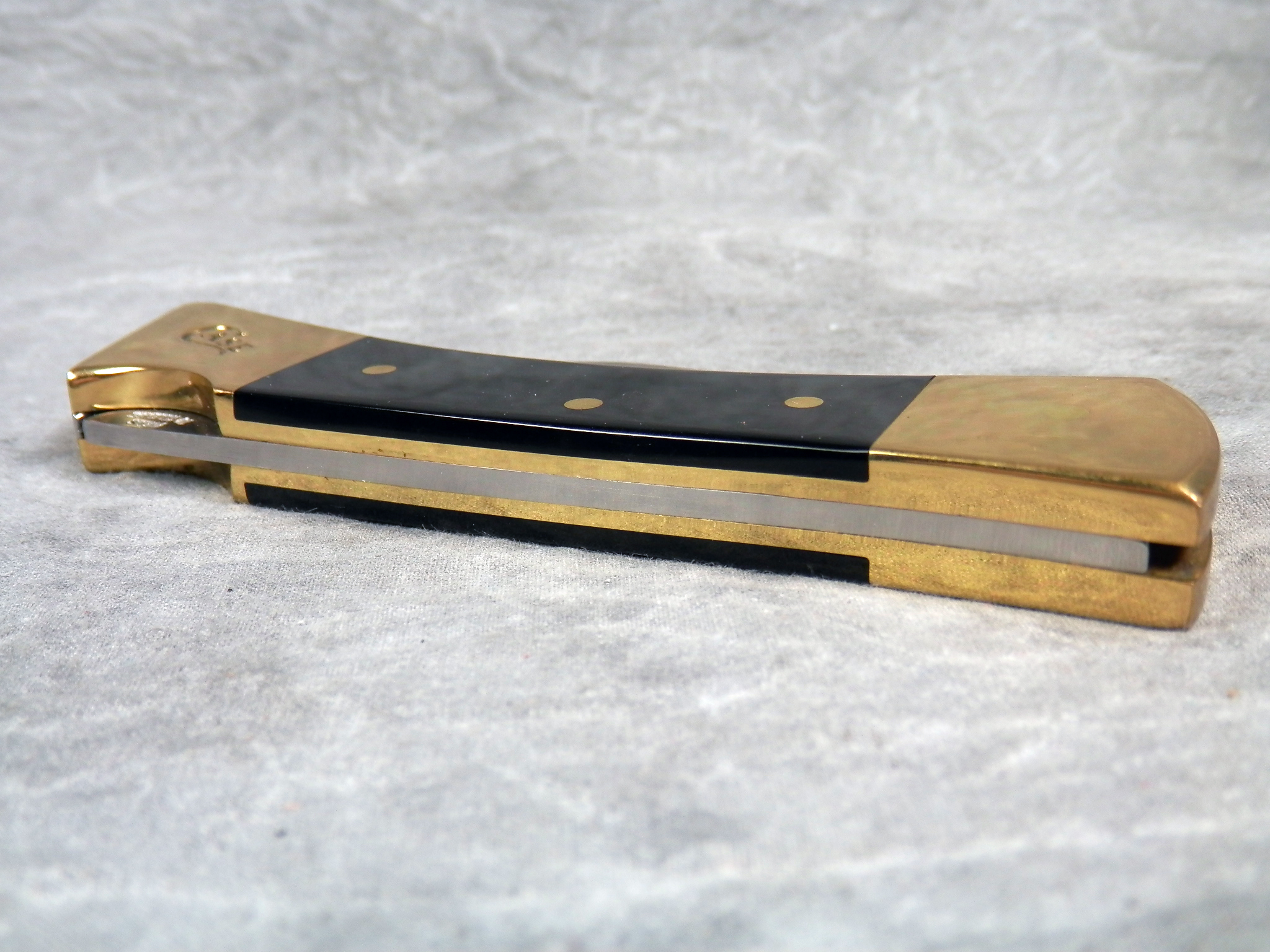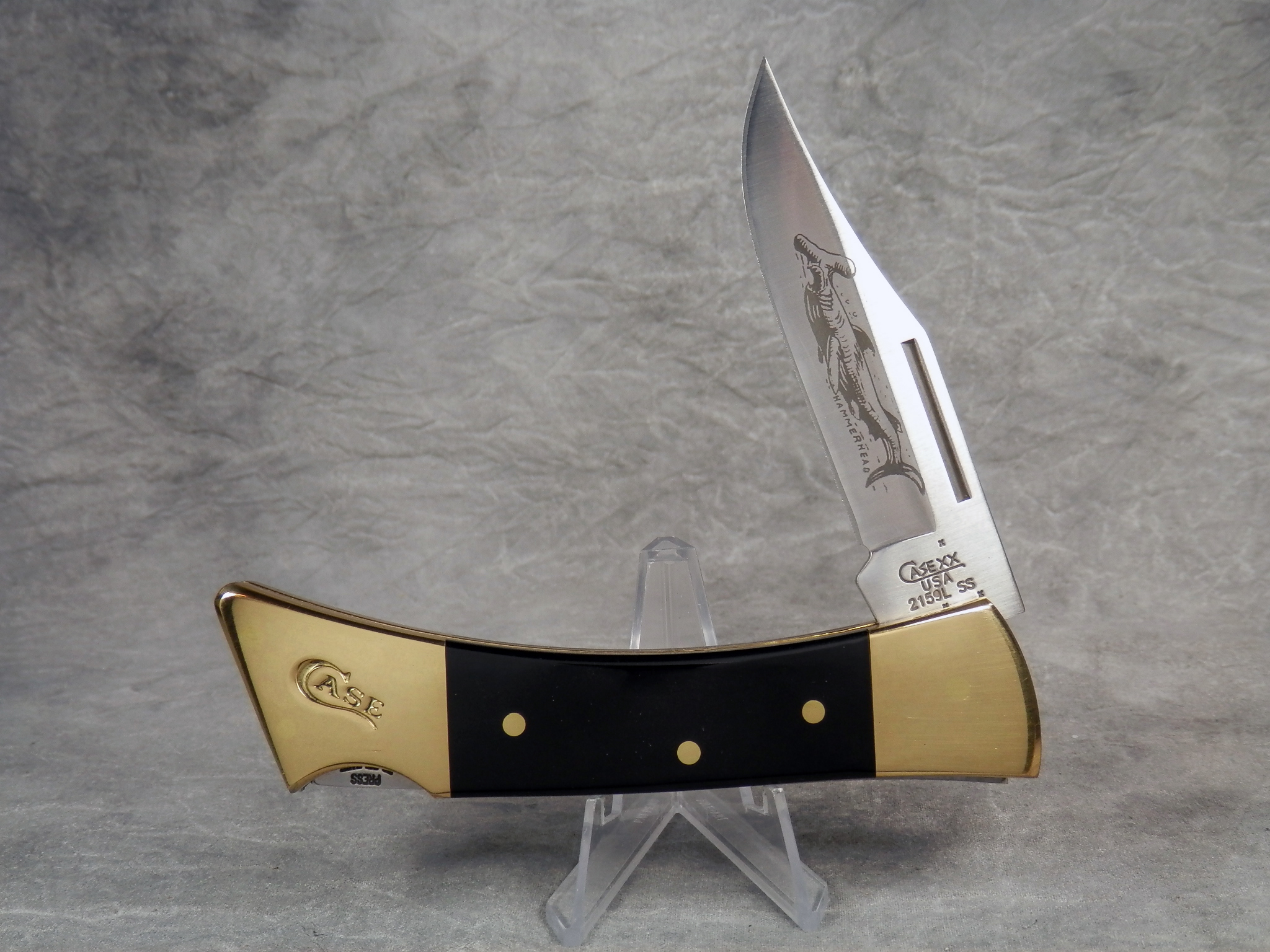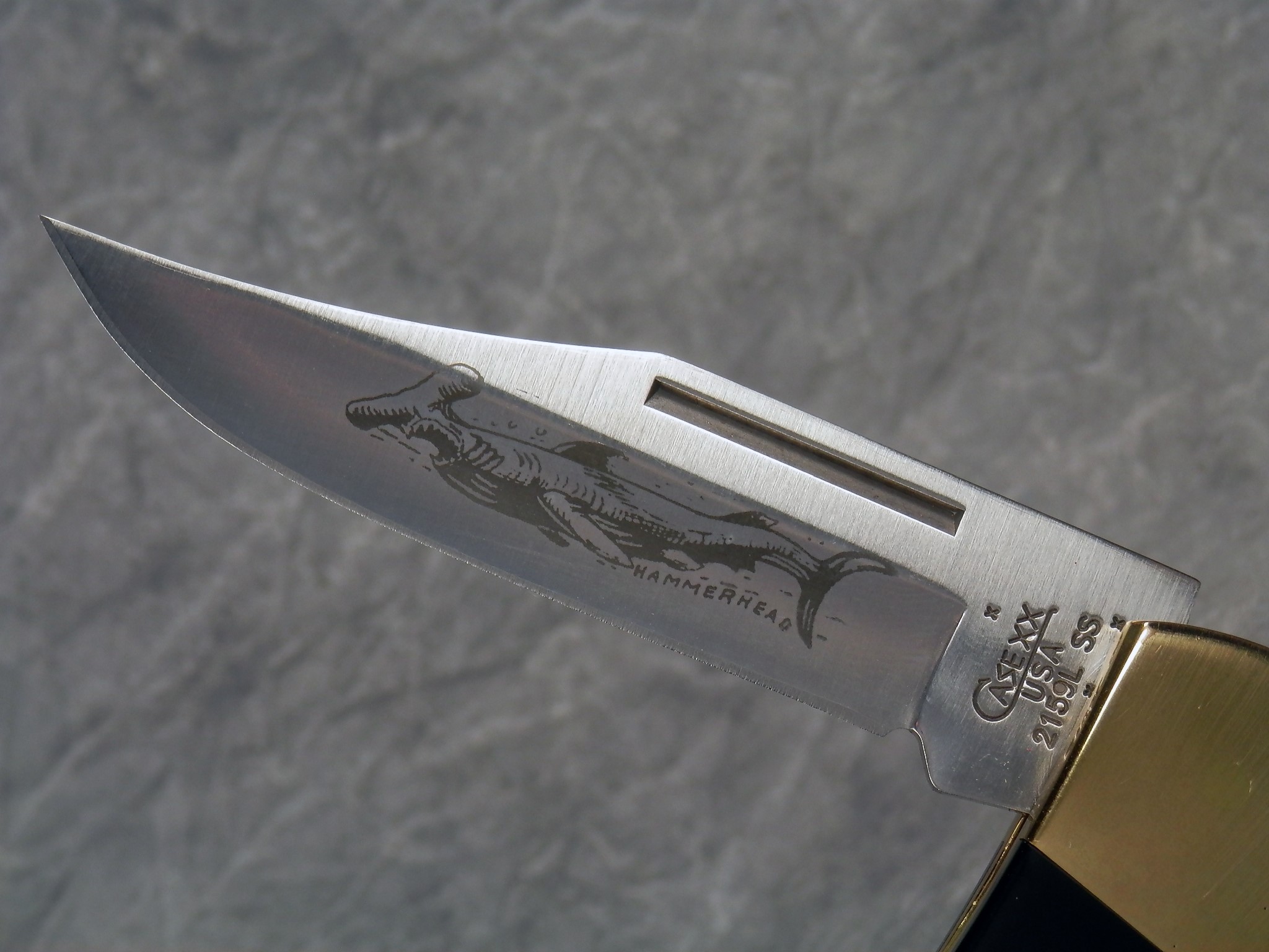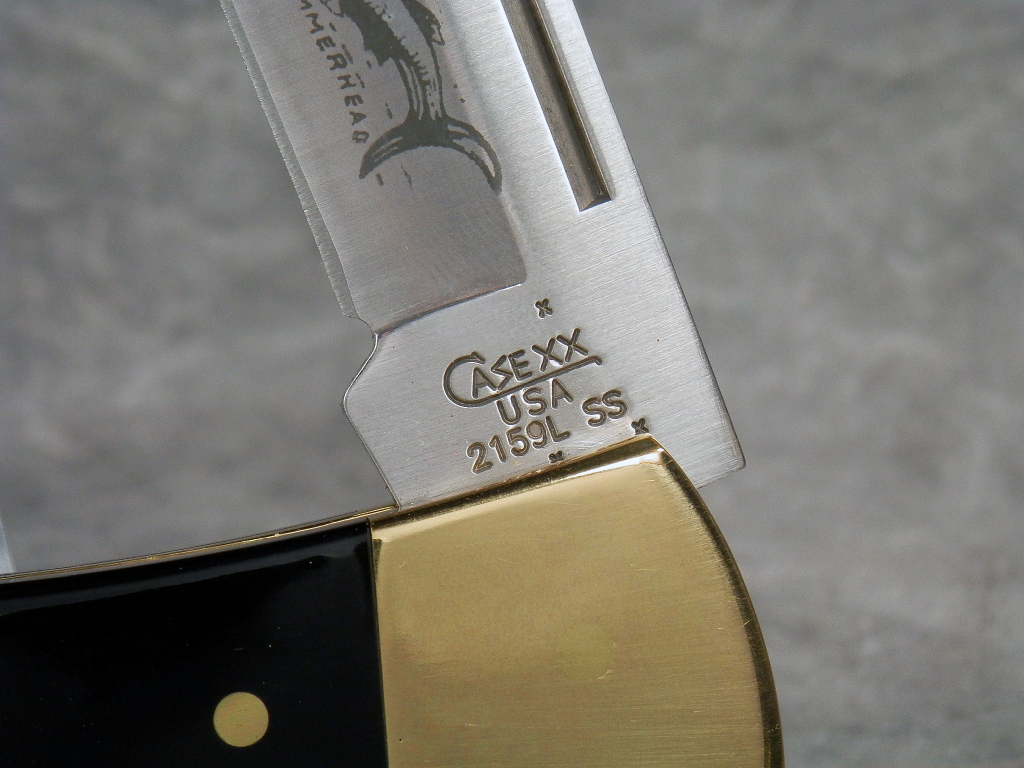 November 03, 2025 - Knife is 5 inches closed, 8-1/2 inches open. Made in USA. "     x  CASE XX USA 2159L SS    x x  " (with lightning bolt S) tang stamp. Stainless Steel blade etched with image of hammerhead shark. Black handle. Brass bolsters and liner.  Front left bolster etched "CASE".