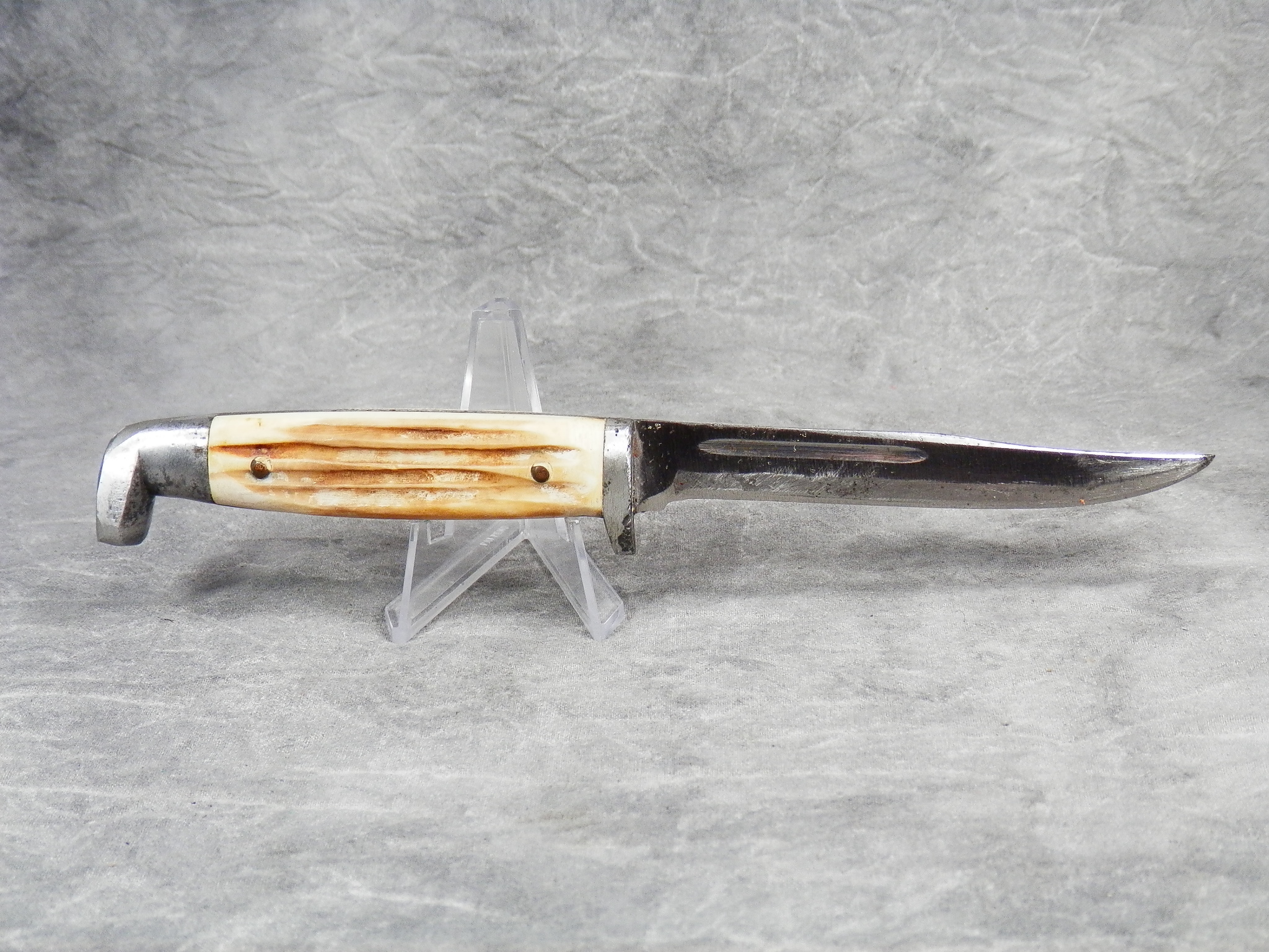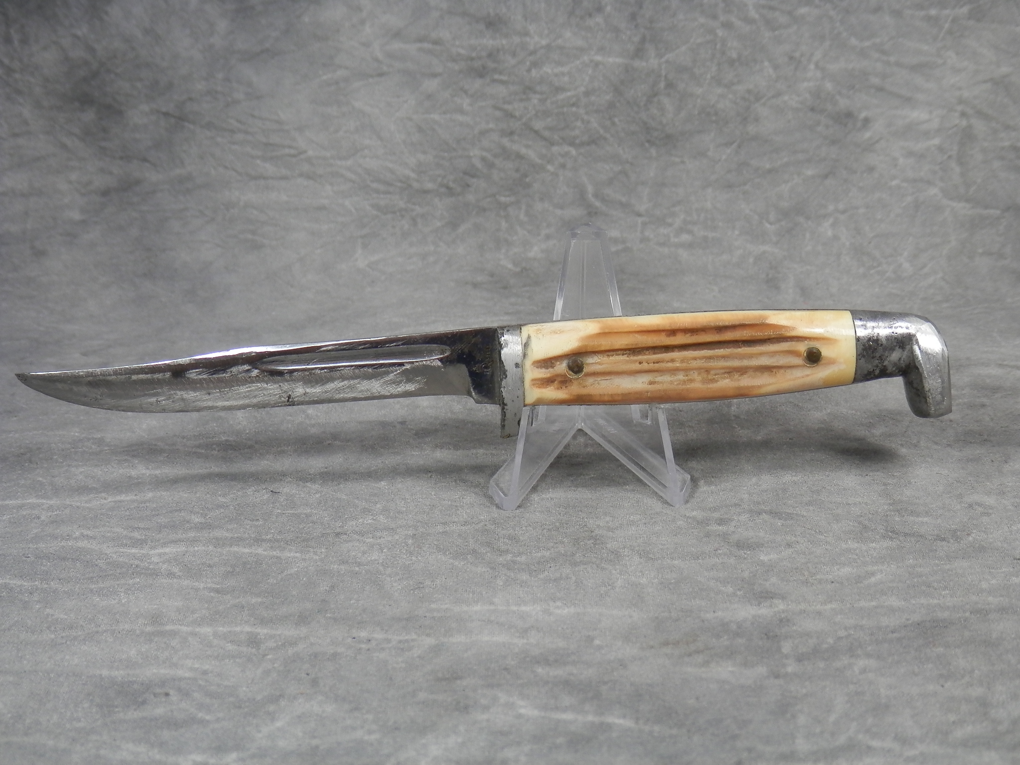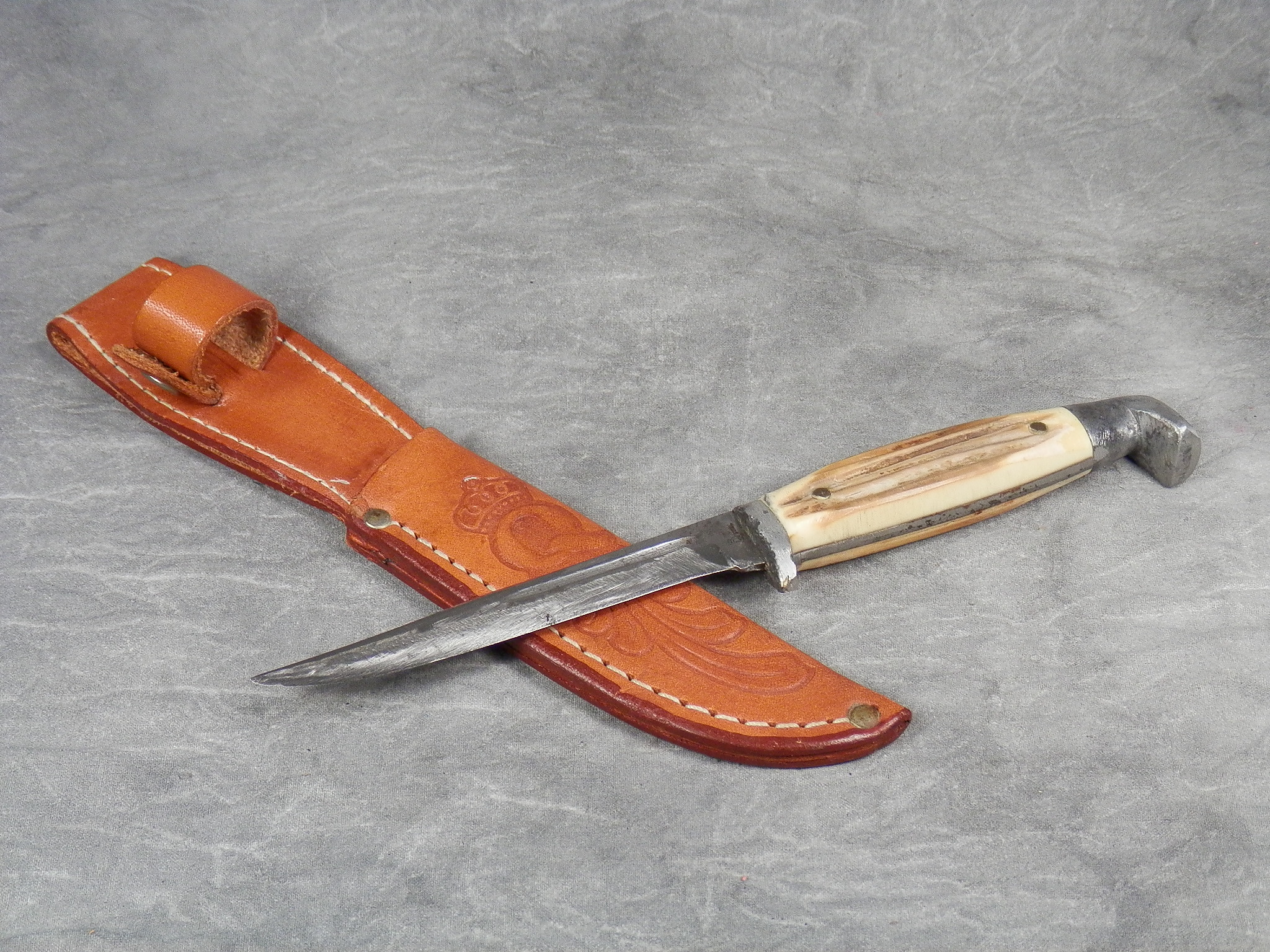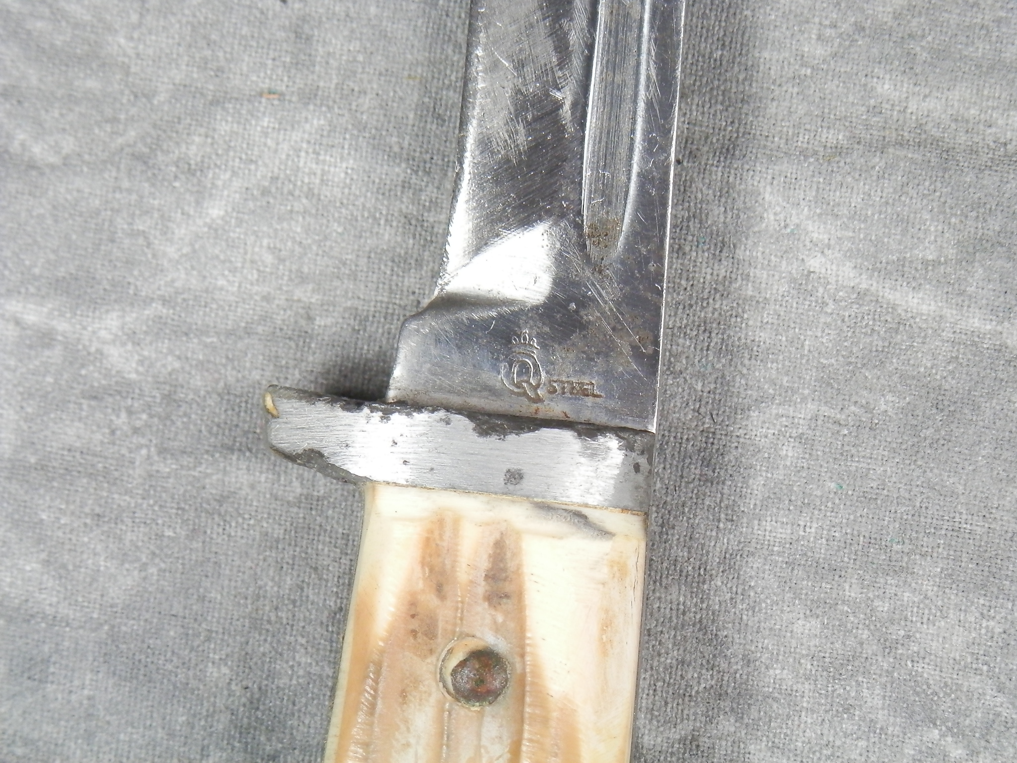 December 22, 2025 - Fixed Blade Hunting Knife. 7-3/4 inches closed Crown over Q Queen Logo and "STEEL" tang stamp. With leather sheath.