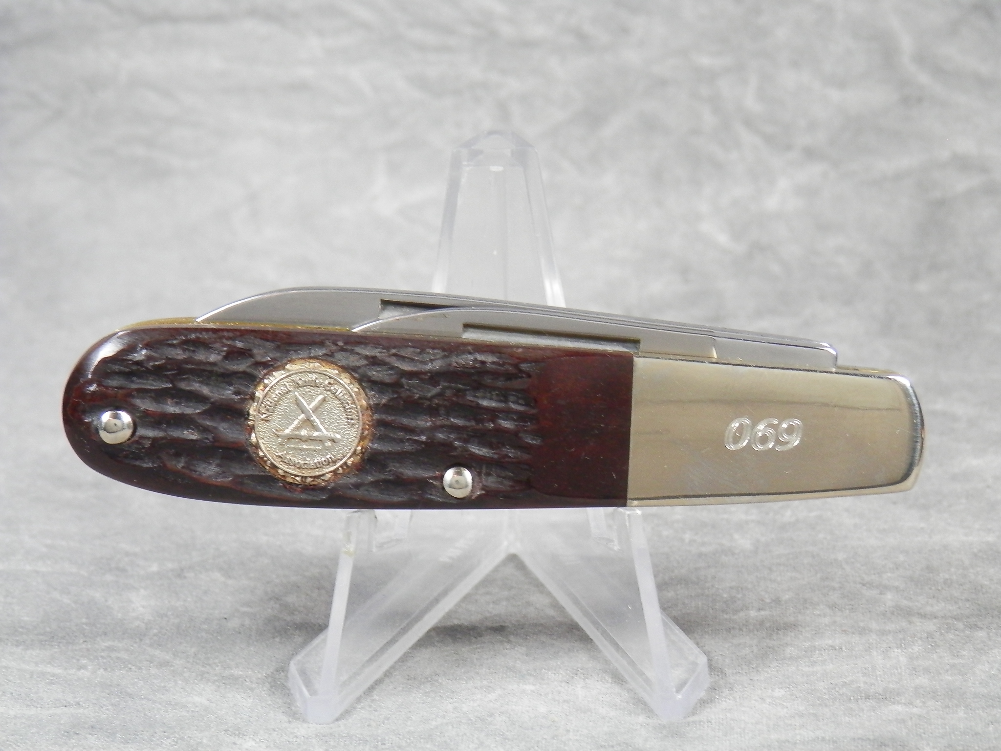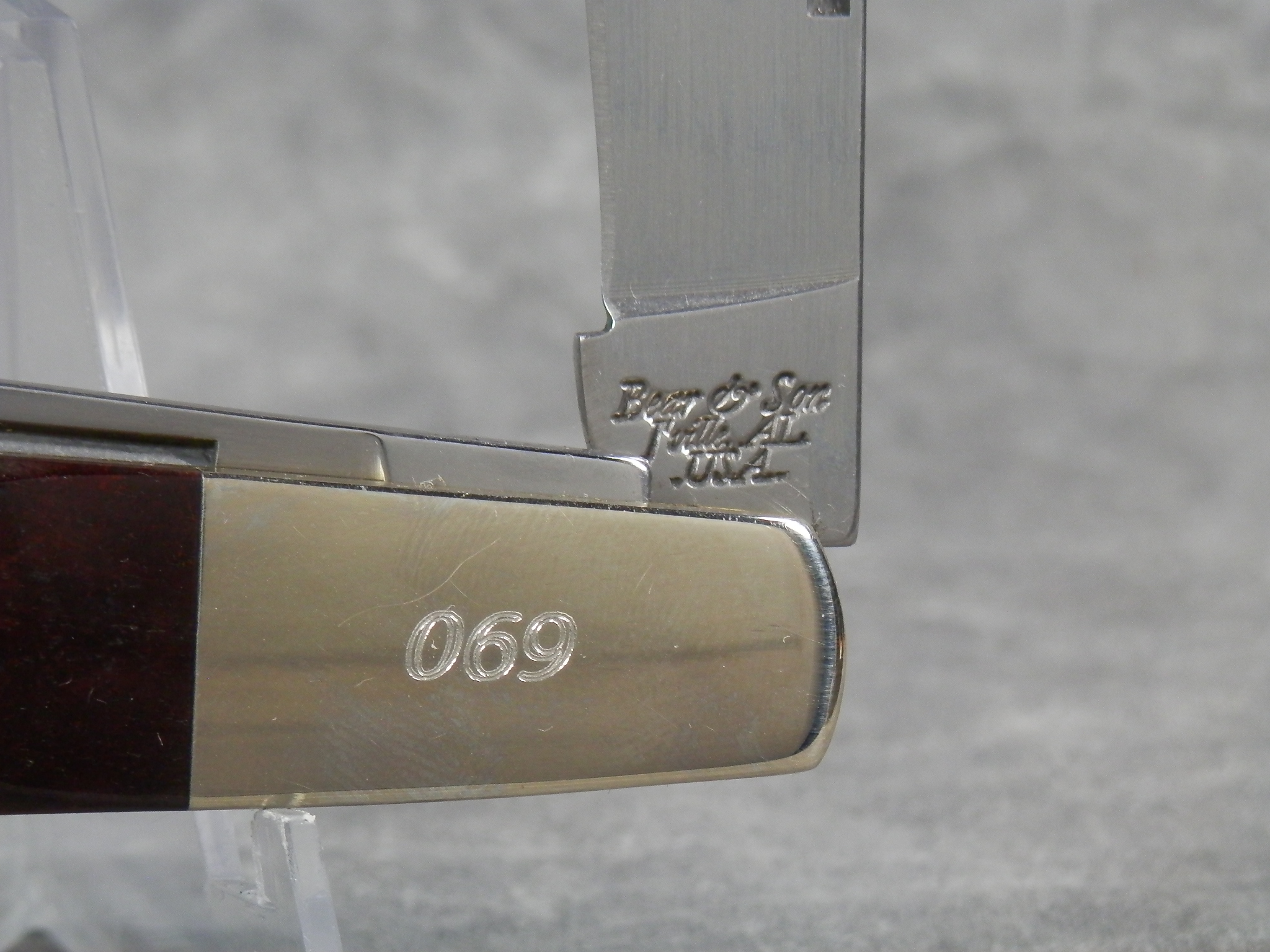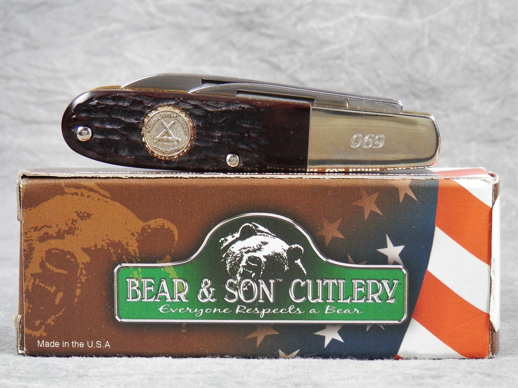 February 18, 2026 - 3-1/2 inches closed. 6 inches open. Made in USA. "Bear & Son J'ville, AL. U.S.A." tang stamp. Round NKCA shield. Stainless Steel blades. Master blade etched "2009 NKCA YOUTH KNIFE 1 of 400". Deep brown jigged bone handles. Nickel Silver bolsters. Front bolster etched with serial #069. Brass liner. With original box and paperwork.