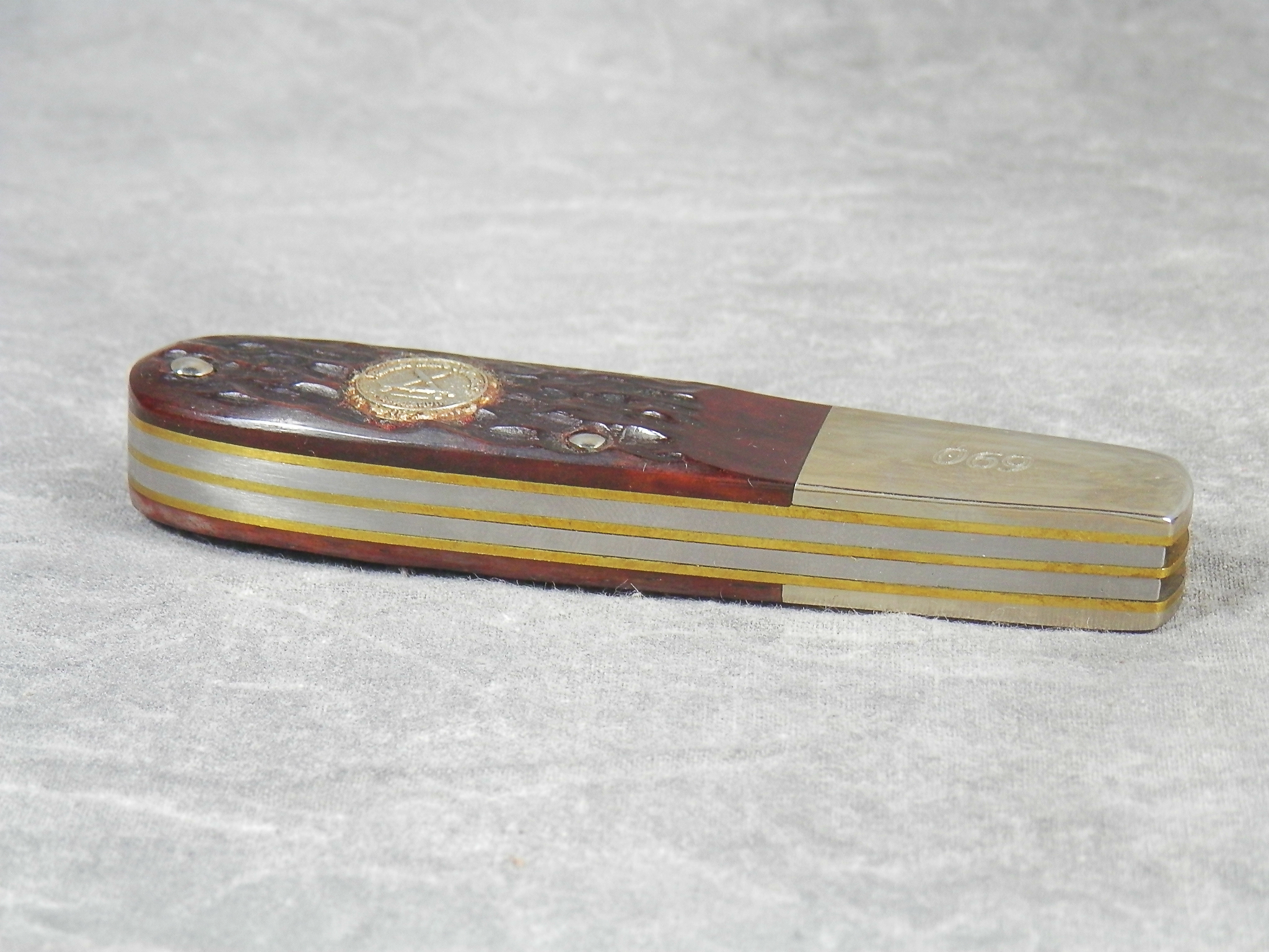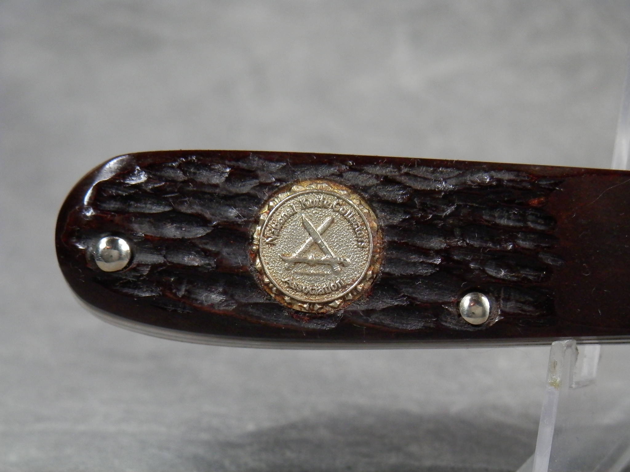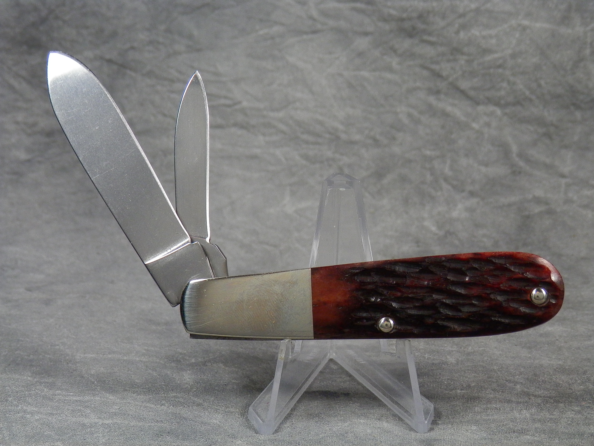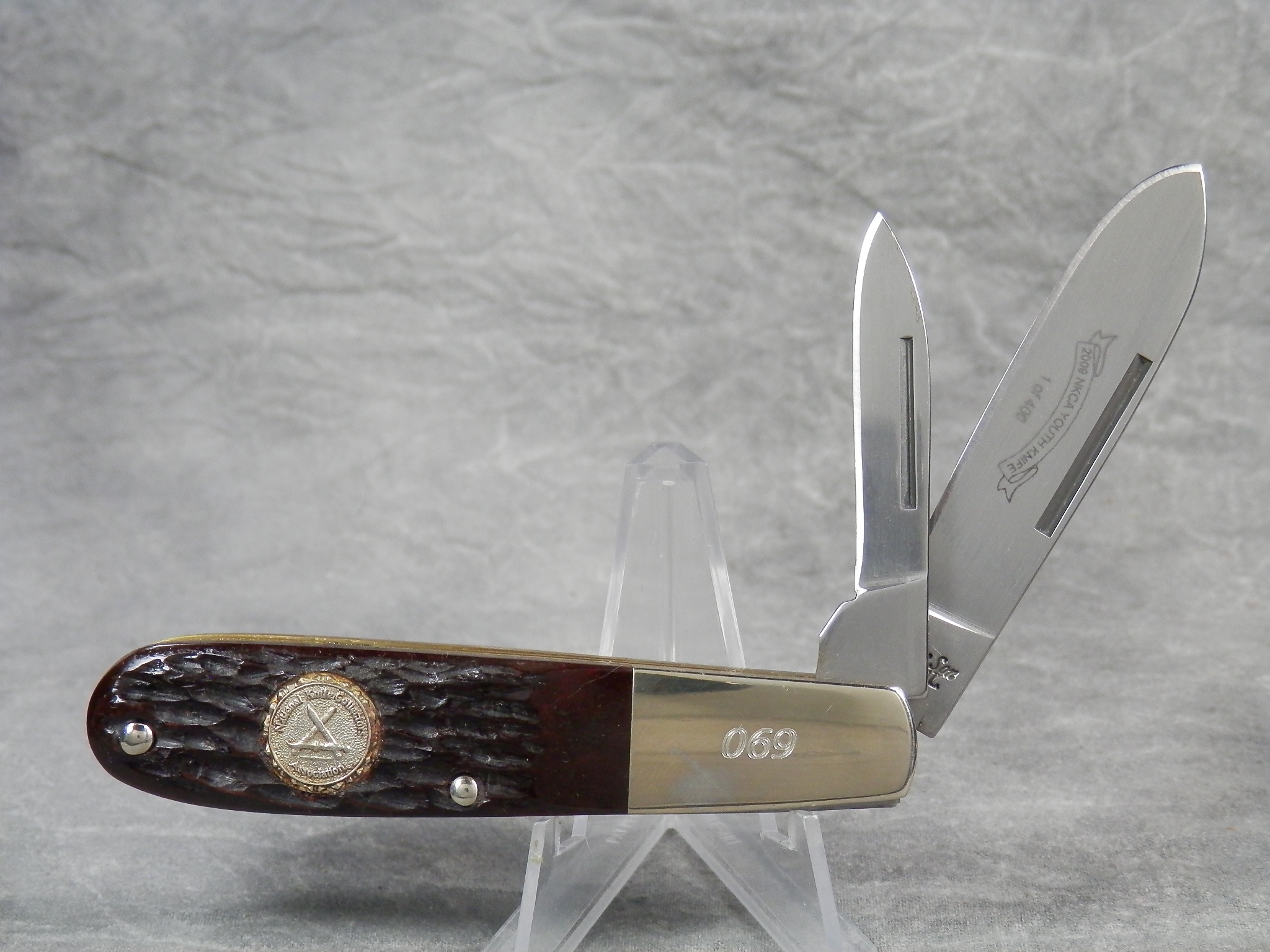 February 18, 2026 - 3-1/2 inches closed. 6 inches open. Made in USA. "Bear & Son J'ville, AL. U.S.A." tang stamp. Round NKCA shield. Stainless Steel blades. Master blade etched "2009 NKCA YOUTH KNIFE 1 of 400". Deep brown jigged bone handles. Nickel Silver bolsters. Front bolster etched with serial #069. Brass liner. With original box and paperwork.