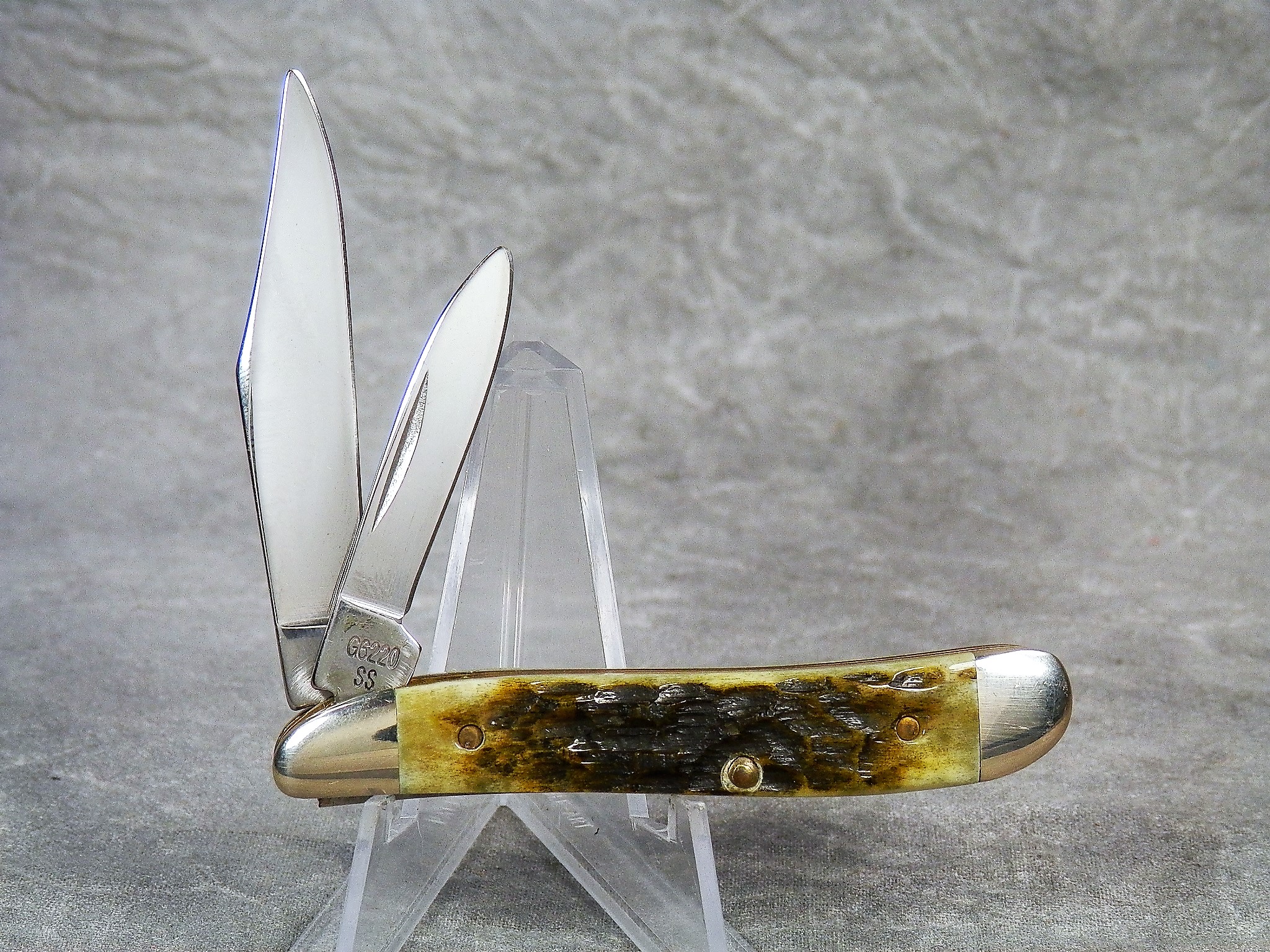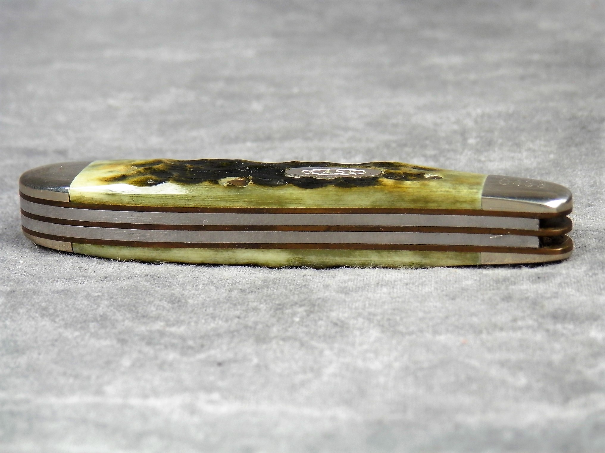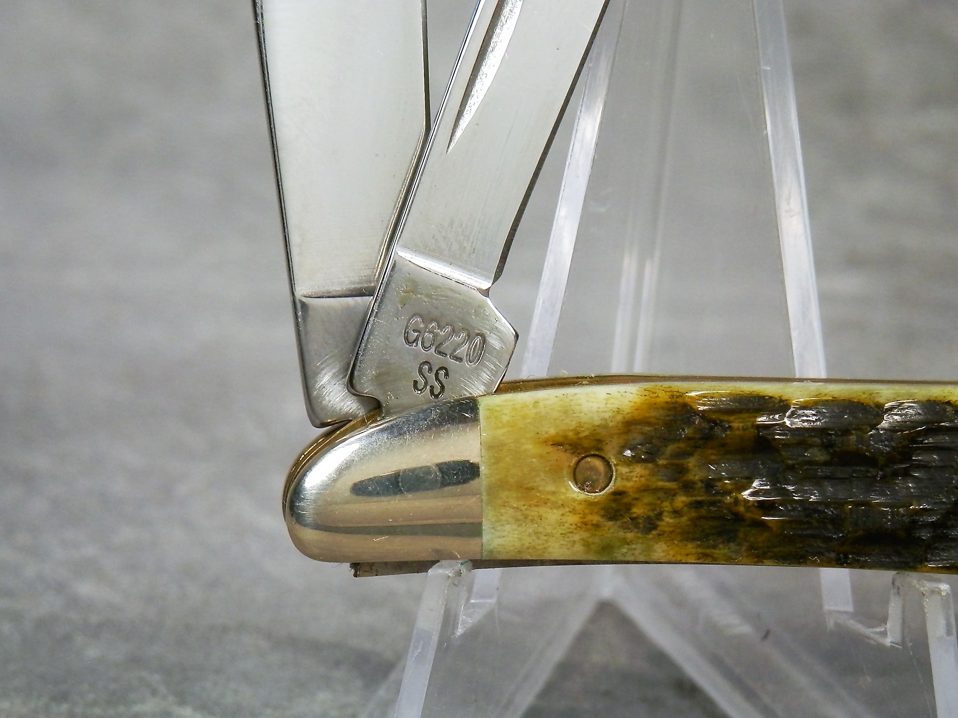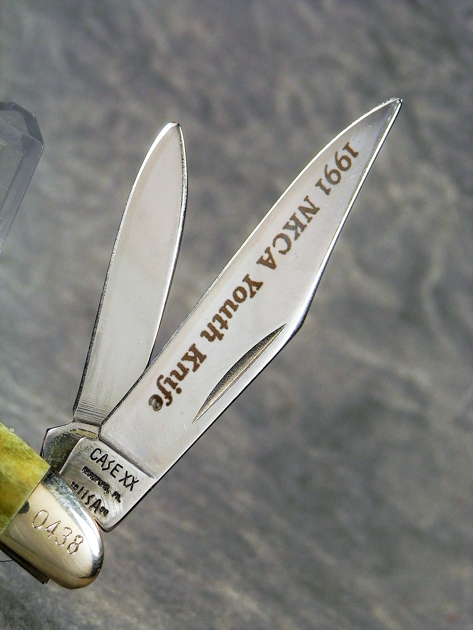 December 22, 2025 - Limited Edition # out of only 500 made. 2-3/4 inches closed. 4-3/4 inches open. Made in USA. "CASE XX Bradford, PA 19 USA 90" and "G6220 SS" tang stamps. Double oval open C "CASE" shield. Stainless steel blades. Master blade etched "1991 NKCA Youth Knife". Green jigged bone handle. Nickel Silver bolsters. Front right bolster etched with serial #. Brass liner.