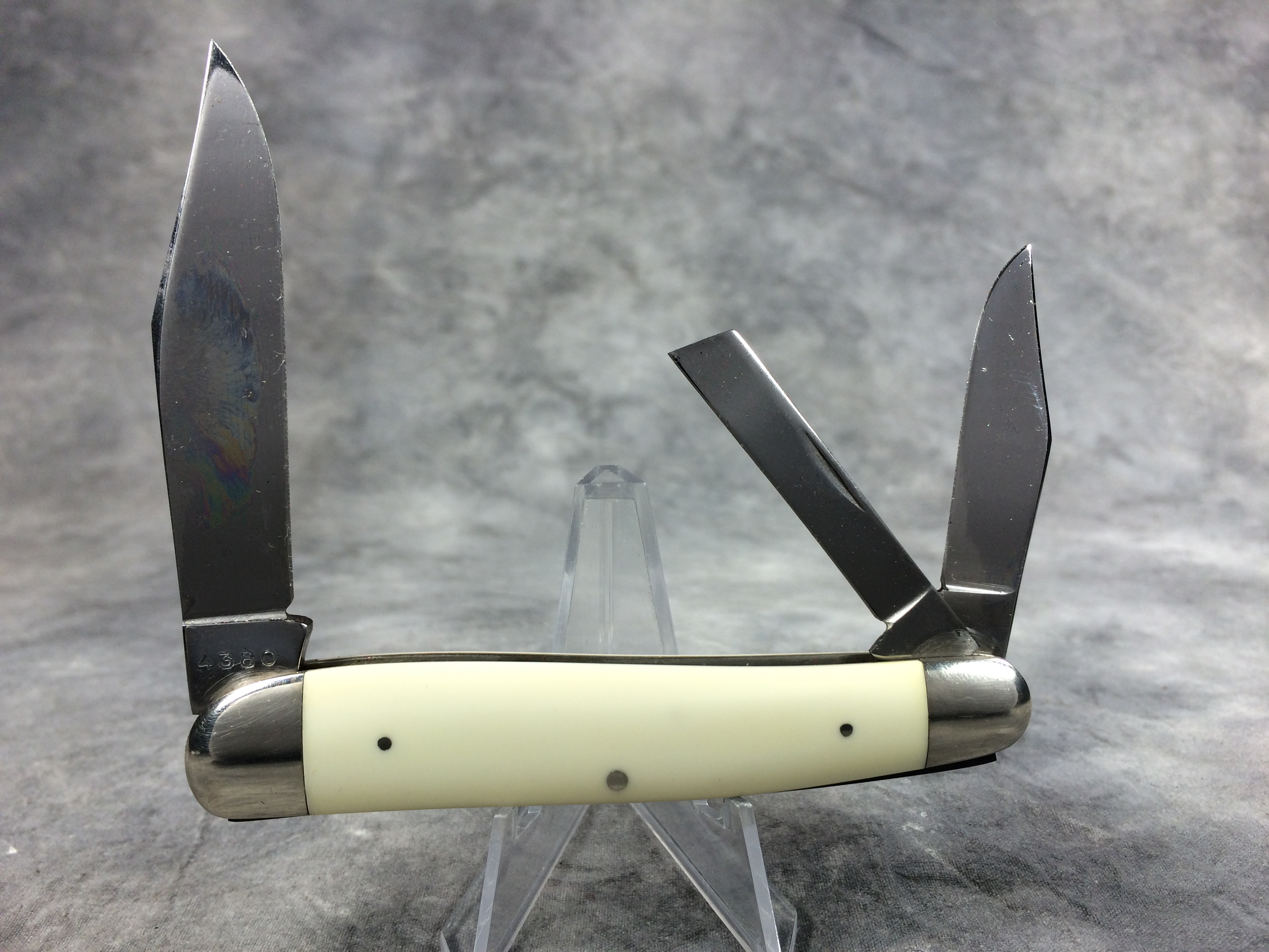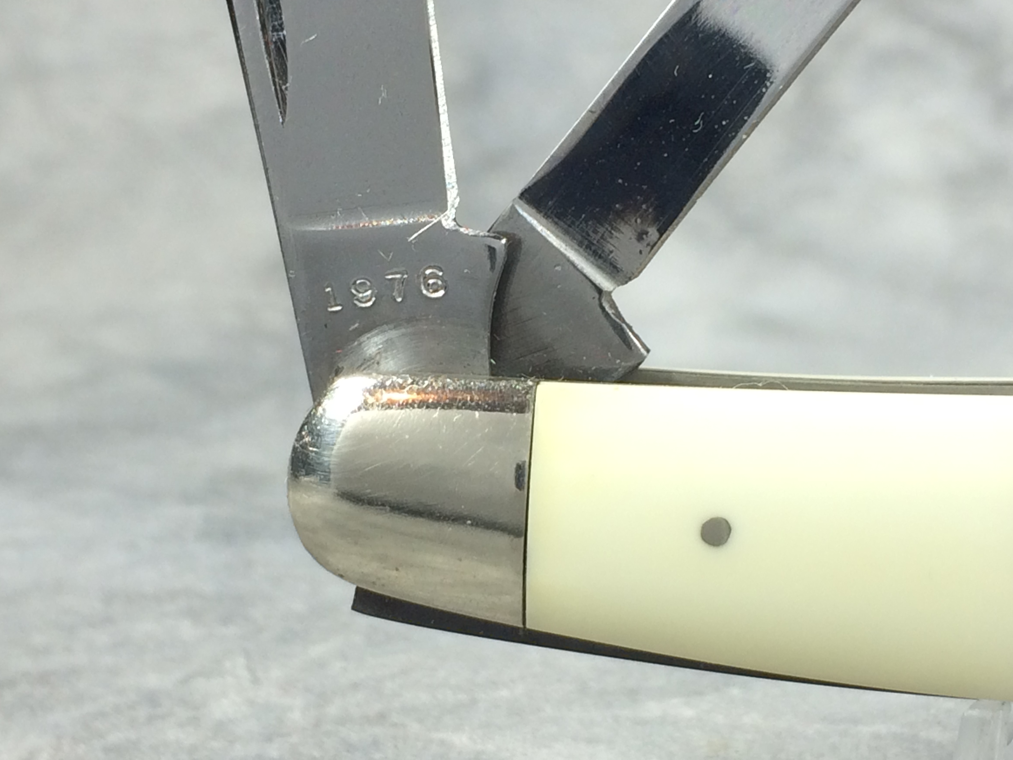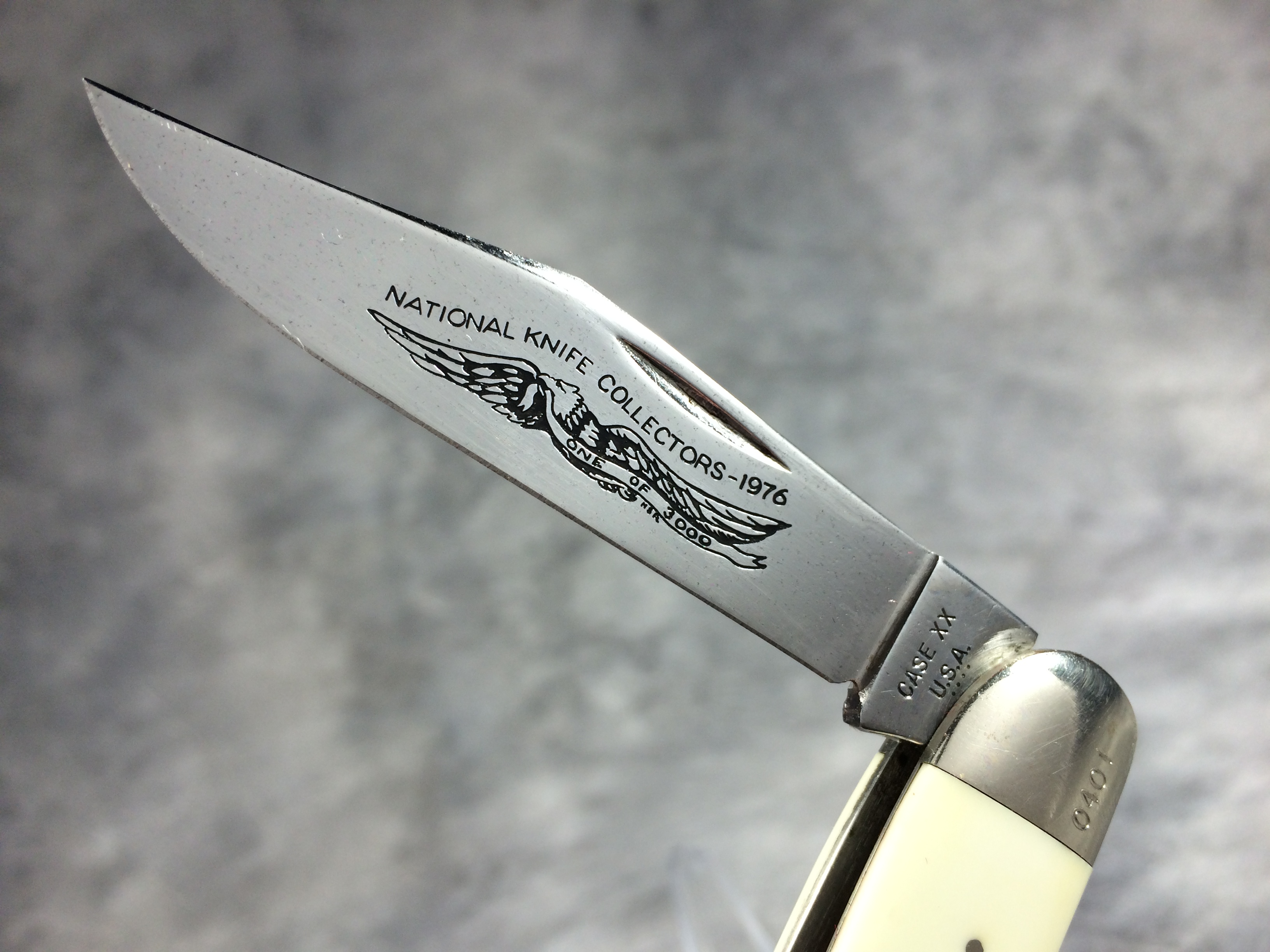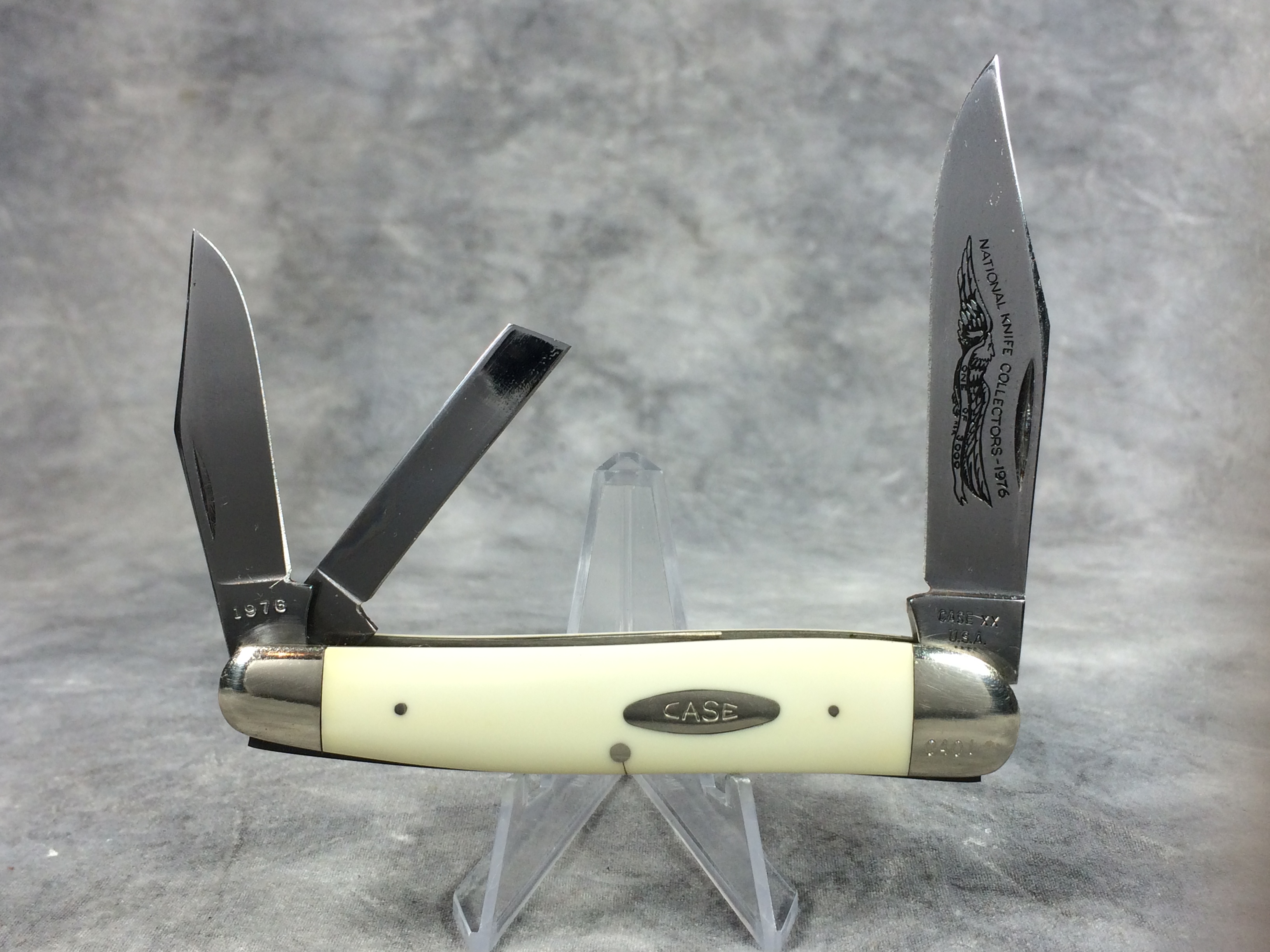 November 03, 2025 - Limited Edition. 3-3/4 inches closed. 6-5/8 inches open. Made in USA. "CASE XX USA **** " (4 dot) and "4380" tang stamps. Single oval open C "CASE" shield. Chrome vanadium blades. Master blade etched "NATIONAL KNIFE COLLECTORS - 1976" and with the image of an eagle holding a banner that reads "ONE OF 3000". Smooth white composition handle. Nickel Silver bolsters and liner. Front right bolster etched with serial .