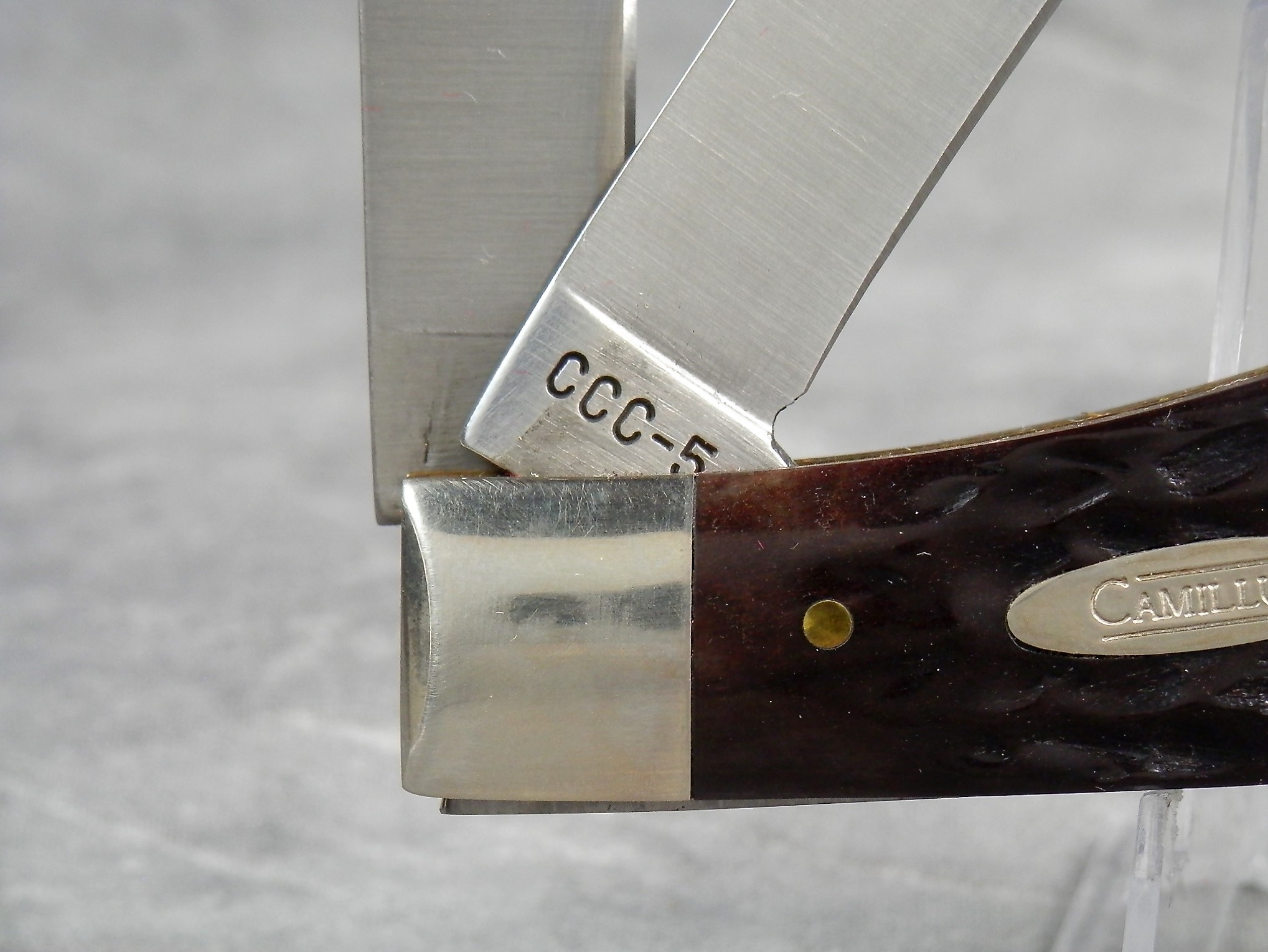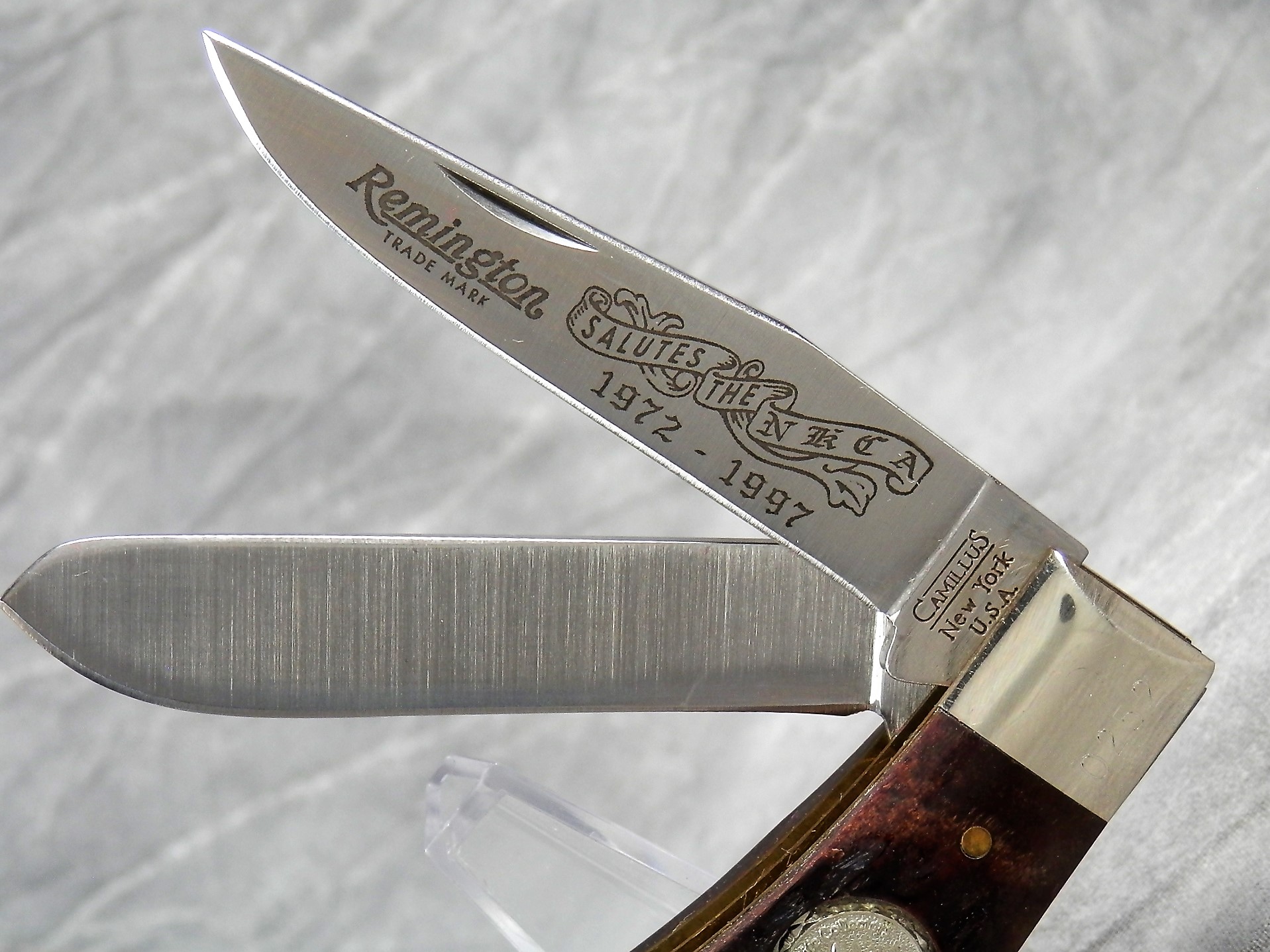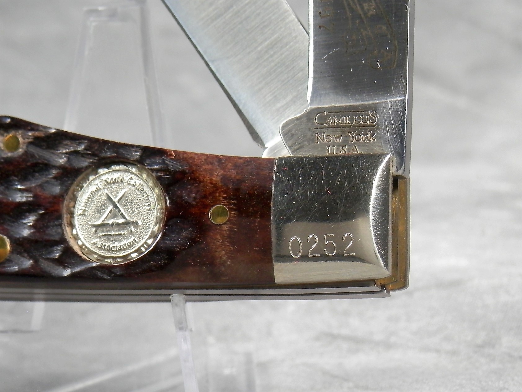 January 08, 2026 - Limited Edition NKCA 15th Anniversary Commemorative Knife #0252 of 3,000 produced. 3-5/8 inches closed. 6-3/8 inches open. "CAMILLUS NEW YORK U.S.A." and "CCC-5" tang stamps. Round NKCA shield on front handle and oval "CAMILLUS" shield on back handle.  Stainless steel blades. Master blade etched "REMINGTON TRADE MARK SALUTES THE NKCA 1972-1997". Jigged brown bone handle. Nickel Silver bolsters; front right bolster etched with serial #0252. Brass liner. With box and paperwork.