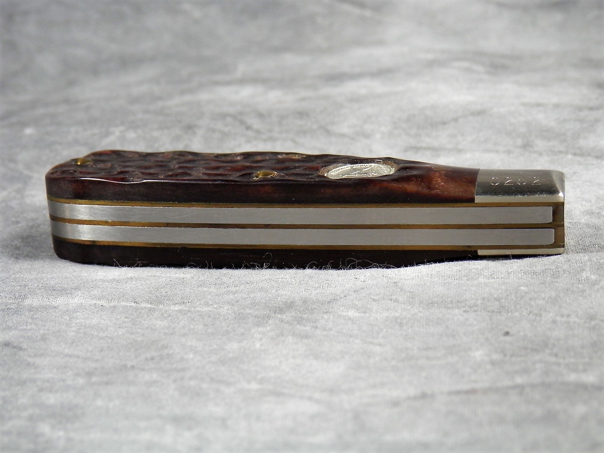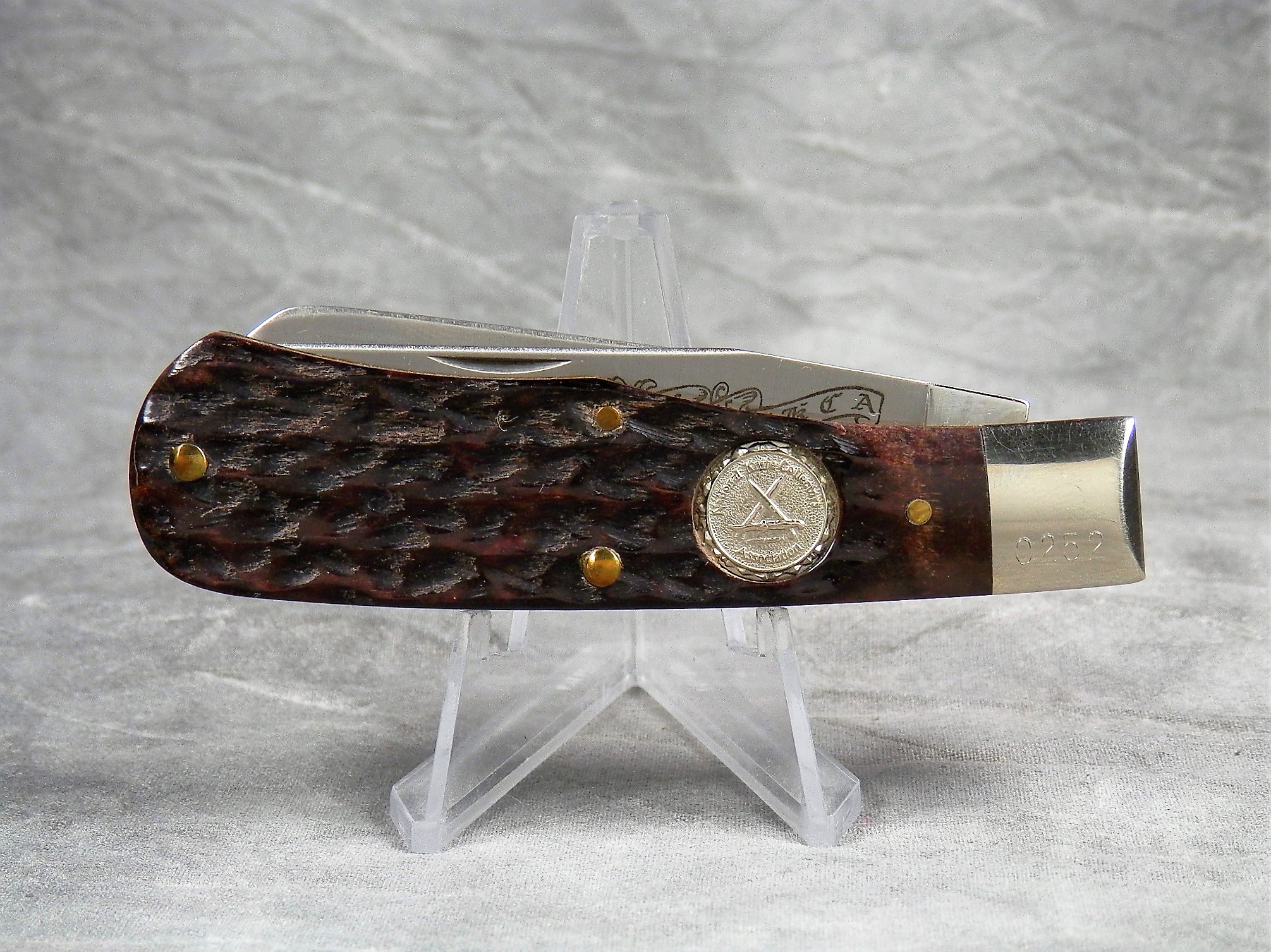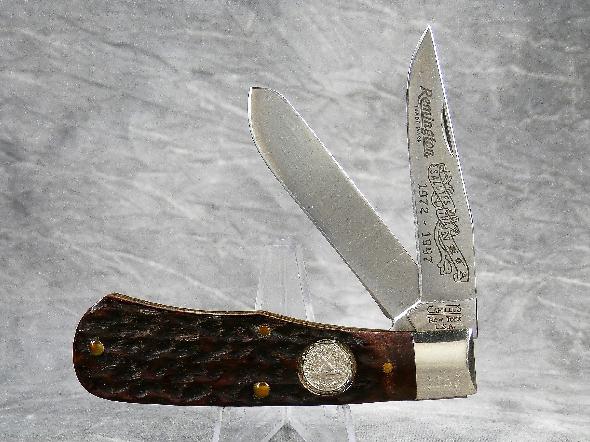 January 08, 2026 - Limited Edition NKCA 15th Anniversary Commemorative Knife #0252 of 3,000 produced. 3-5/8 inches closed. 6-3/8 inches open. "CAMILLUS NEW YORK U.S.A." and "CCC-5" tang stamps. Round NKCA shield on front handle and oval "CAMILLUS" shield on back handle.  Stainless steel blades. Master blade etched "REMINGTON TRADE MARK SALUTES THE NKCA 1972-1997". Jigged brown bone handle. Nickel Silver bolsters; front right bolster etched with serial #0252. Brass liner. With box and paperwork.