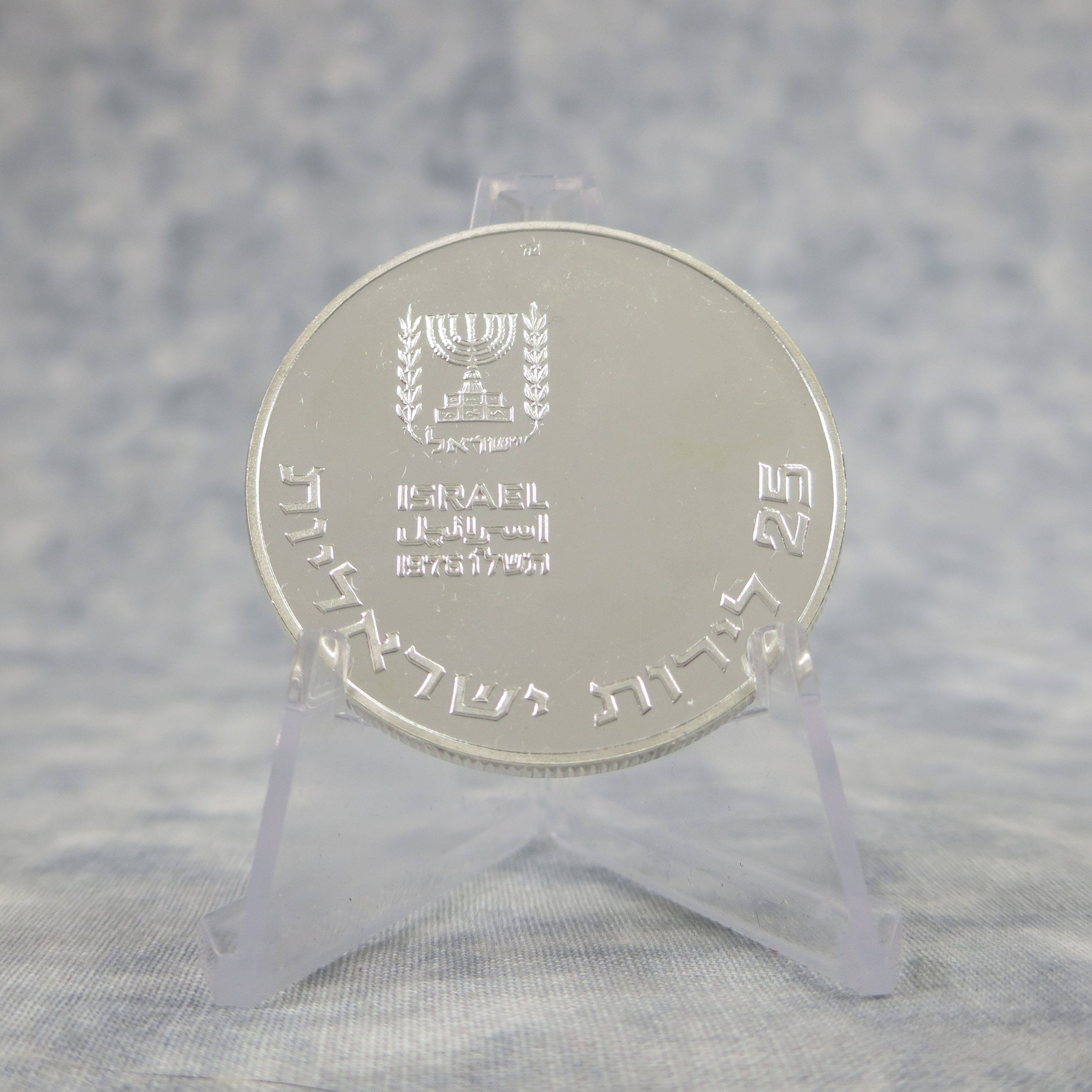 Obverse: Around the lower border is the face value "25 Israeli Lirot" in Hebrew. Upper left is the official emblem of the State of Israel. Below is the word "Israel" in Hebrew, English and Arabic, the mint year "1976" and its Hebrew equivalent "5736".