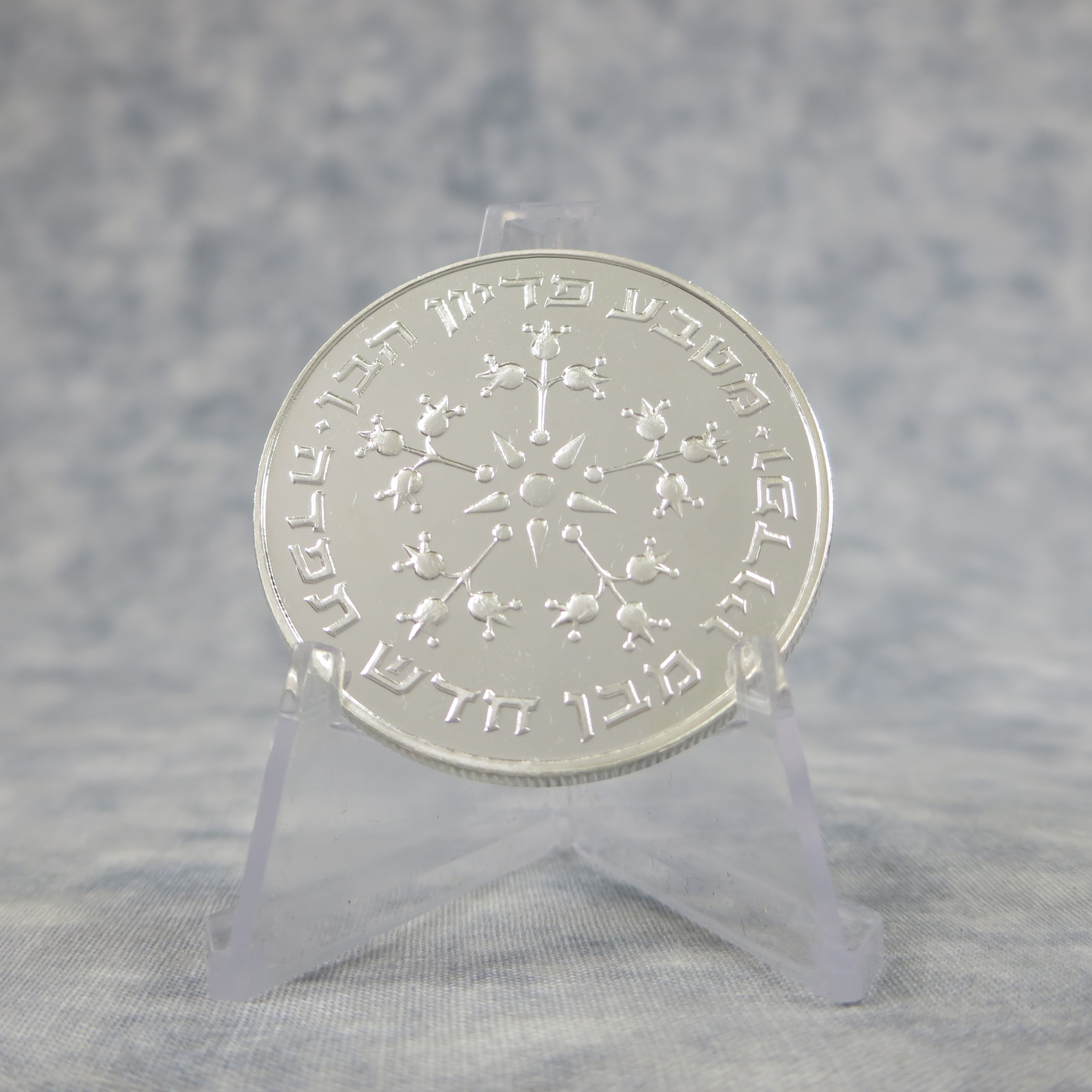 Reverse Five pomegranate flowers around a five pointed star. Around the border, the inscription in Hebrew "Pidyon Haben Coin" and "Those that are to be redeemed from a month old thou shalt redeem". Num 18:16.