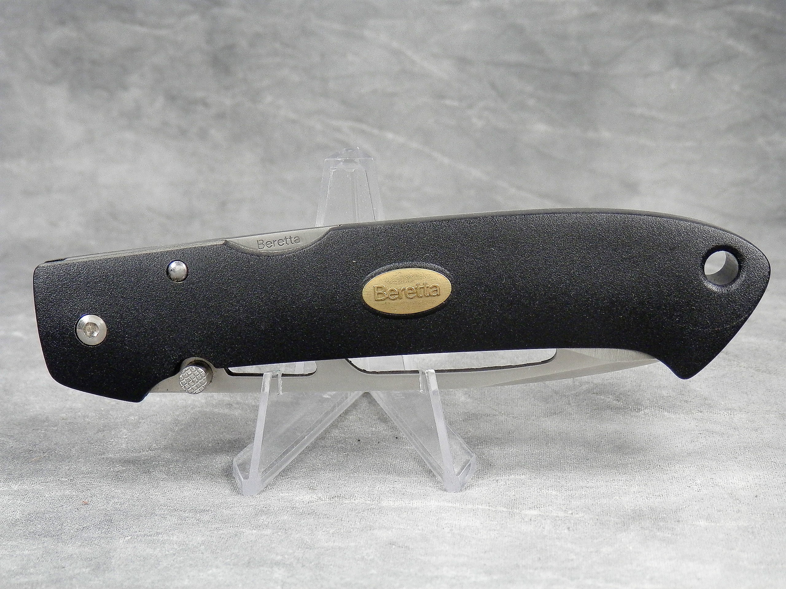 November 03, 2025 - Single blade lockback folding knife. Made in Japan. 5 inches closed. 8-5/8 inches open. "JAPAN" tang stamp. Oval "Beretta" shield. G-10 handle.