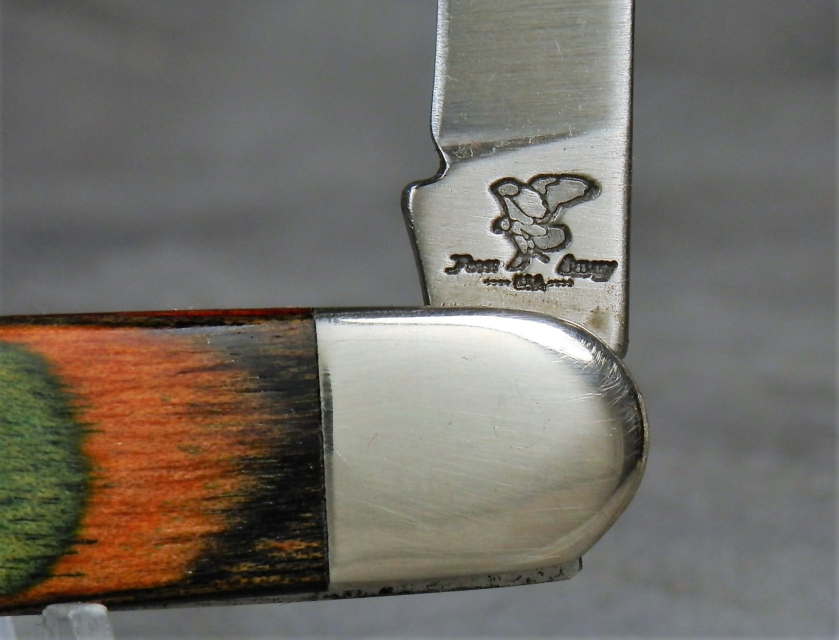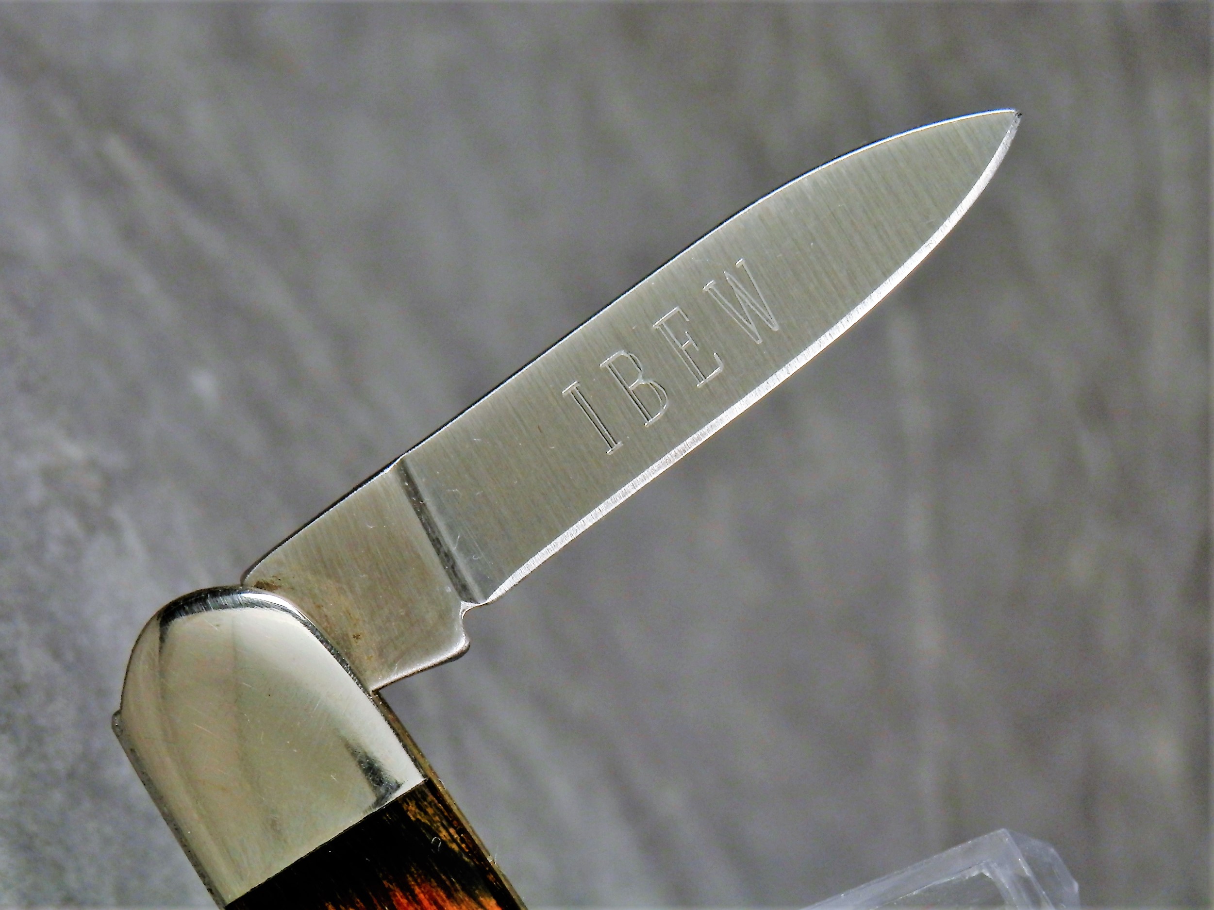 April 24, 2026 - 2-Blade Pen Knife. 3 inches closed. 4-3/4 inches open. Made in USA. Company logo and "FROST CUTLERY ****USA**** " (difficult to see, but looks like a total of 8 dots) tang stamp. Wood handle. Back of master blade etched etched "IBEW". Nickel Silver bolsters. Brass liner.