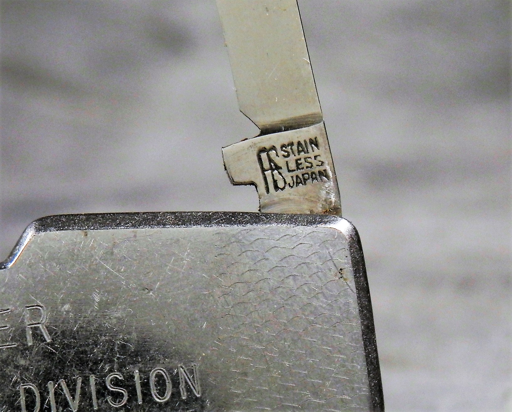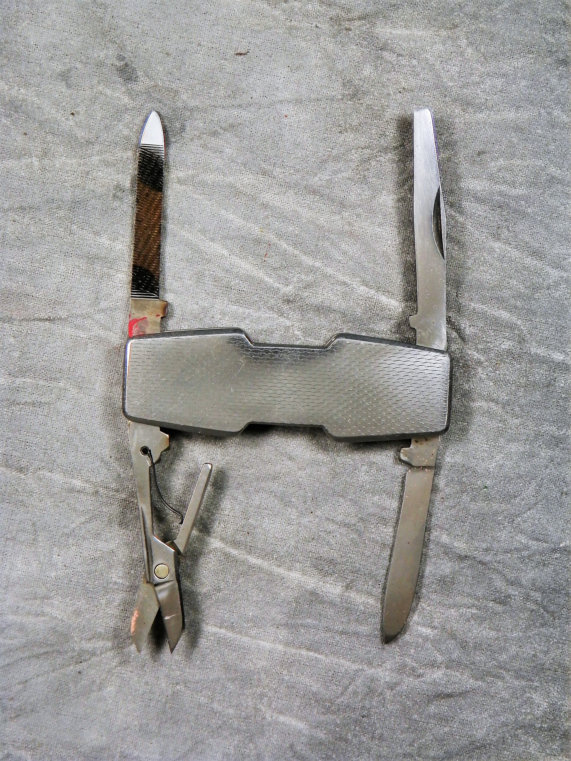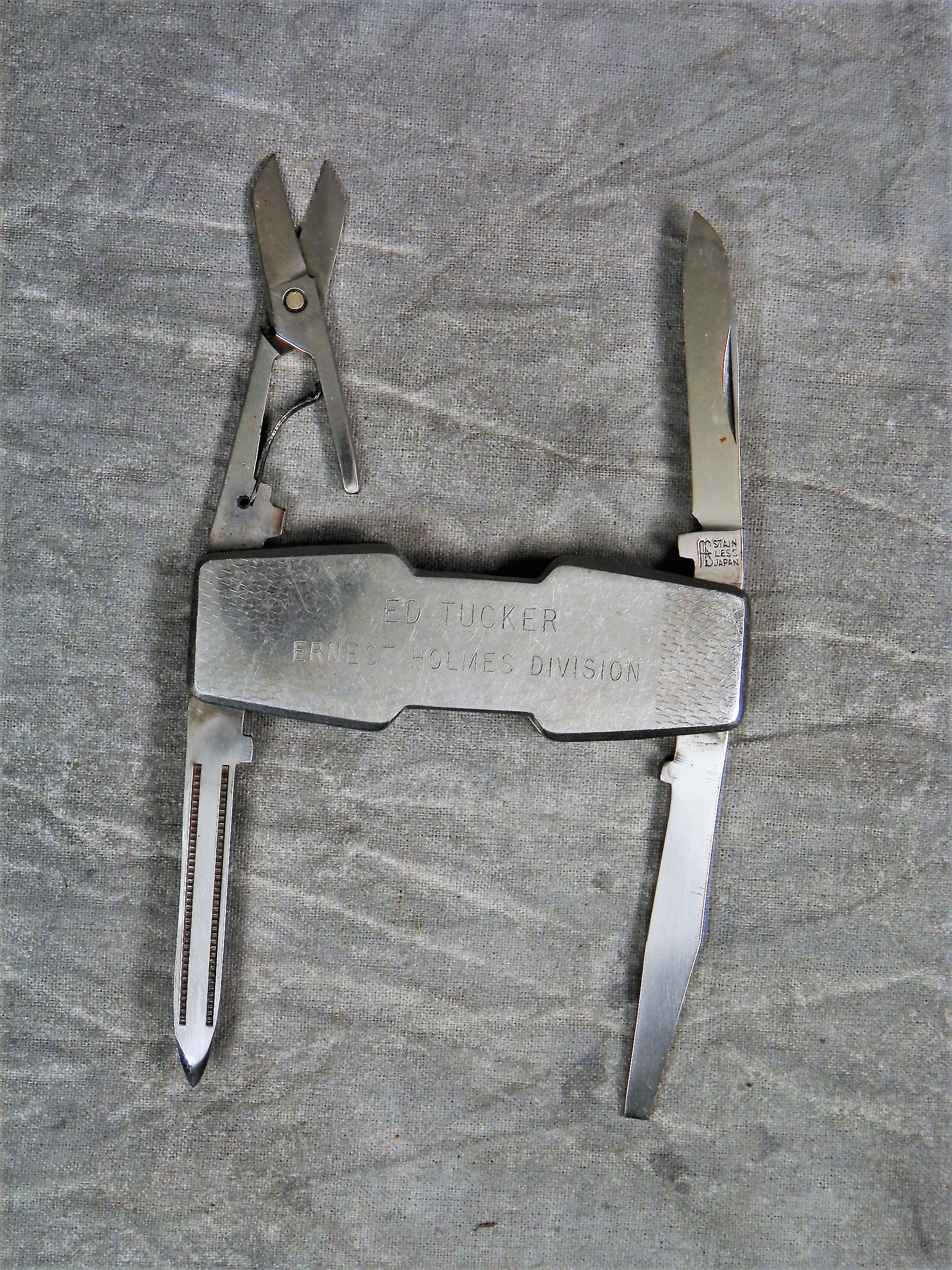 November 03, 2025 - 4-Blade Gentleman's Pen Knife (Lobster-style). 2-3/8 inches closed. 4 inches open. "STAINLESS JAPAN" tang stamp. Stainless steel handle etched "ED TUCKER ERNEST HOLMES DIVISION".
