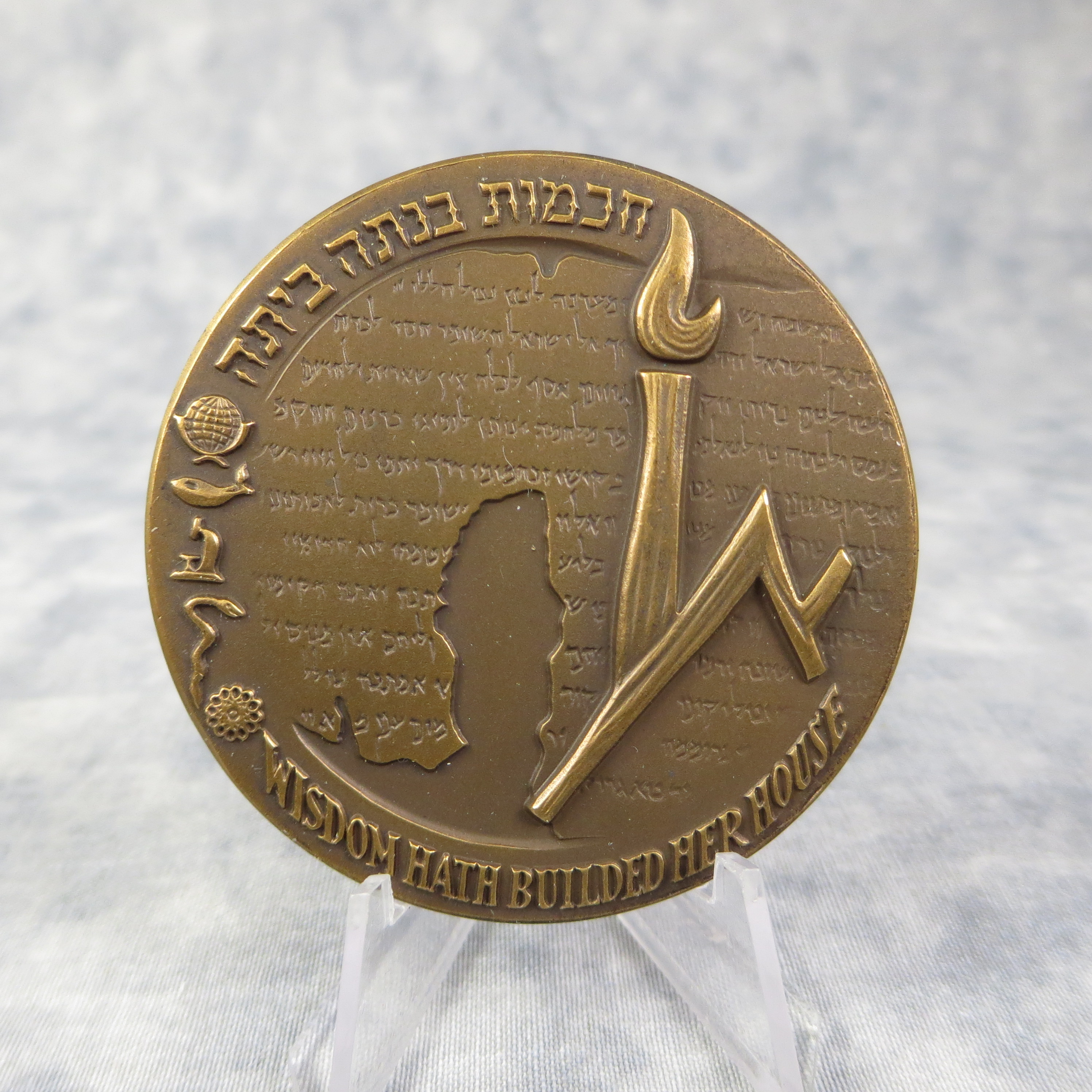Reverse: In the center, part of the Dead Sea scrolls. An incuse portrayal of the Dead Sea, and in relief, the Hebrew University emblem. On the rim, an inscription "Wisdom hath built her house" (from Proverbs 9:1) in Hebrew and English. Between the Hebrew and the translation, are symbols of various disciplines taught at the University.