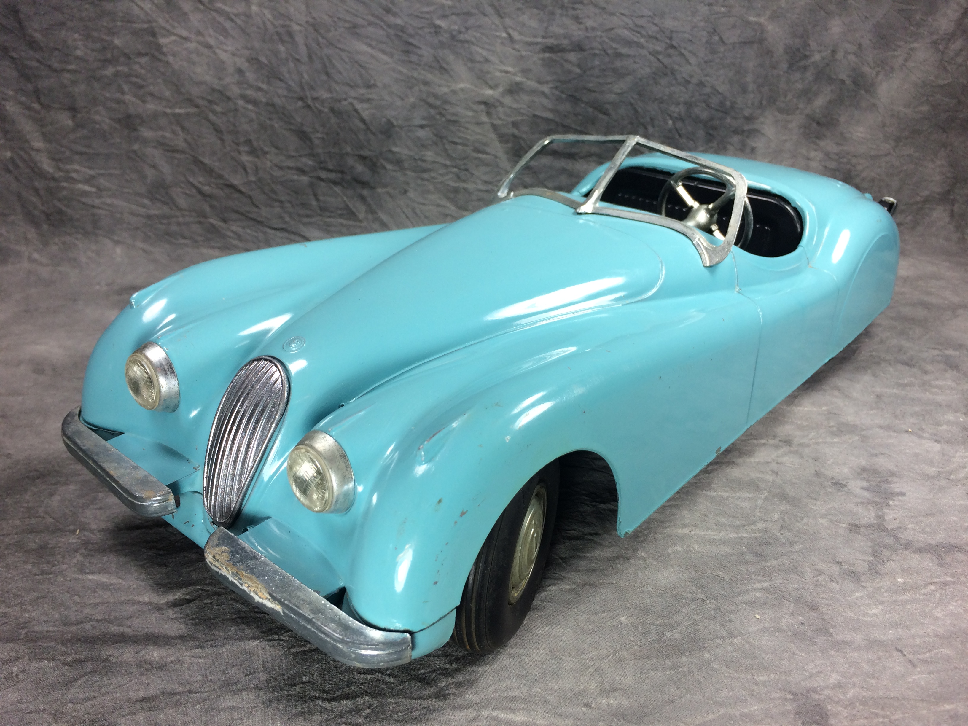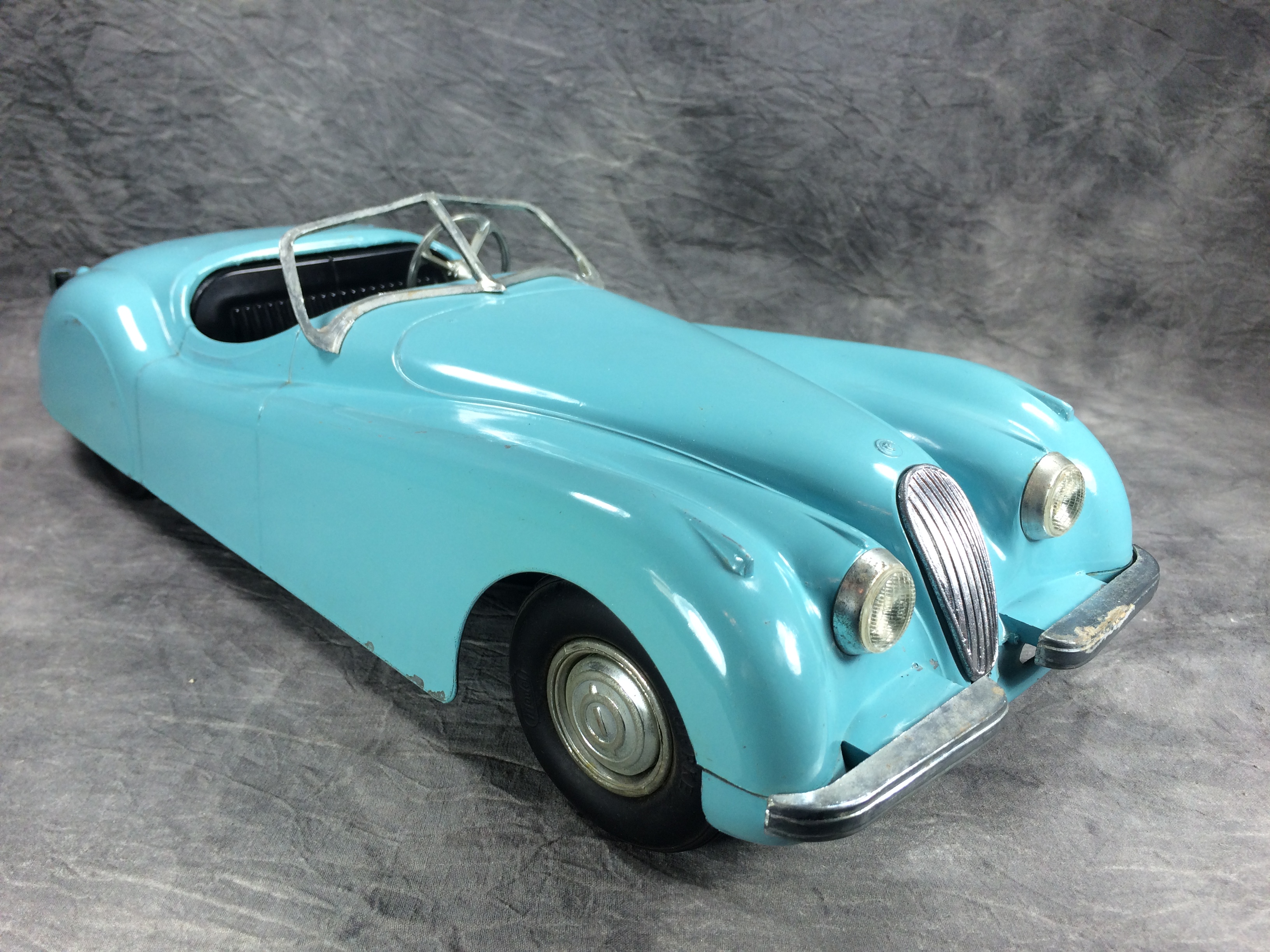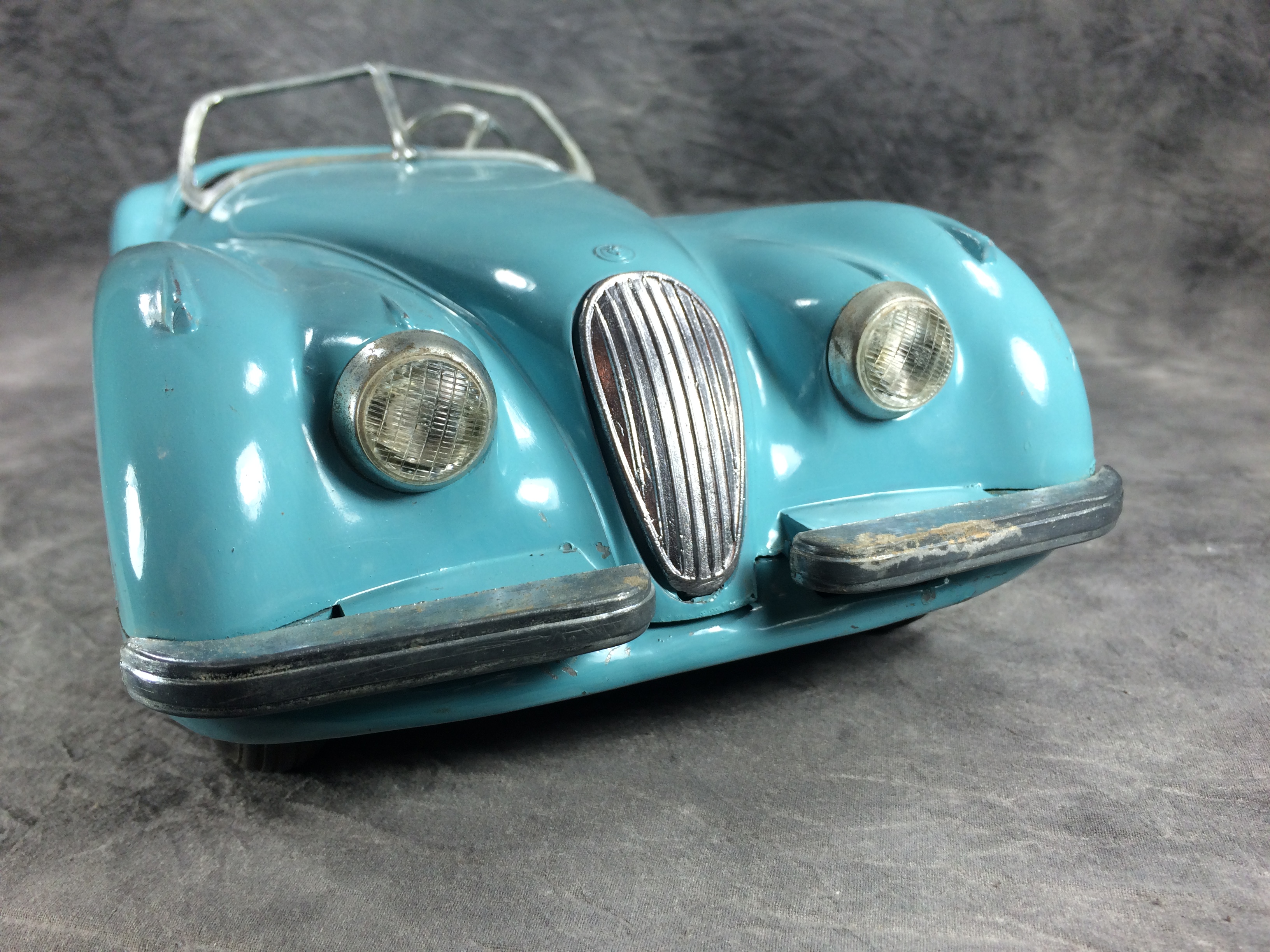 December 29, 2025 - 1950s DOEPKE Model Toys JAGUAR XK-120 Convertible Race Car, 18 inches in length.