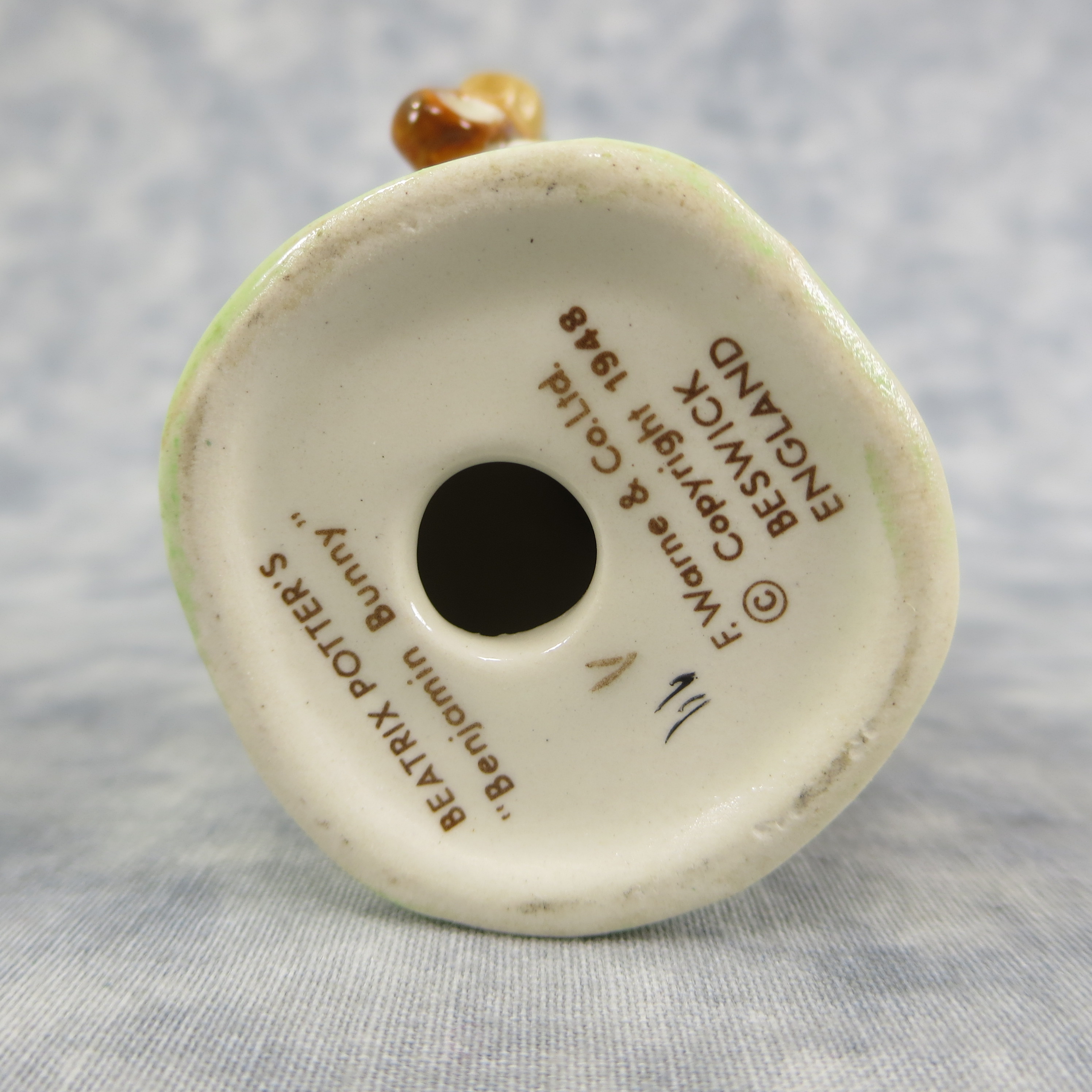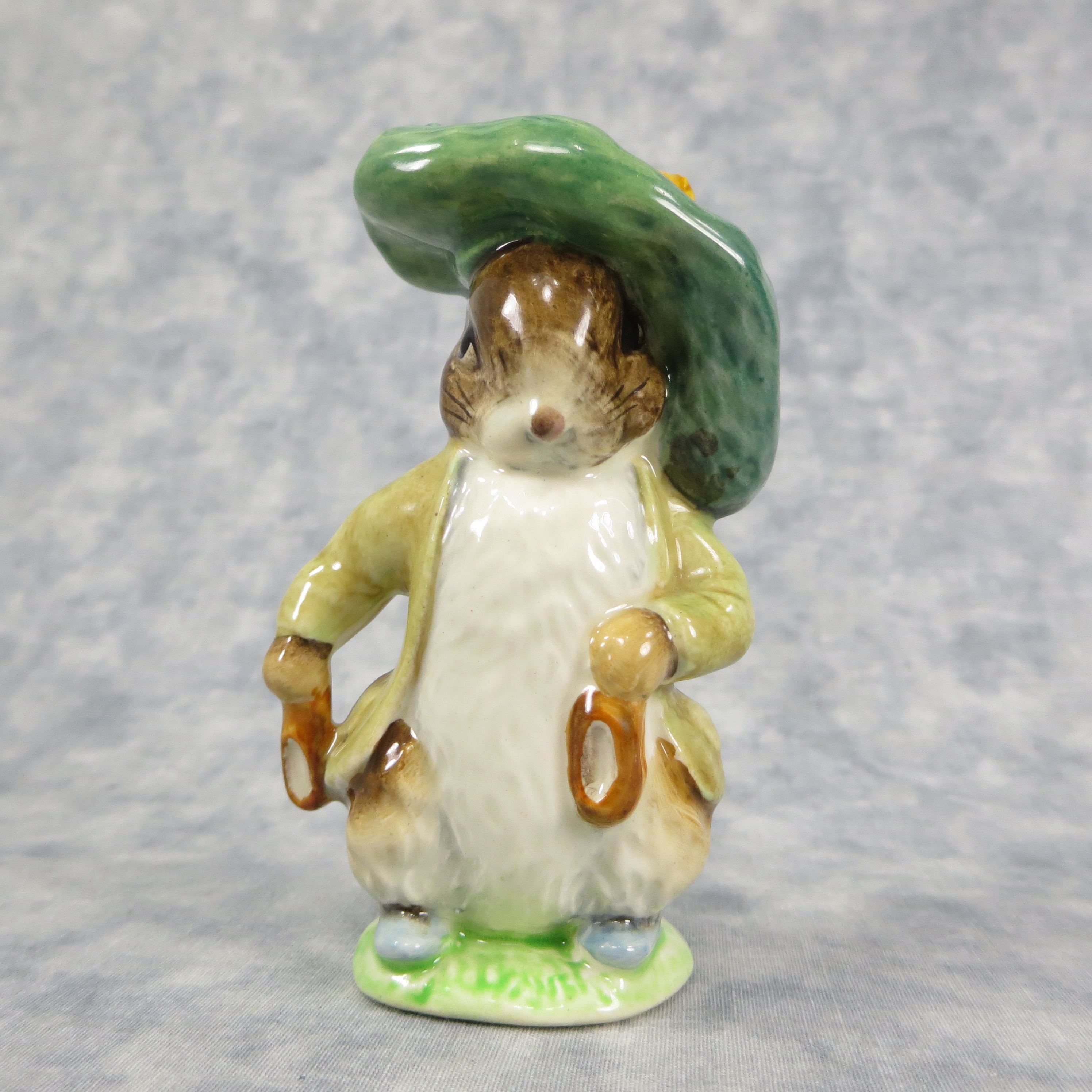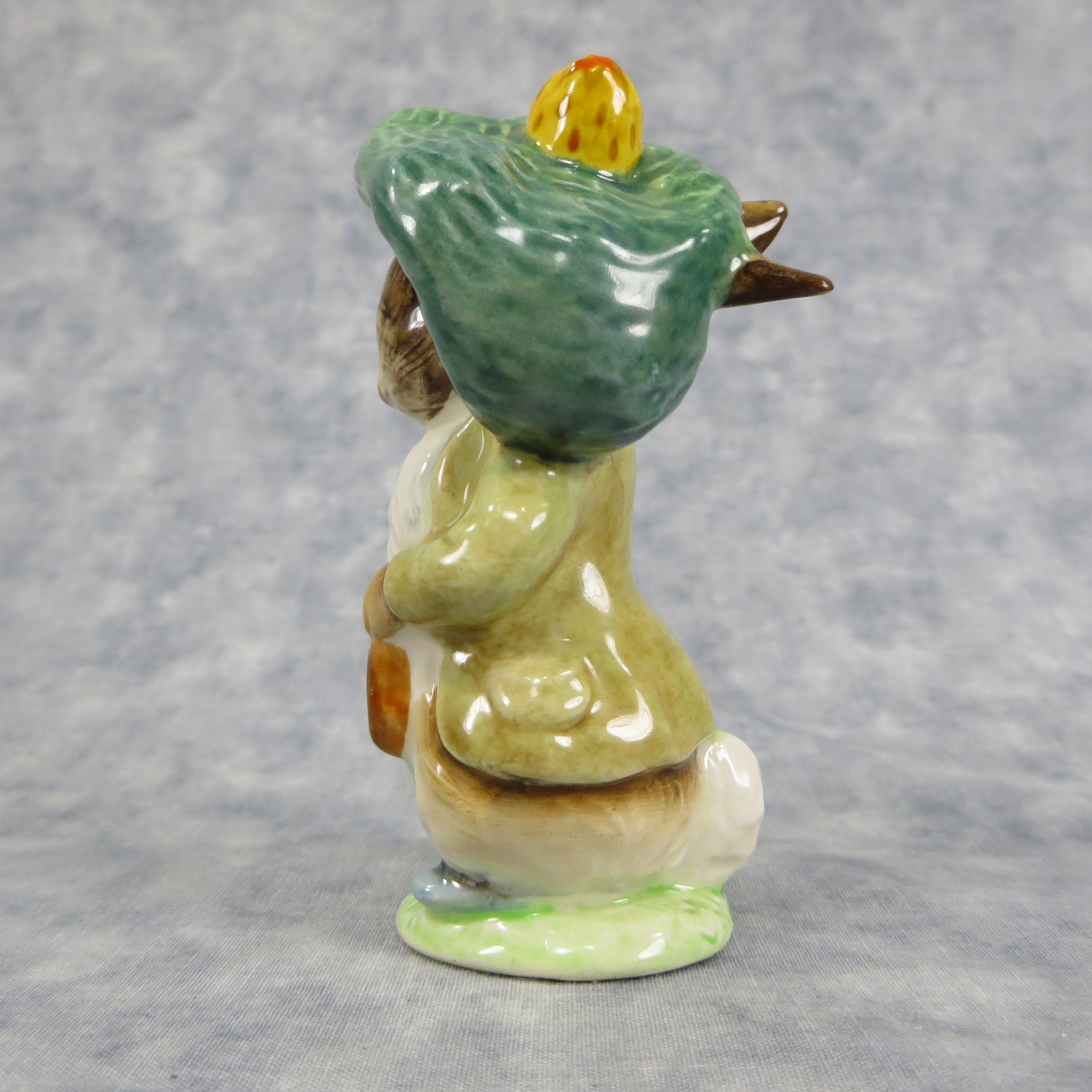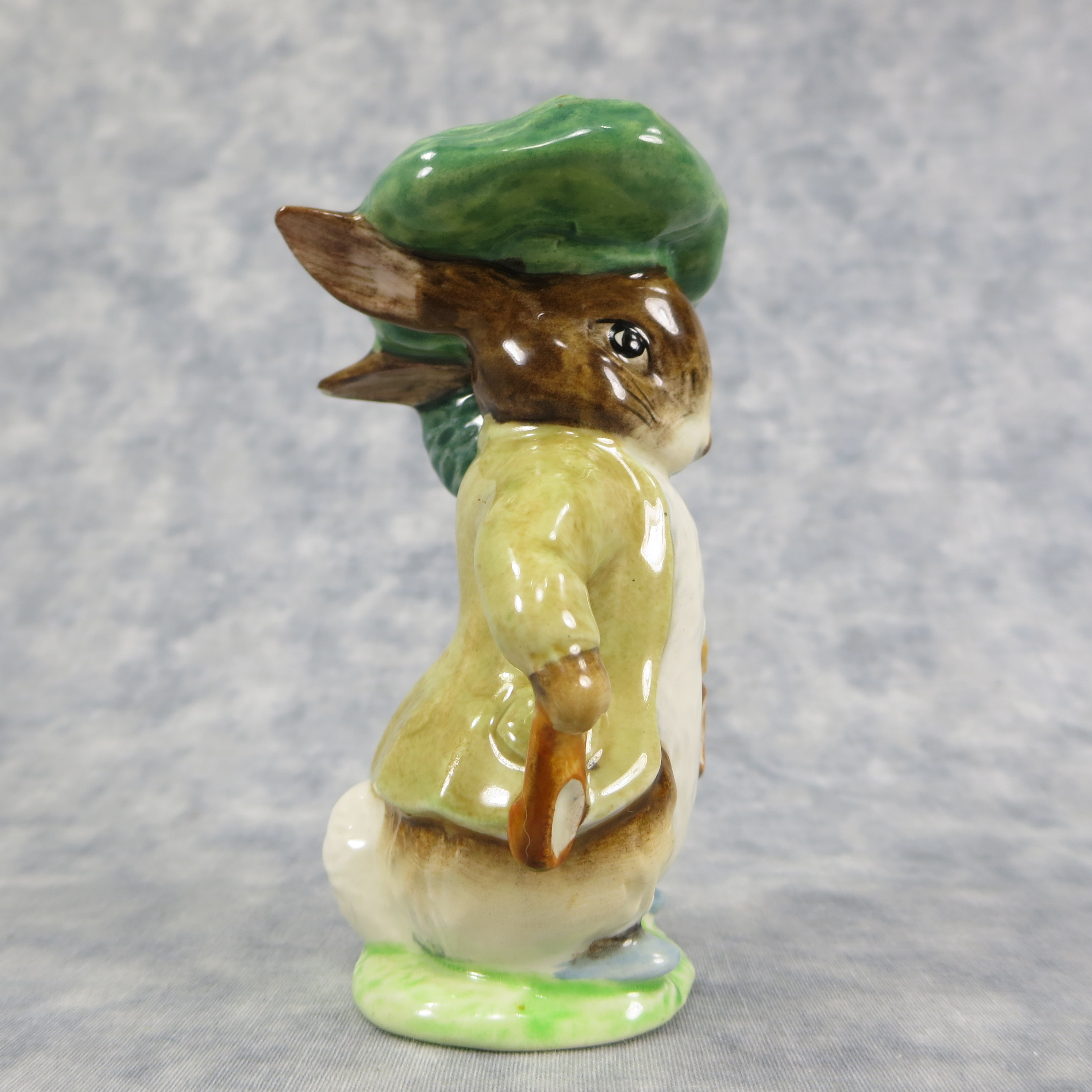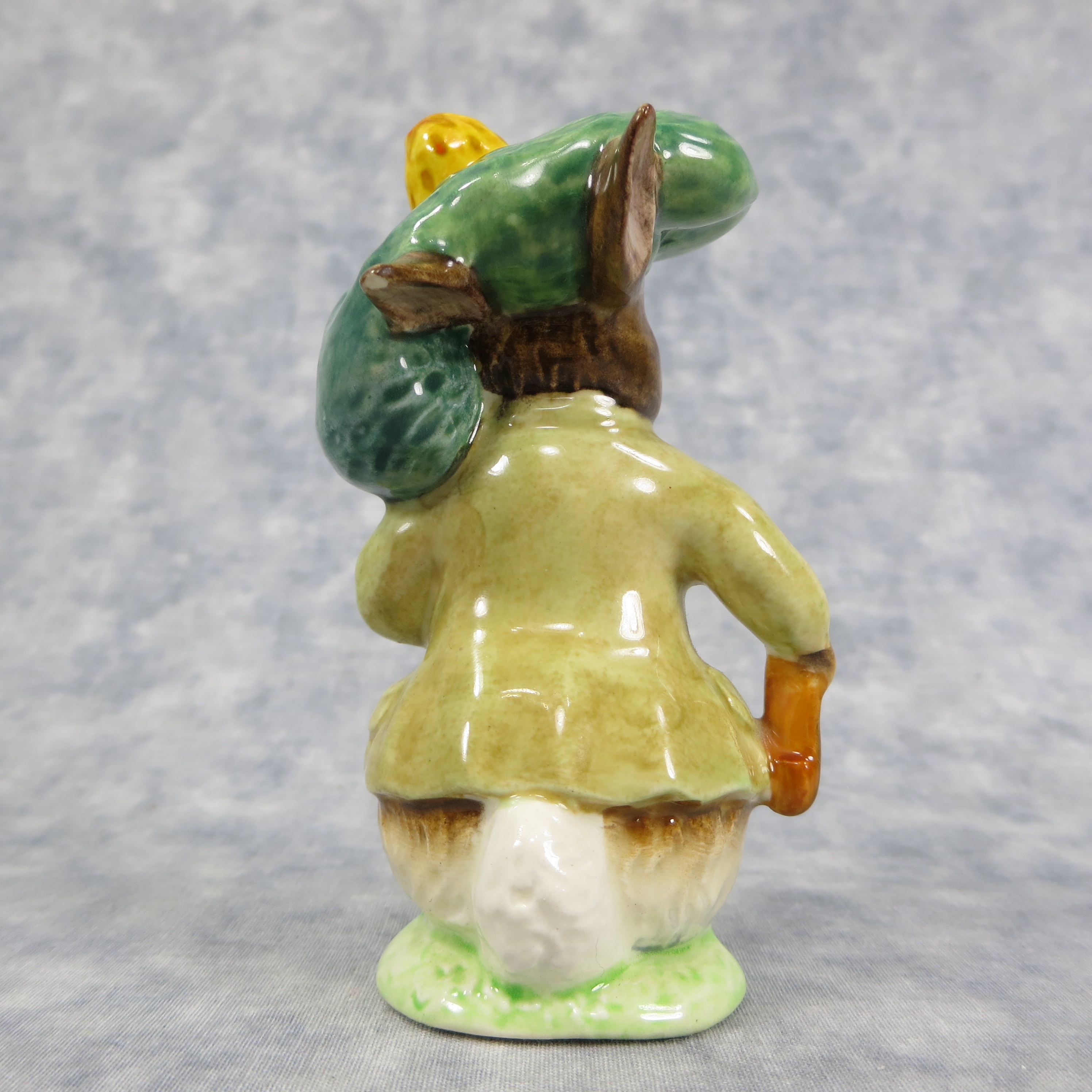 January 16, 2026 - 4 inches tall by 2-1/4 inches wide by 2 inches long. Shape Number: 1105. Modelled by Arthur Gredington. 2nd version with Green with brown jacket, dark green beret with orange & yellow pom, ears out, shoes in. Issued in 1948 and never withdrawn production. Manufactured by Frederick Warne & Co, Beswick, England with the BP-3b backstamp used from 1974-1985.