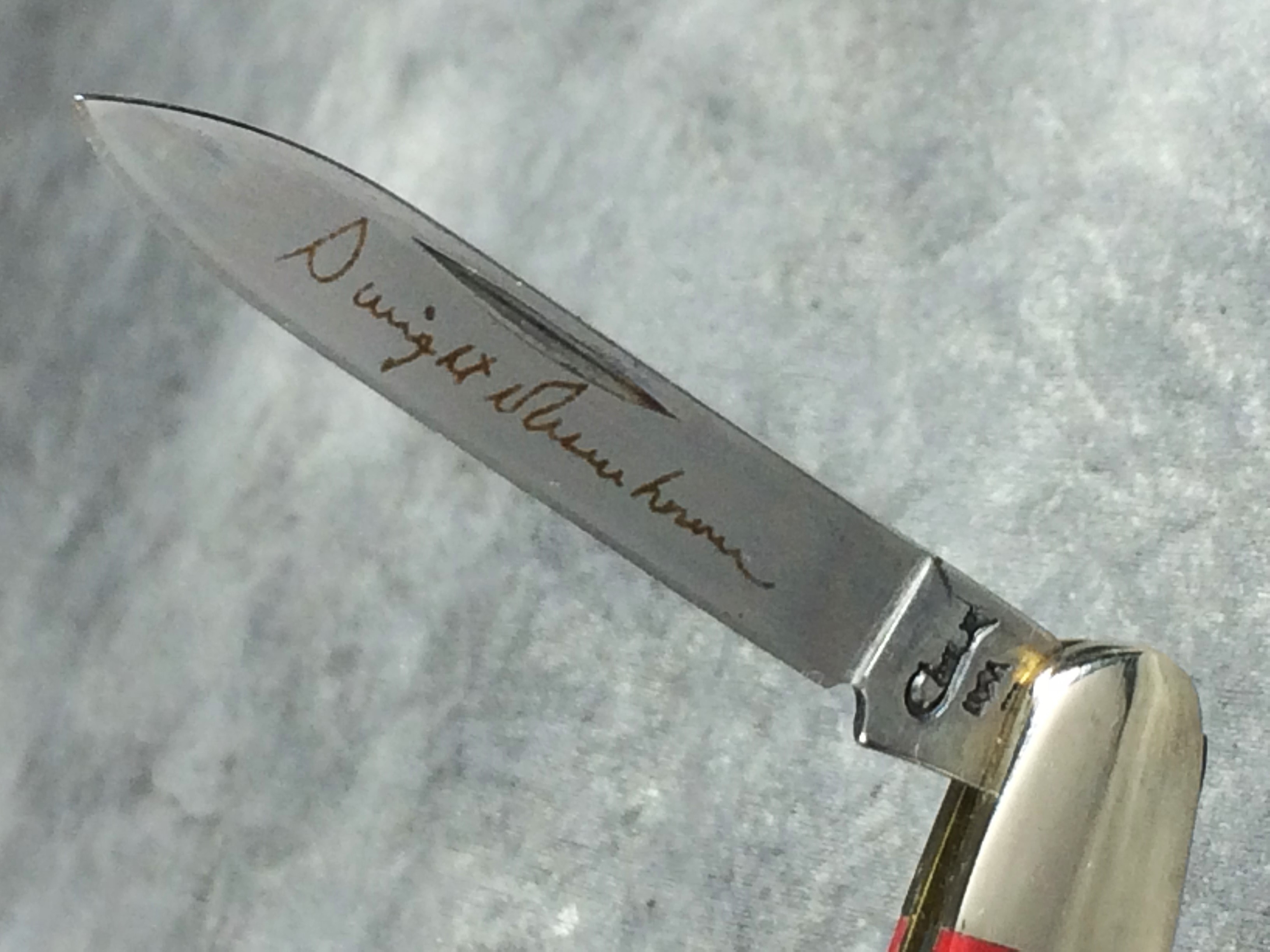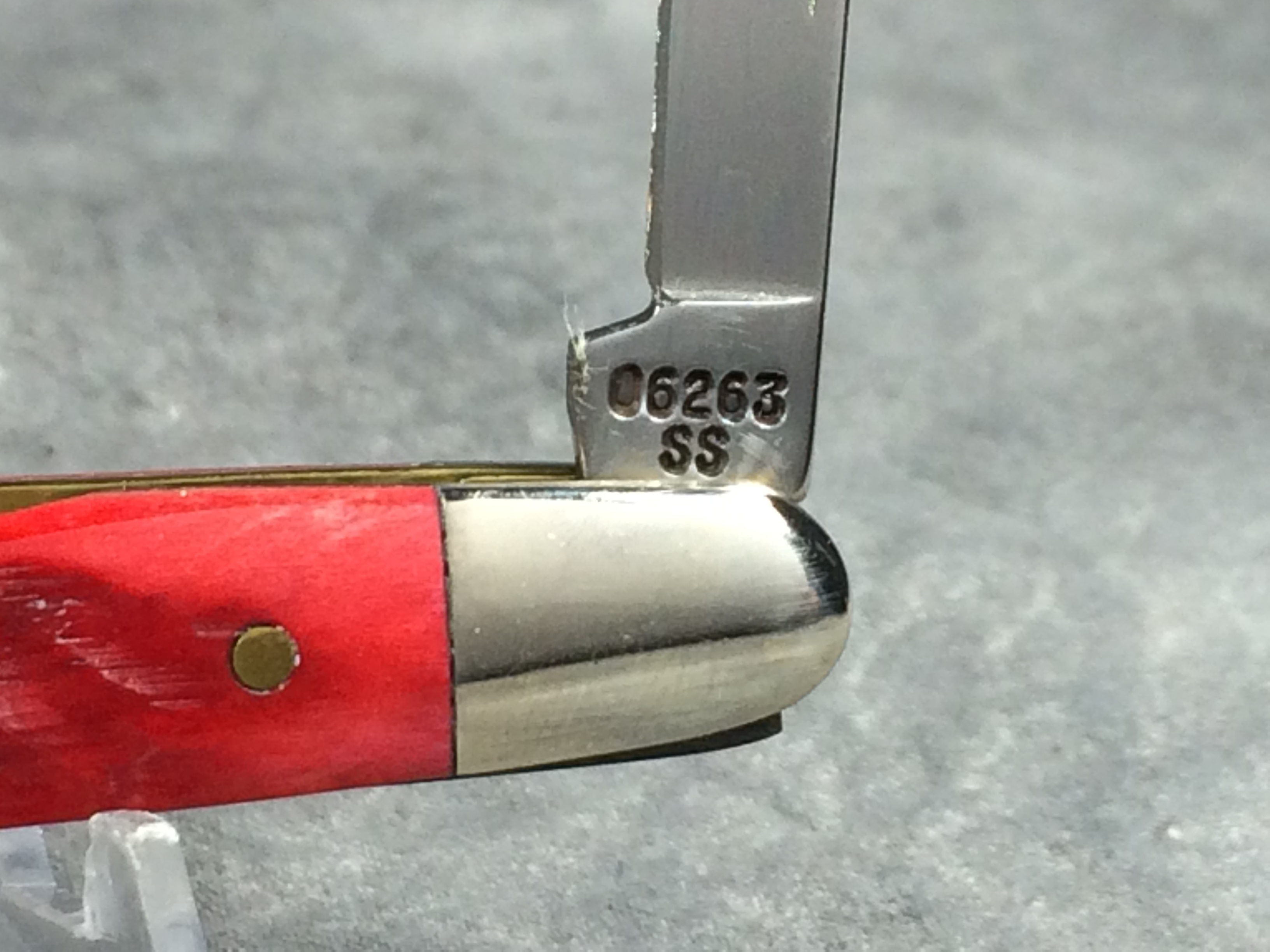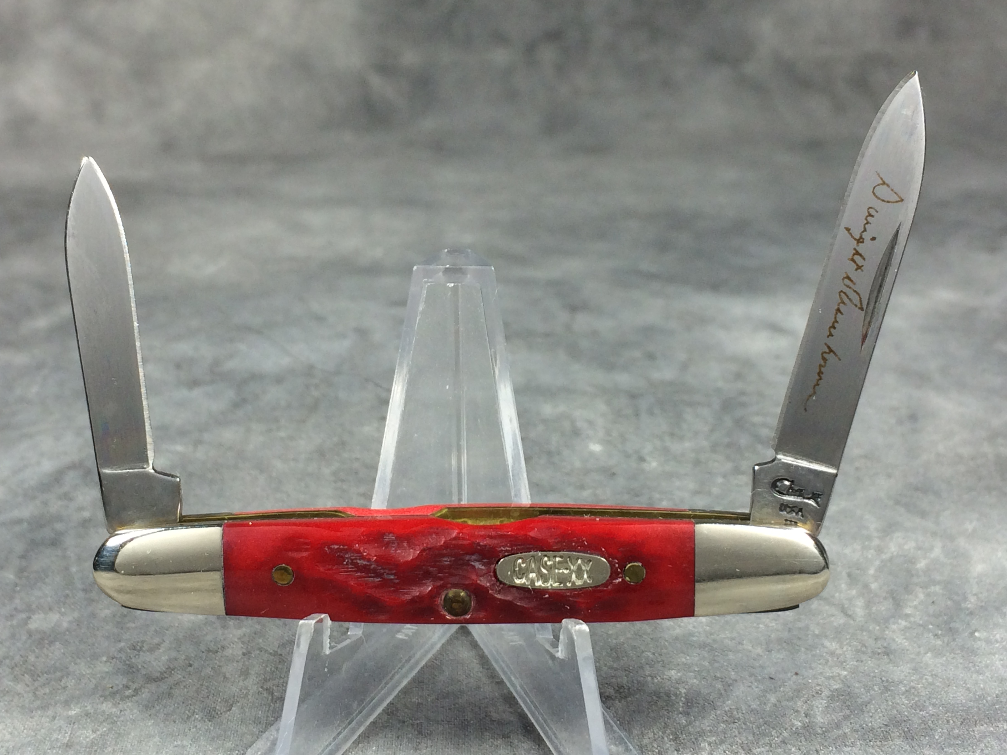 November 03, 2025 - 3-1/8 inches closed. 4-7/8 inches open. Made in USA. "CASE XX USA *** " and "06263 SS" tang stamps. Single Oval "CASE-XX" shield. Stainless Steel blades. Master blade etched with Dwight Eisenhower's signature. Red Jigged Bone handle. Nickel Silver bolsters. Brass liner.