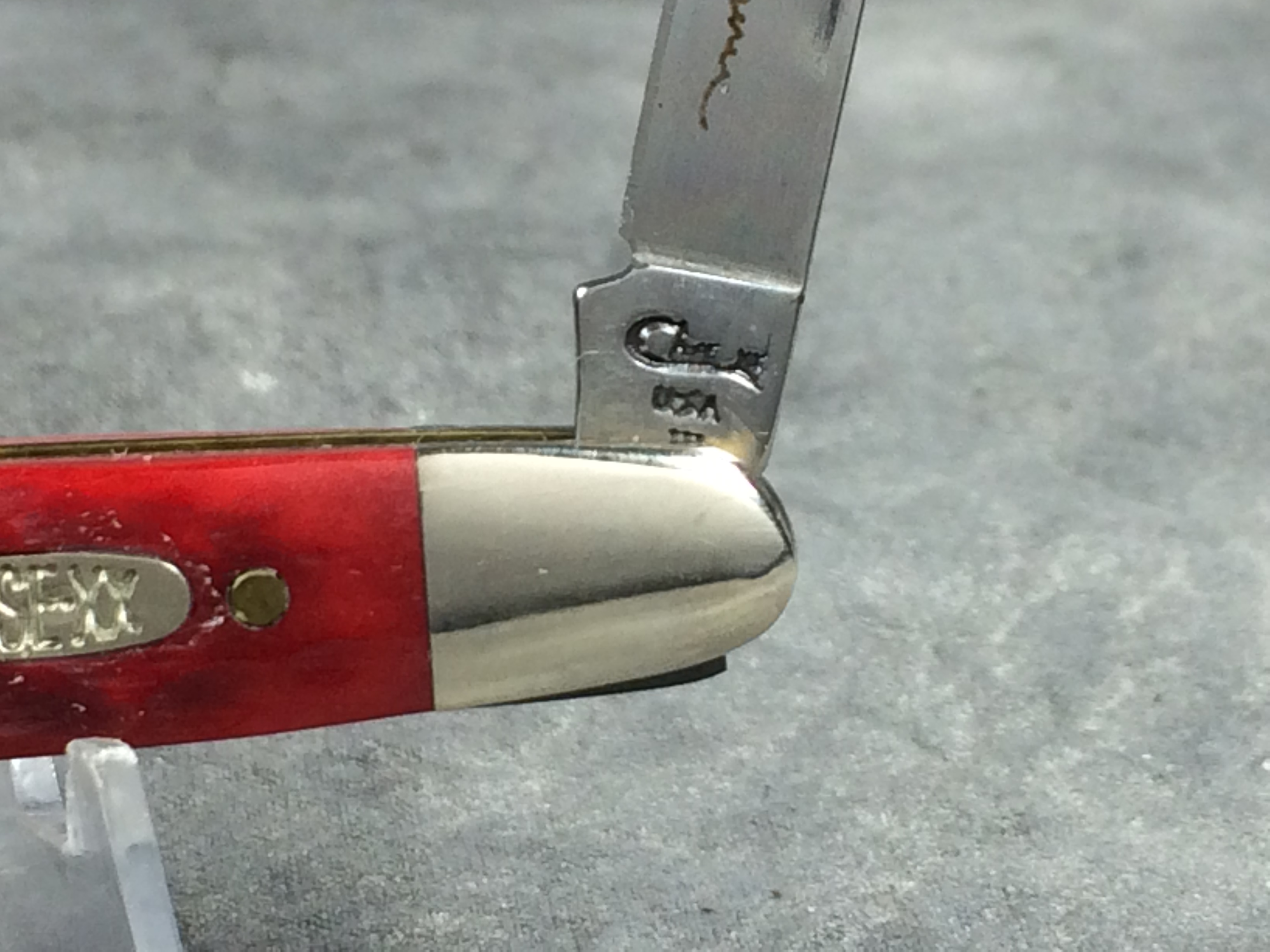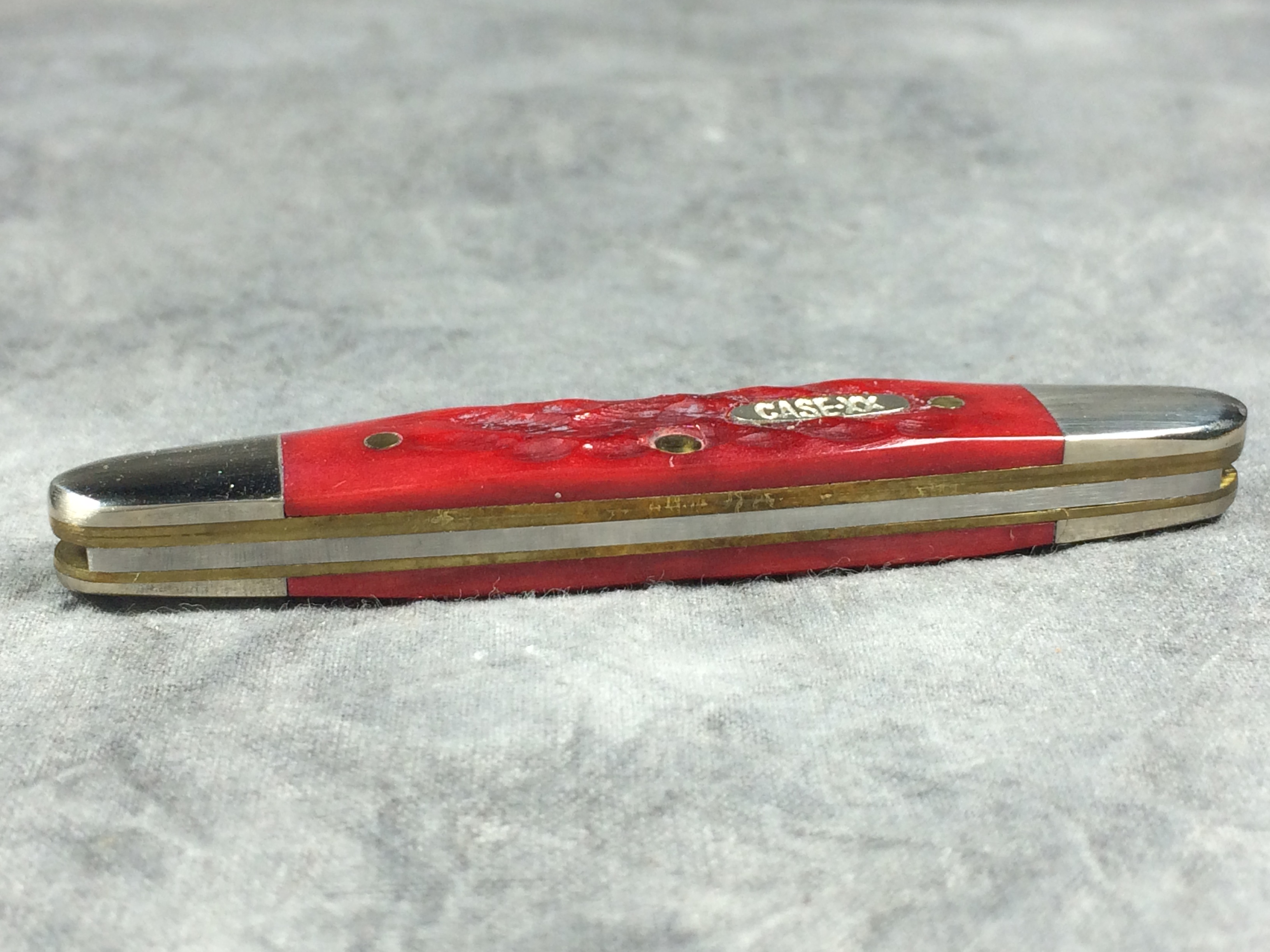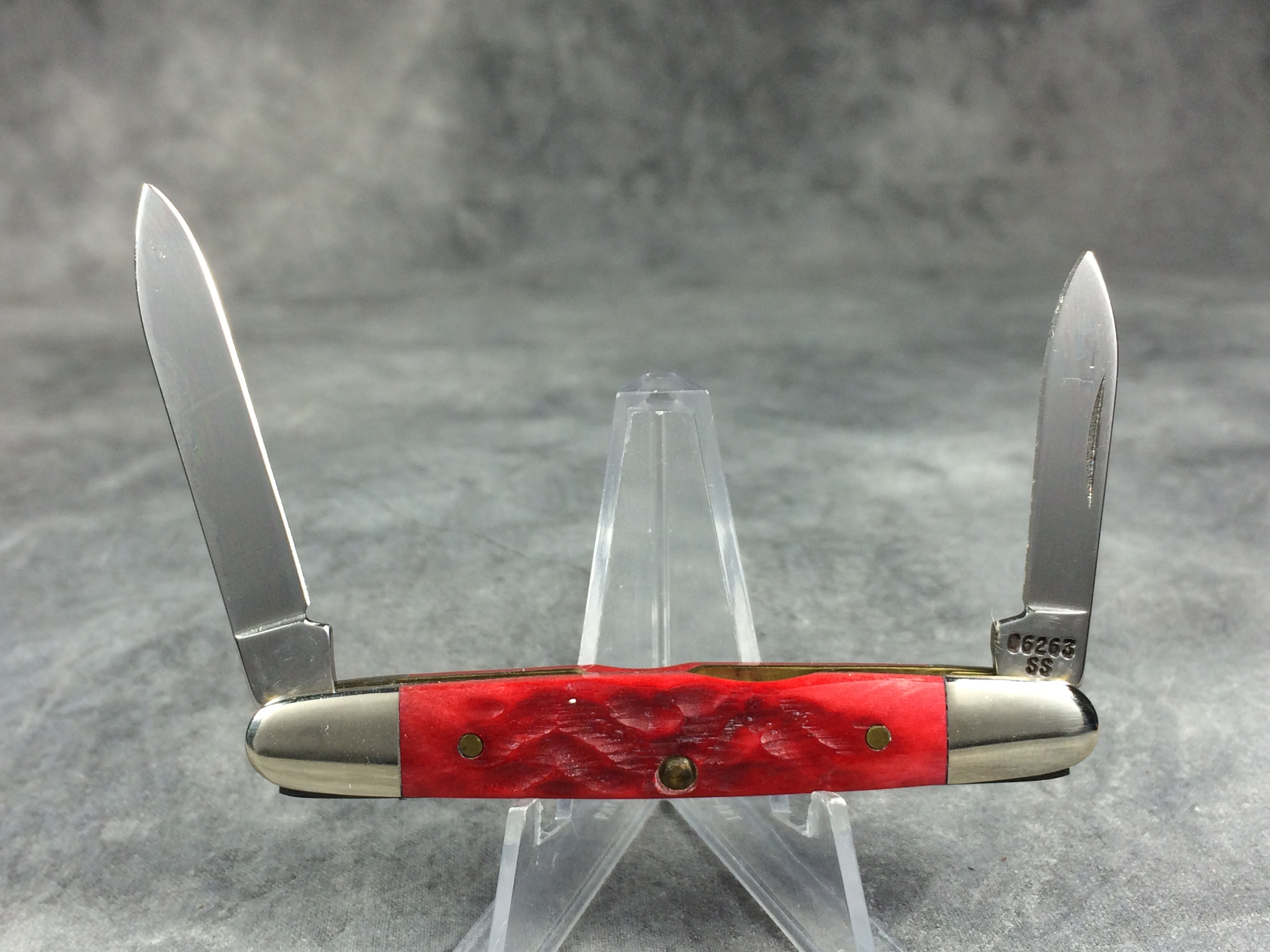 November 03, 2025 - 3-1/8 inches closed. 4-7/8 inches open. Made in USA. "CASE XX USA *** " and "06263 SS" tang stamps. Single Oval "CASE-XX" shield. Stainless Steel blades. Master blade etched with Dwight Eisenhower's signature. Red Jigged Bone handle. Nickel Silver bolsters. Brass liner.