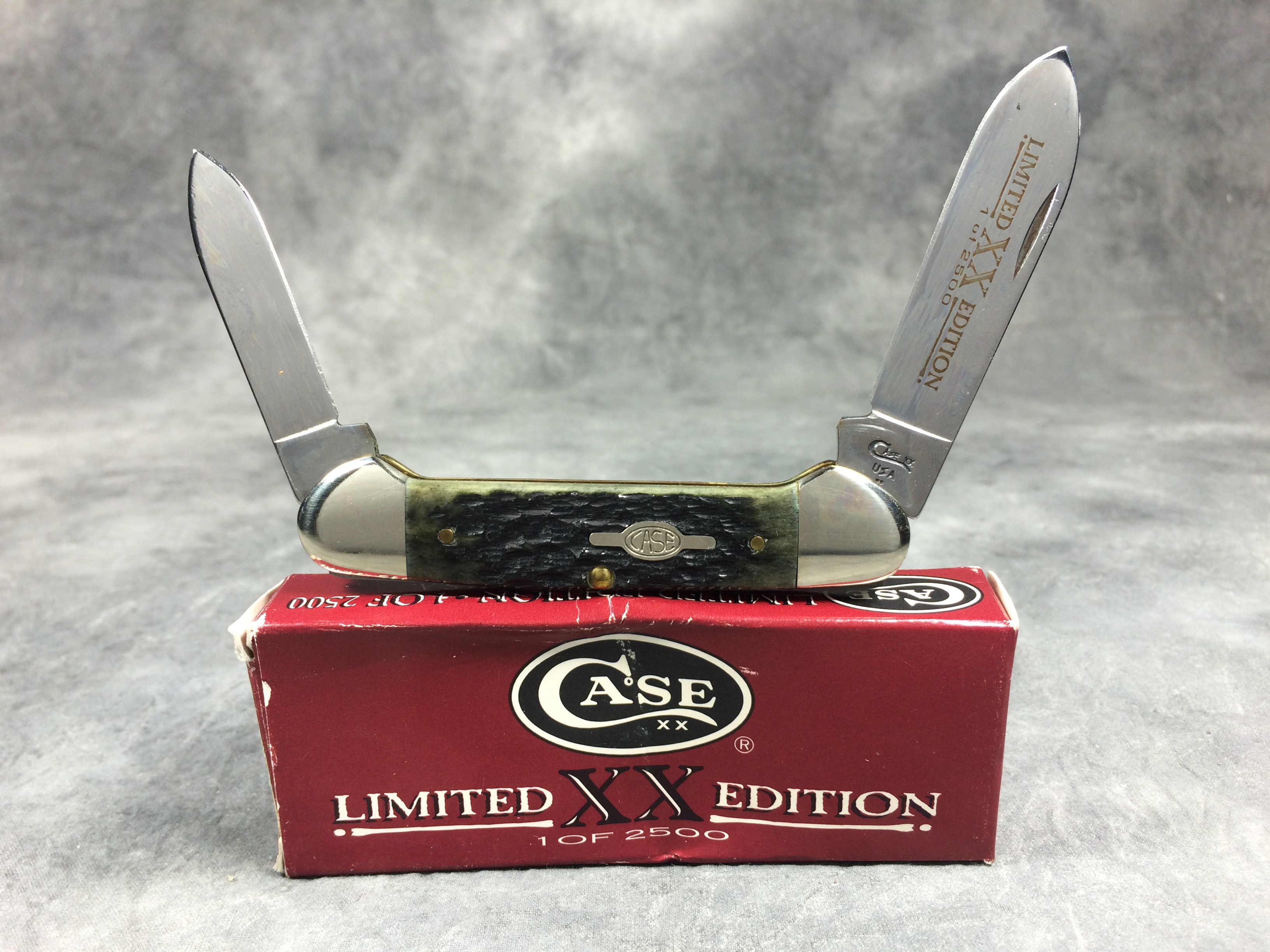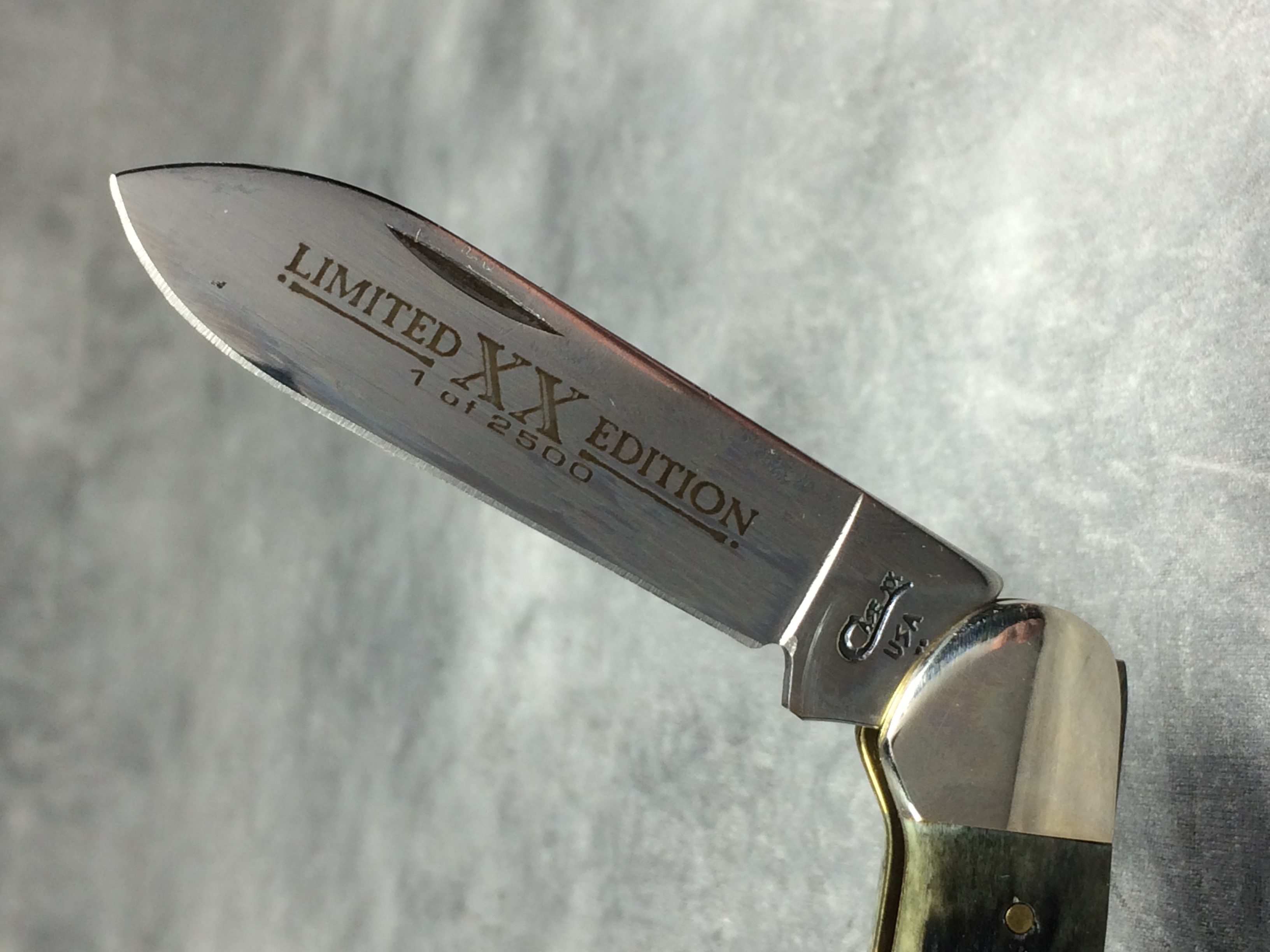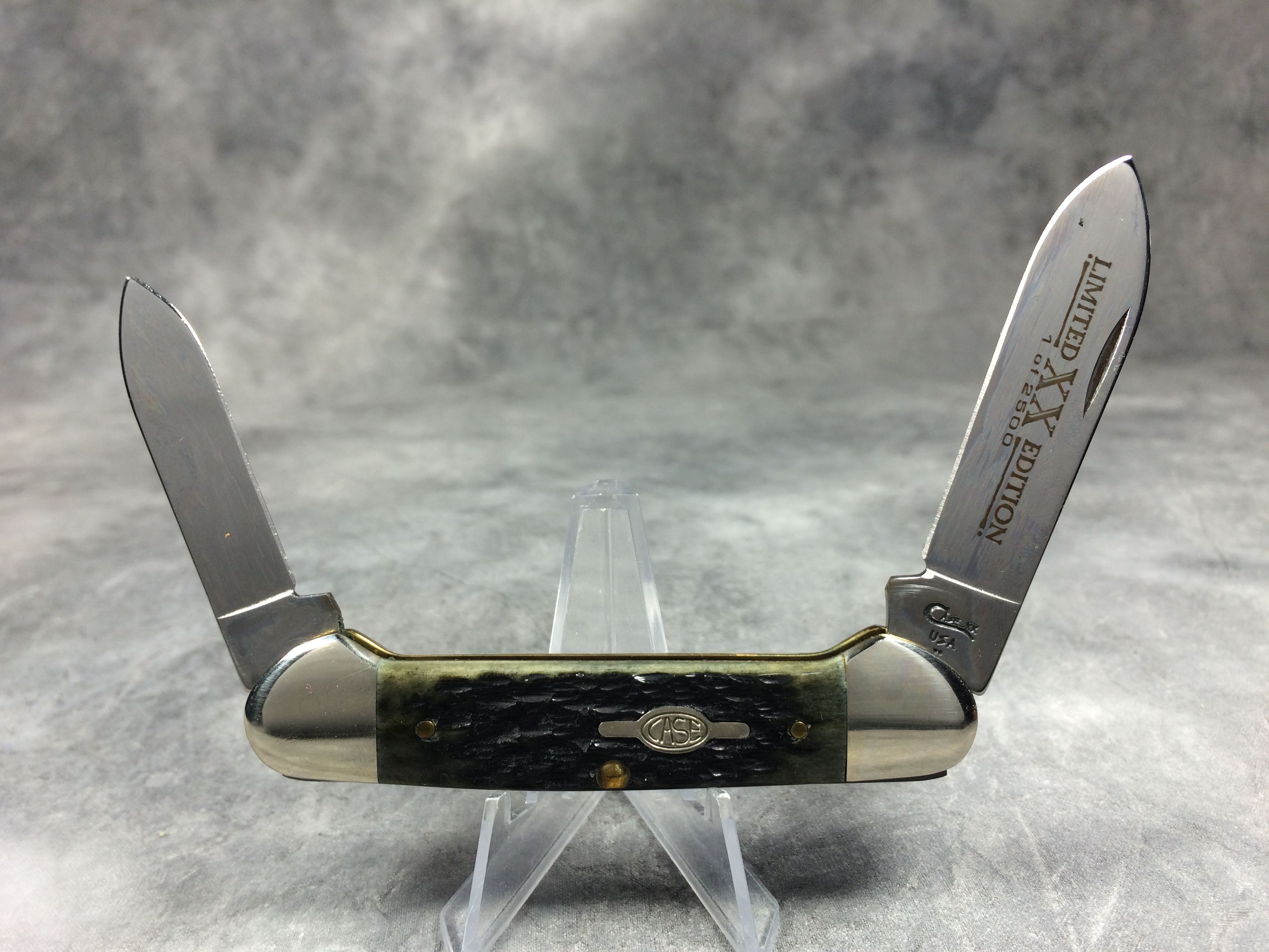 March 06, 2026 - 3-5/8 inches closed. 6-1/4 inches open. Made in USA. "Case XX USA ** " (2 dot with lightning bolt S) and "62131 SS" tang stamps. Saturn-shaped 'Open C' CASE shield. Stainless Steel blades. Master blade etched "LIMITED XX EDITION 1 of 2500. Black Rogers Jigged Bone handle. Nickel Silver bolsters. Brass liner.
