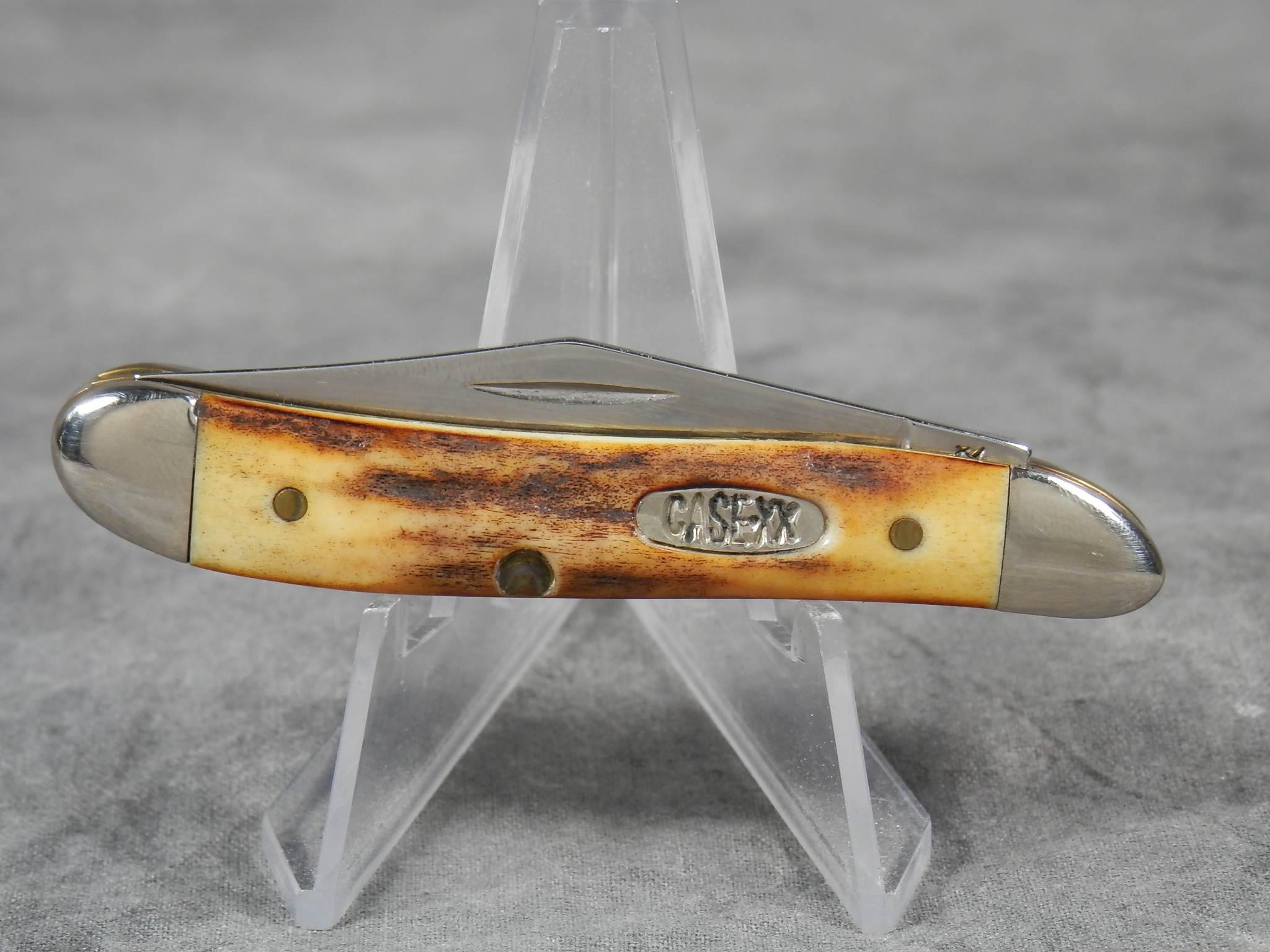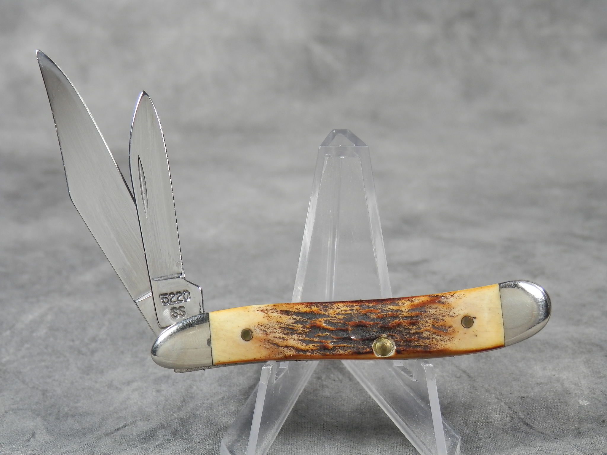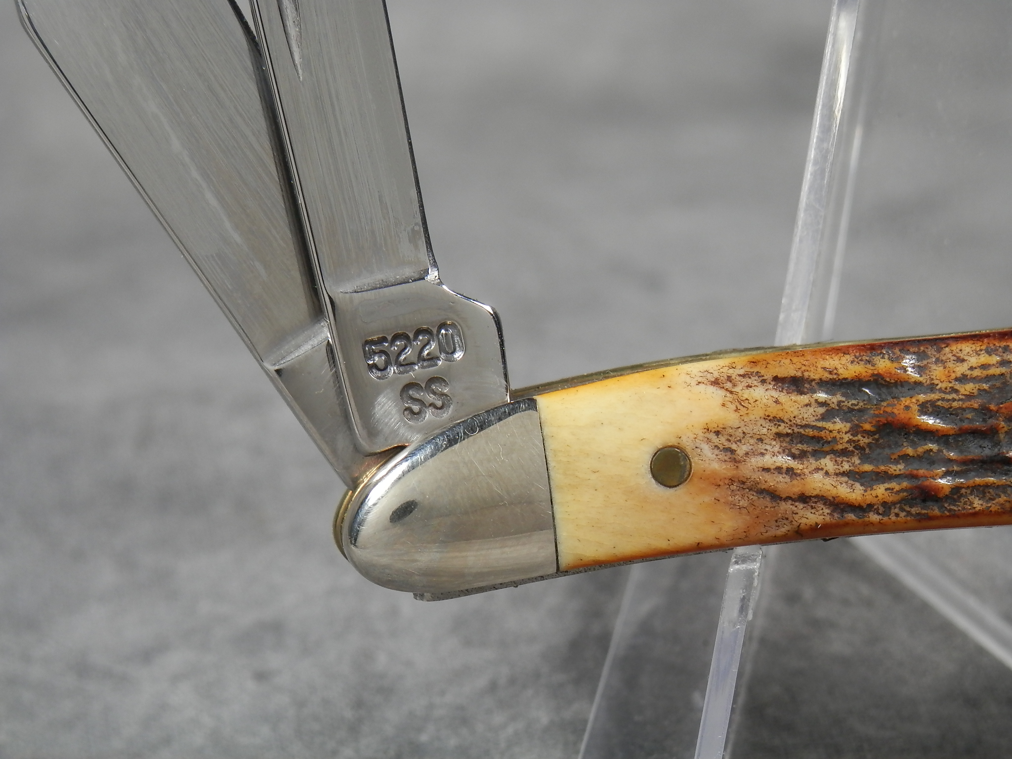 January 08, 2026 - 2-3/4 inches closed. 4-7/8 inches open. Made in USA. "Case XX USA * " (1 dot with lightning bolt S) and "5220 SS" tang stamps. Oval 'Closed C' CASE XX shield. Stainless Steel blades. Beautiful stag handle. Nickel Silver bolsters. Brass liner.