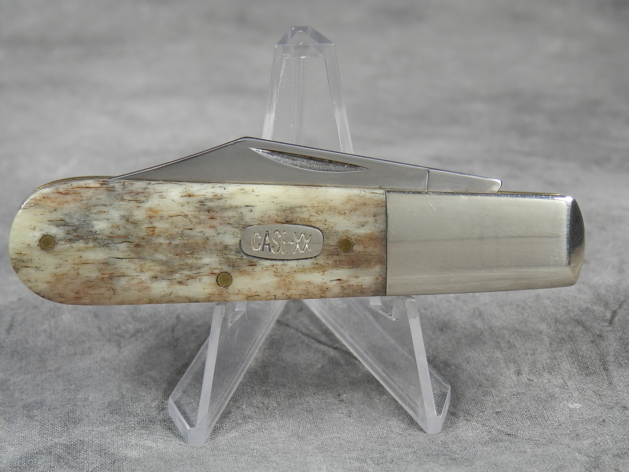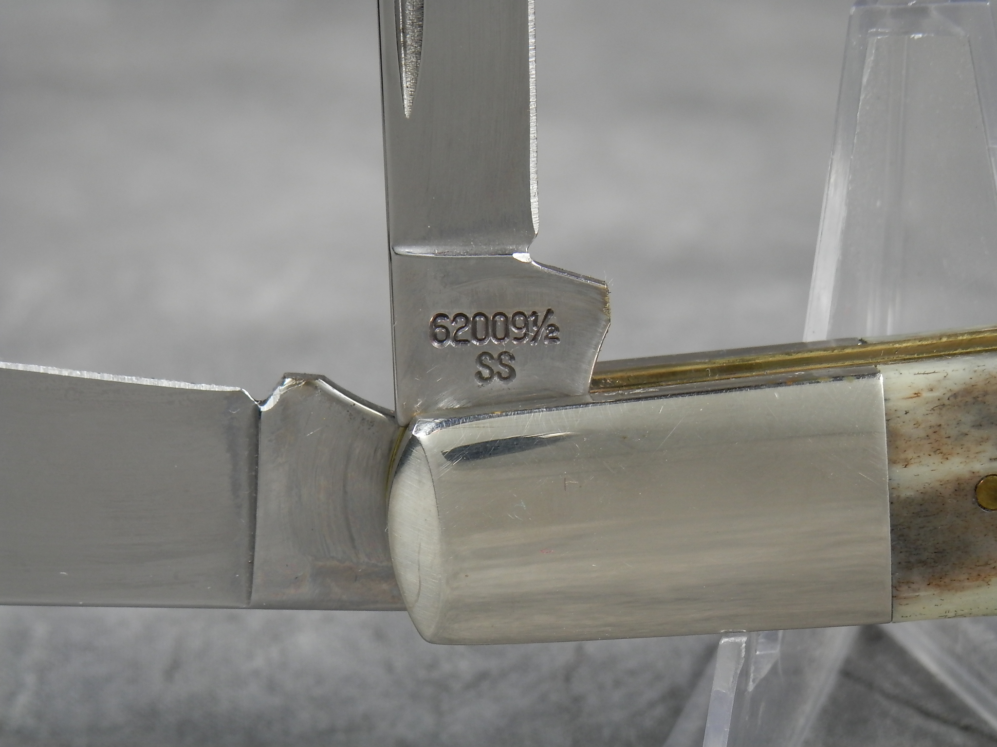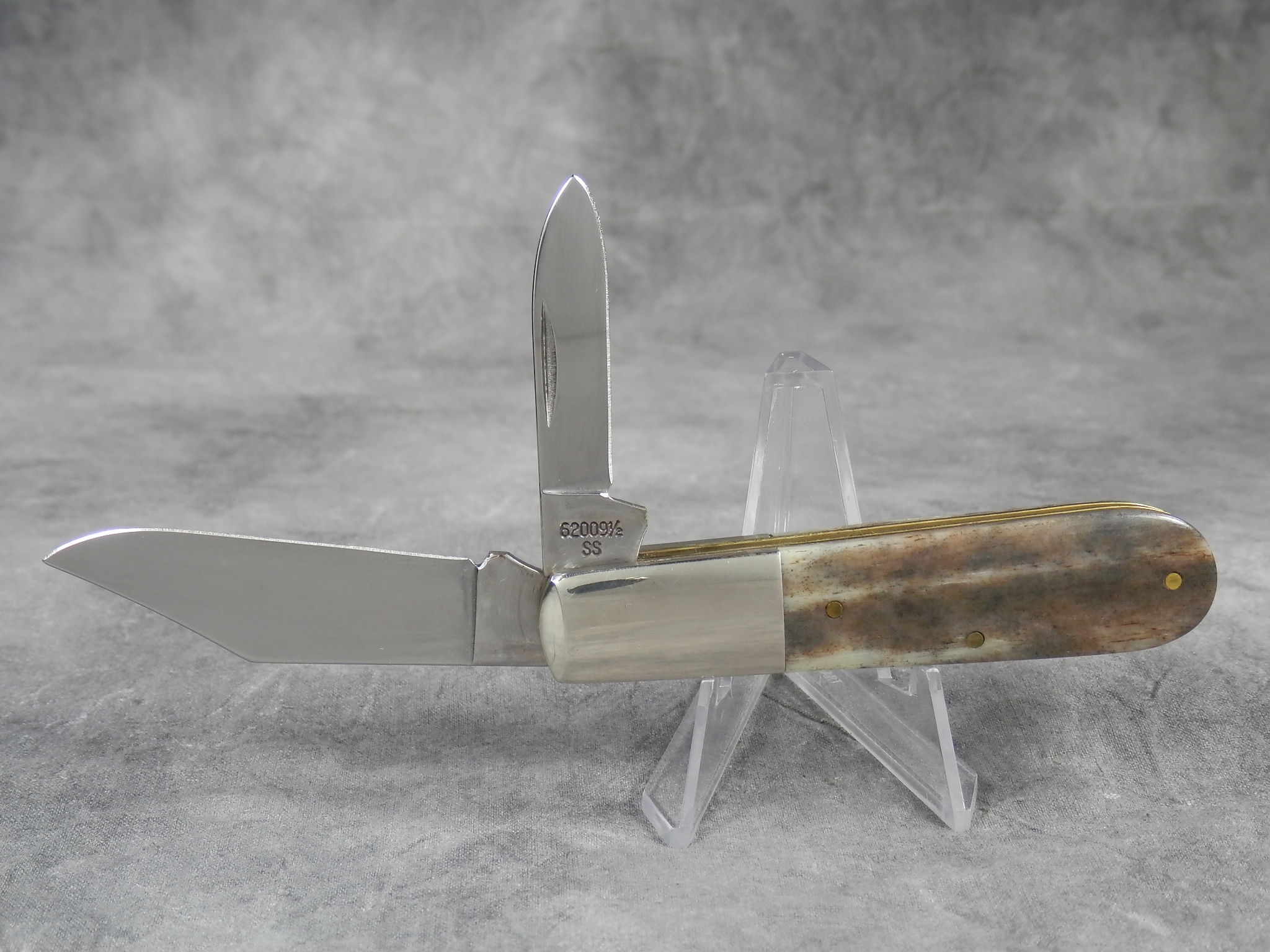 January 08, 2026 - 3-3/8 inches closed. 5-7/8 inches open. Made in USA. "CASE XX USA *** " (3 dot with lightning bolt S) and "62009 1/2 SS" tang stamps. Stainless steel blades. Smooth gray appaloosa bone handle. Oval 'Closed C' CASE-XX shield. Nickel Silver bolsters. Brass liner.