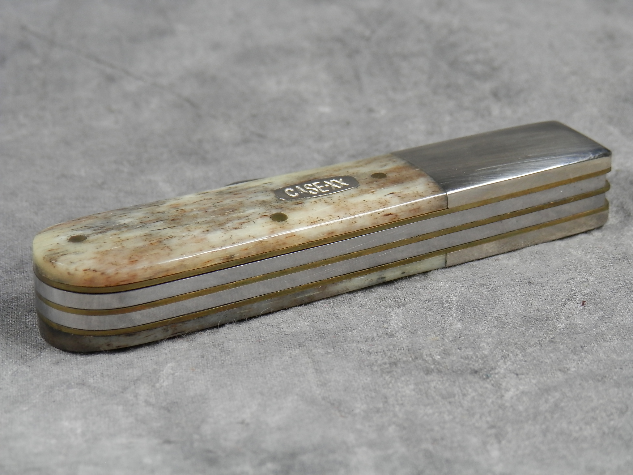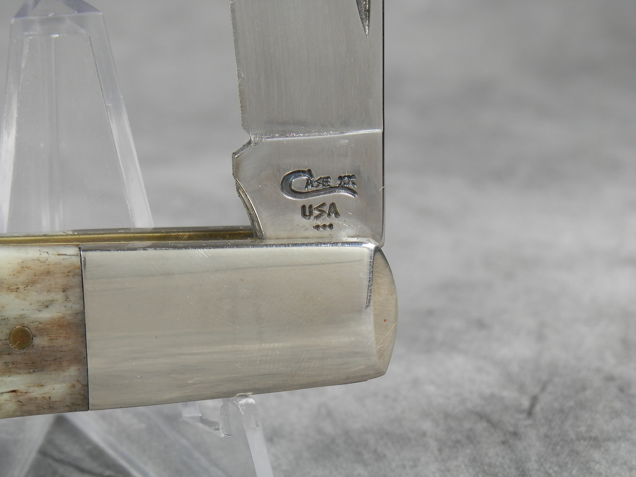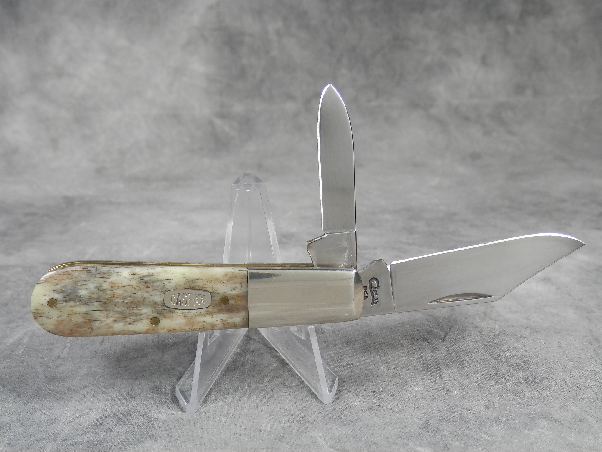 January 08, 2026 - 3-3/8 inches closed. 5-7/8 inches open. Made in USA. "CASE XX USA *** " (3 dot with lightning bolt S) and "62009 1/2 SS" tang stamps. Stainless steel blades. Smooth gray appaloosa bone handle. Oval 'Closed C' CASE-XX shield. Nickel Silver bolsters. Brass liner.
