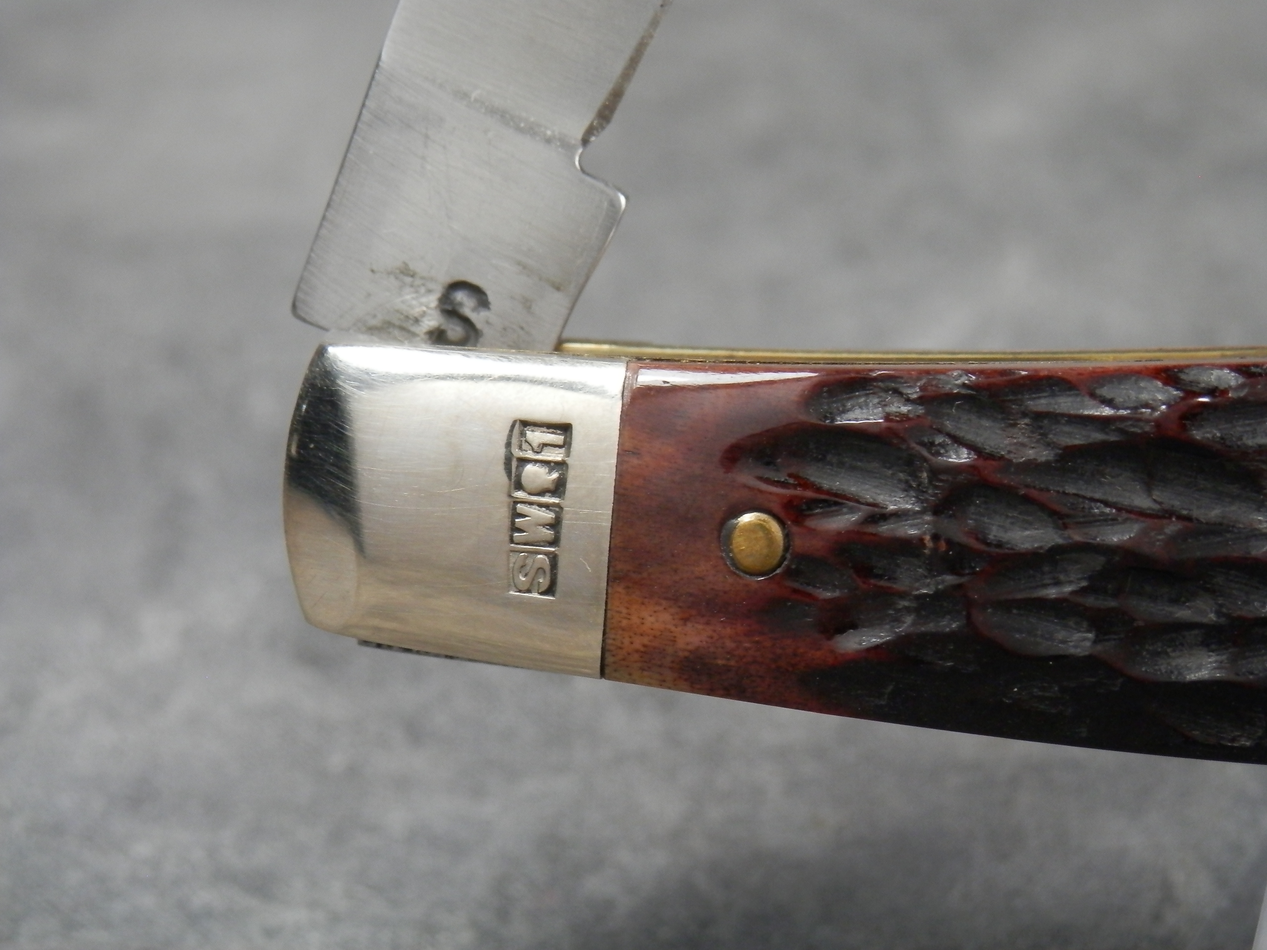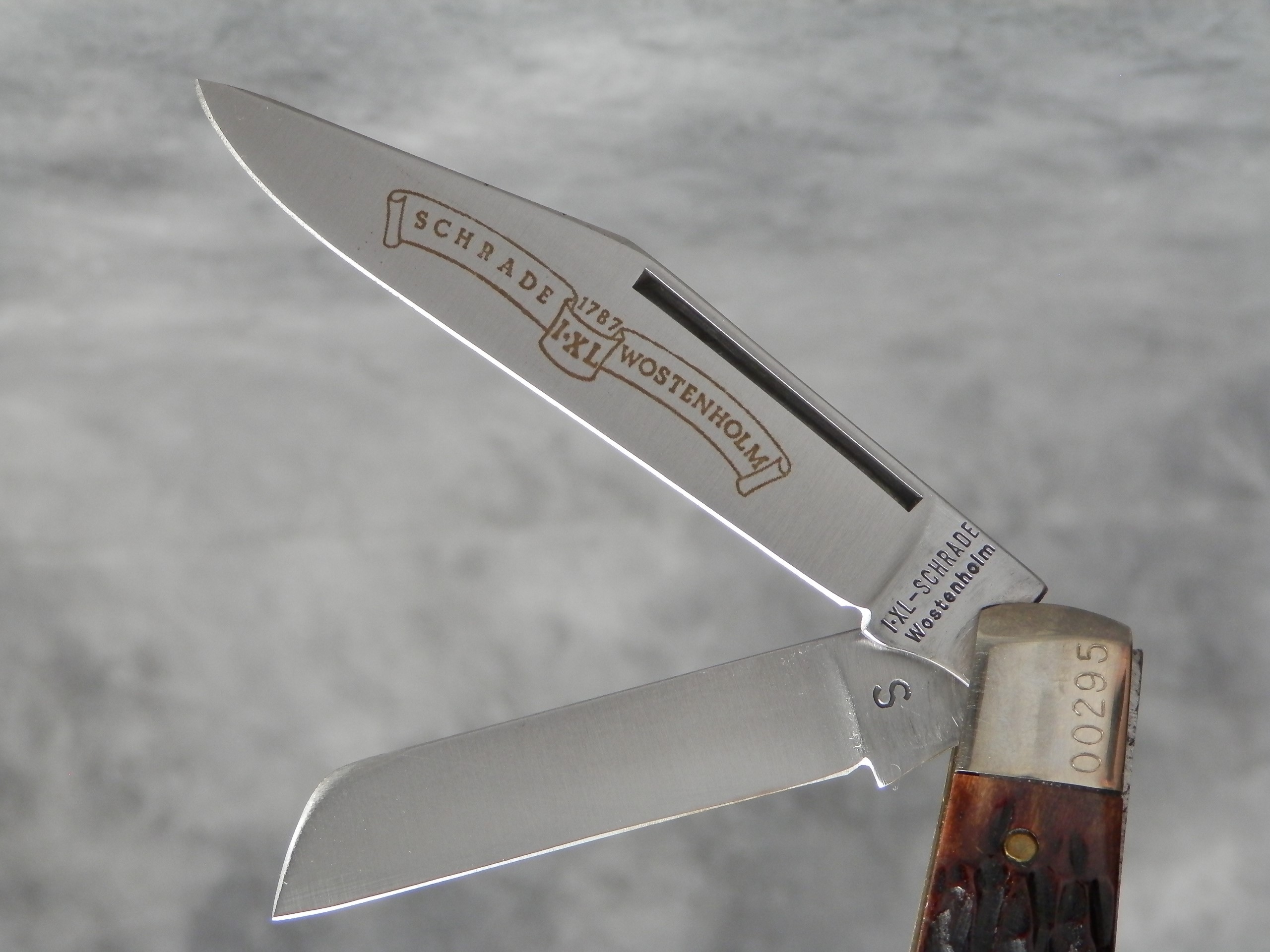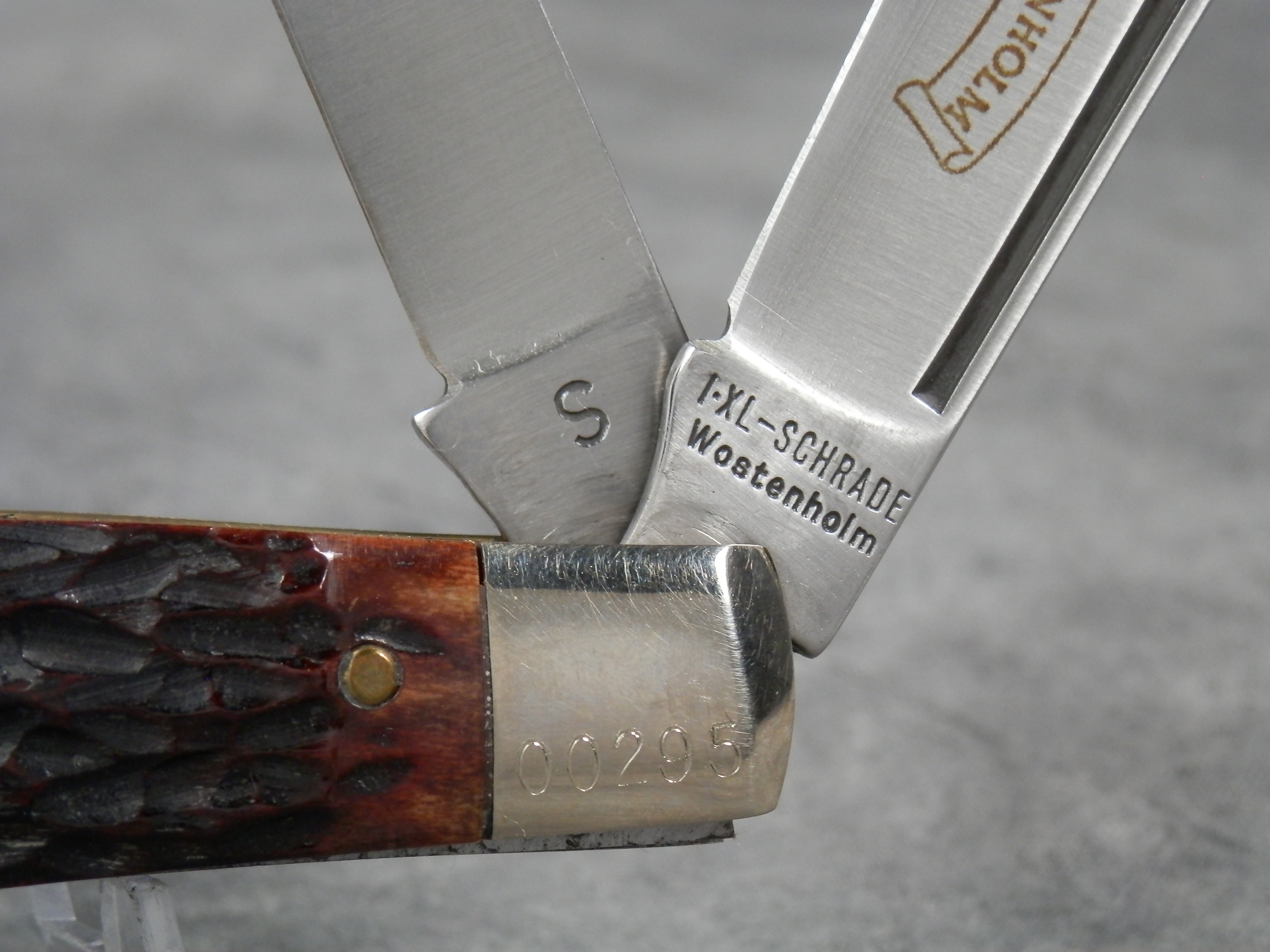 March 06, 2026 - 3-5/8 inches closed. 6-1/8 inches open. Made in England. "I*XL SCHRADE  WOSTENHOLM", "S" and "SHEFFIELD ENGLAND" tang stamps. Stainless Steel blades. Master blade etched "1787 I*XL SCHRADE WOSTENHOLM". Brown jigged bone handle. Nickel Silver bolsters etched with serial #00295 and with Hallmark "S W (head) 1" . Brass liner.