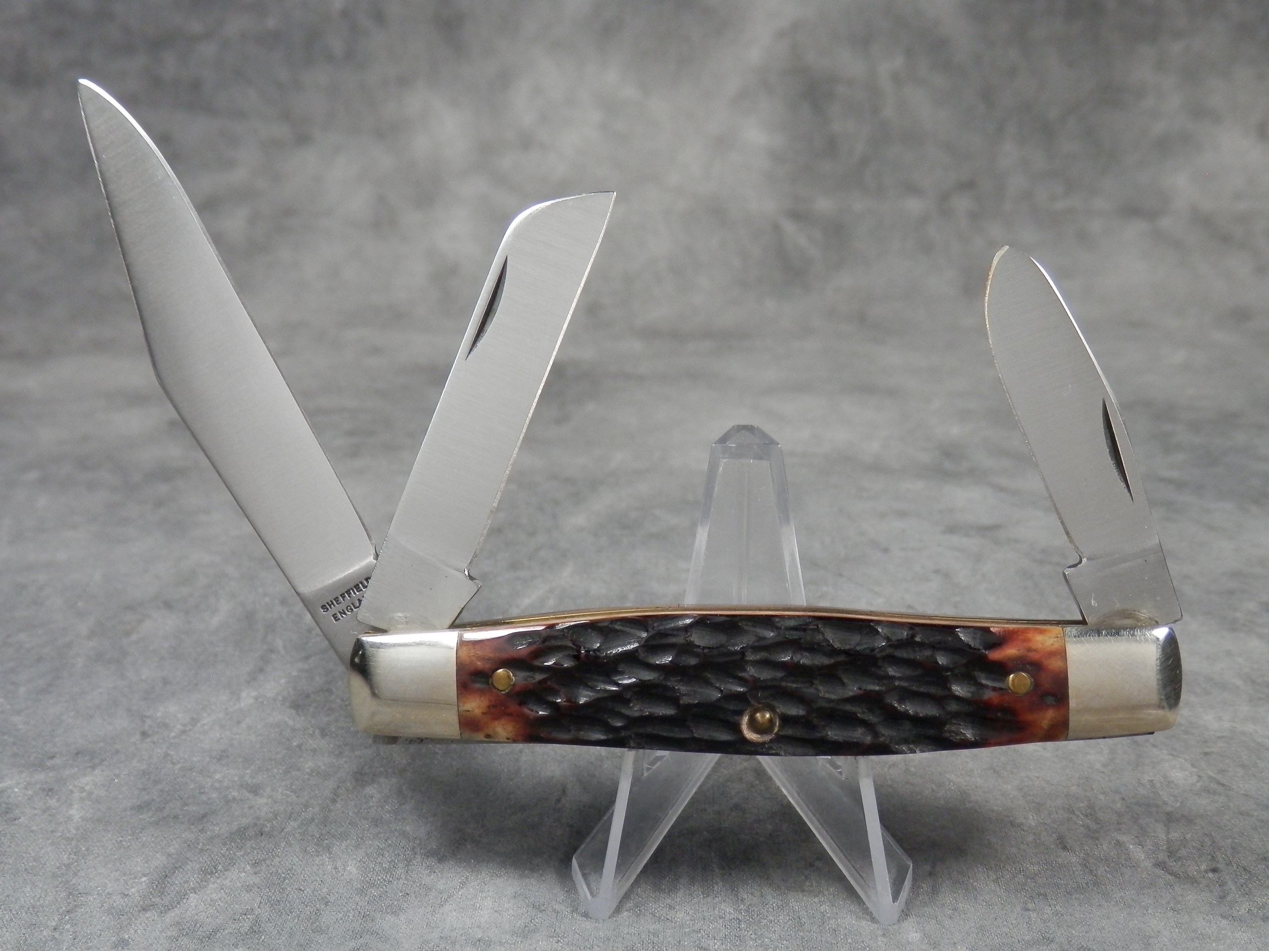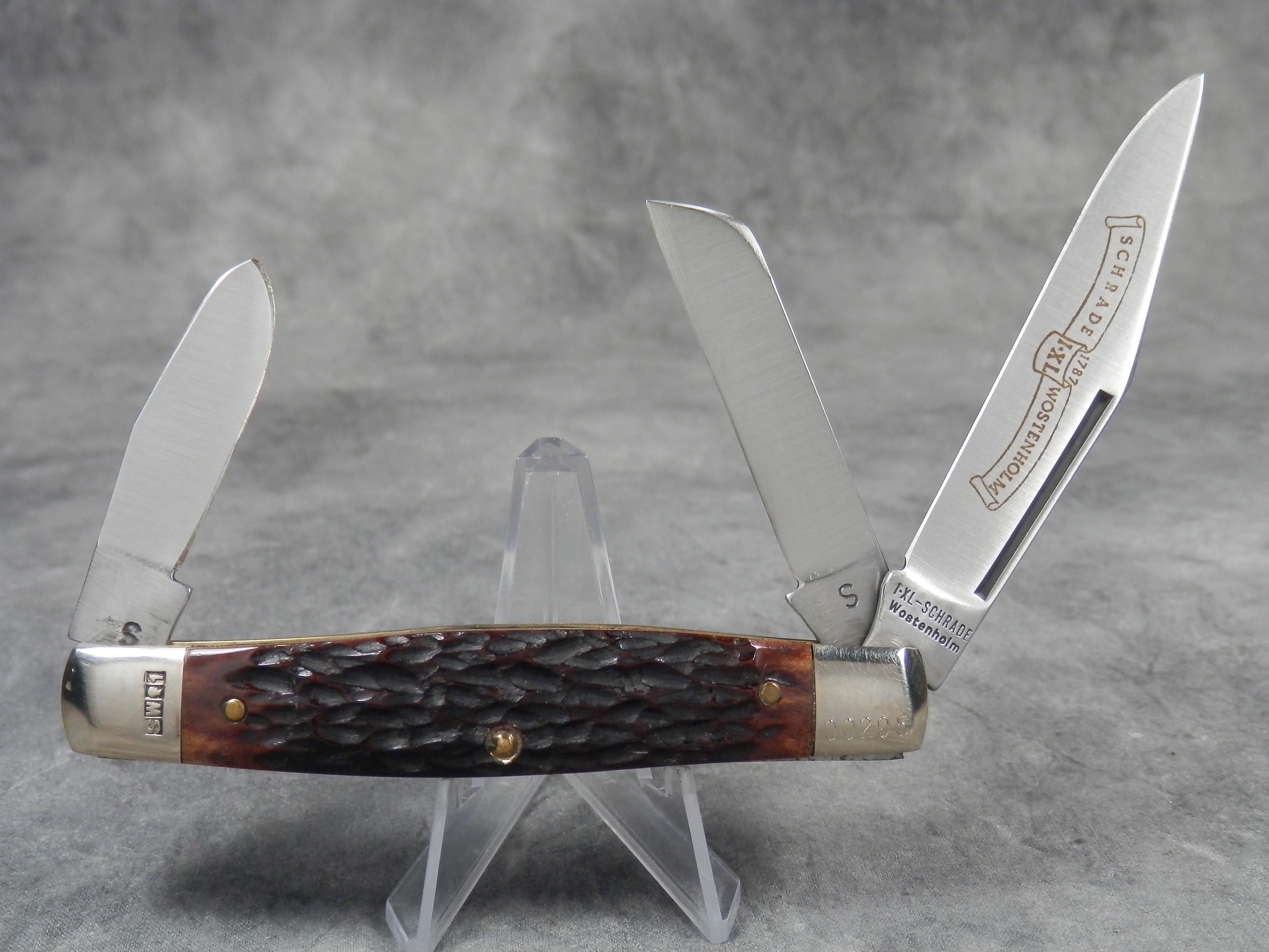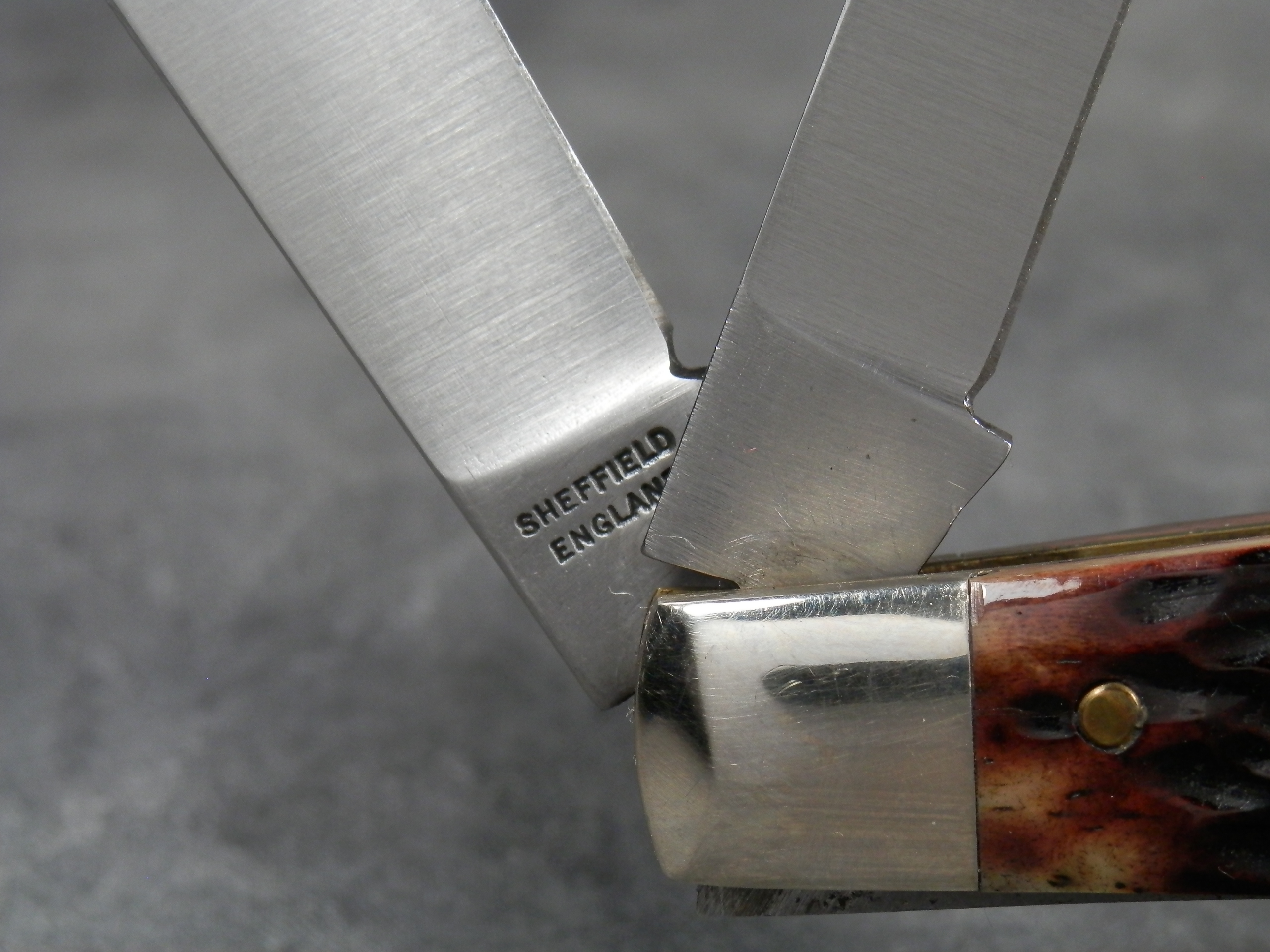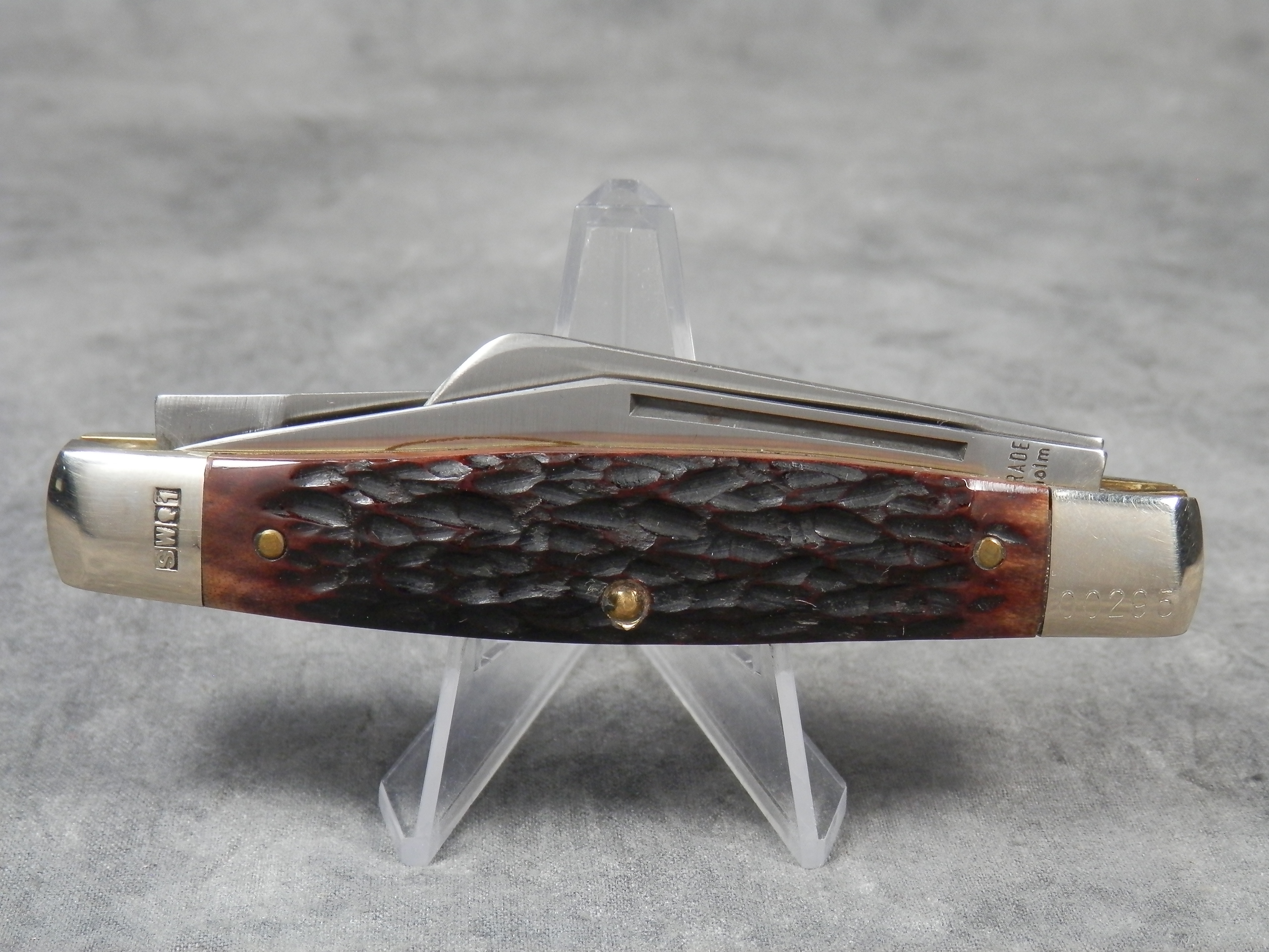 March 06, 2026 - 3-5/8 inches closed. 6-1/8 inches open. Made in England. "I*XL SCHRADE  WOSTENHOLM", "S" and "SHEFFIELD ENGLAND" tang stamps. Stainless Steel blades. Master blade etched "1787 I*XL SCHRADE WOSTENHOLM". Brown jigged bone handle. Nickel Silver bolsters etched with serial #00295 and with Hallmark "S W (head) 1" . Brass liner.