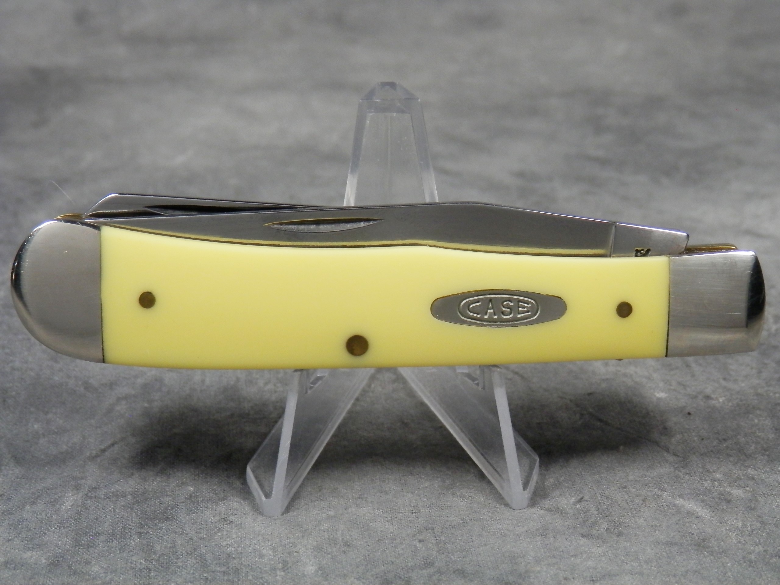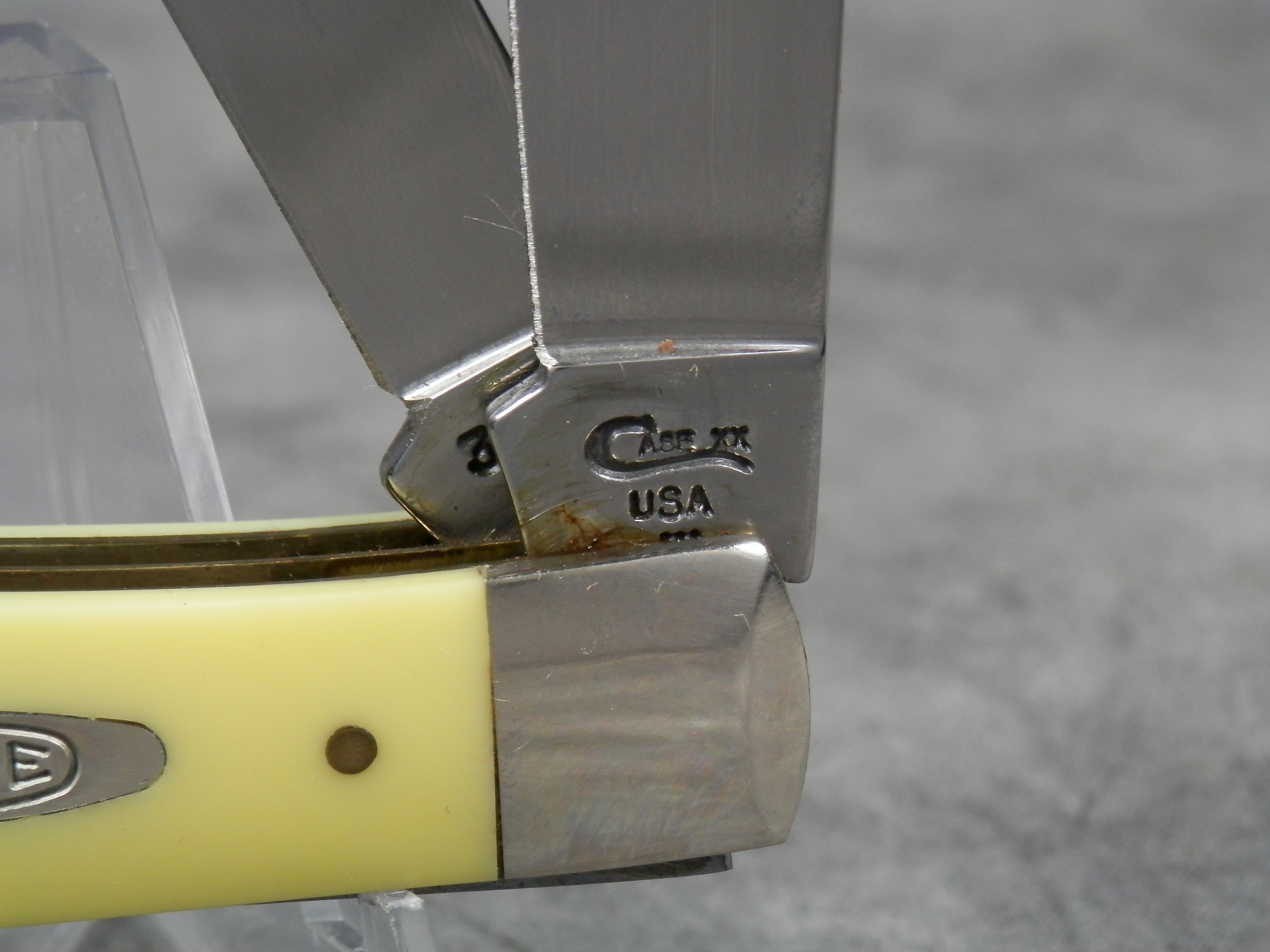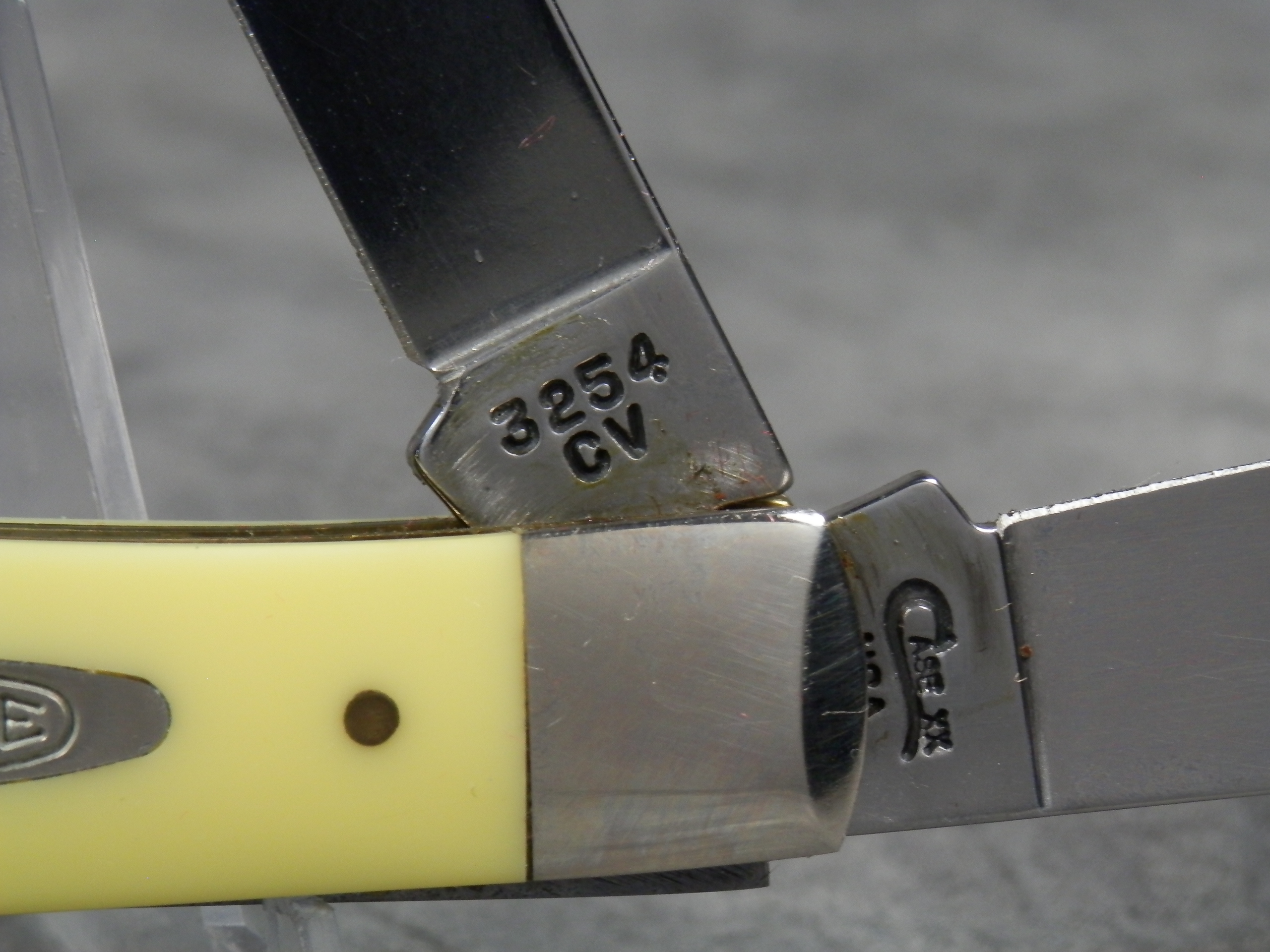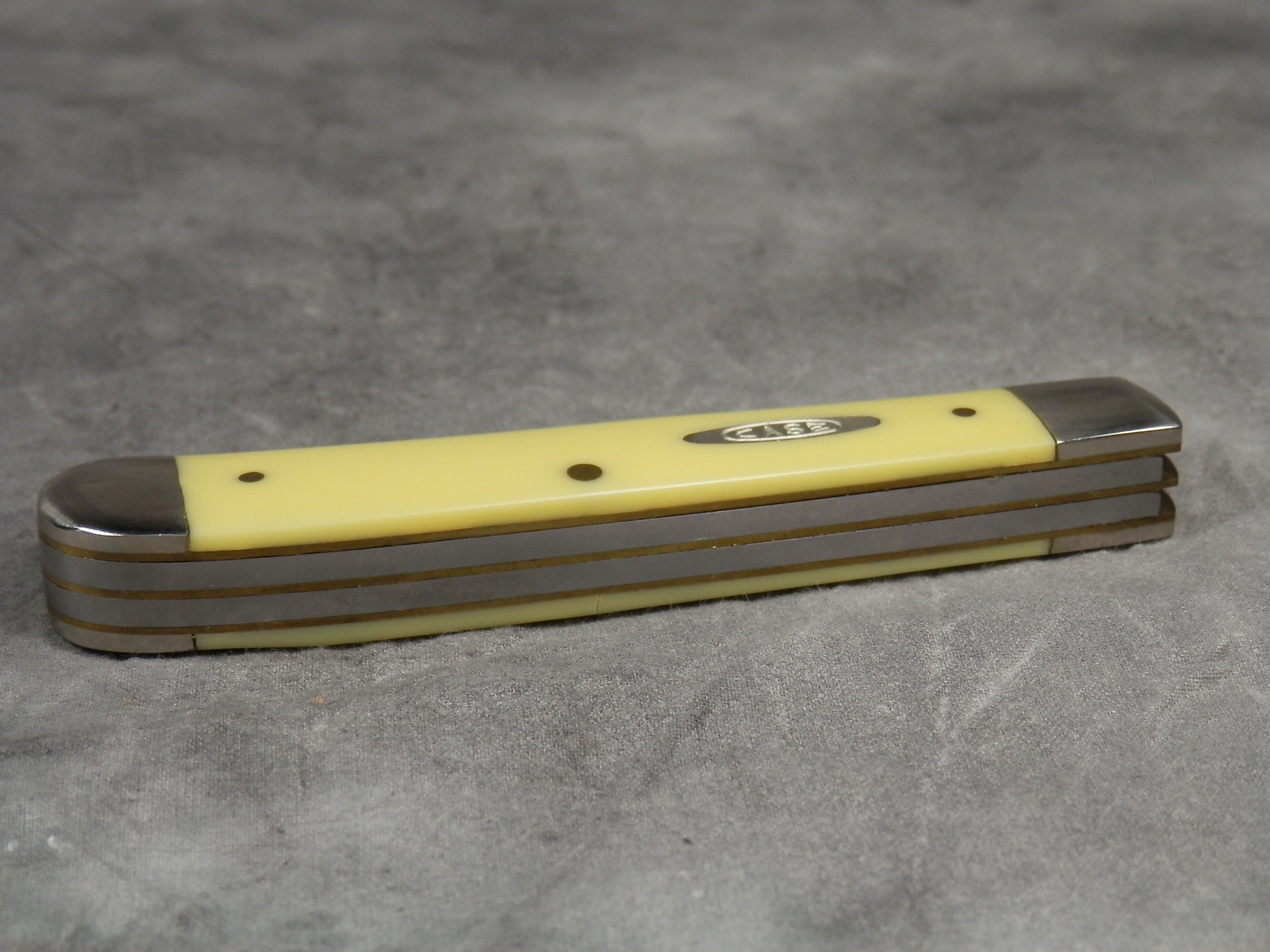 April 24, 2026 - 4-1/8 inches closed. 7-3/8 inches open. Made in USA. "CASE XX USA ***  " (Long C script, 3 dot with lightning bolt S) and "3254 CV" tang stamps. Double oval "Open C" shield. Chrome vanadium blades. Yellow Composition handle. Nickel Silver bolsters. Brass liner.