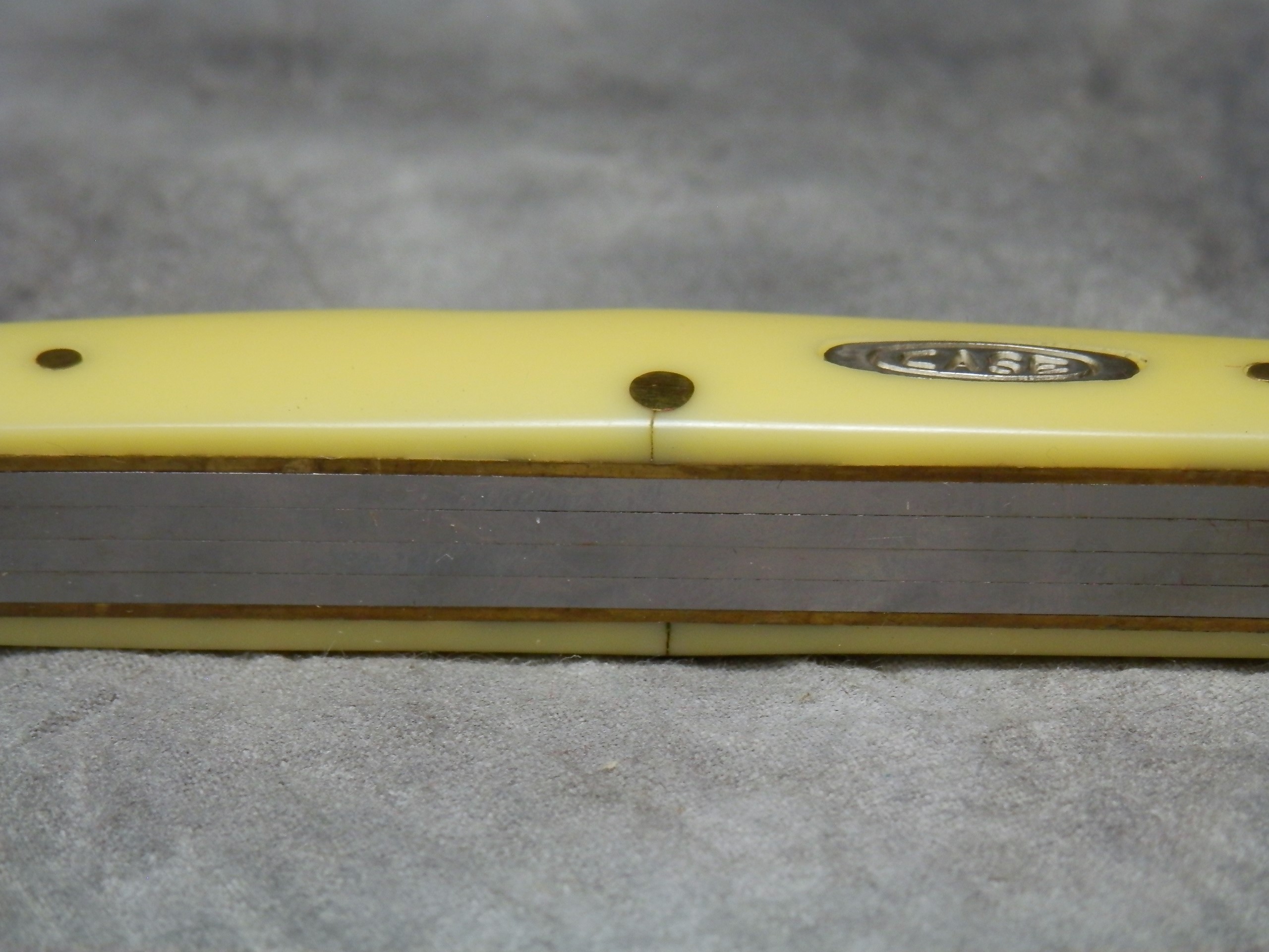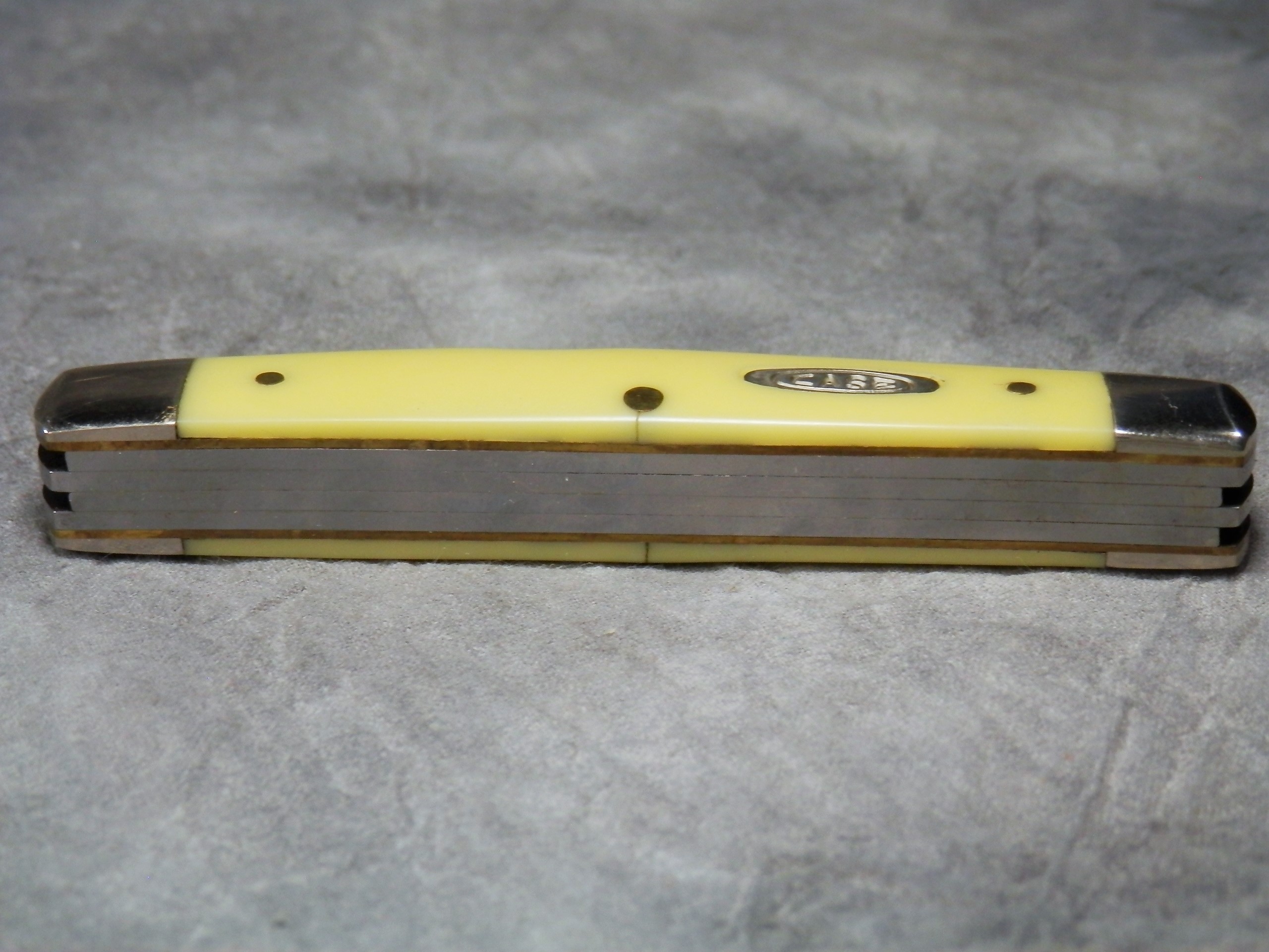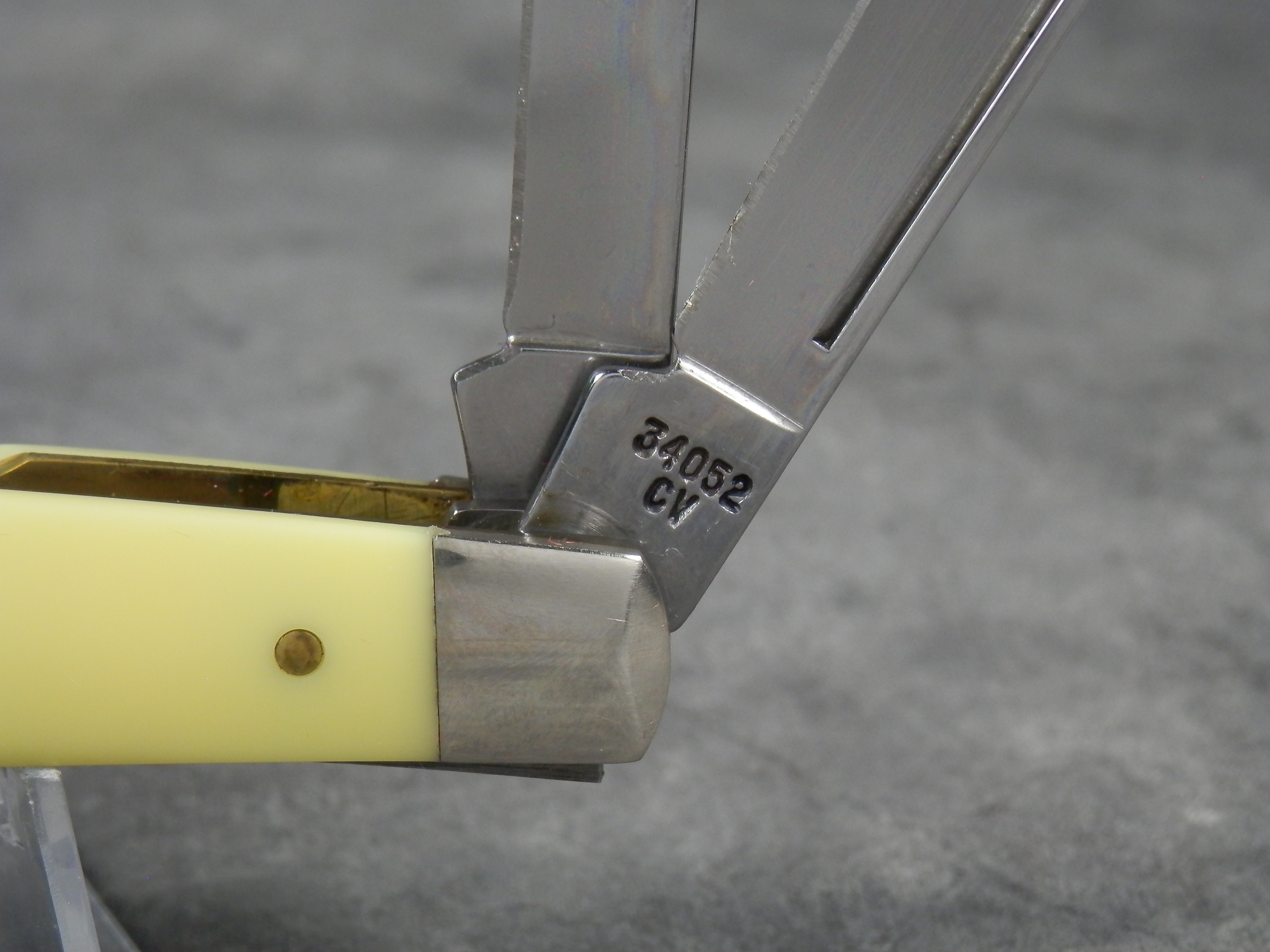 November 06, 2025 - 3-1/2 inches closed. 5-3/4 inches open. Made in USA. "CASE XX USA ***  " (3 dot with lightning bolt S) and "34052 CV" tang stamps. Double oval 'Open C' CASE shield. Chrome vanadium blades. Smooth yellow composition handle. Nickel Silver bolsters. Brass liner.