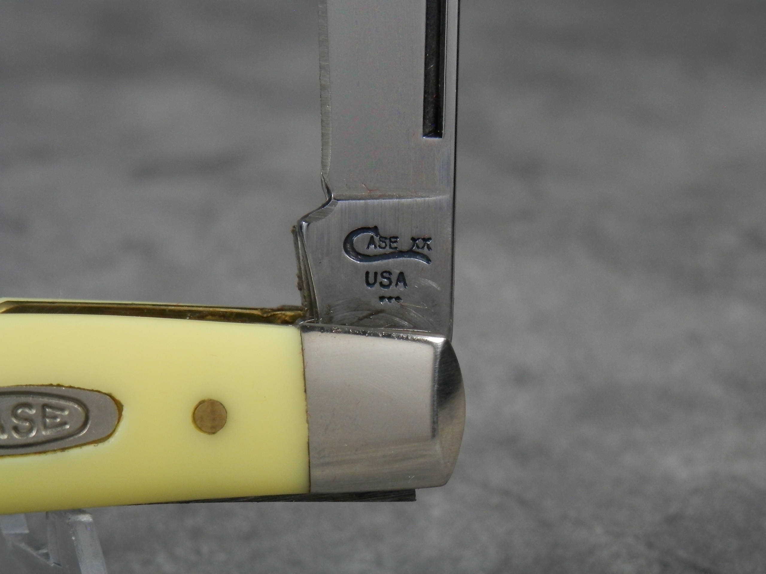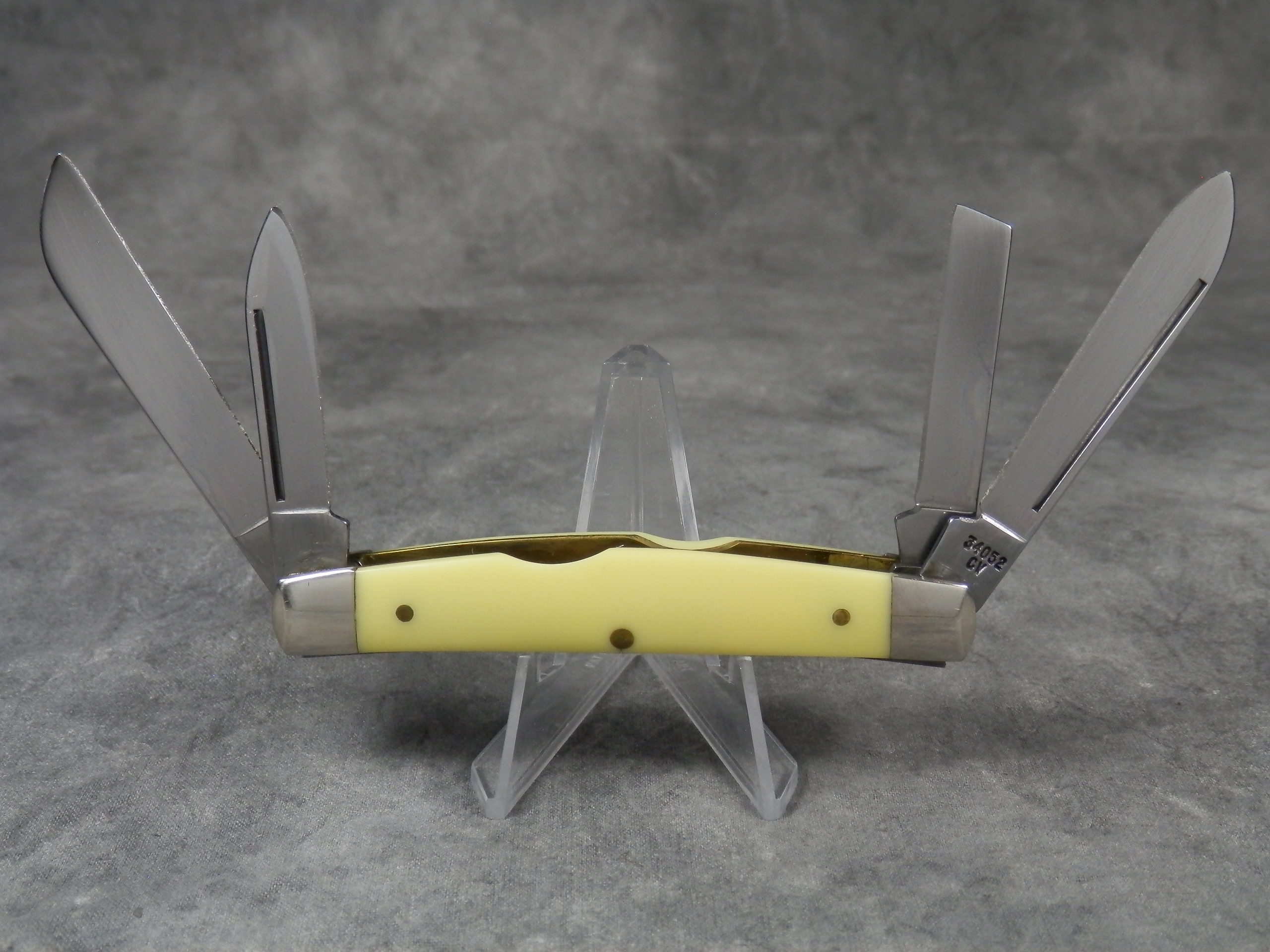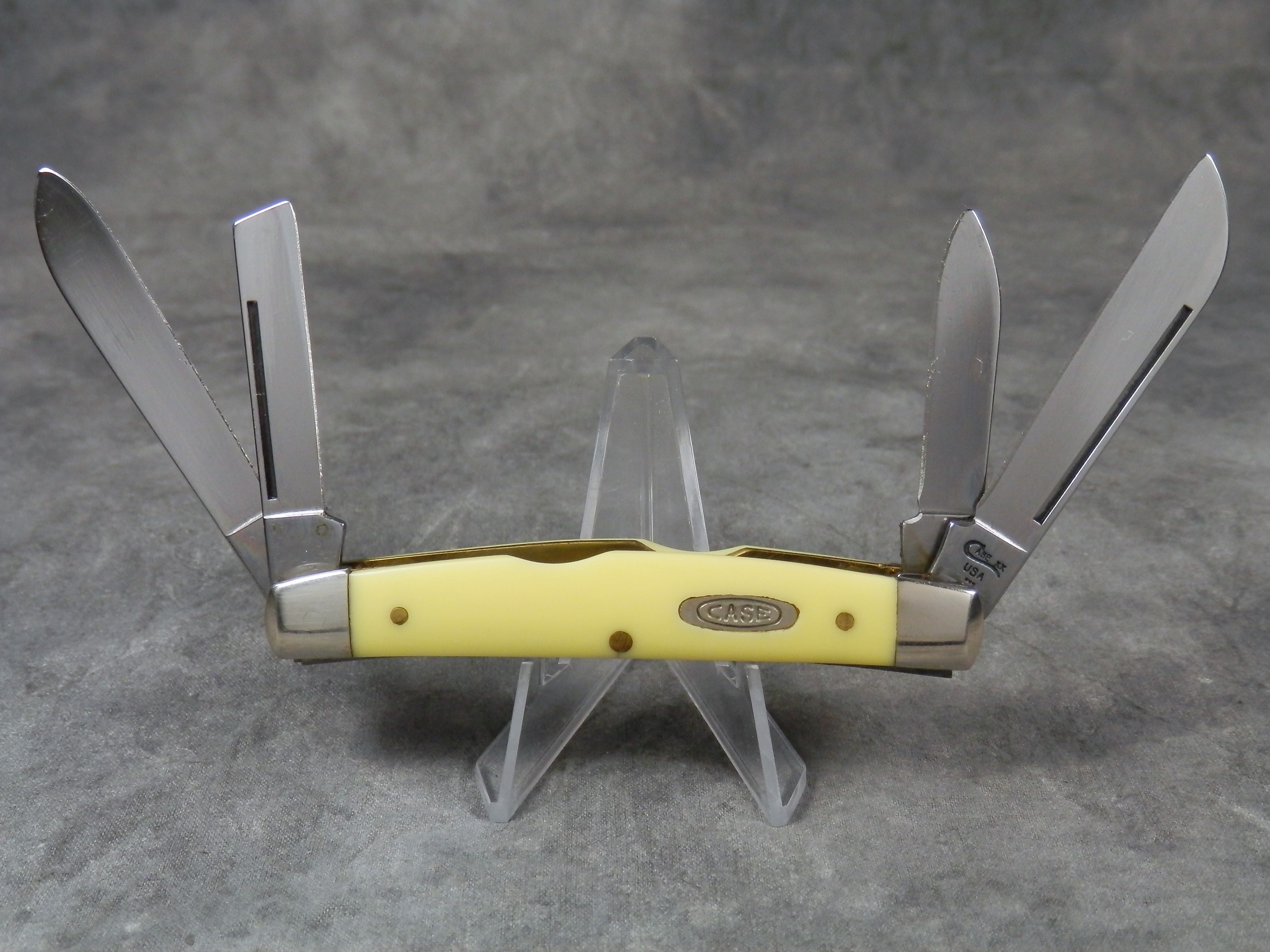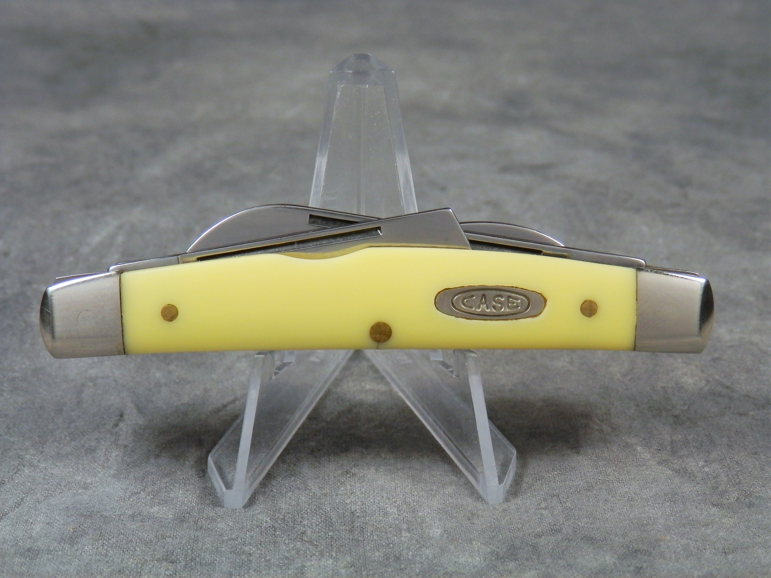 November 06, 2025 - 3-1/2 inches closed. 5-3/4 inches open. Made in USA. "CASE XX USA ***  " (3 dot with lightning bolt S) and "34052 CV" tang stamps. Double oval 'Open C' CASE shield. Chrome vanadium blades. Smooth yellow composition handle. Nickel Silver bolsters. Brass liner.