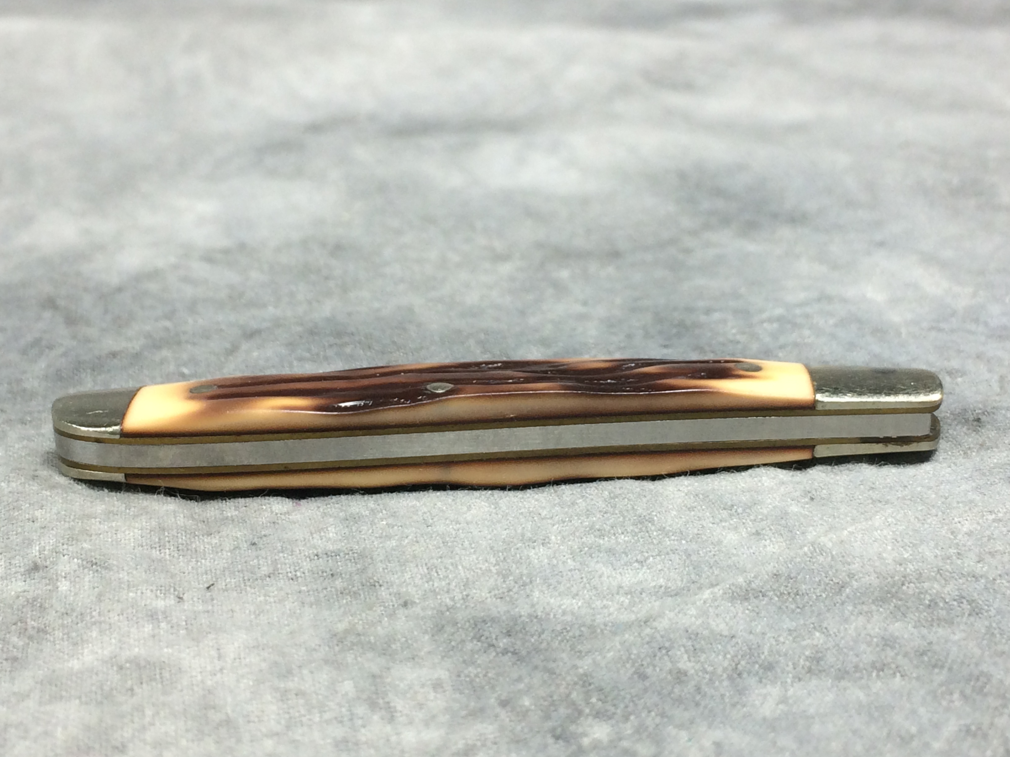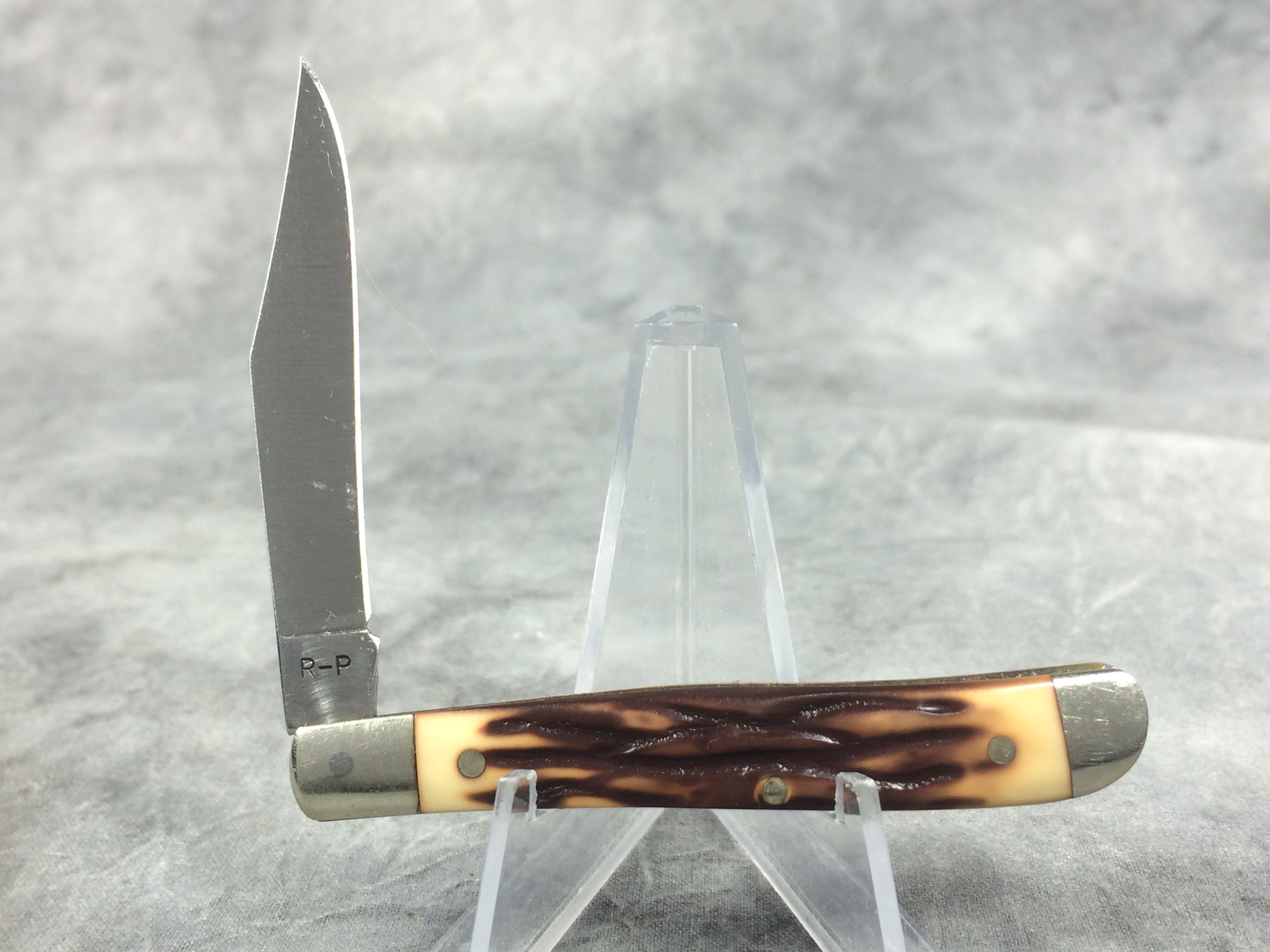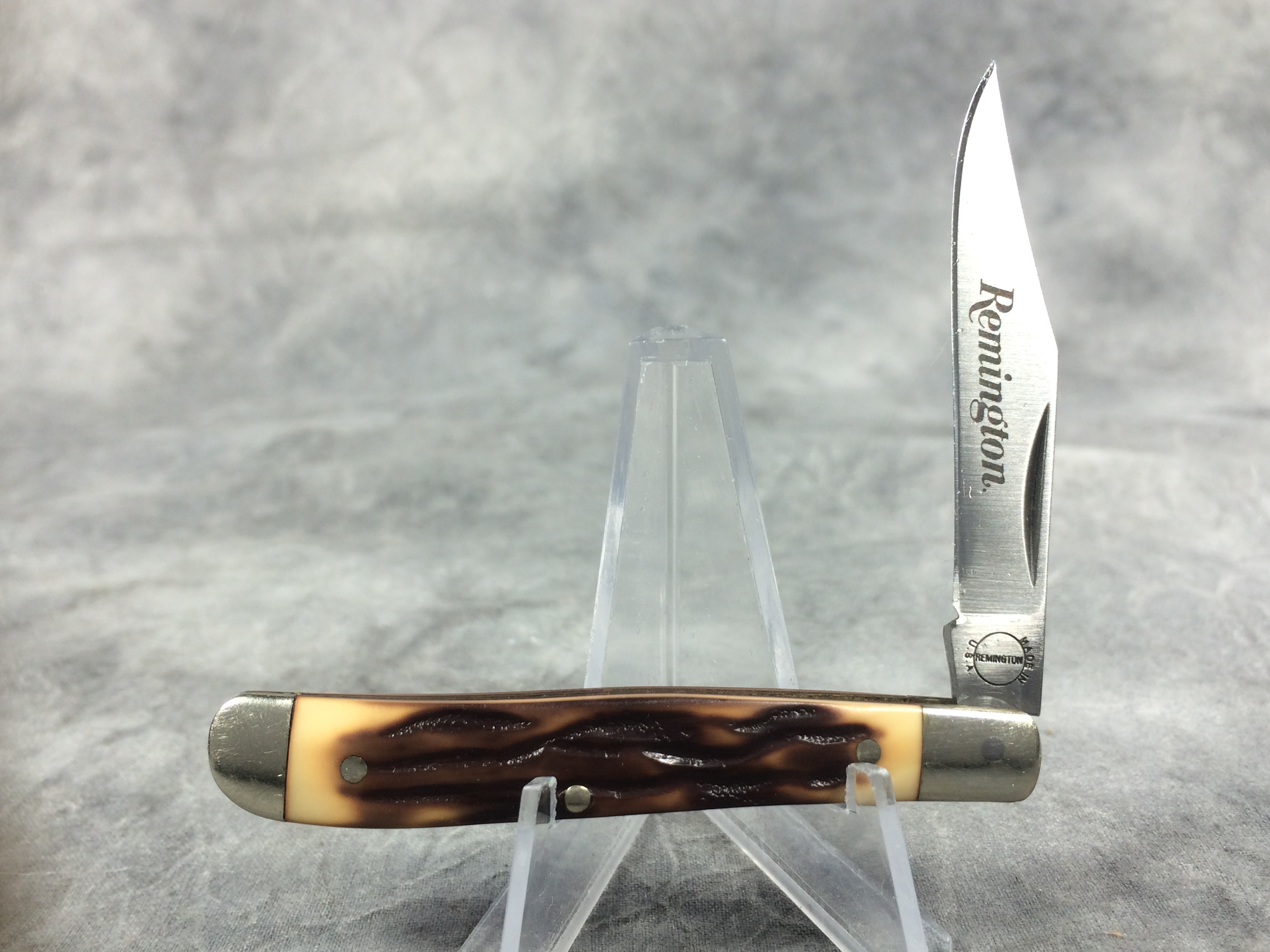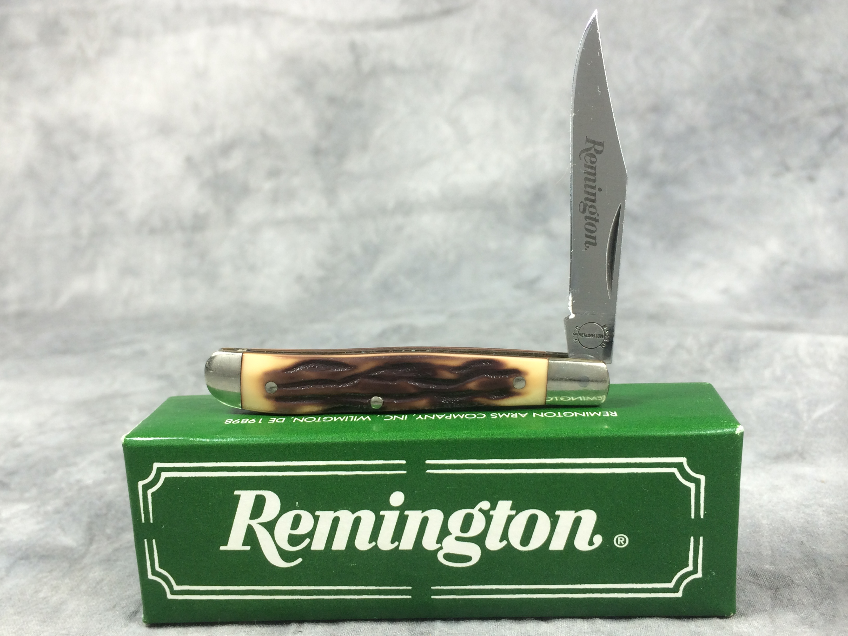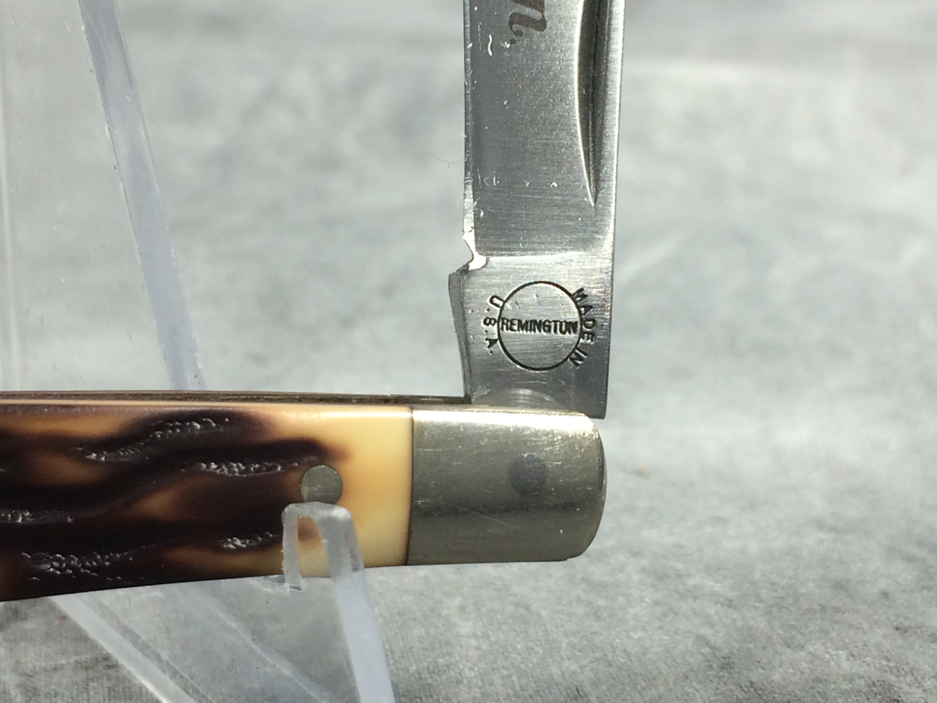 November 06, 2025 - 2-3/4 inches closed. 5 inches open. Made in USA. Circle "Remington Made in USA" and "R-P" tang stamps. Stainless Steel blade etched "Remington". Jigged imitation bone handle. Nickel silver bolsters. Brass liner. With original box and paperwork.