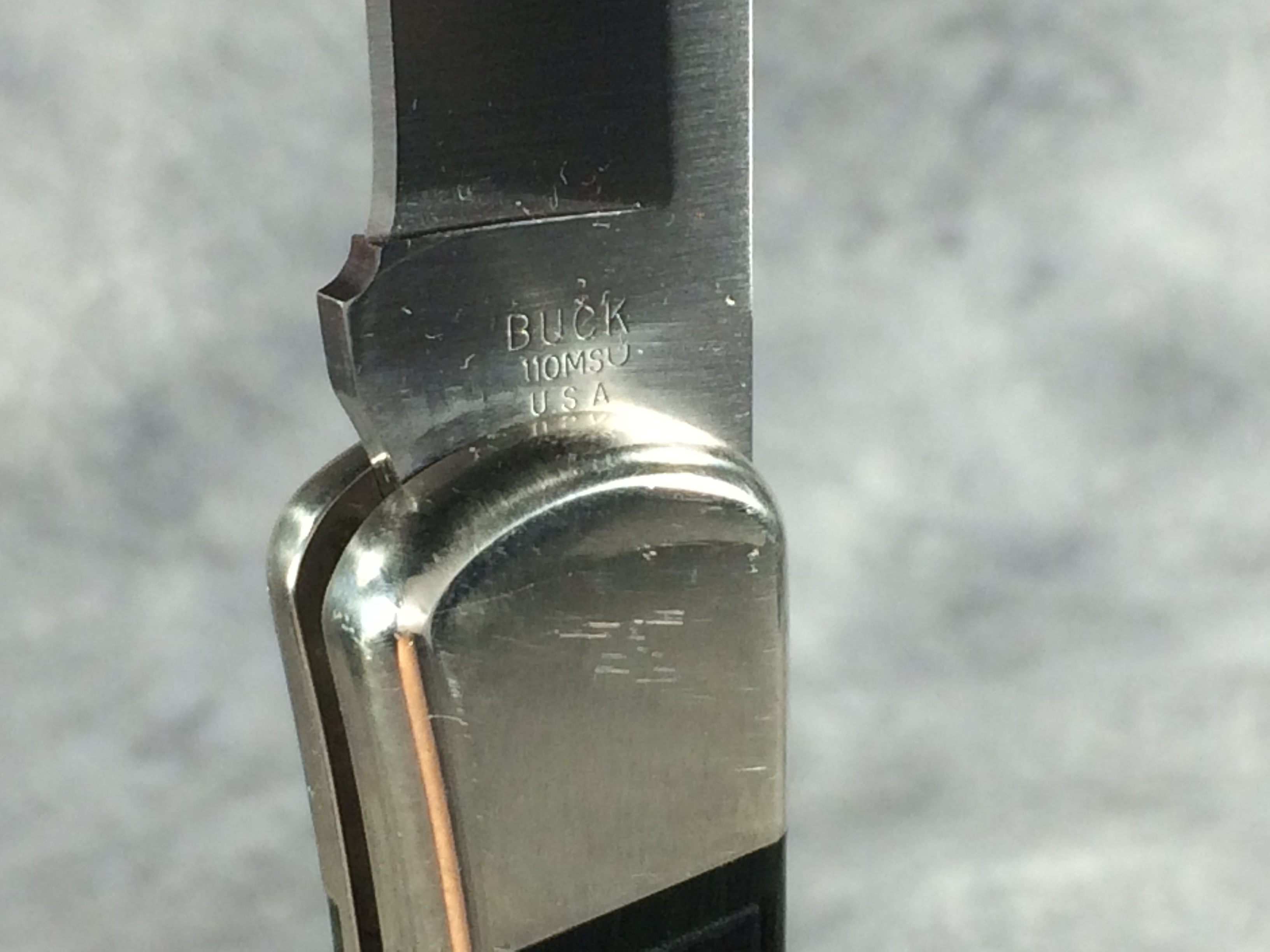 November 06, 2025 - 4-7/8 inches closed. 8-5/8 inches open. Made in USA. "BUCK 110MS (wide U) U.S.A." tang stamp. Stainless Steel blade.
