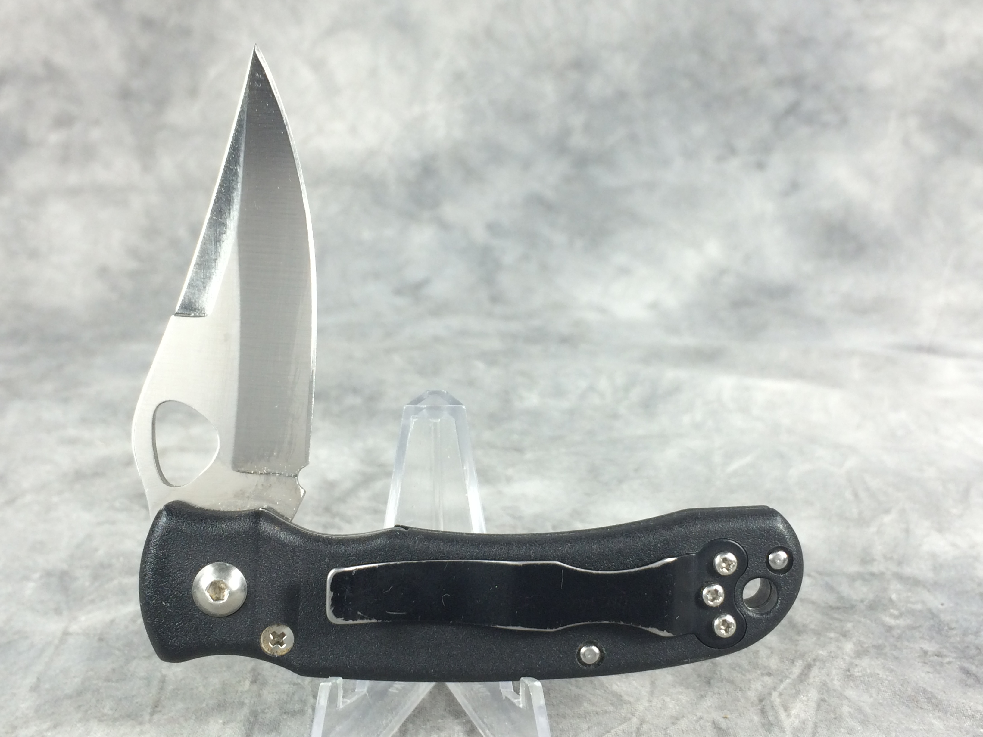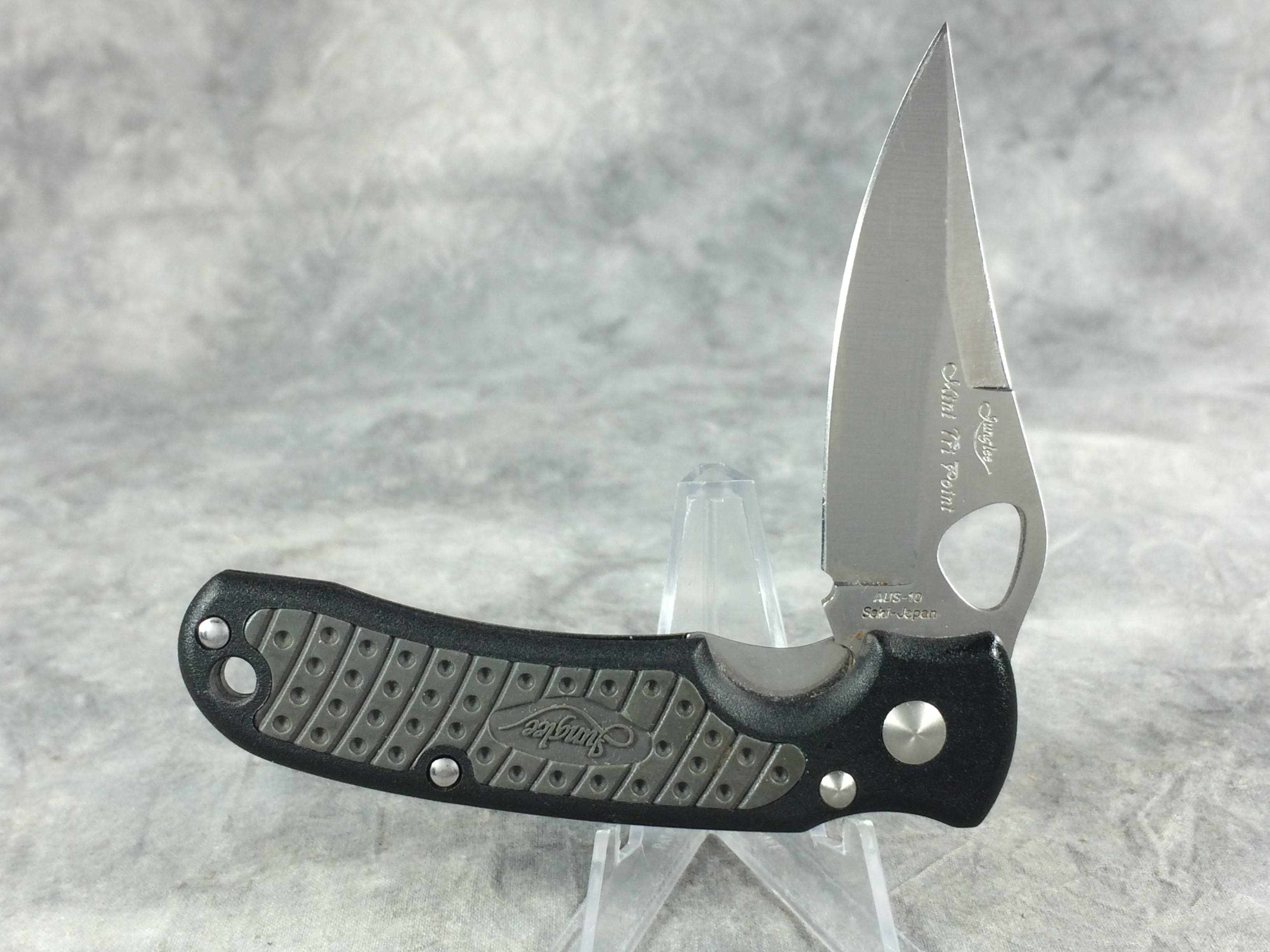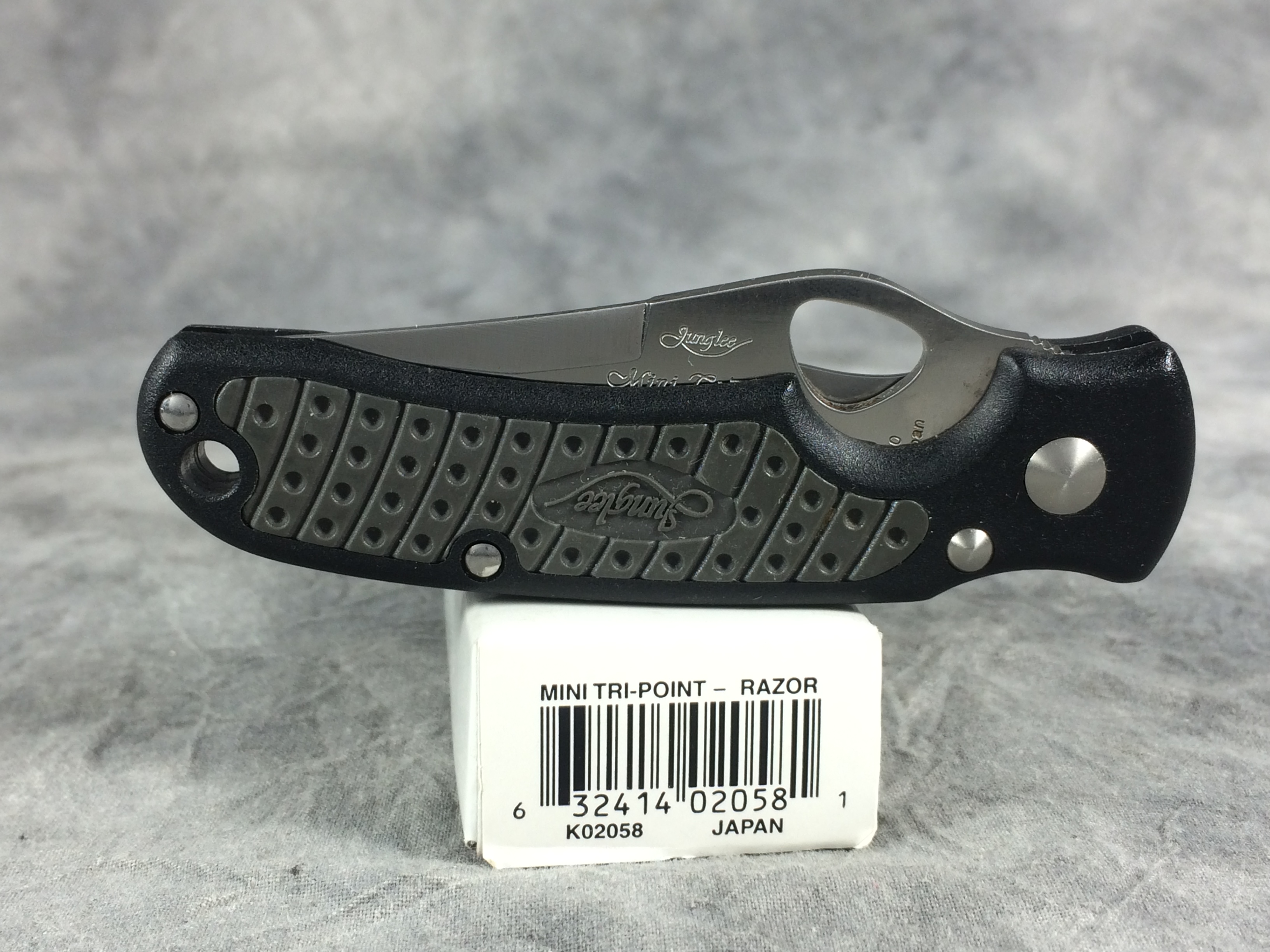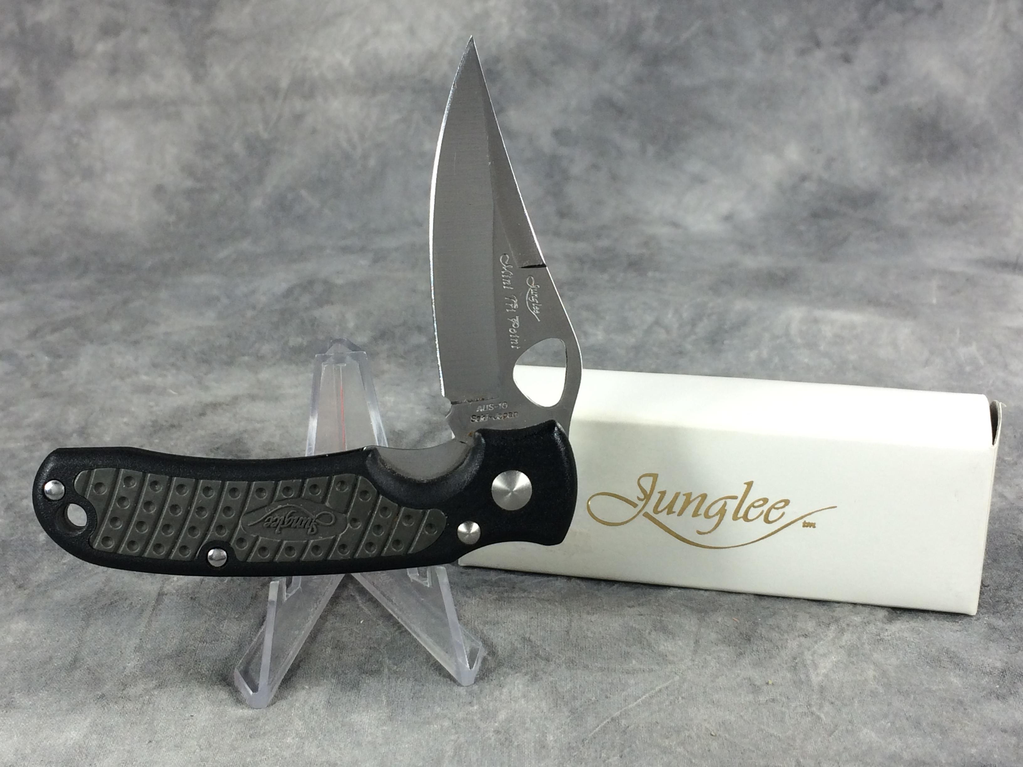 December 22, 2025 - 3-1/2 inches closed. 6-1/8 inches open. Made in Japan. "AUS-10 SEKI-JAPAN" tang stamp. AUS-10 Steel blades etched "Junglee Mini-Tri-Point". Handle has rubberized insert for better grip. With original box and paperwork.