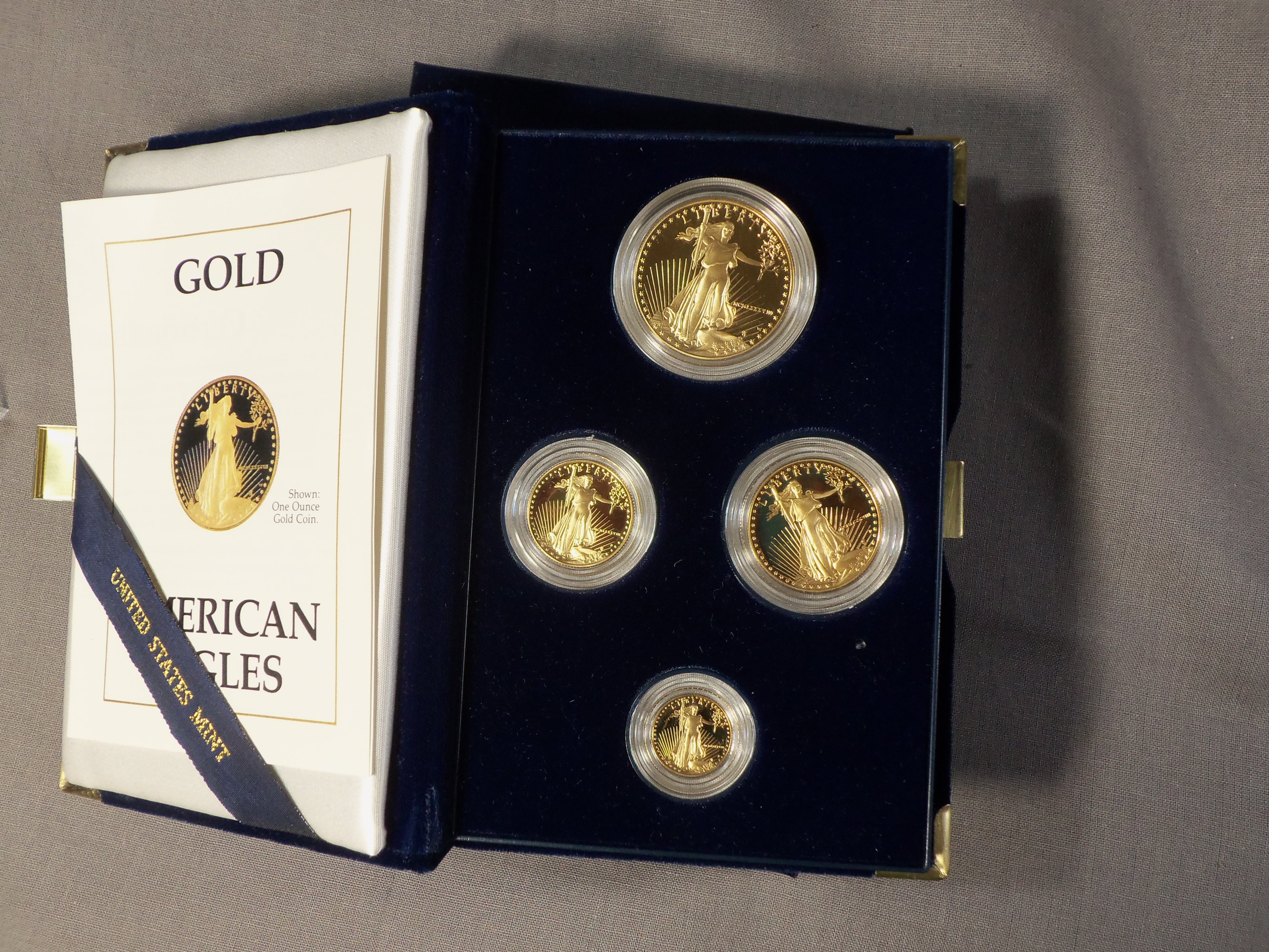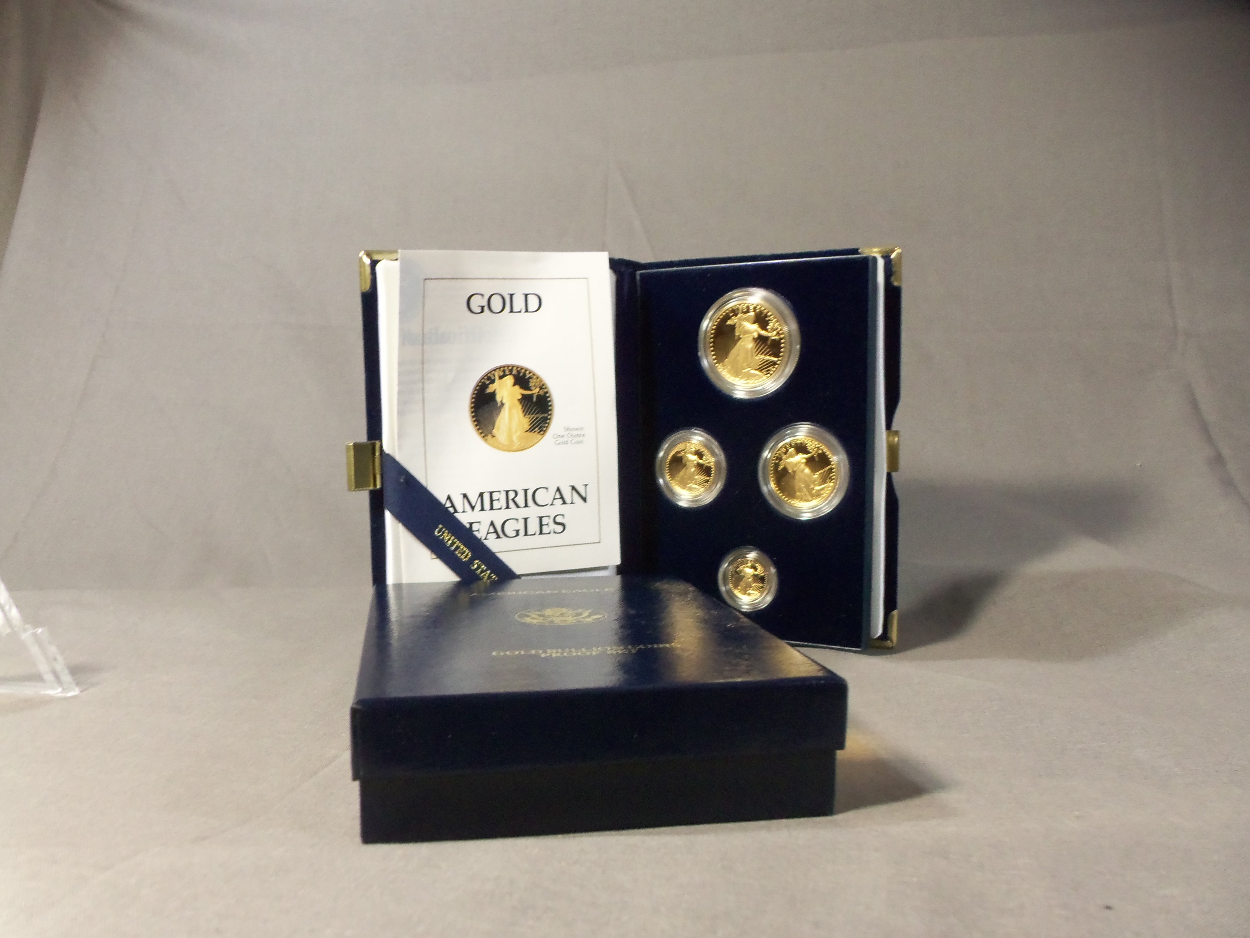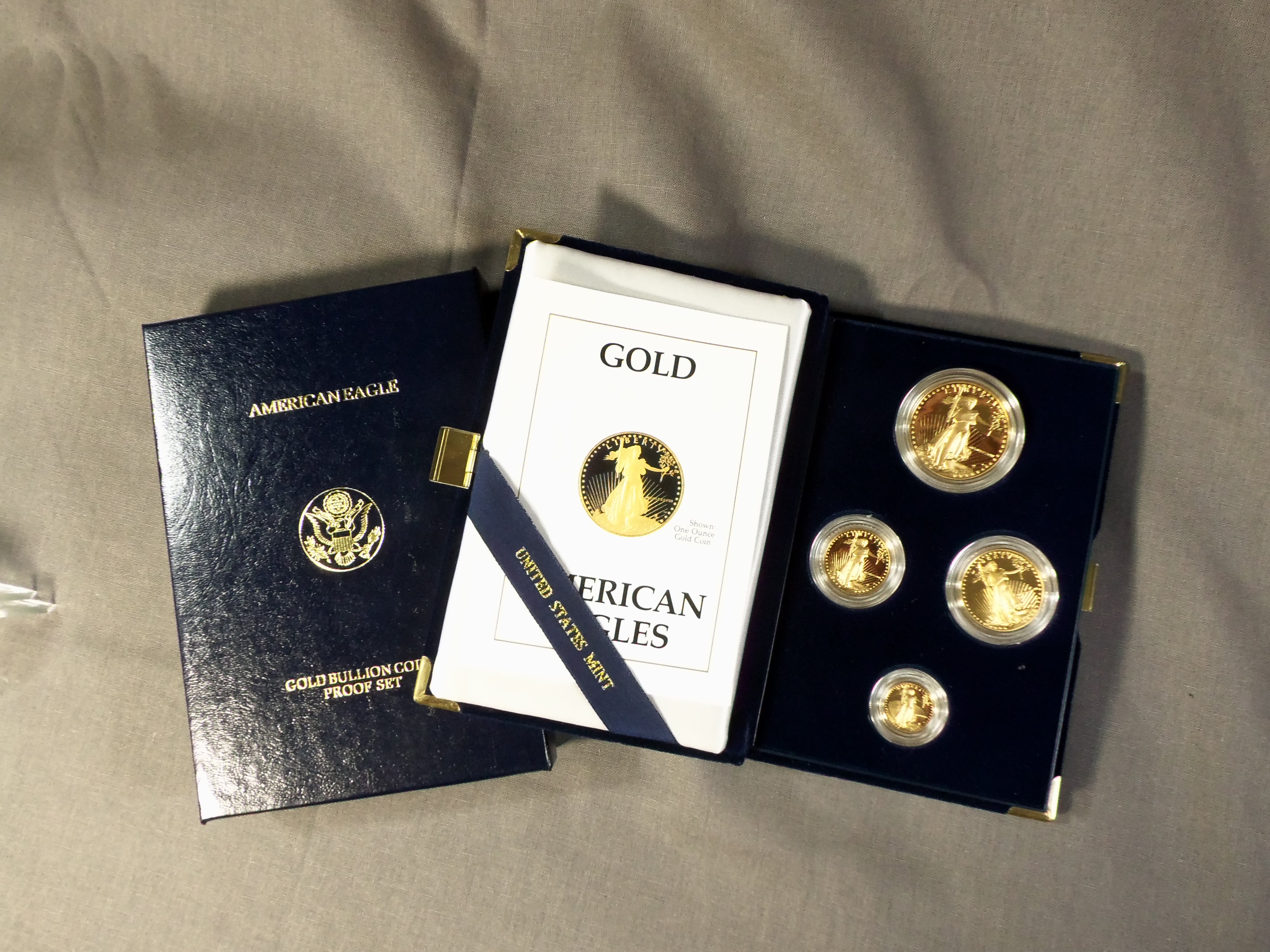 February 04, 2026 - 1.85 troy ounces of pure gold. 1988 Gold American Eagles, 4-coin U.S. Mint Proof Set, with original display case, Certificate of Authenticity, and U.S. Mint box. Set includes the one ounce ($50) American Eagle, West Point Mint, half ounce ($25) American Eagle, Philadelphia Mint, the quarter ounce ($10) American Eagle, Philadelphia Mint and the tenth ounce ($5) American Eagle, Philadelphia Mint.