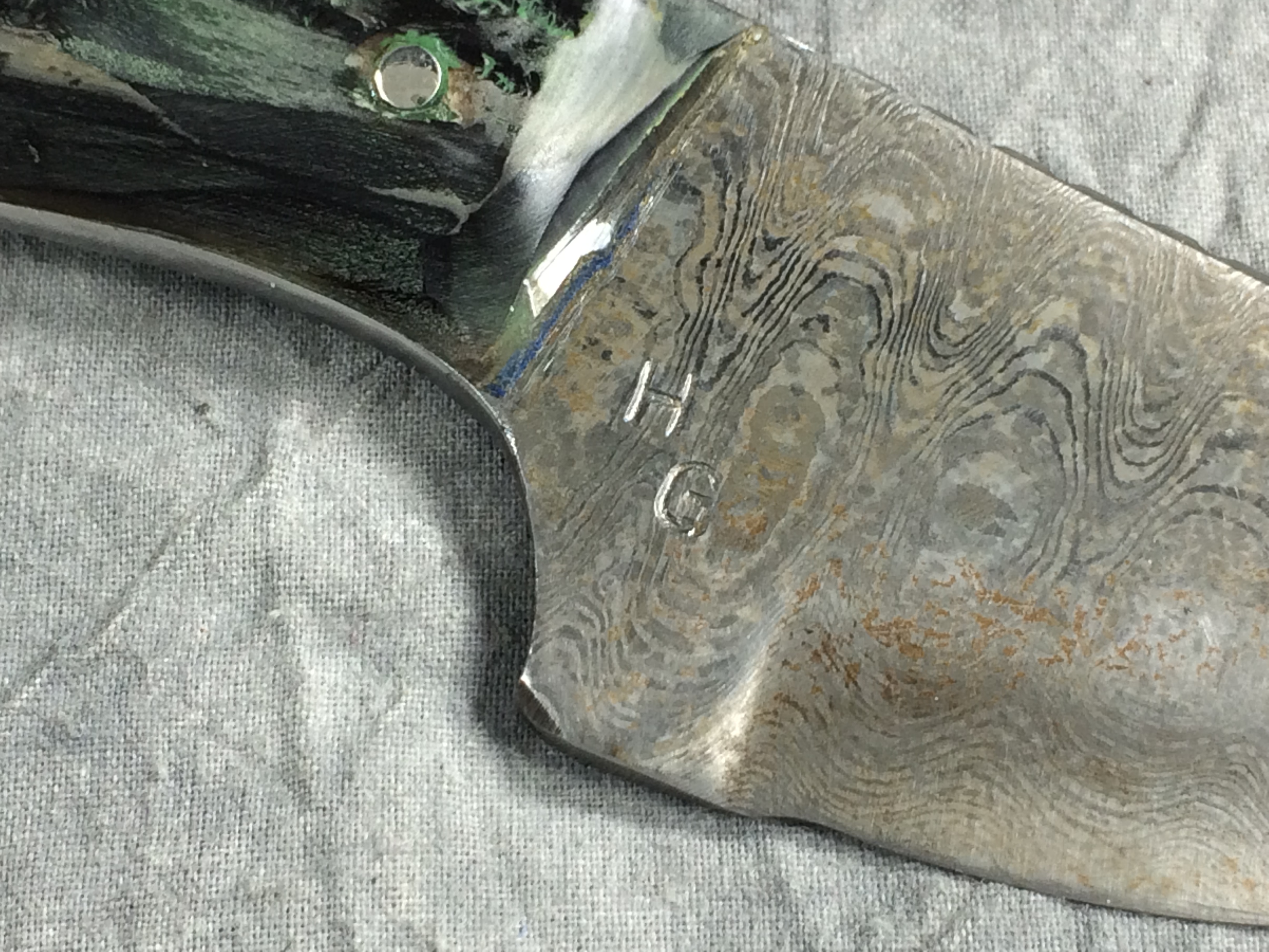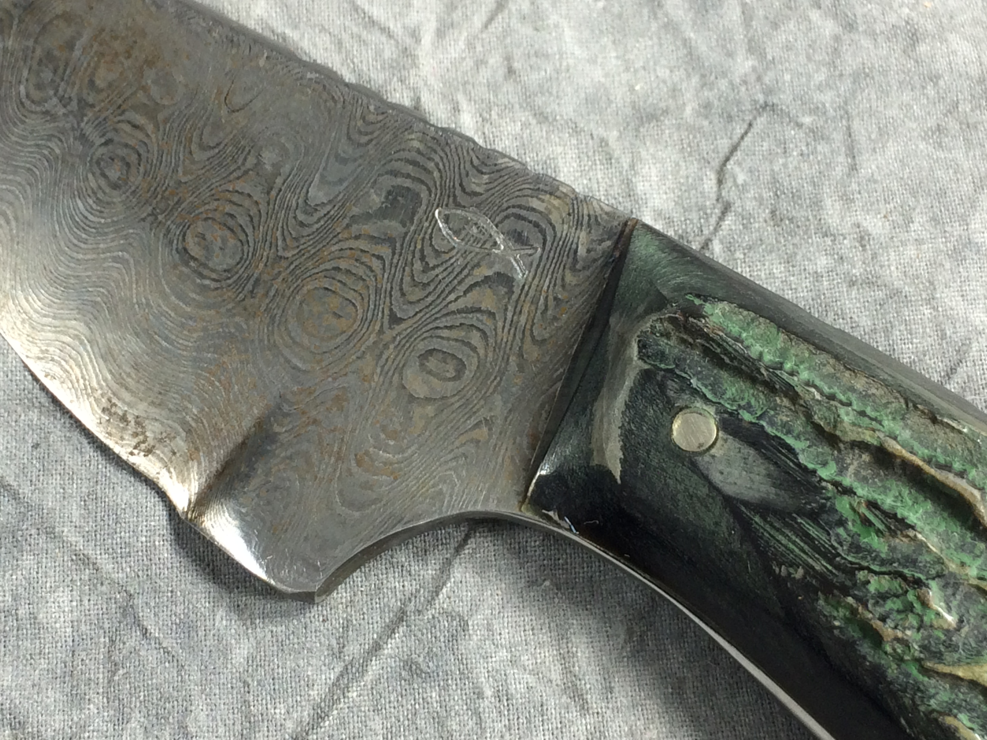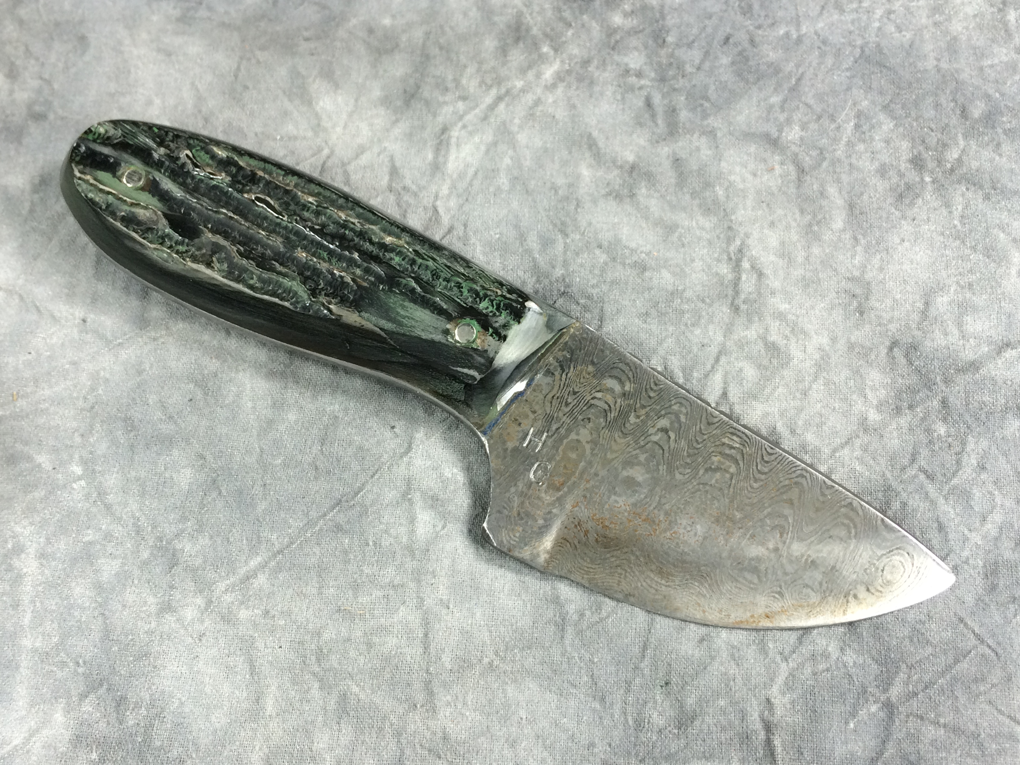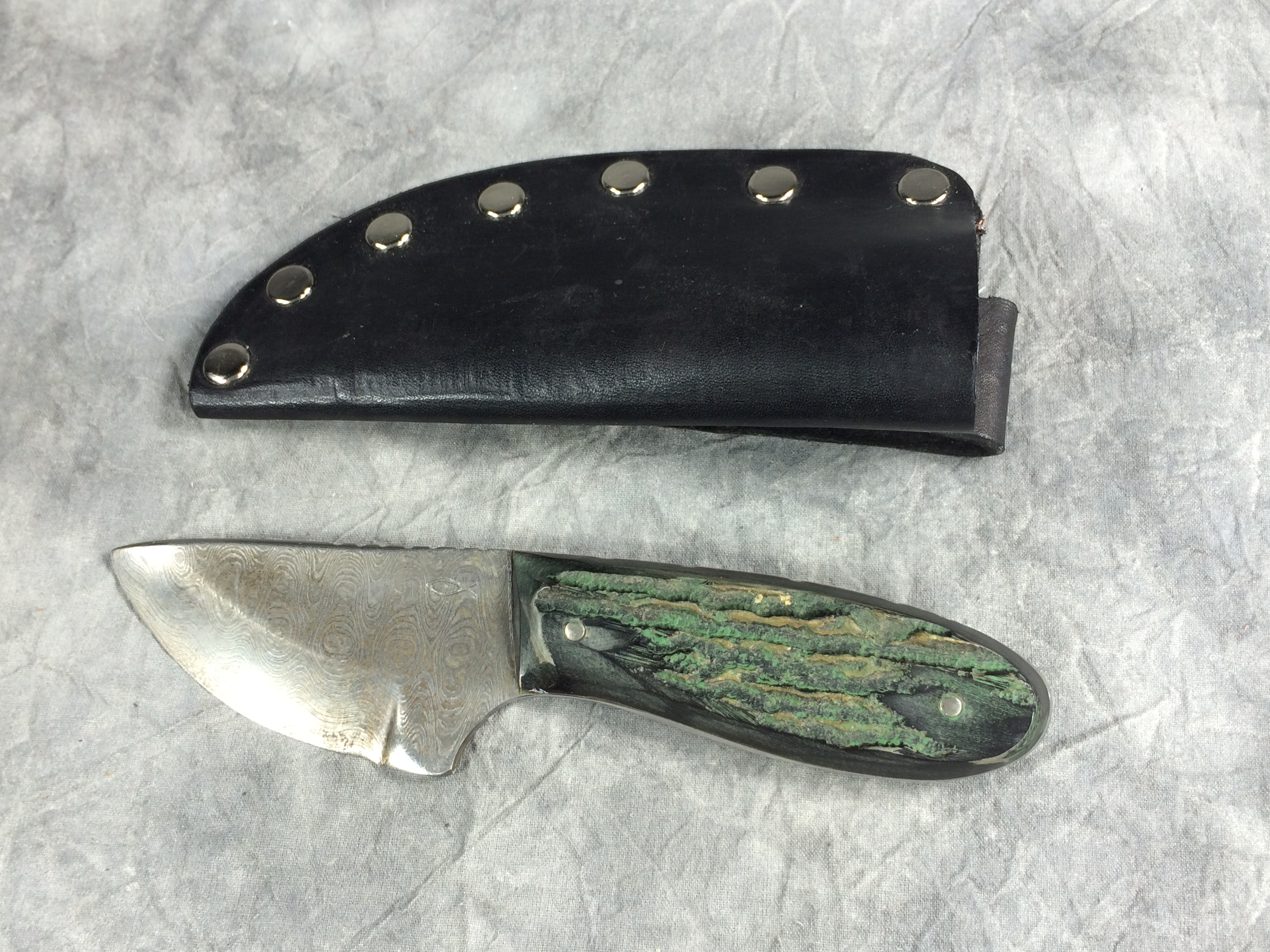 January 08, 2026 - Fixed Blade Knife. 6-3/8 inches long. Damascus blade stamped "H G" and with a fish symbol. Green jigged handle. With black leather sheath.